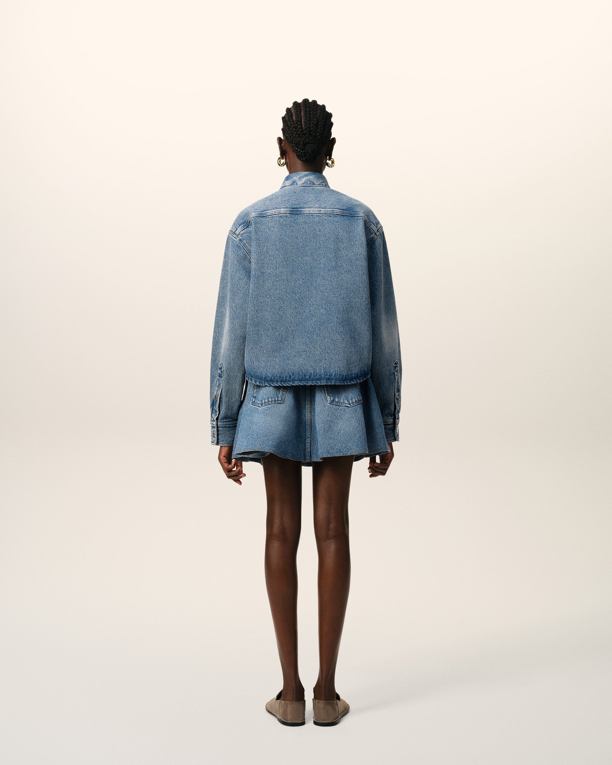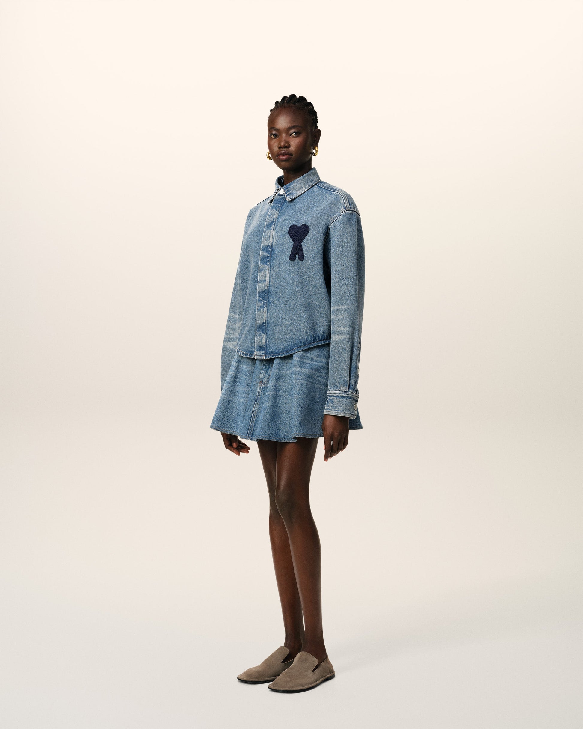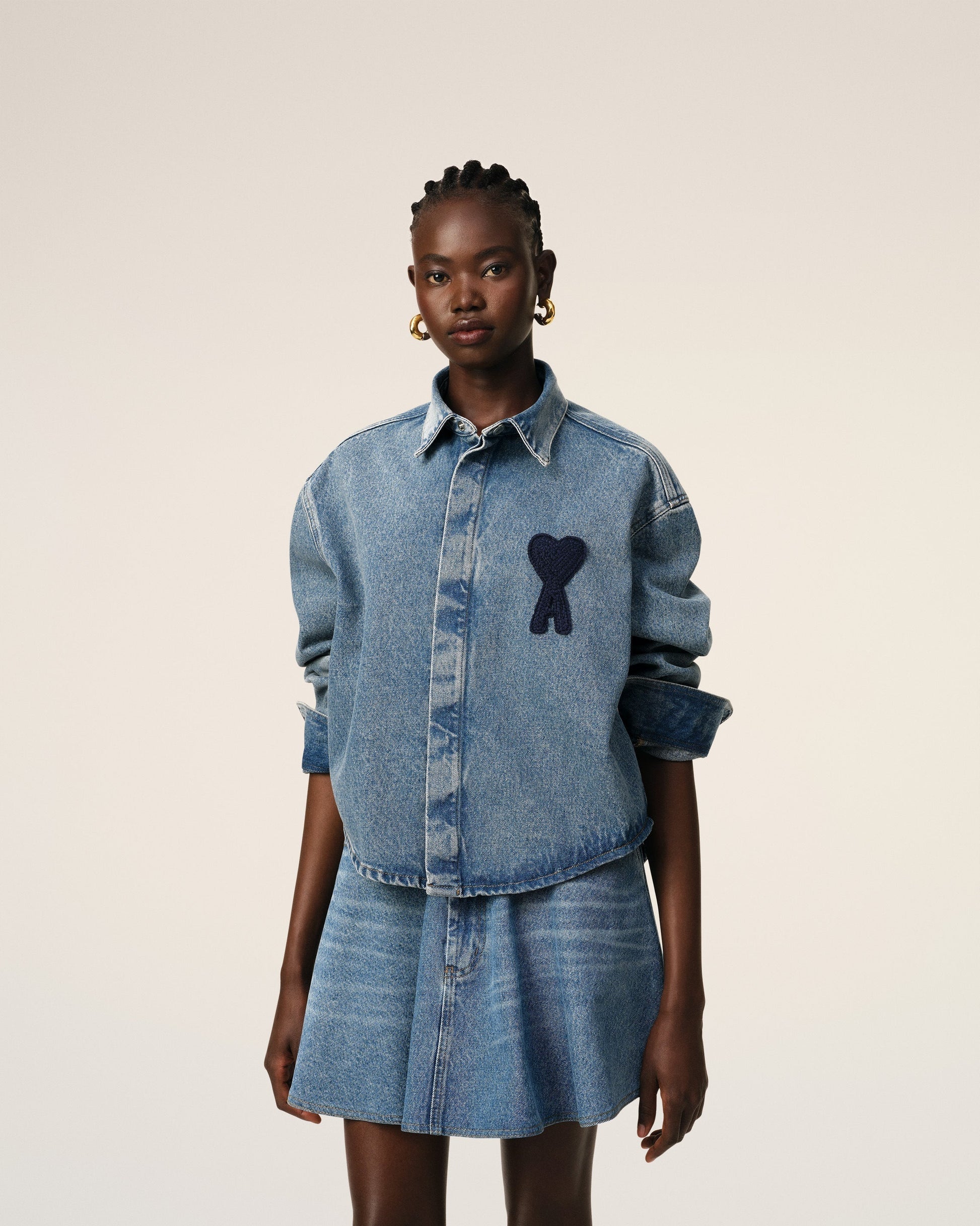 Cropped shirt in used indigo denim. Cropped fit 60 cm center back length (size S) Tonal Ami de Coeur knitted patch embroidered on the chest Denim snap buttons in nickel color Tobacco topstitches Made in Portugal (with love) REF: FSH168.DE0046.480