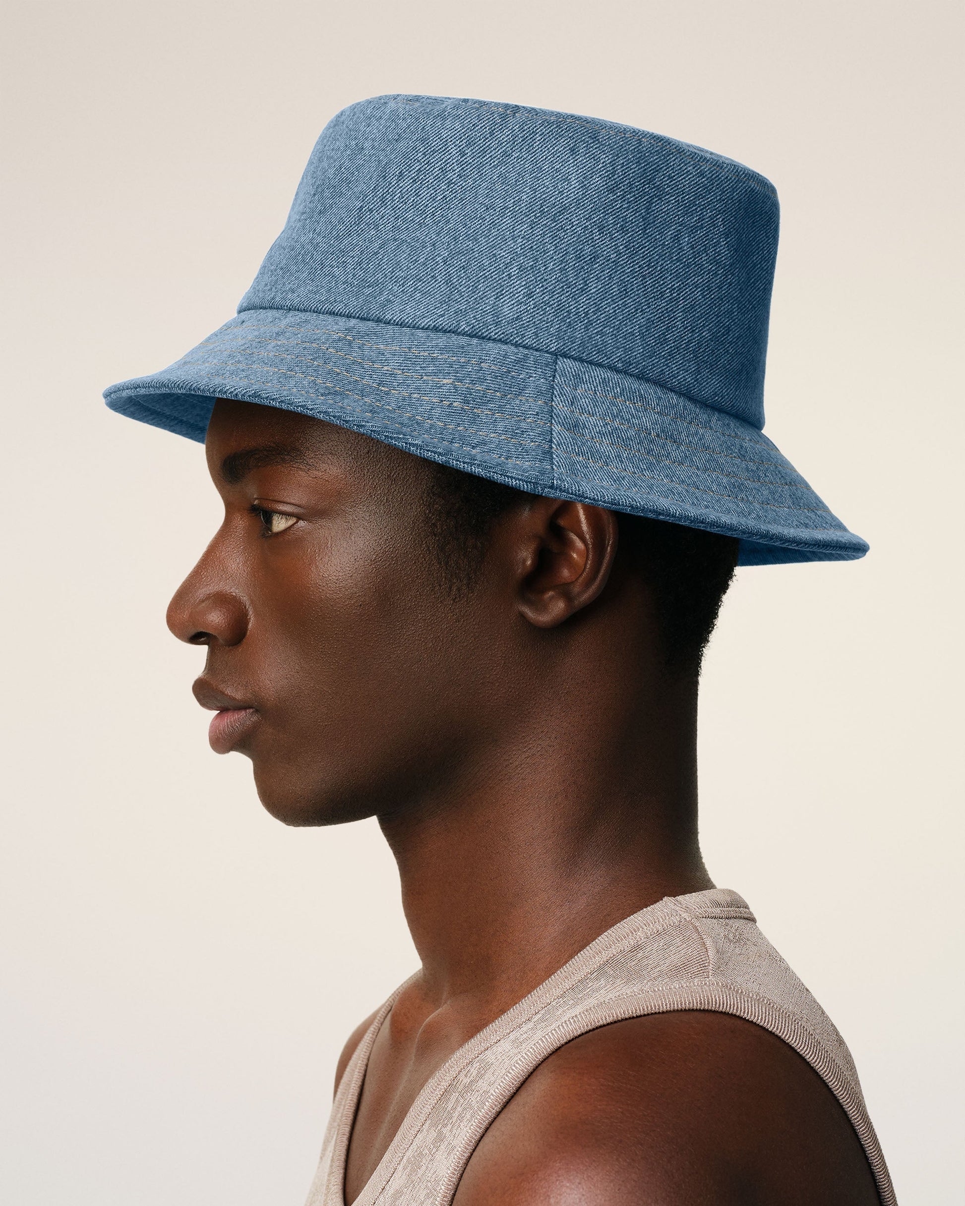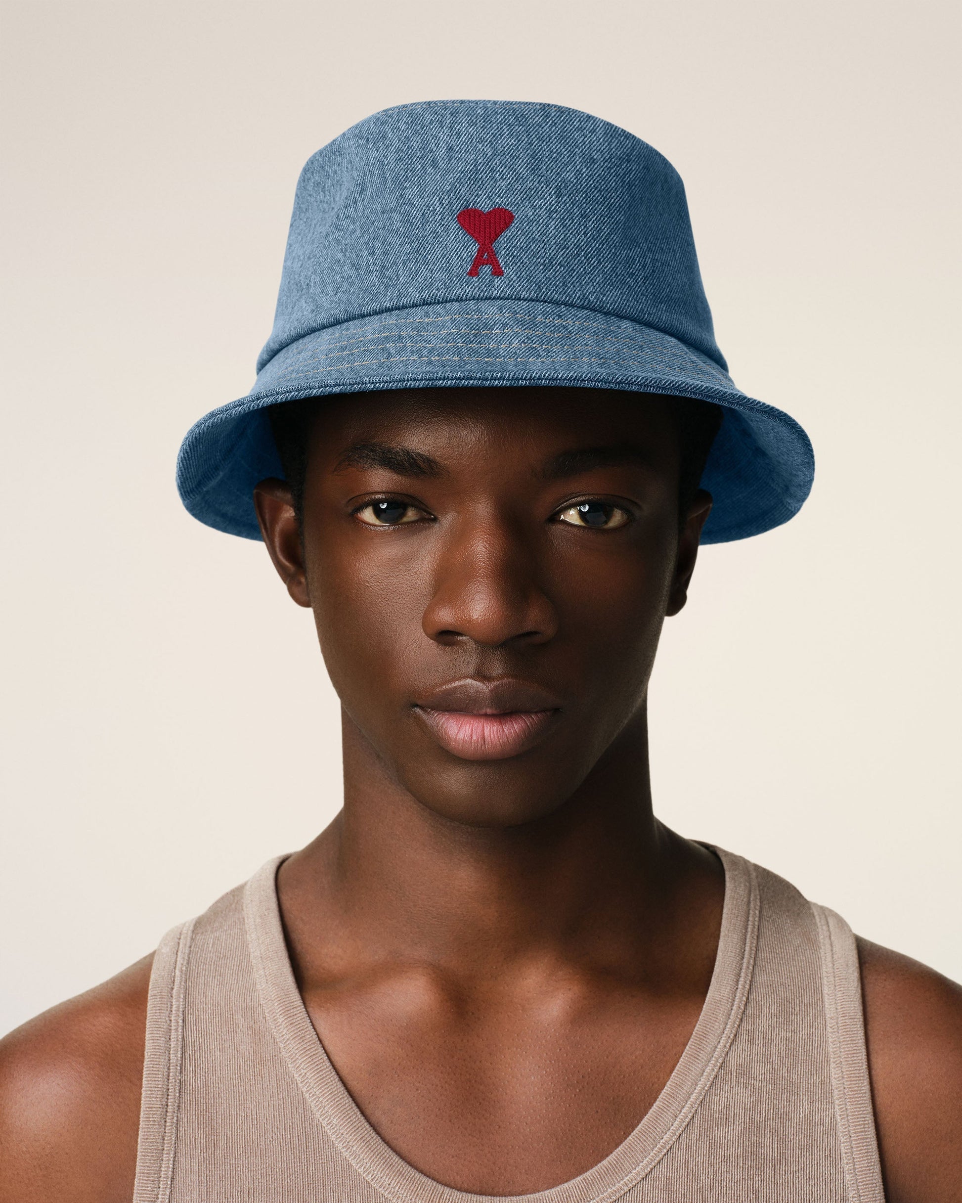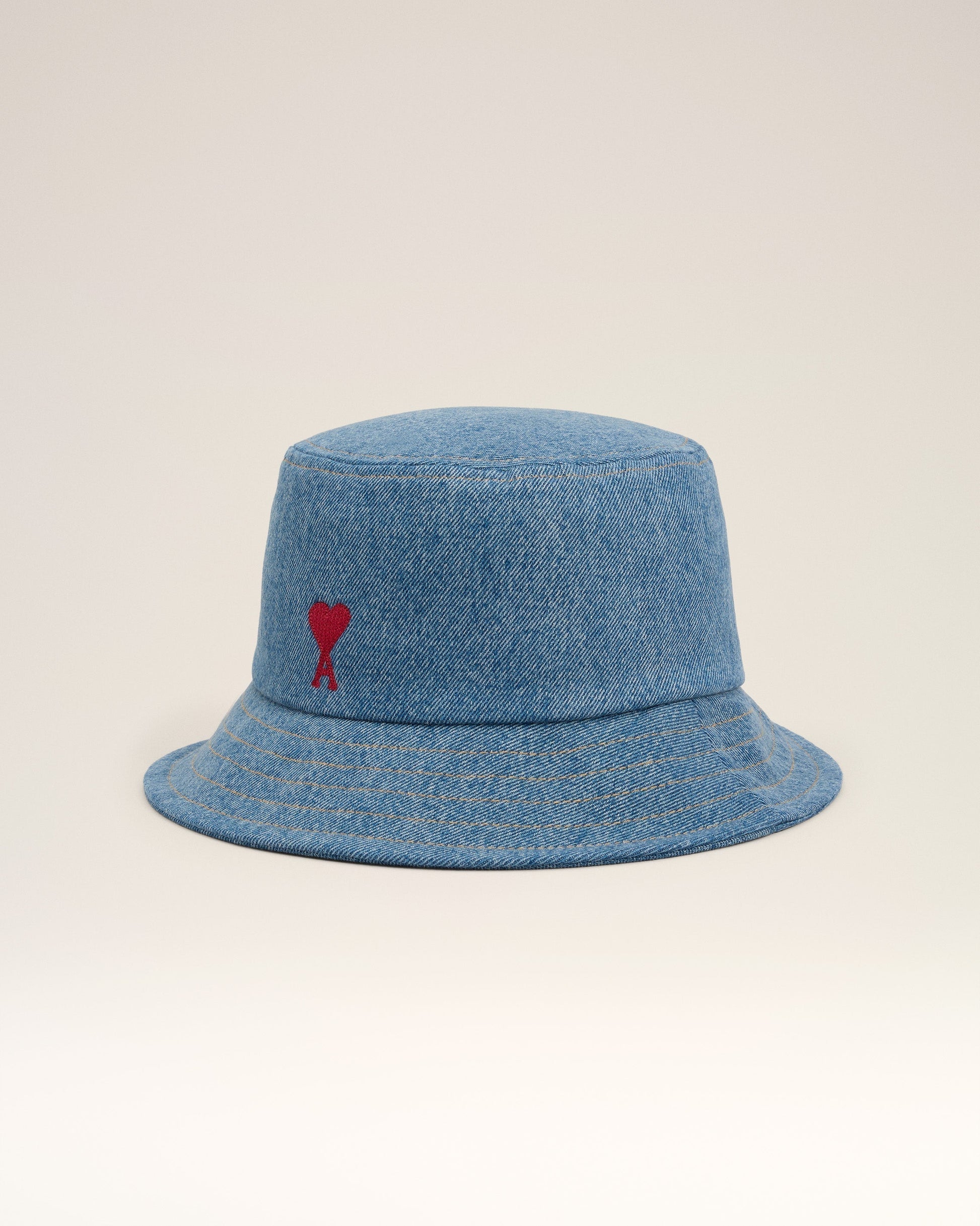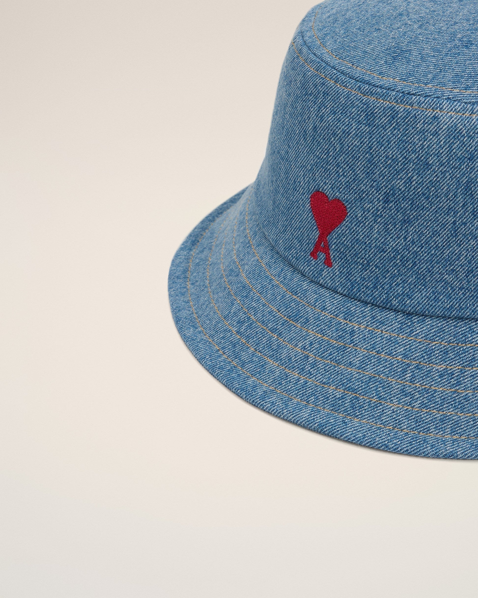 Bucket hat in used indigo denim. Red Ami de Coeur chain stitch embroidery Cotton lining Made in Italy (with love) REF: UHA246.DE0046.480