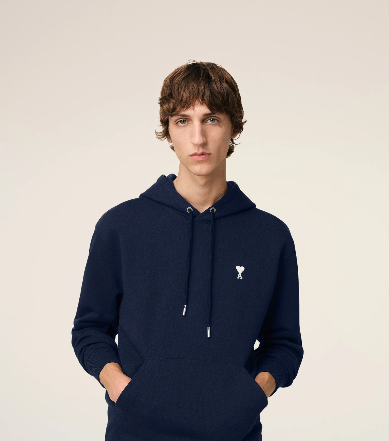 Ami de coeur cropped hoodie in organic cotton fleece. Cropped fit 57 cm center back length (size S) Off-white Ami de Coeur chest embroidery Tonal "AMI" embroidery under back neckline Side drawstrings Nickel color metal ends and engraved eyelets Made in Portugal (with love) REF: FSW260.730.430