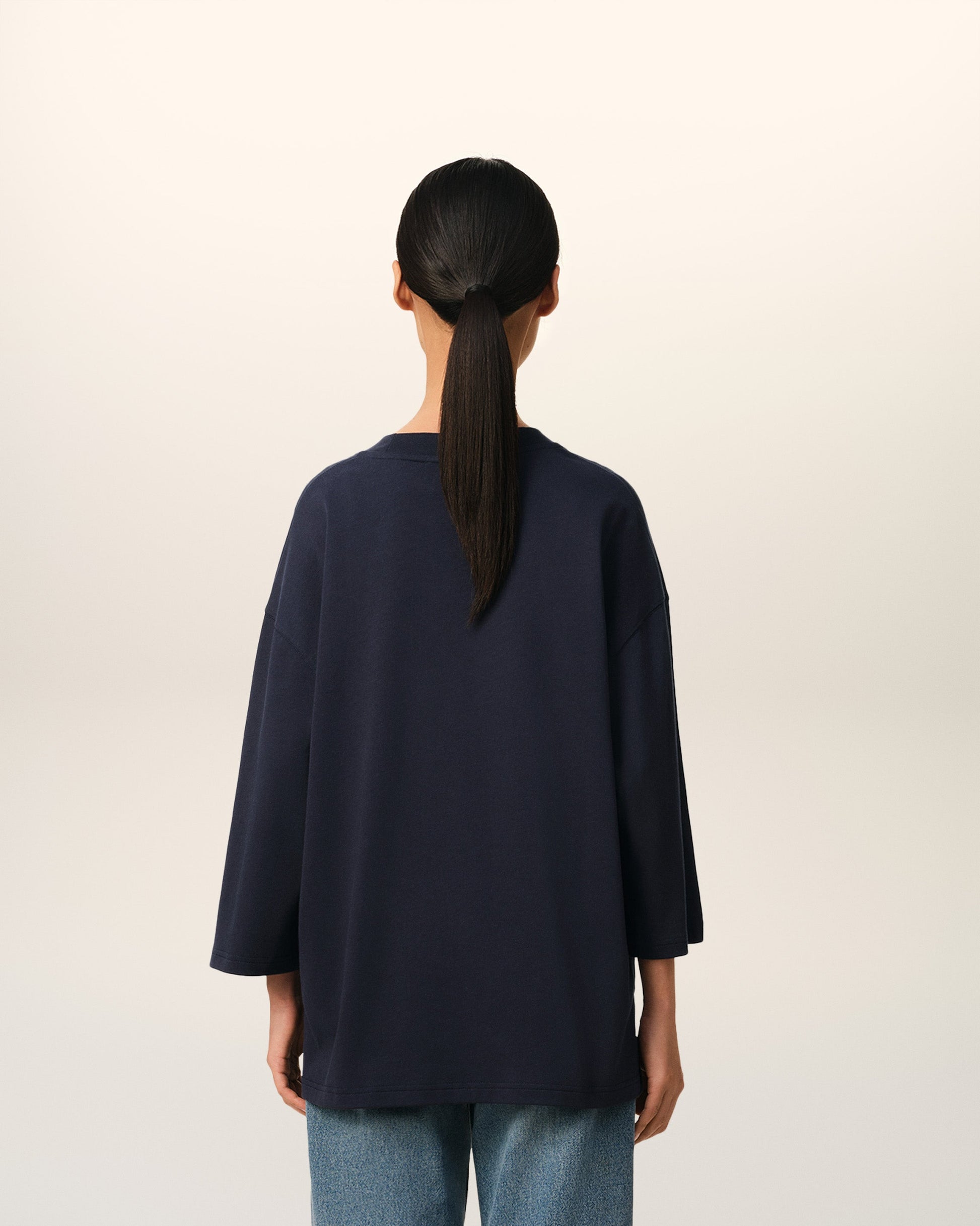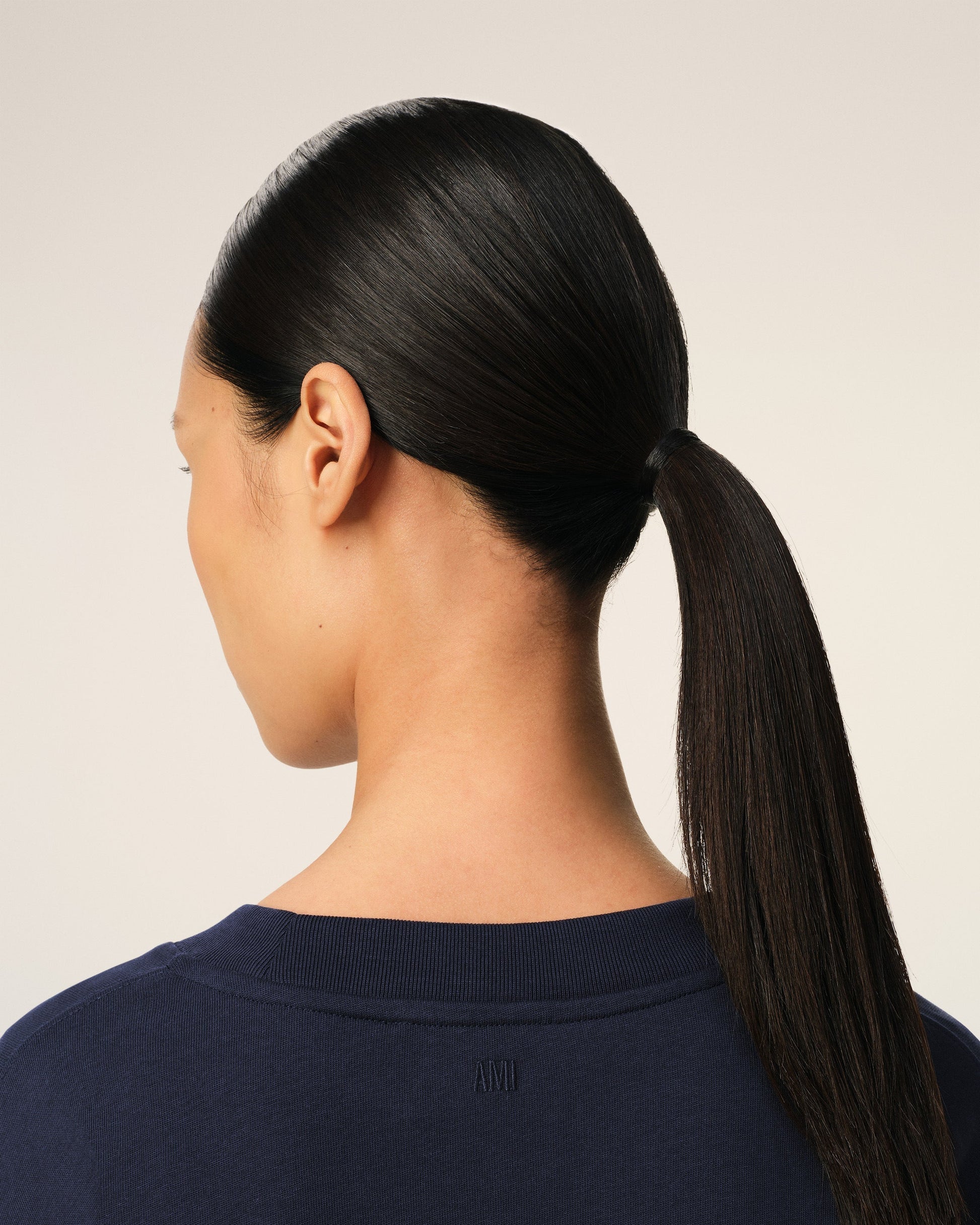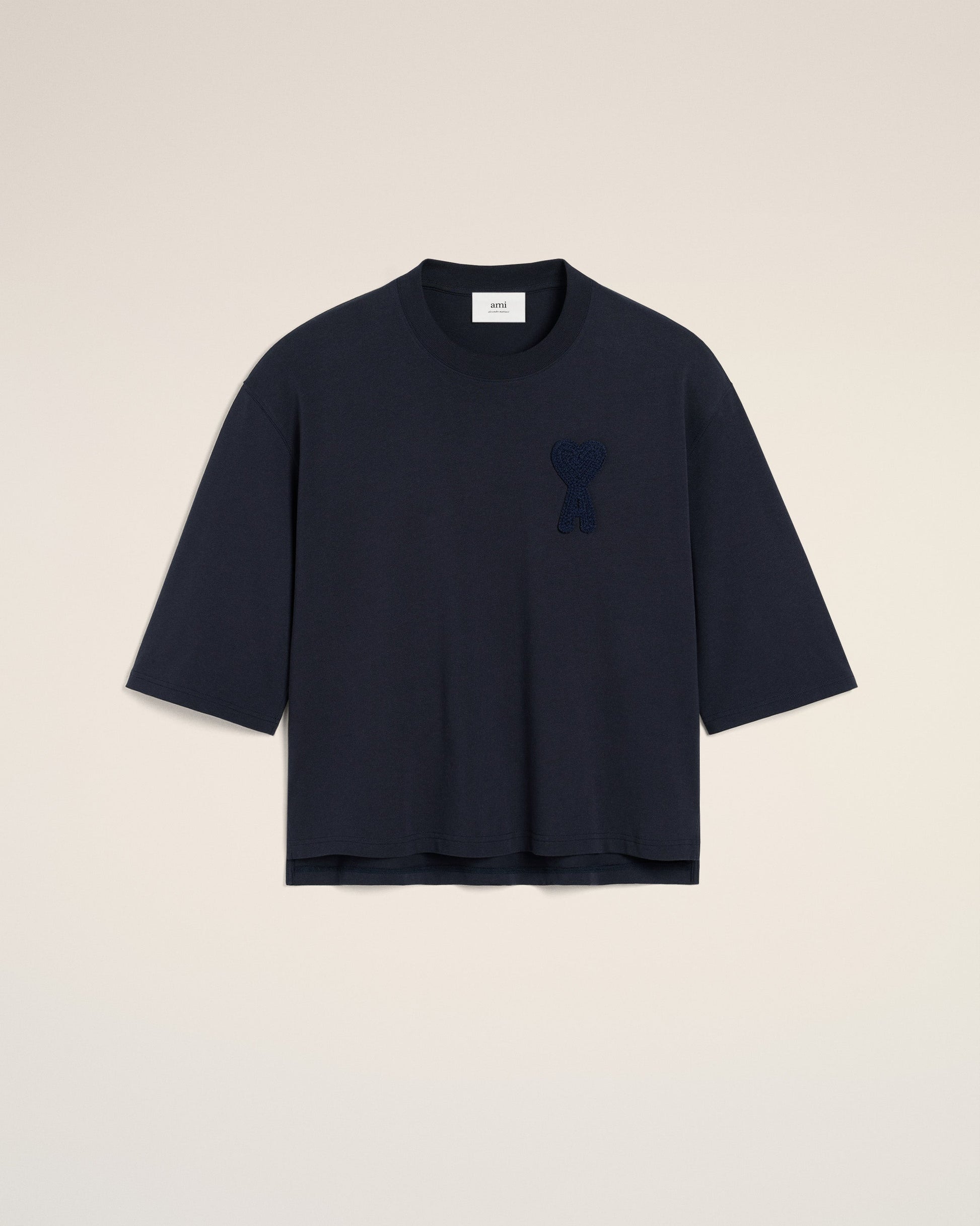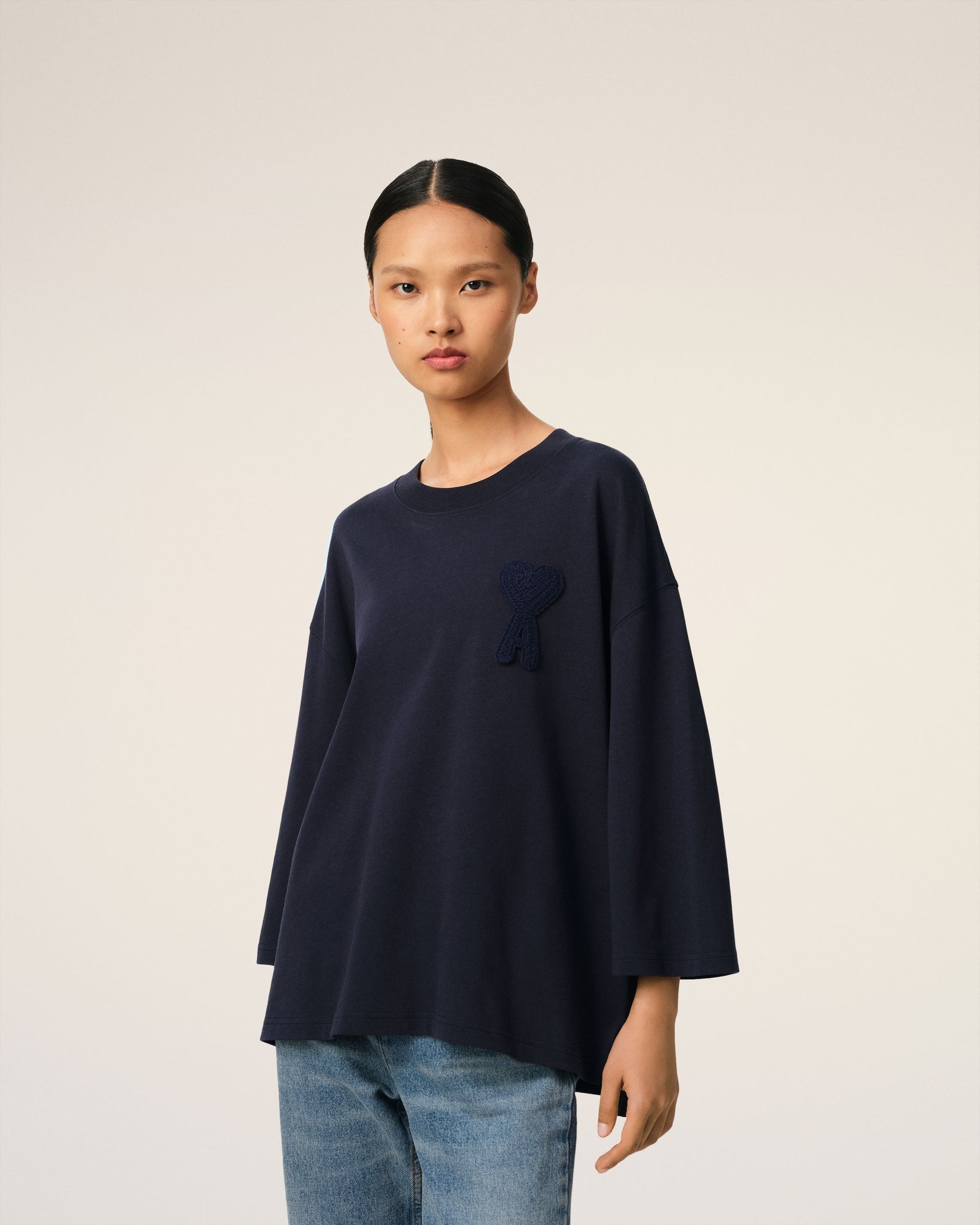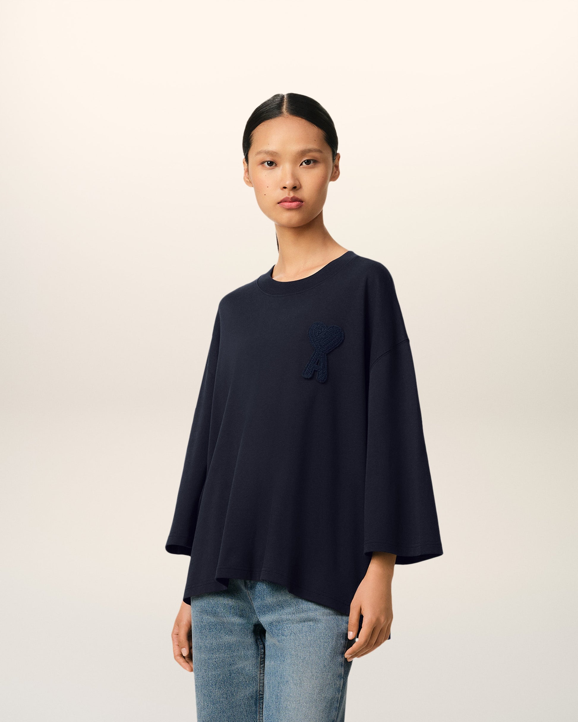 Ami de Coeur t-shirt in organic cotton jersey. Loose fit Three-quarter sleeves 65 cm center back length (size S) Tonal Ami de Coeur knitted patch Tonal "AMI" embroidery under back neckline Made in Portugal (with love) REF: FTS055.726.4011