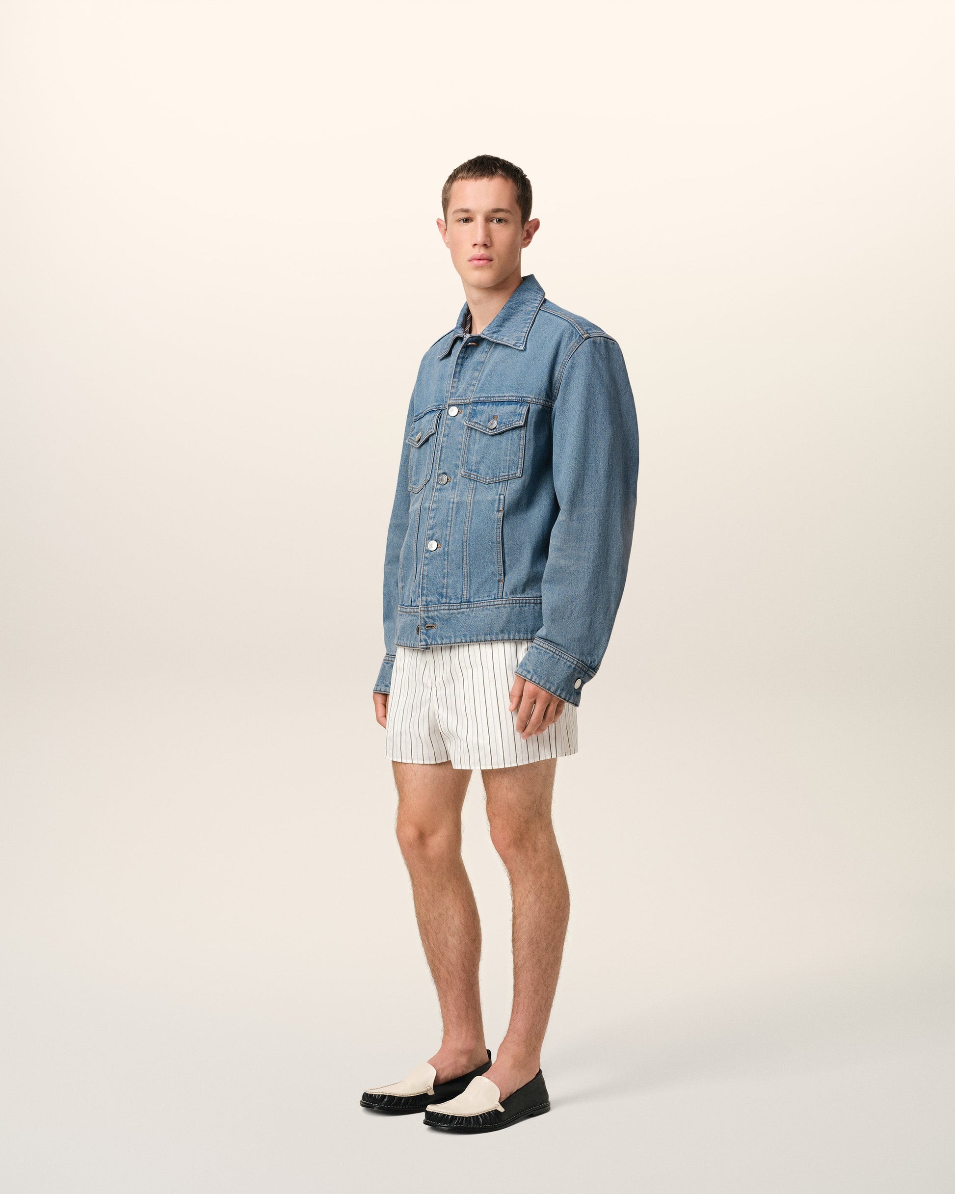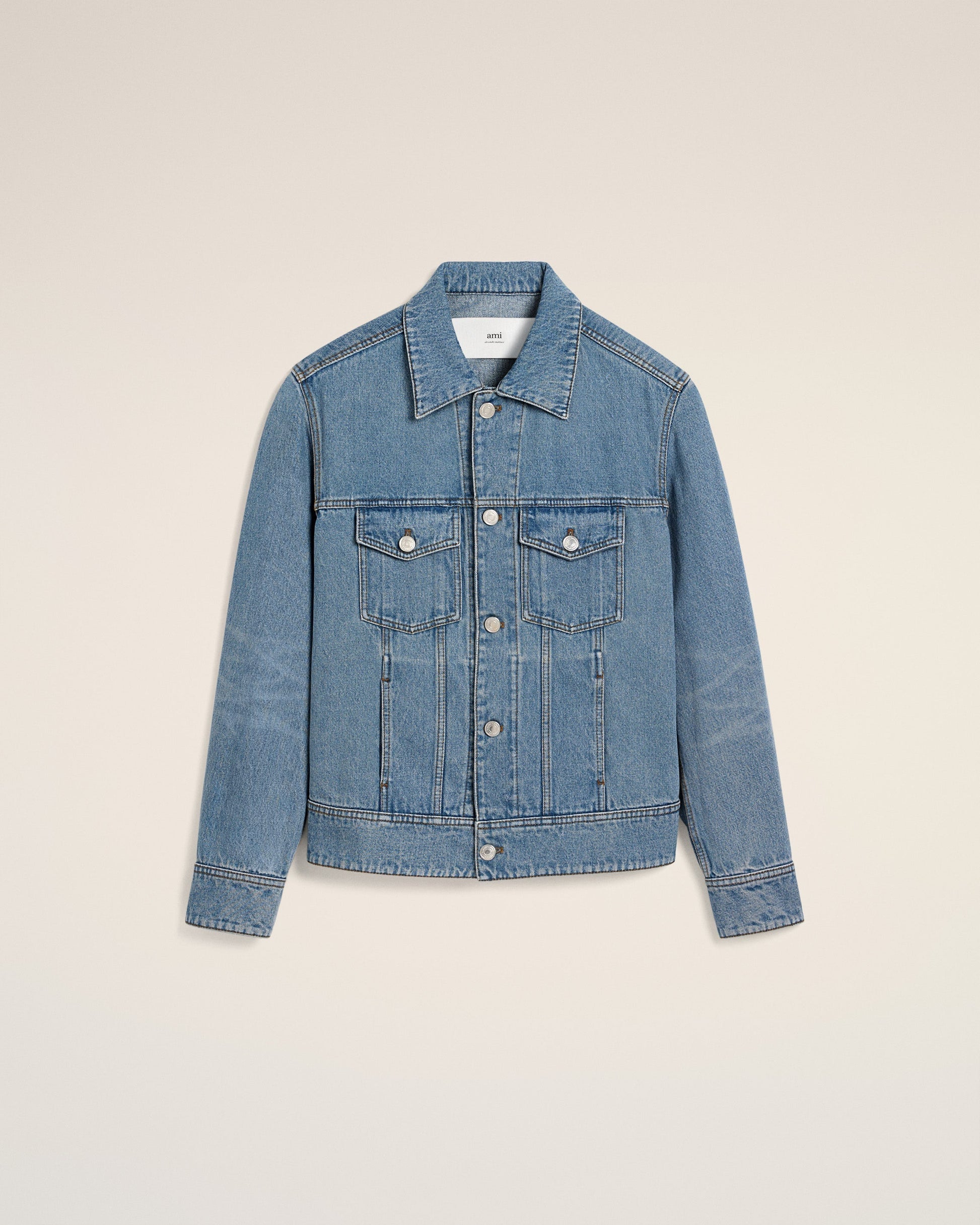 Trucker jacket in used indigo denim. Classic fit 57 cm center back length (size M) Flap pockets with denim buttons in nickel color Front closure and cuffs with denim buttons in nickel color Body bottom belt with denim buttons on the back in nickel color Denim rivet in nickel color at the cuffs "ami alexandre mattiussi" patch on the back "AMI Paris" knitted patch embroidered on the back Tobacco topstitches Made in Tunisia (with love) REF: HJK247.DE0046.480