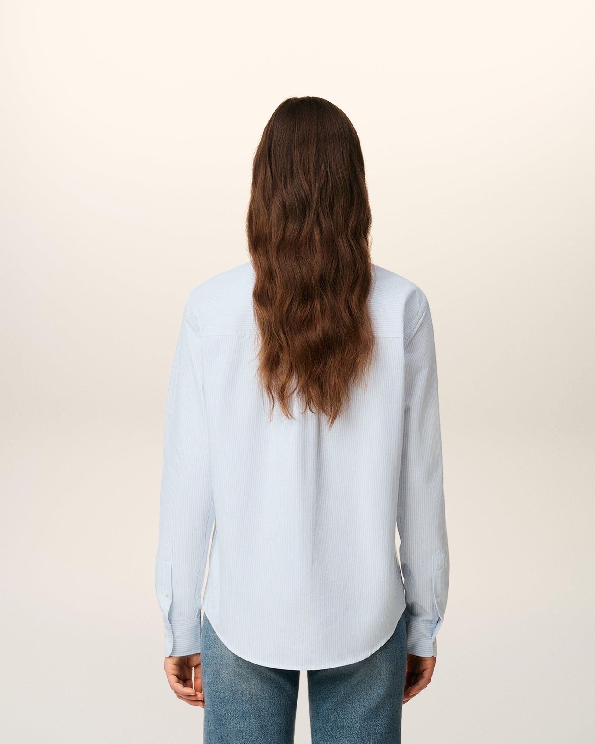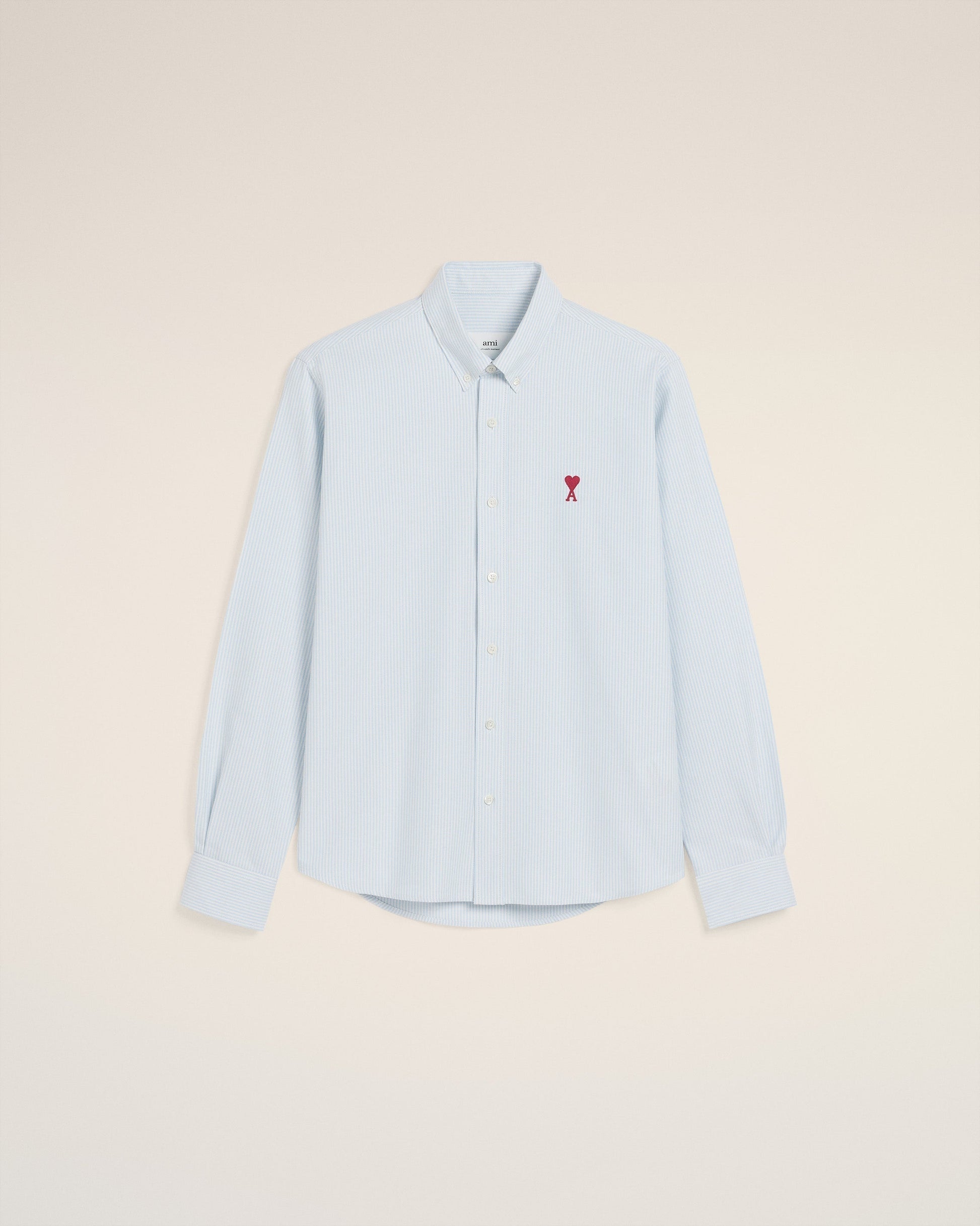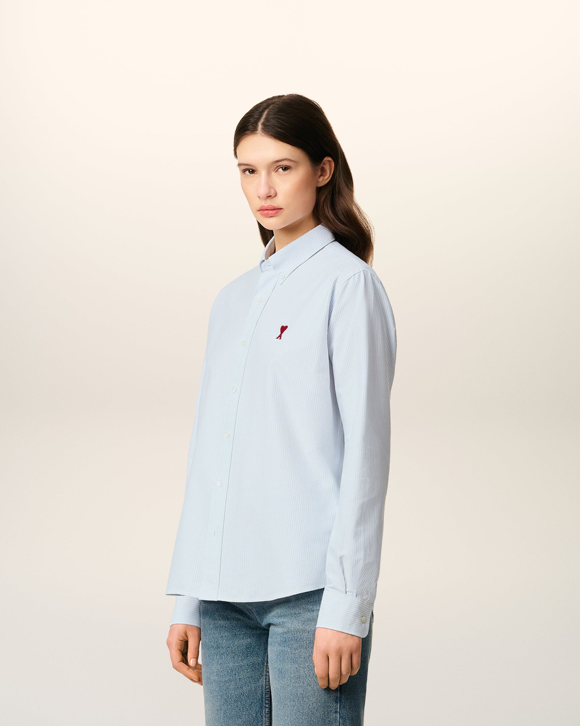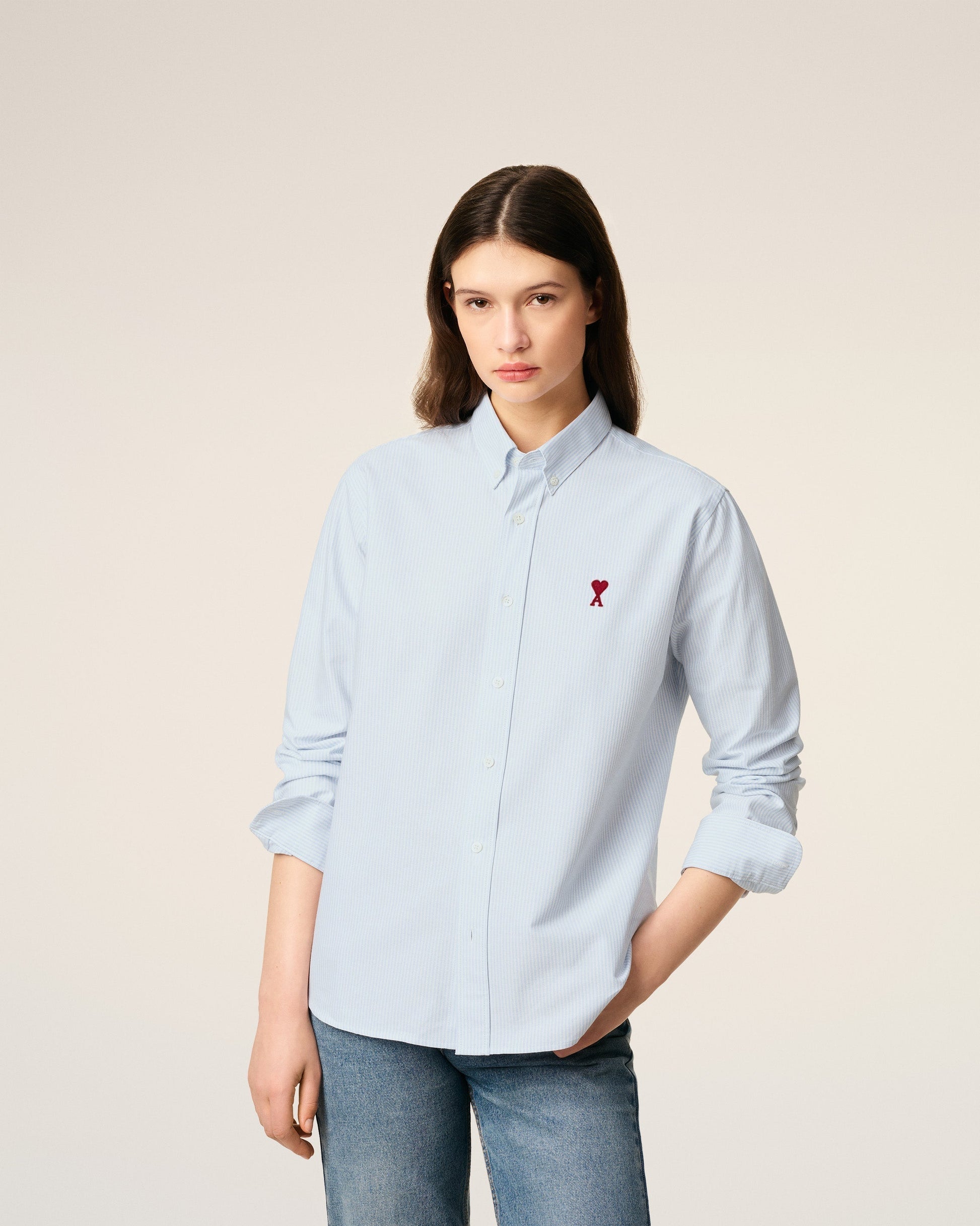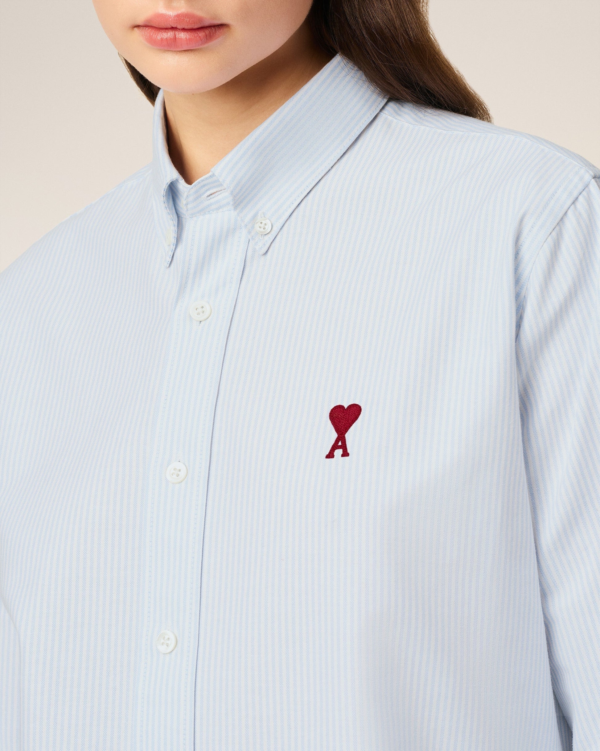 Button down shirt Ami de Coeur in striped cotton oxford. Boxy fit Unisex product 82 cm center back length (size M) 78 cm center back length (size XS) Red Ami de Coeur chest embroidery Button-down collar Buttoned cuffs Mother-of-pearl buttons Made in Poland (with love) REF : BFUSH130.CO0021.475
