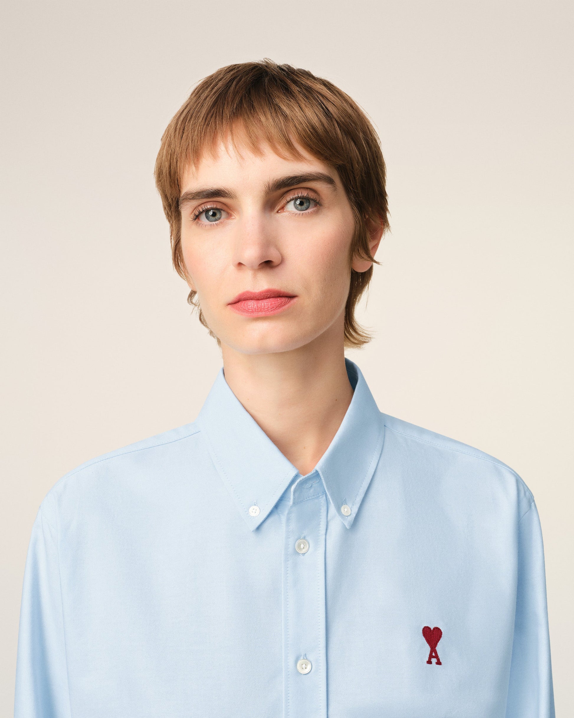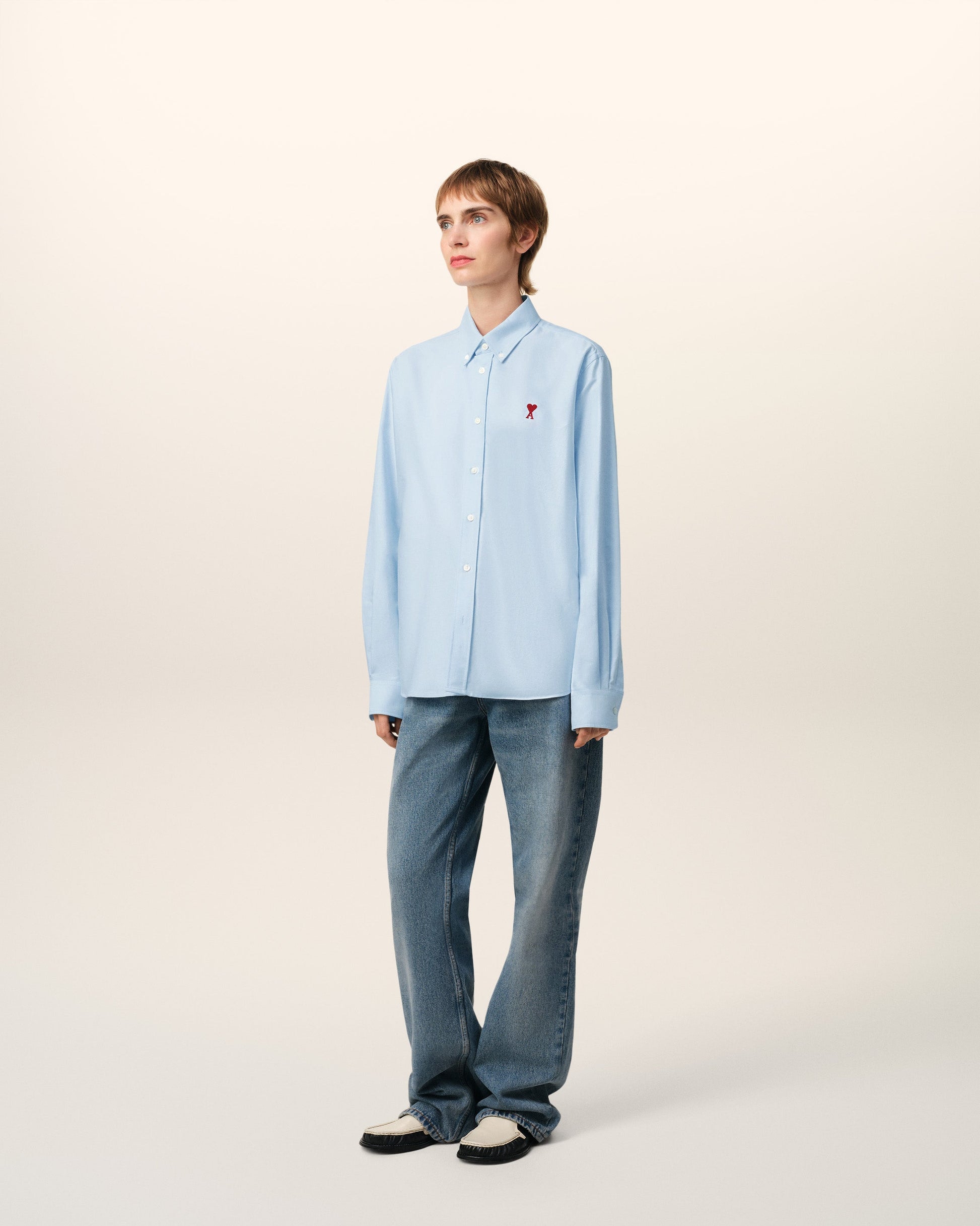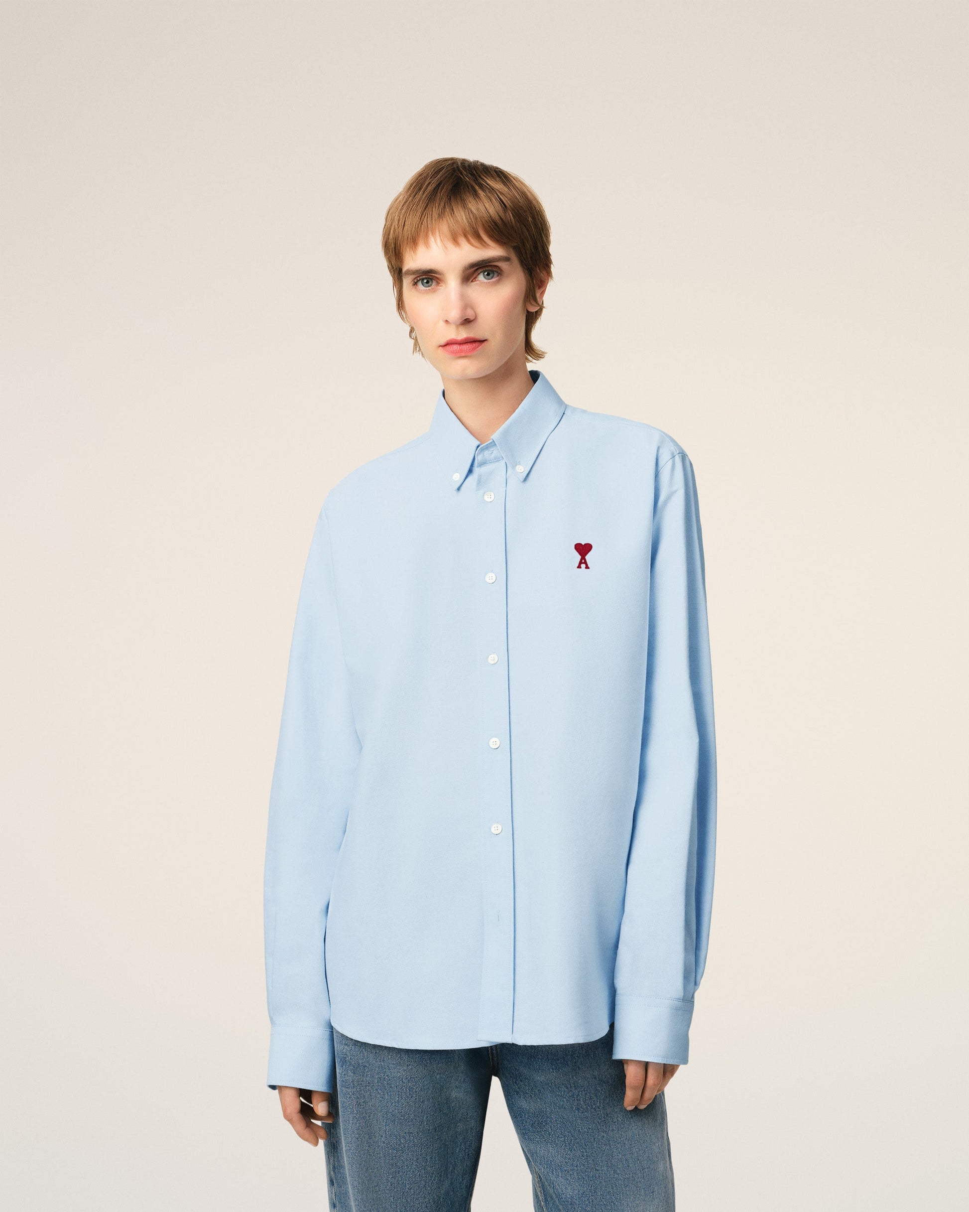 Ami de Coeur button down shirt in cotton oxford. Unisex product Classic fit Button down collar Removable collar stays Buttoned tab on front and cuffs Mother of pearl buttons Red Ami de Coeur chest embroidery 75,5 cm center back length (size XS) 75,5,5 cm center back length (size M) Made in Poland (with love) REF: BFUSH063.CO0031.450
