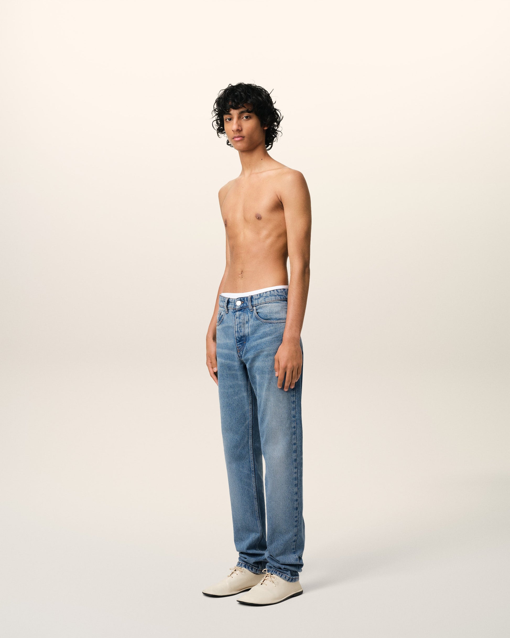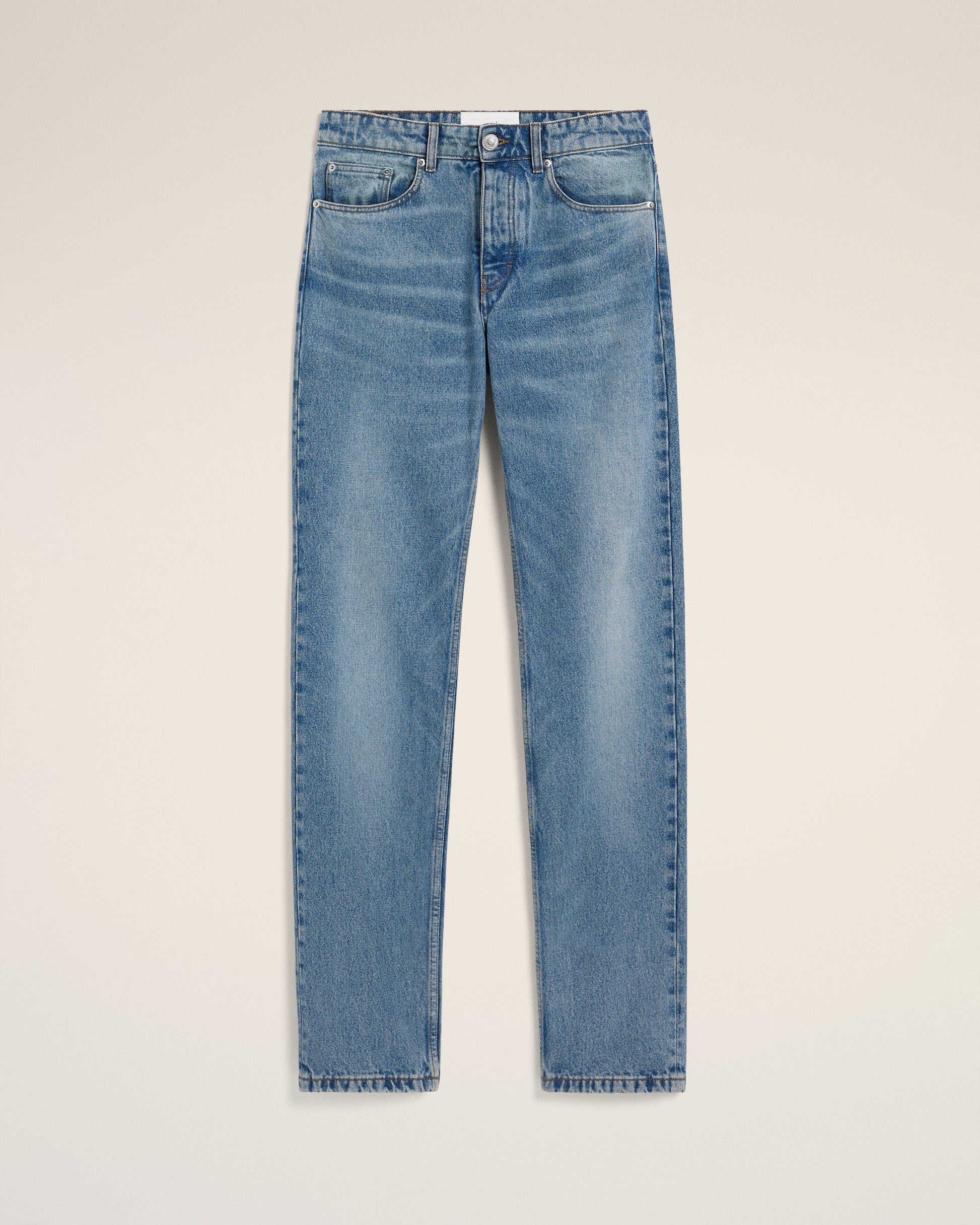 Classic fit jeans in used indigo denim. Classic fit Classic waist Fitted leg Buttoned fly 5 pockets Denim metal rivets and buttons in nickel color "ami alexandre mattiussi" patch on the back Tobacco topstitches 19 cm bottom leg width (size 30) Made in Portugal (with love) REF: HTR001.DE0046.480