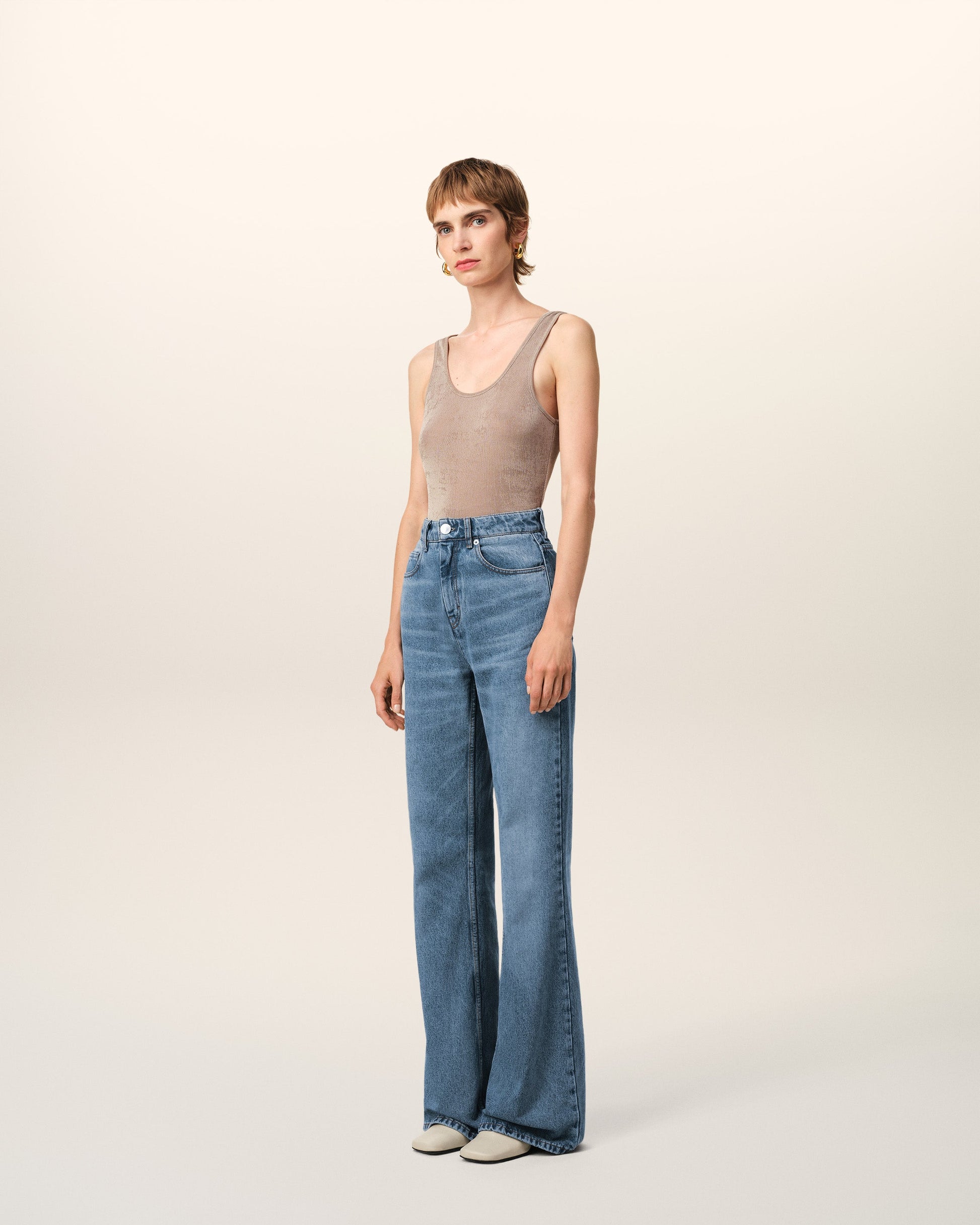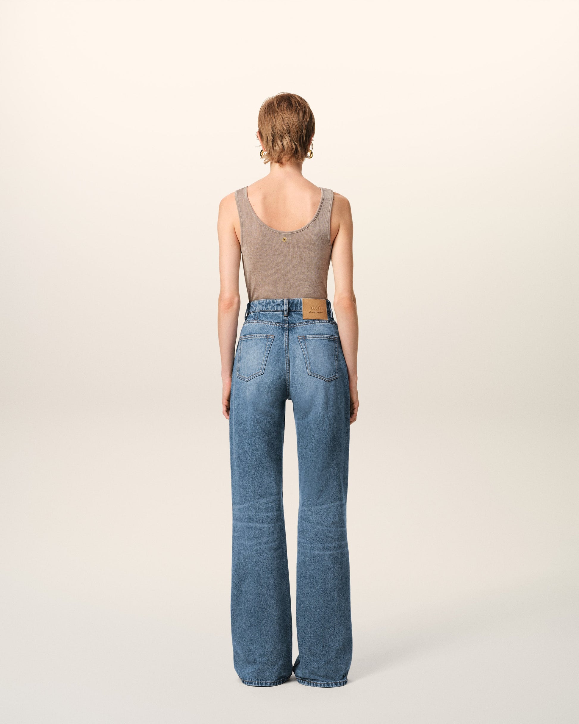 Flare fit jeans in used indigo denim. Flare fit High waist Flare leg Zipped fly 5 pockets Denim metal rivets and buttons in nickel color "ami alexandre mattiussi" patch on the back Tobacco topstitches 30 cm bottom leg width (size 26) Made in Portugal (with love) REF: FTR420.DE0046.480