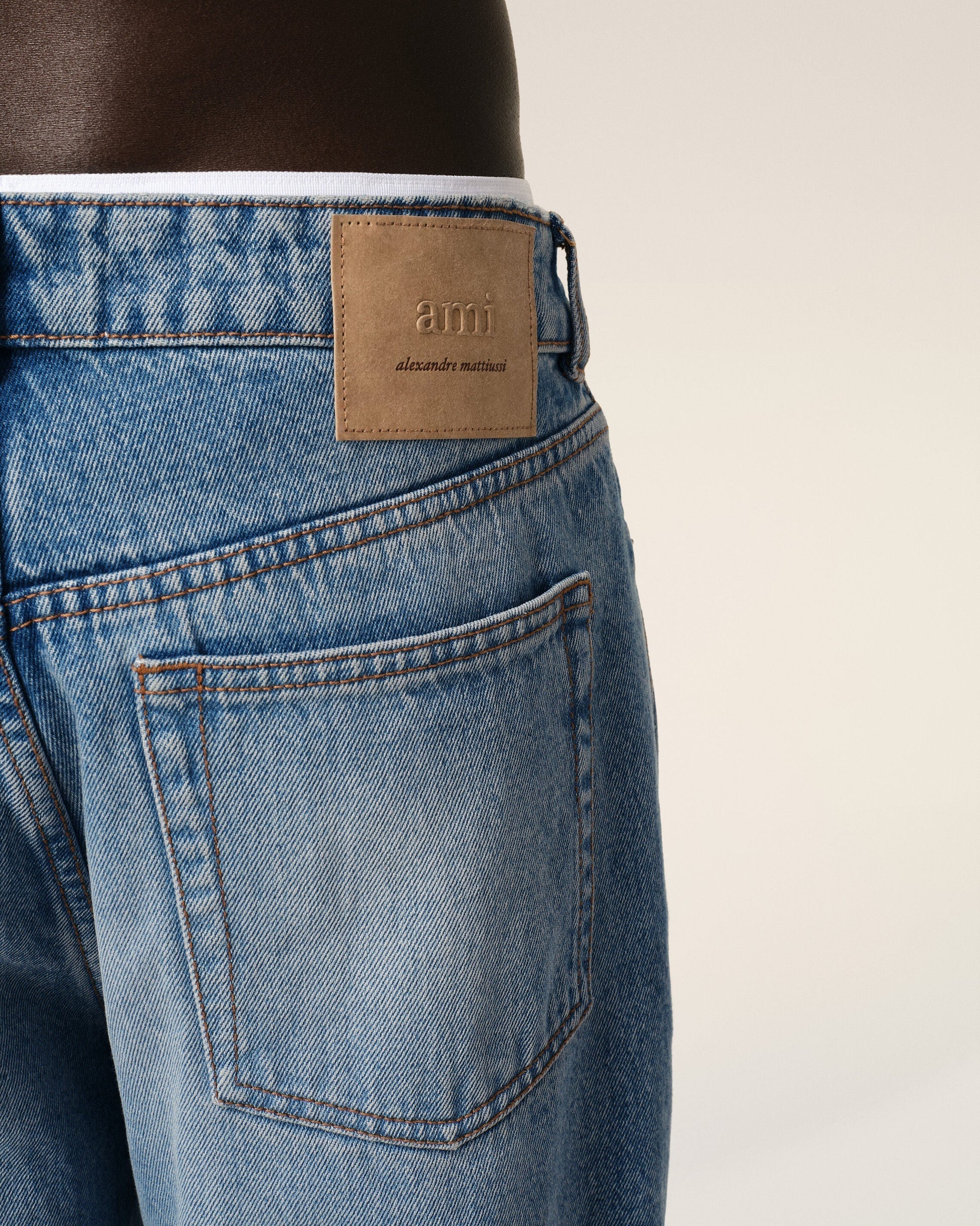 Large fit jeans in used indigo denim. Large fit Classic waist Large leg Buttoned fly 5 pockets Denim metal rivets and buttons in nickel color "ami alexandre mattiussi" patch on the back Tobacco topstitches 27 cm bottom leg width (size 30) Made in Portugal (with love) REF: HTR450.DE0046.480