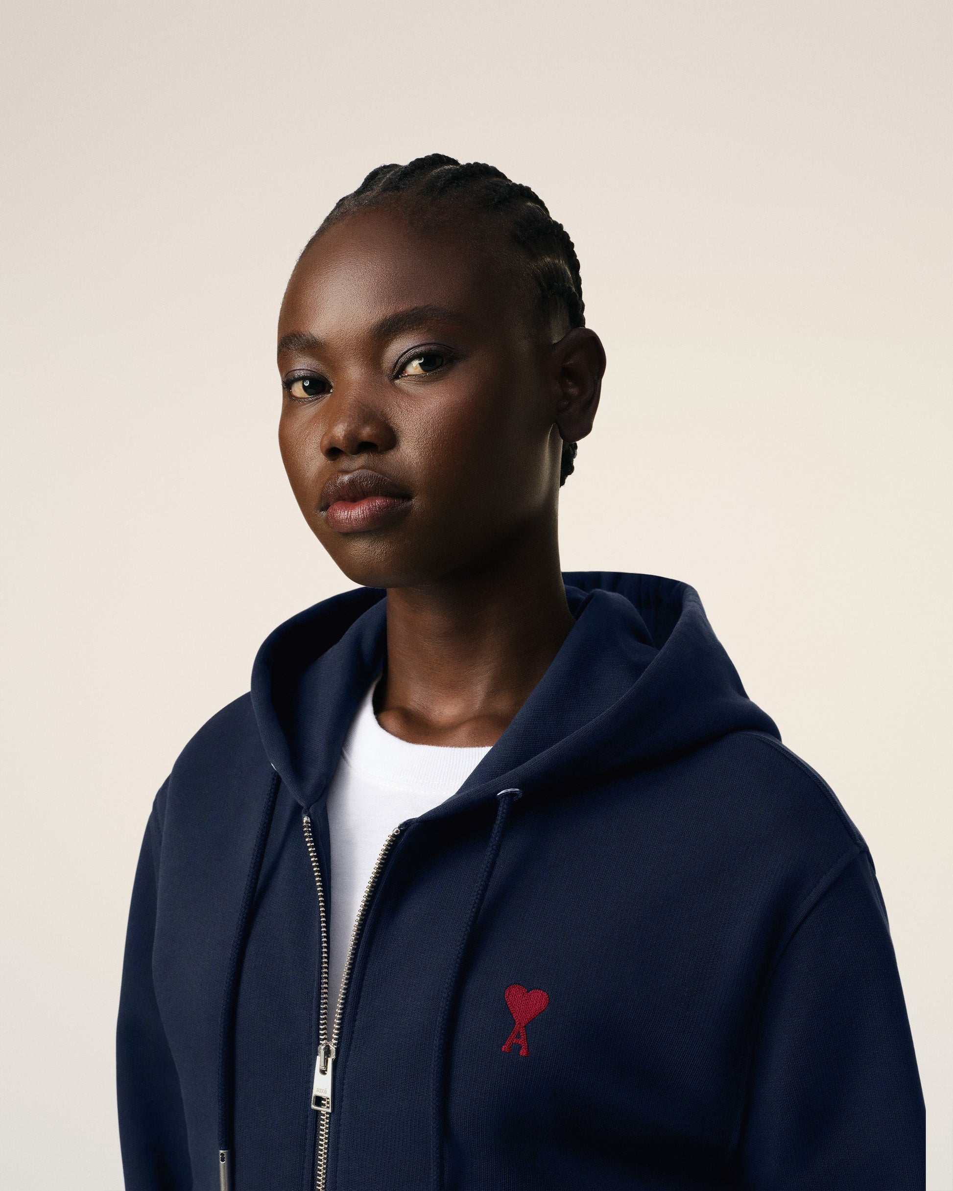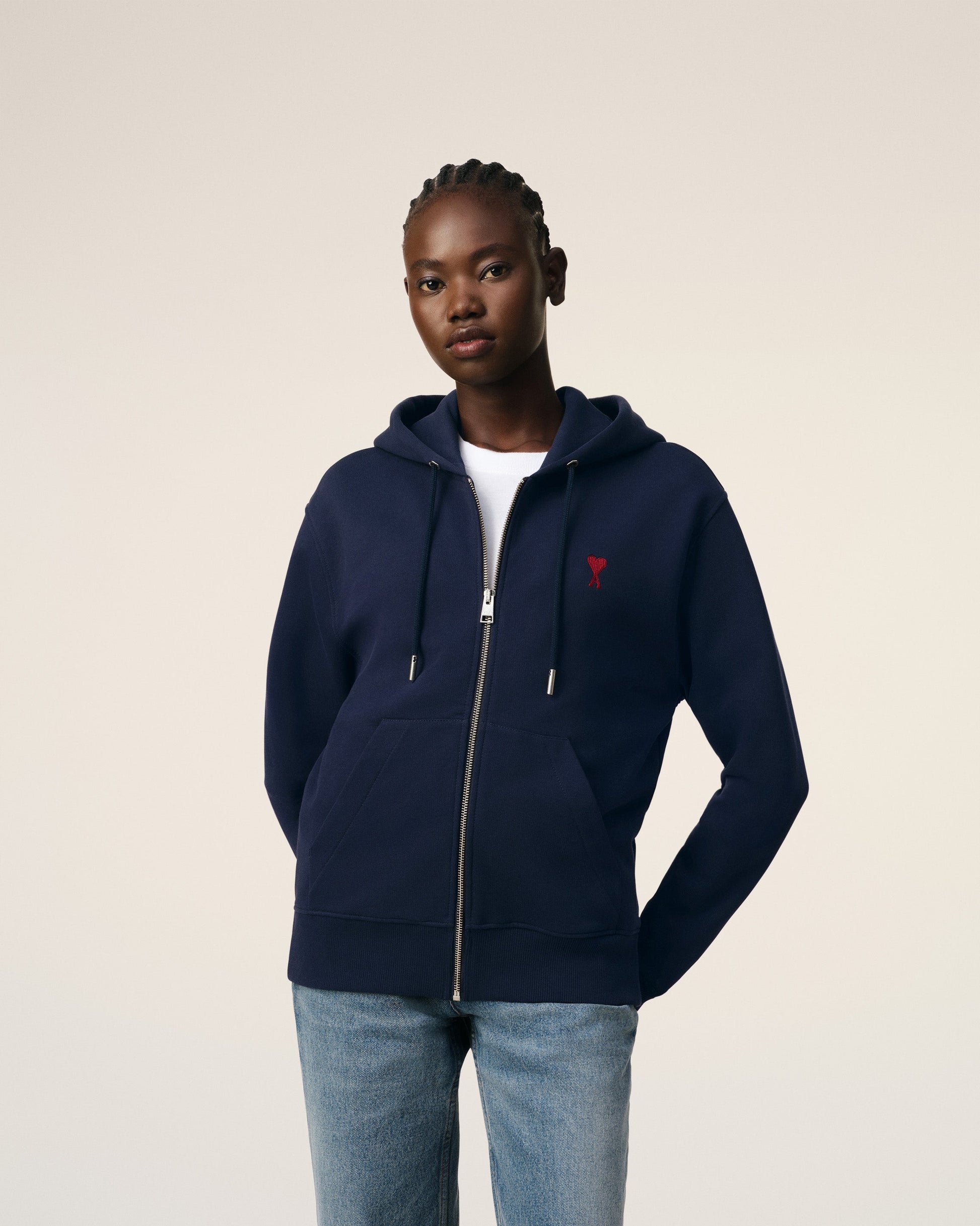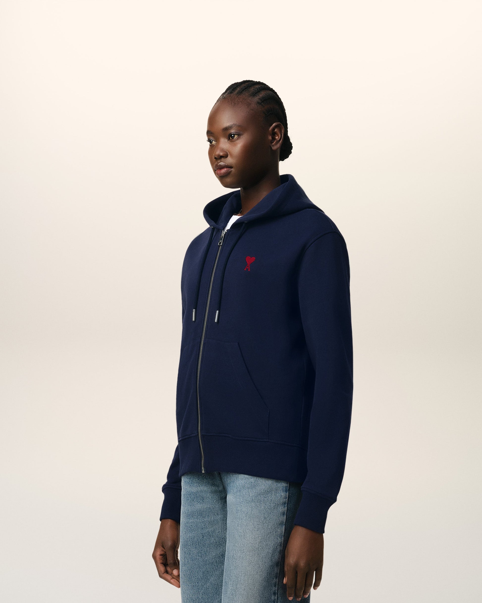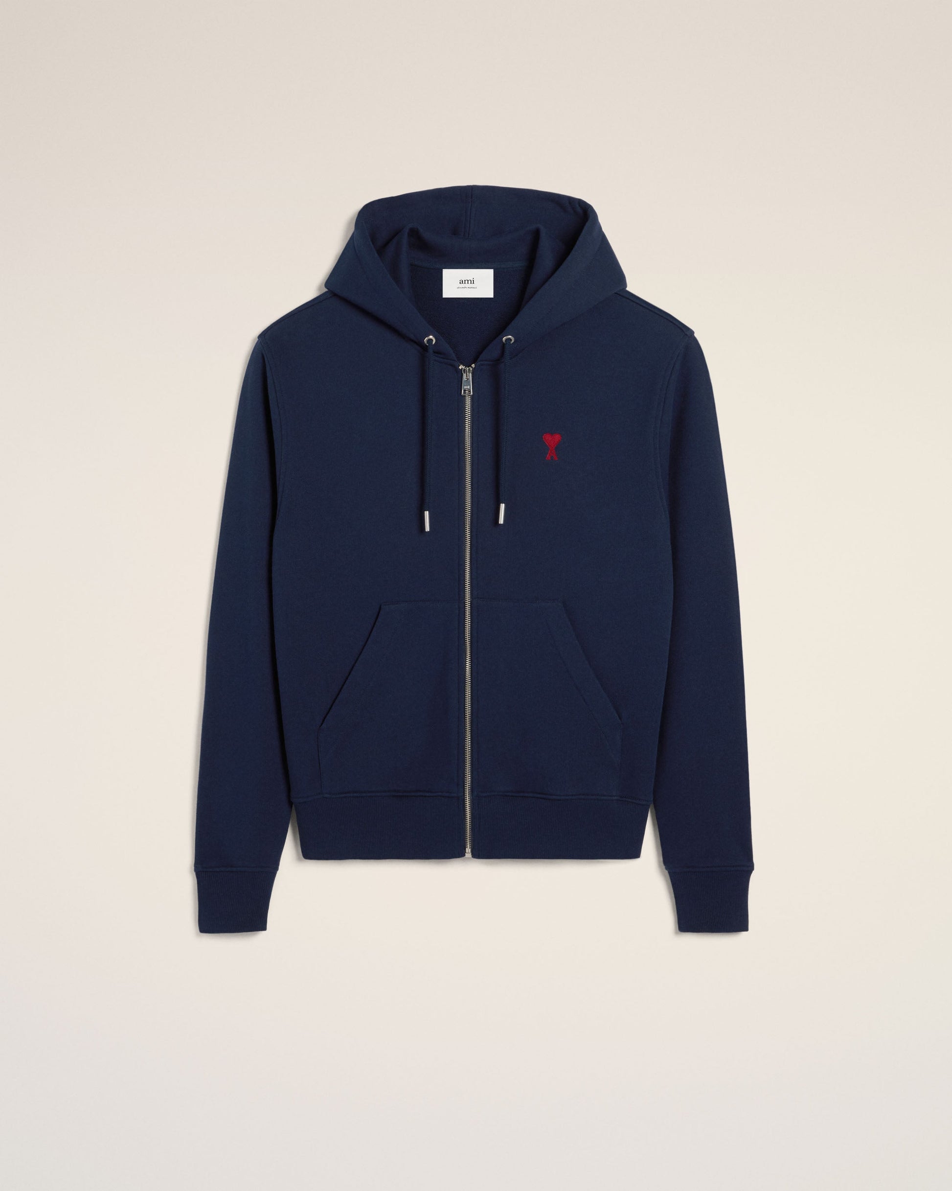 Zipped Ami de Coeur hoodie in loopback organic cotton fleece. Classic fit Unisex Product Nickel color metal zipper Red Ami de Coeur chest embroidery Tonal "ami" embroidery under back neckline Nickel color metal ends and engraved eyelets Puller "ami" engraved 60,5 cm center back length (size XS) 68,5 cm center back length (size M) Made in Portugal (with love) REF: BFUSW435.730.430