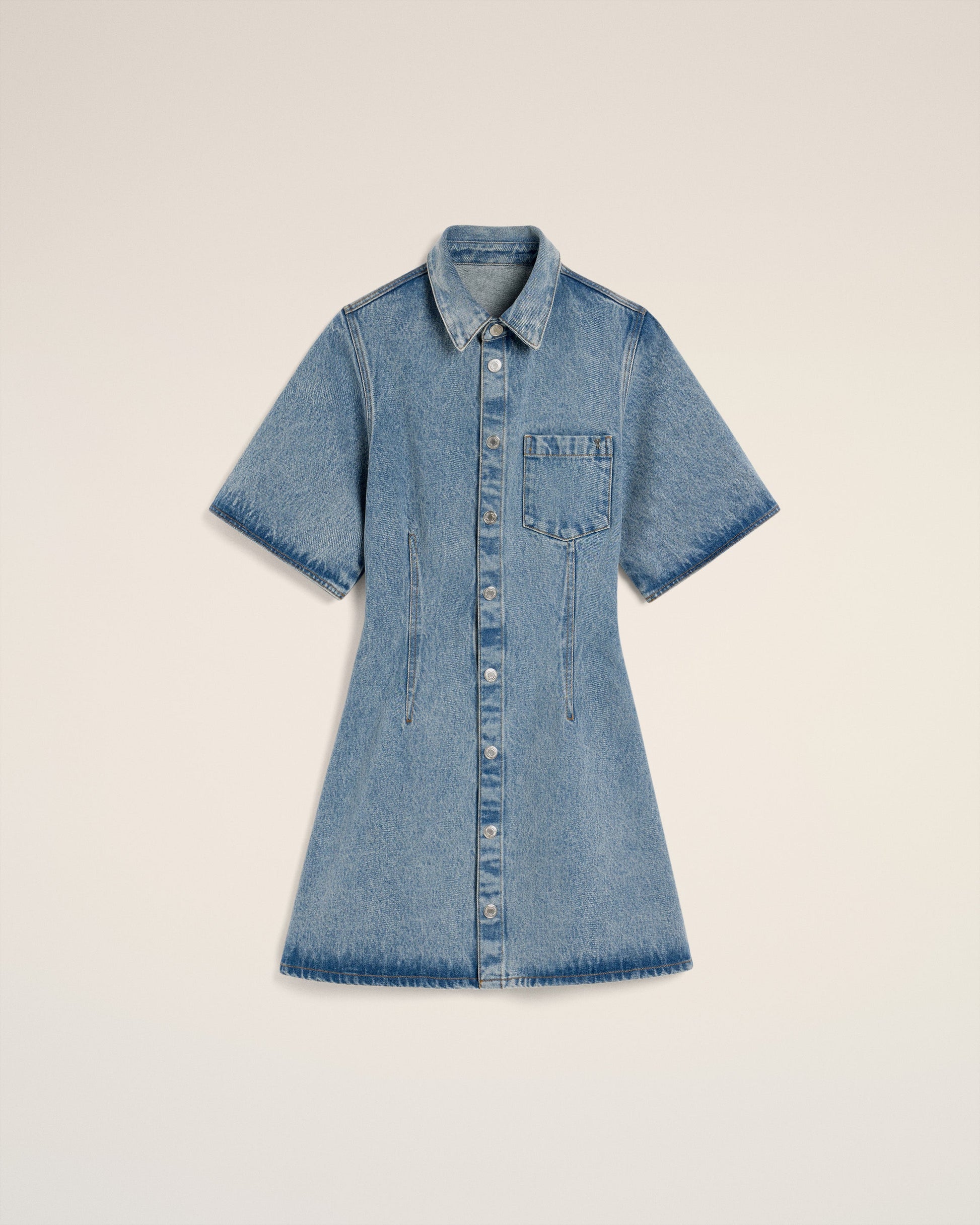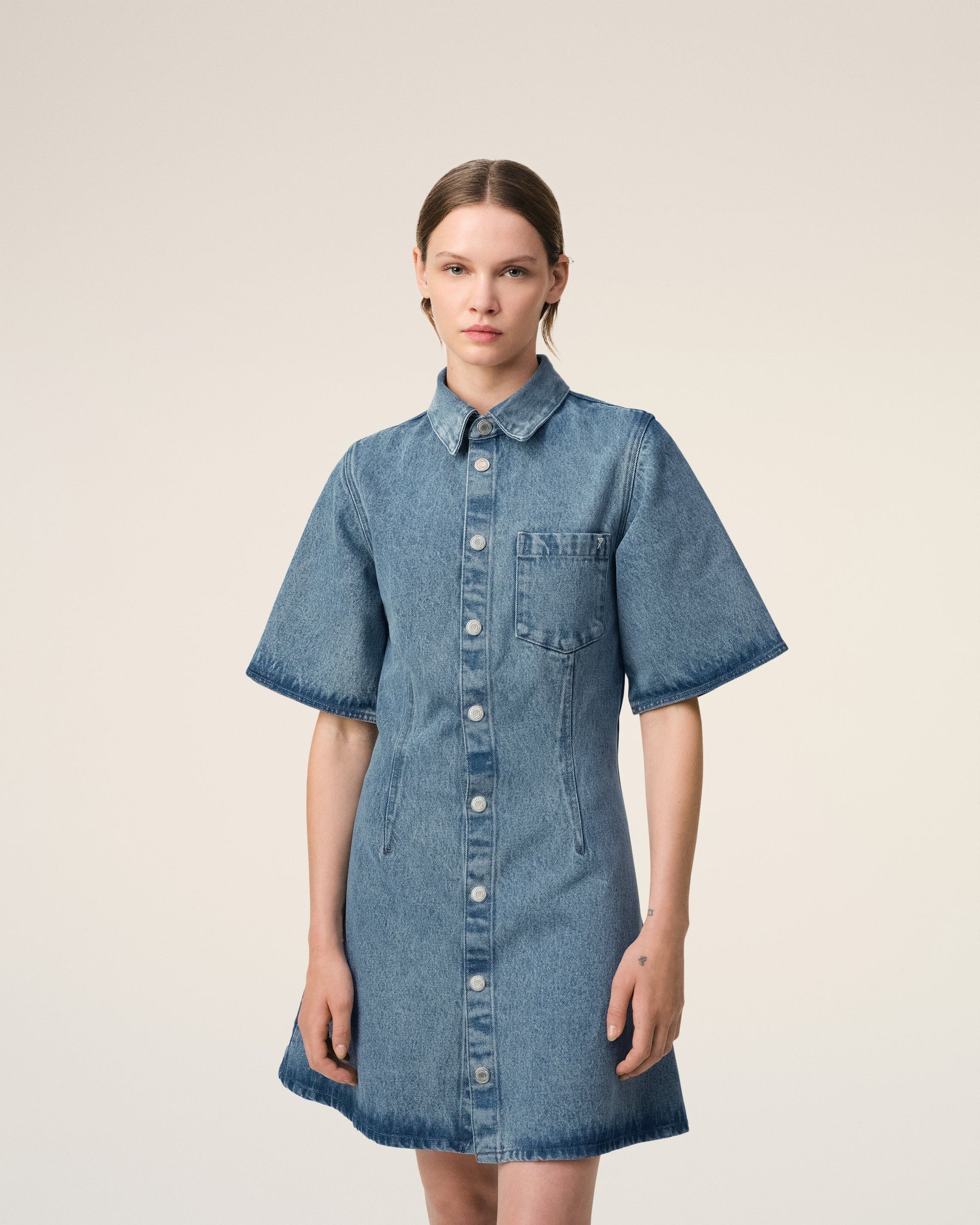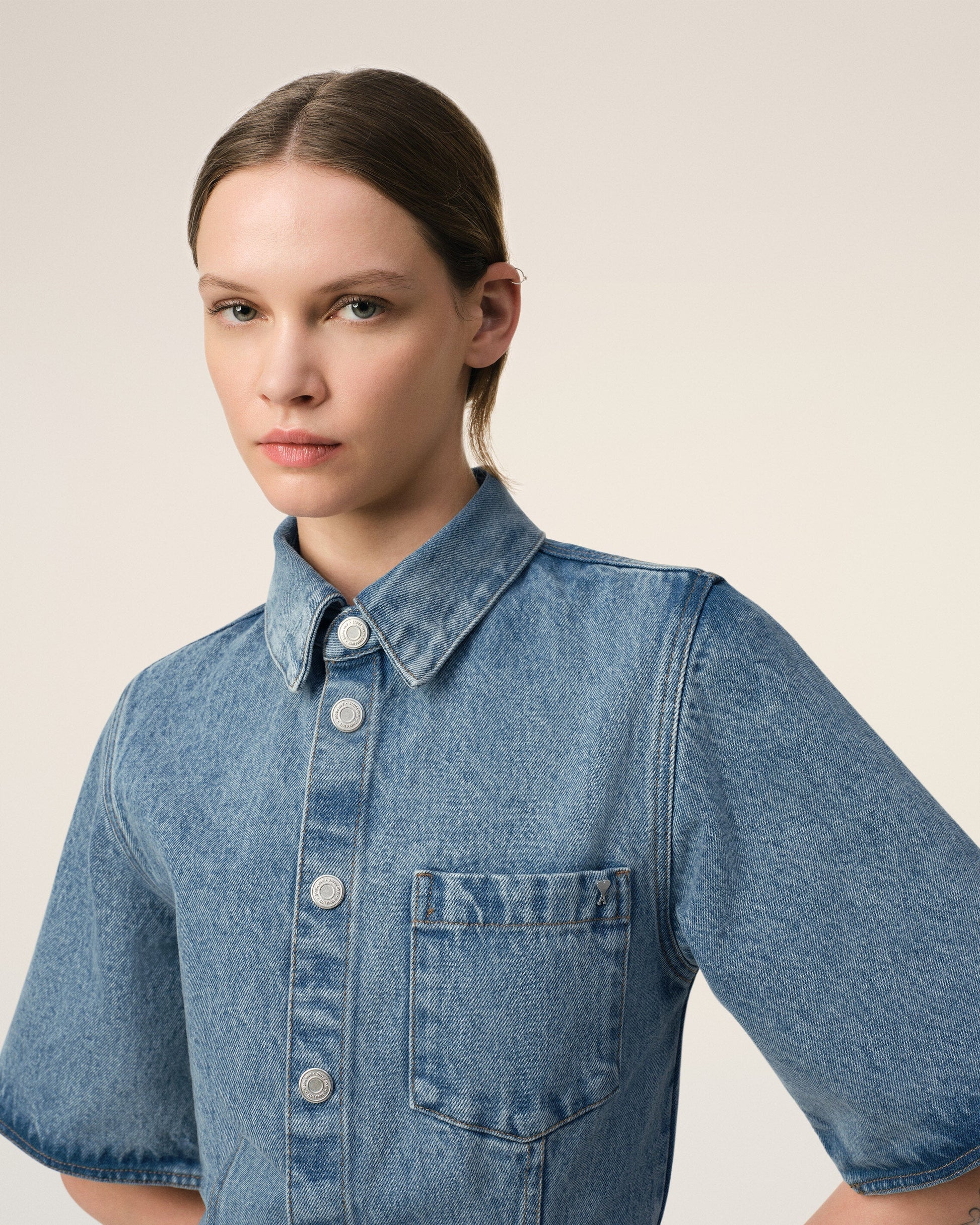Short sleeve shirt dress in used indigo denim. Fitted fit 87 cm center back length (size S) Chest pocket Ami de Coeur rivet on chest pocket Denim snap buttons in nickel color Tobacco topstitches Made in Portugal (with love) REF: FDR404.DE0046.480