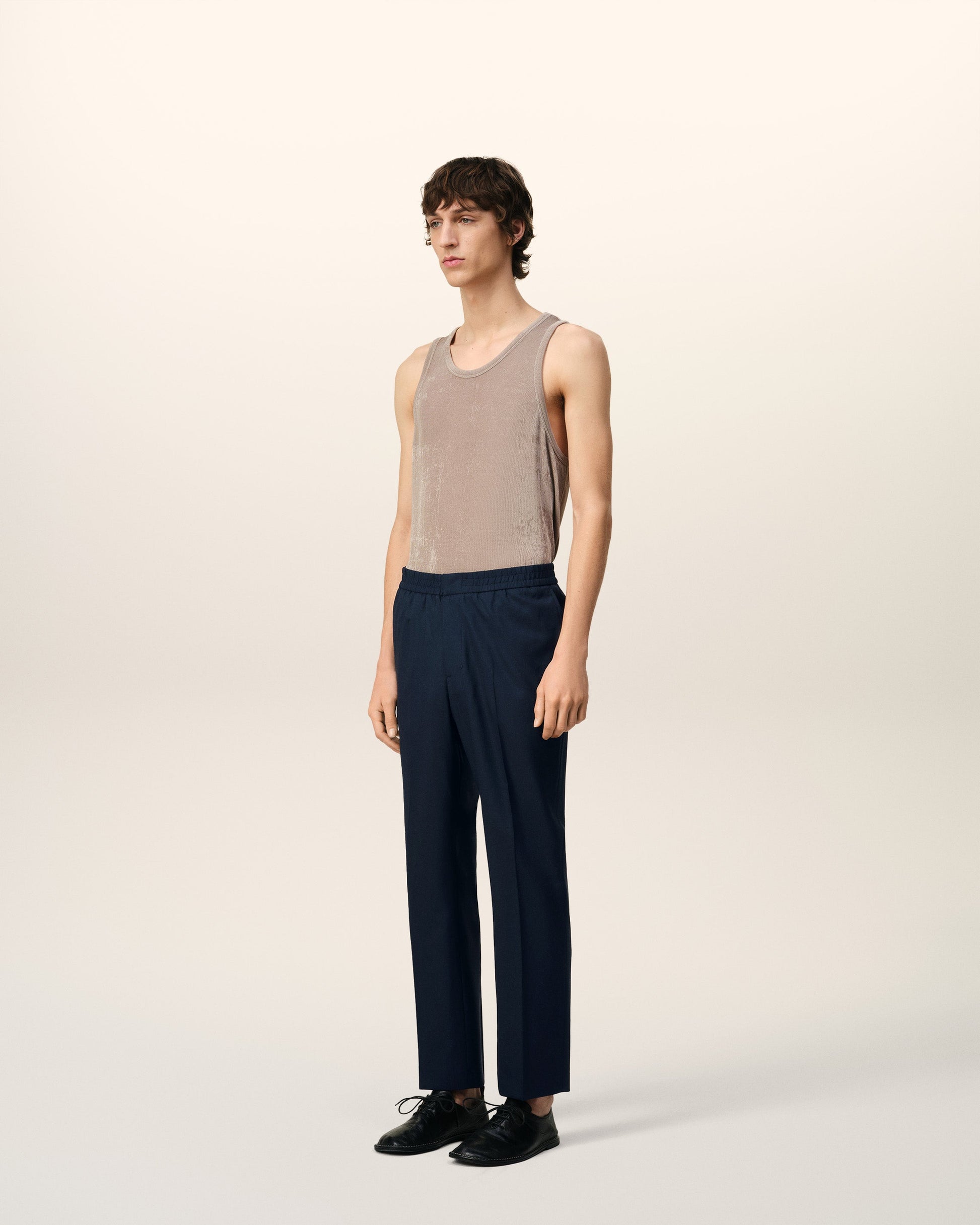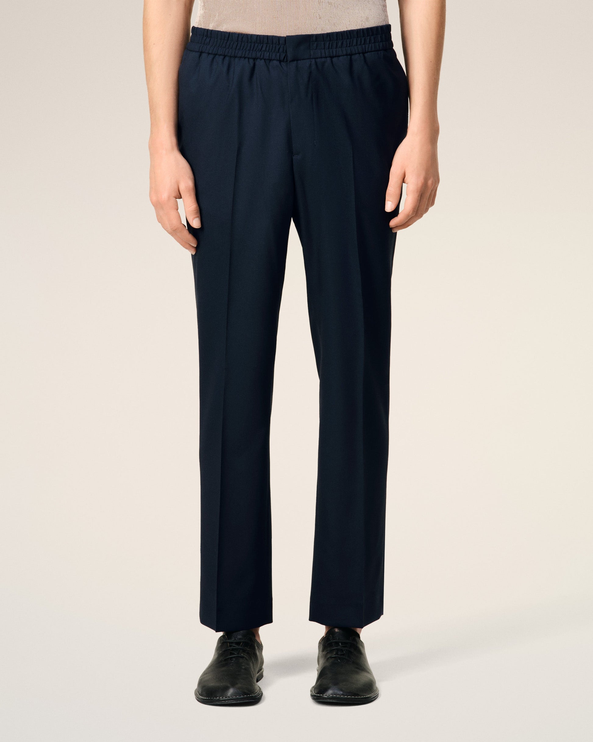 Elasticated waist in wool canvas. Straight fit 19 cm leg opening Elasticated belt with button inside Internal waist drawstring Side pockets Welt pockets with buttons on the back Zipped fly Horn buttons Made in Portugal (with love) REF : HTR226.WV0044.4011