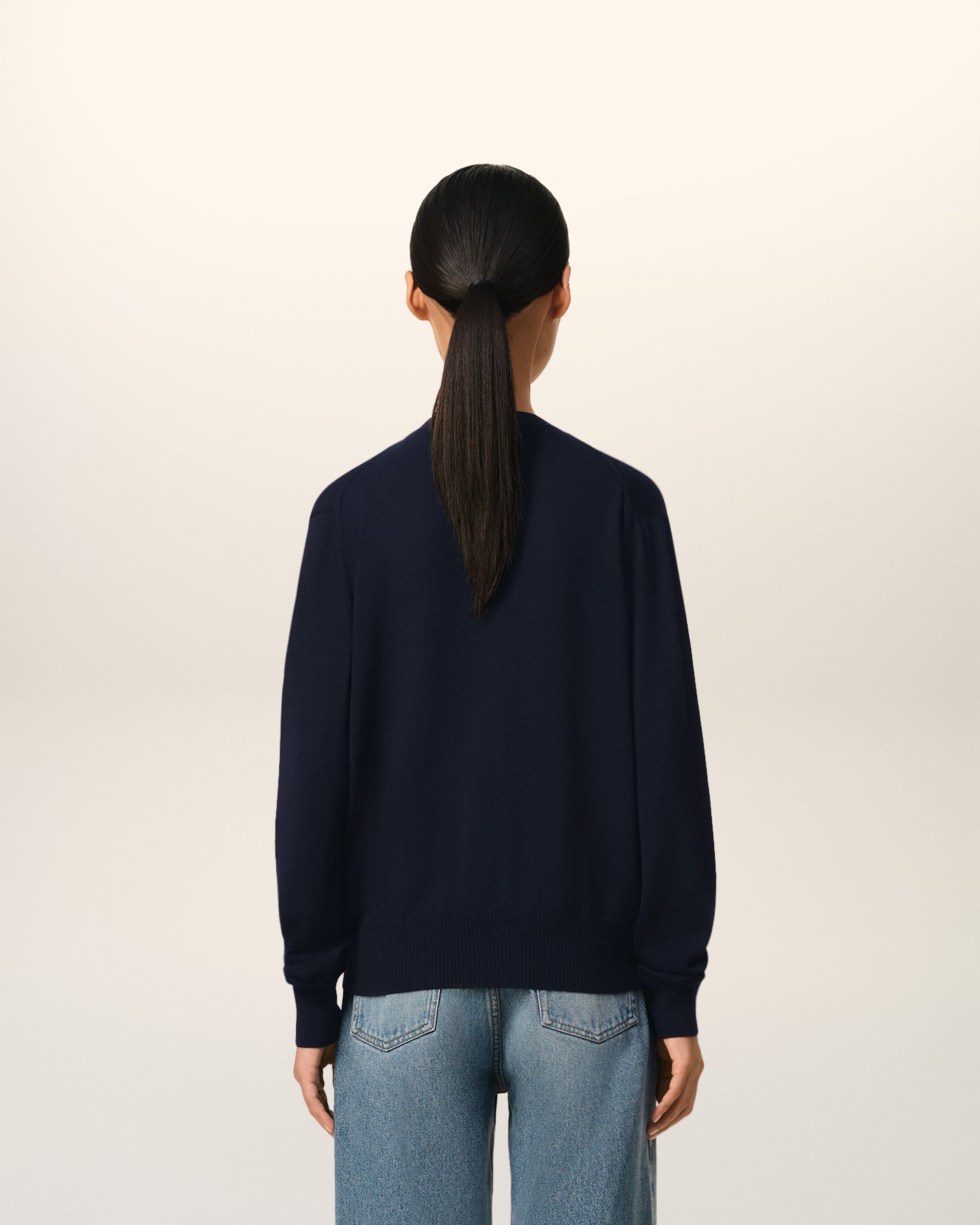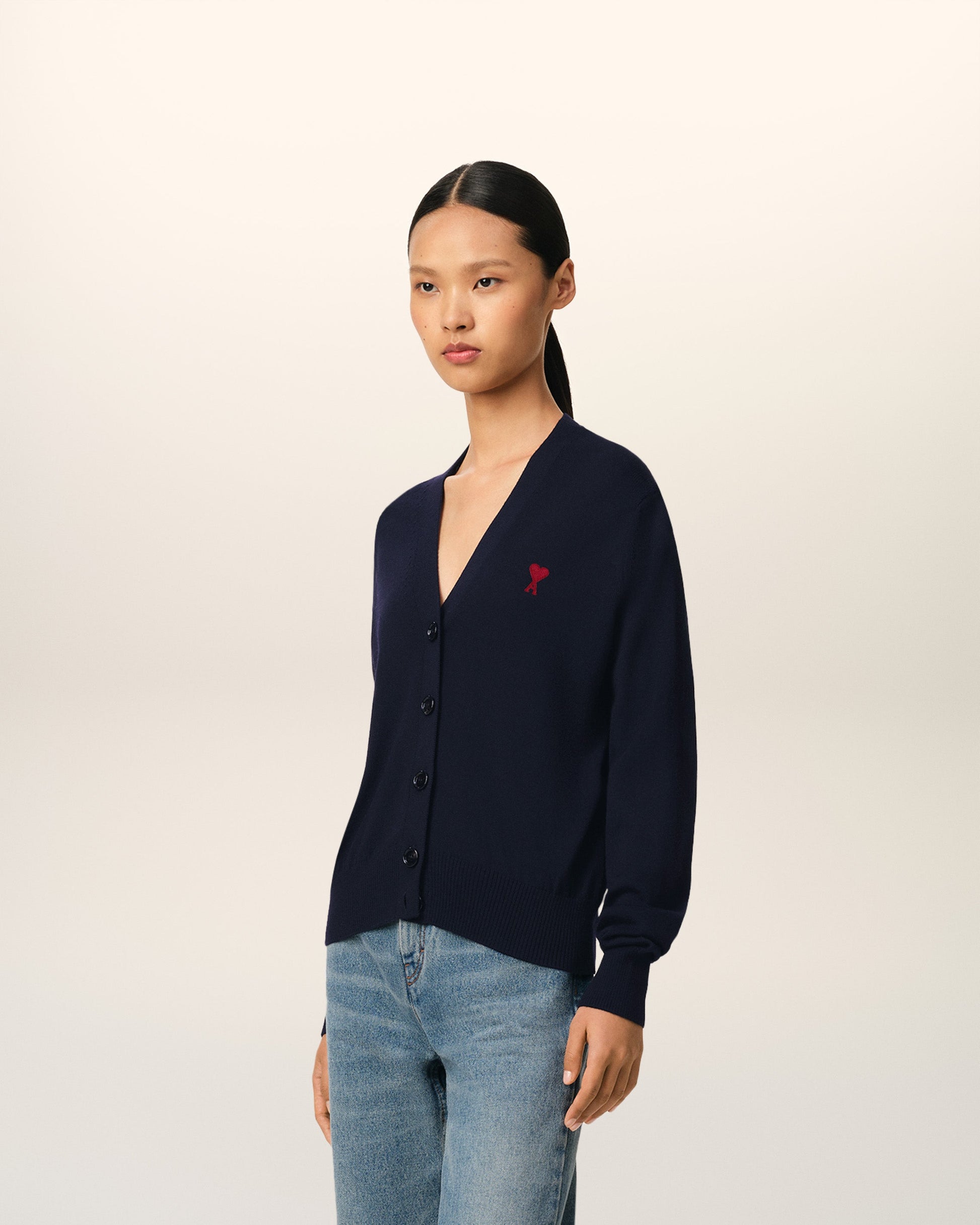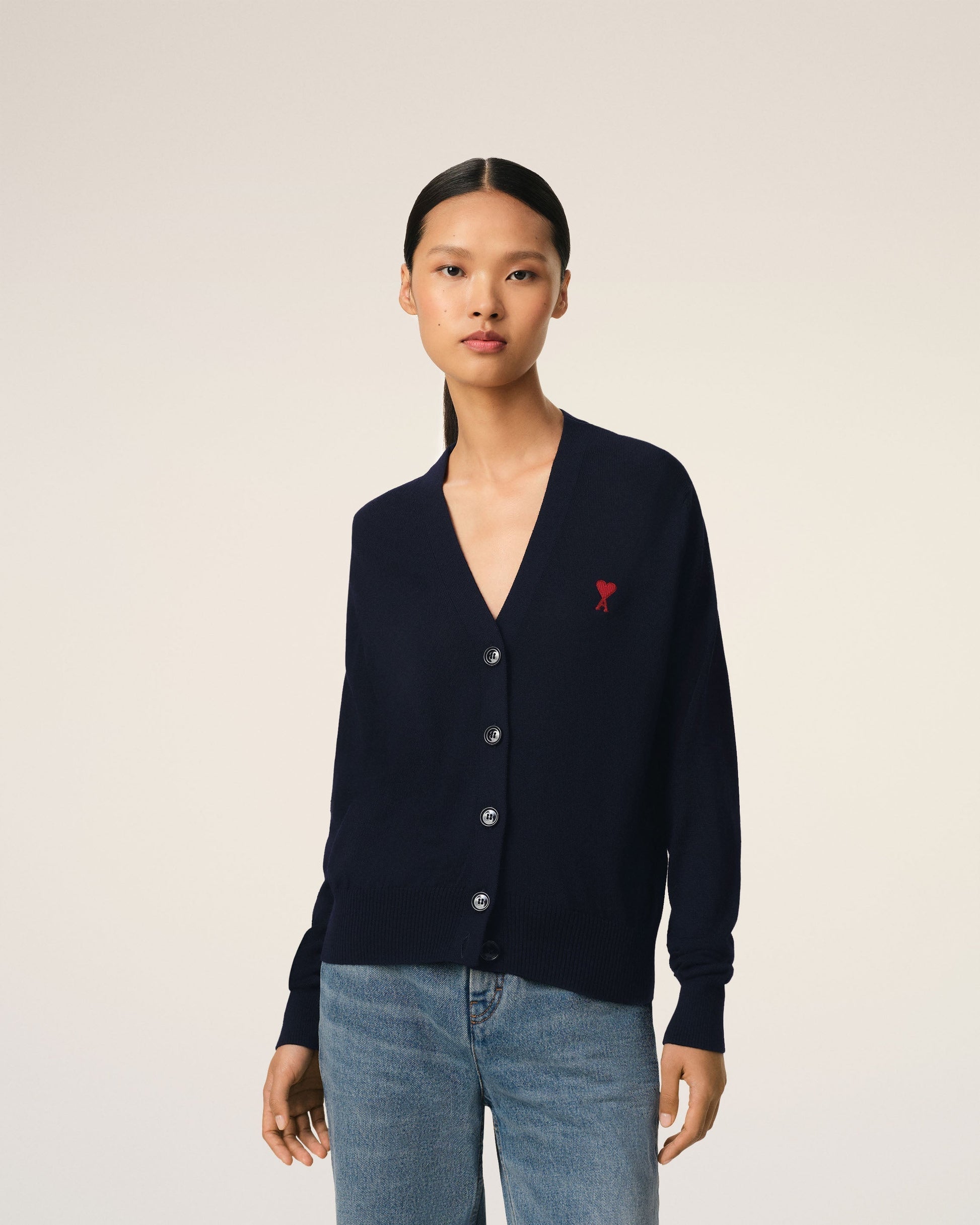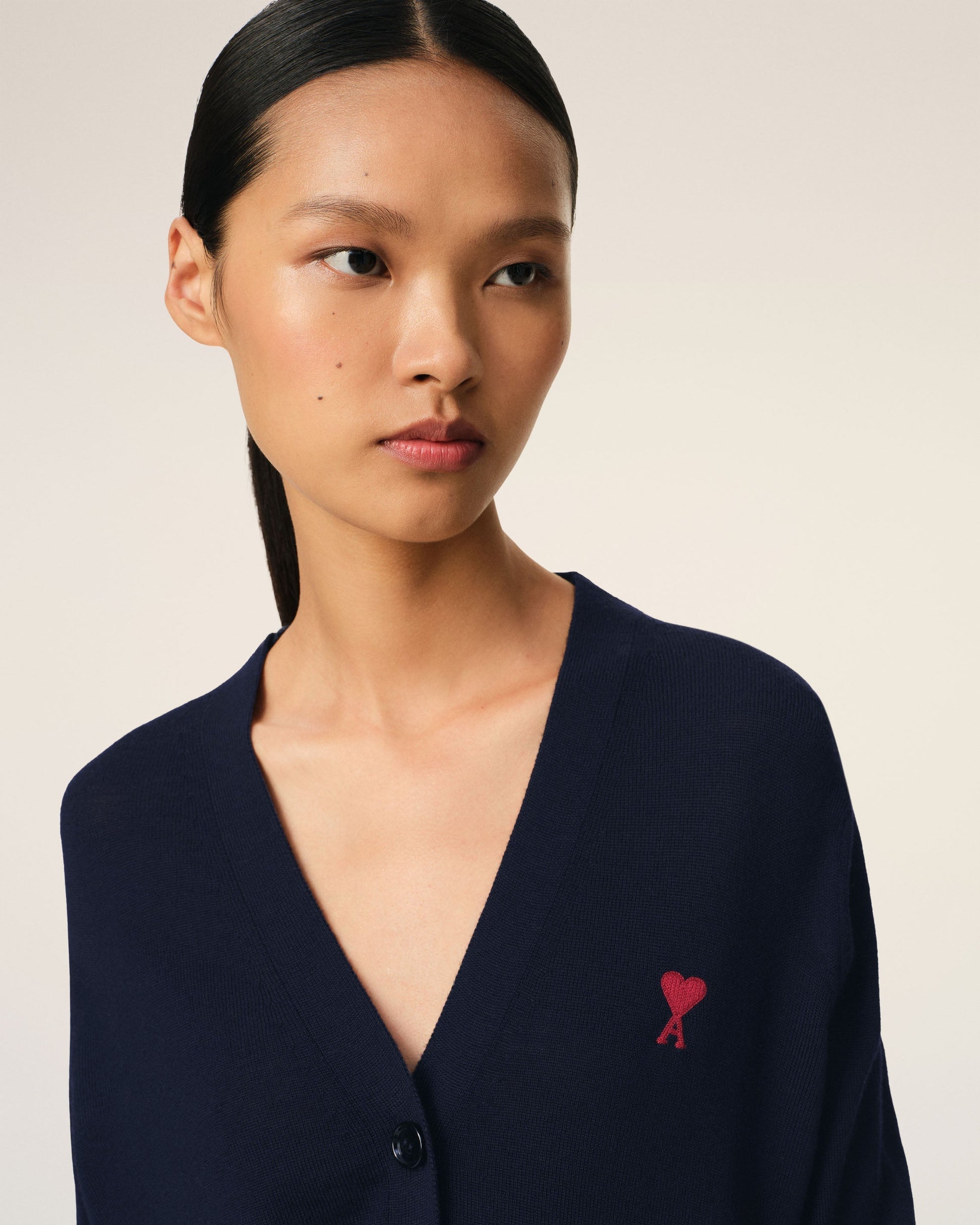 Cardigan in classic merino wool. Jersey stitch Red Ami de Coeur chest embroidery 57 cm center back length (size S) Made in Portugal (with love) REF: BFFKC111.KN0025.430