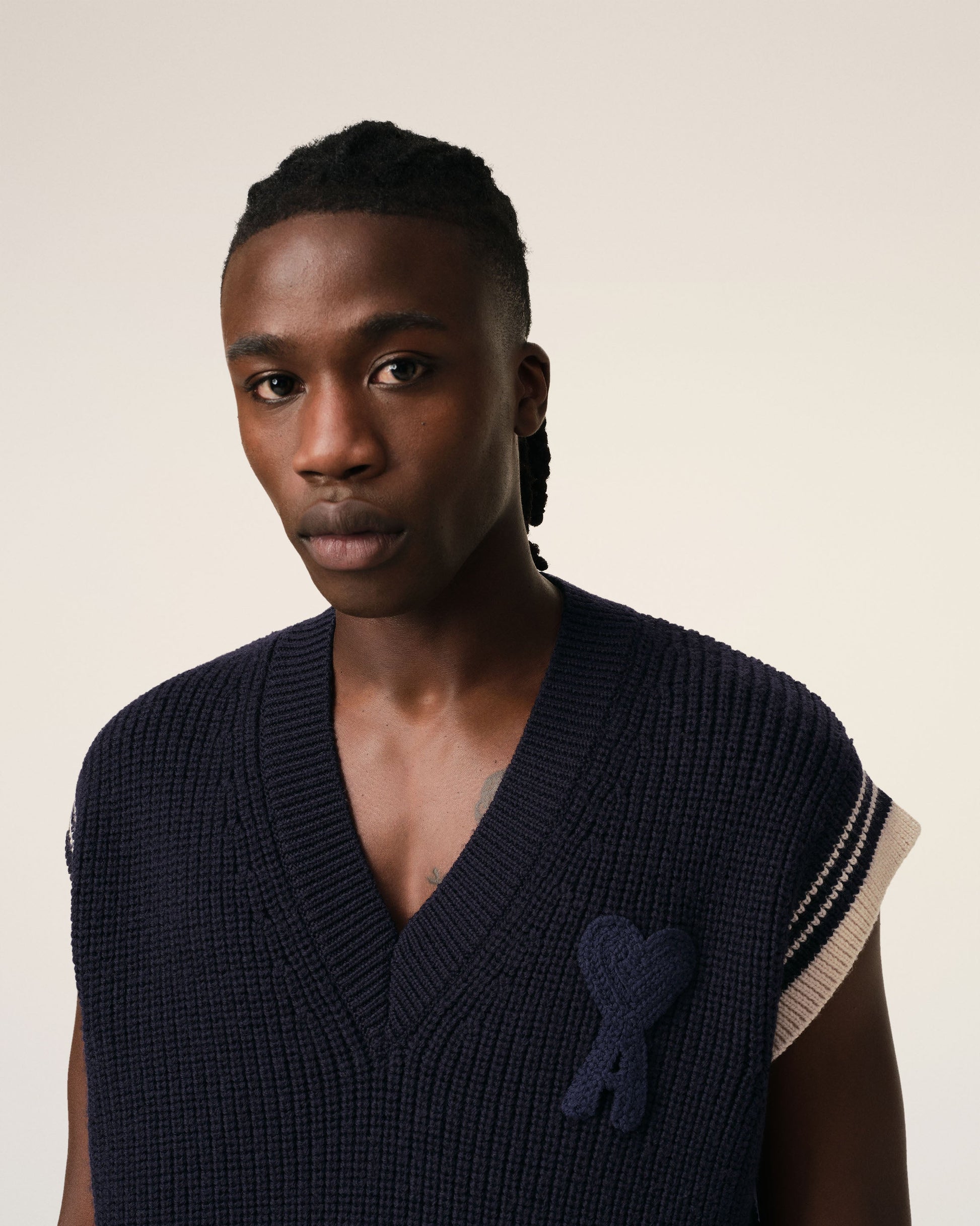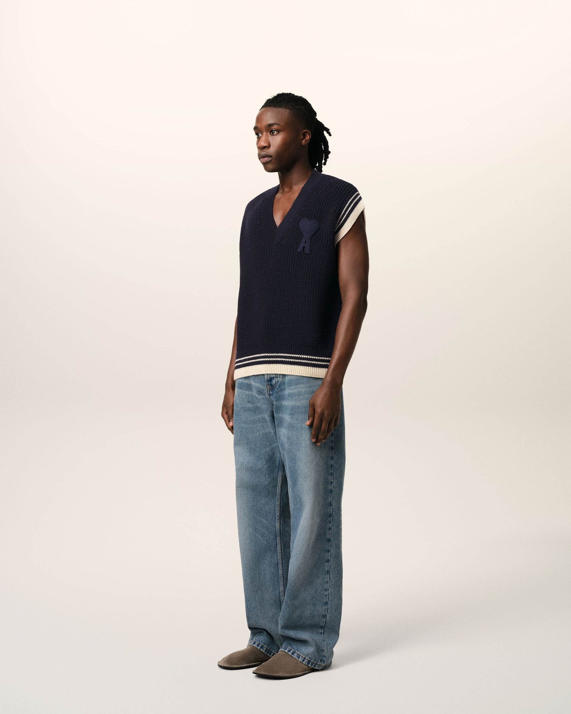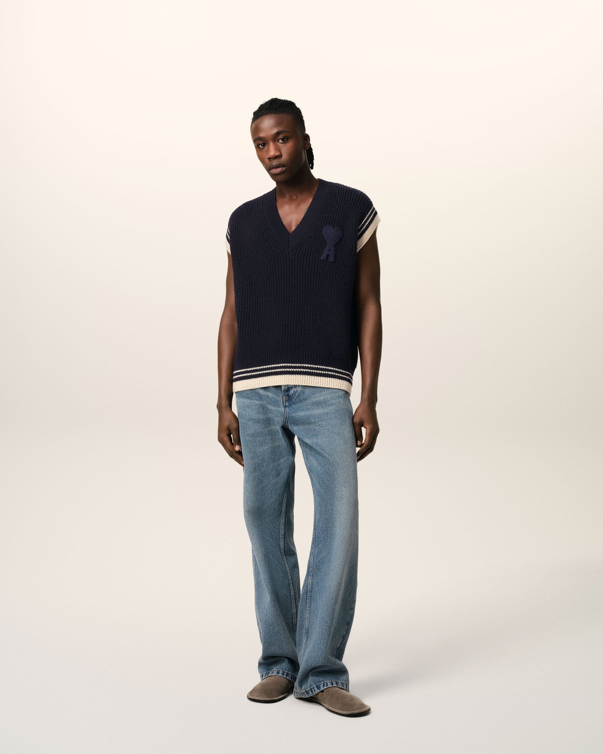 Navy Wool Ribbed Sleeveless V Neck Sweater