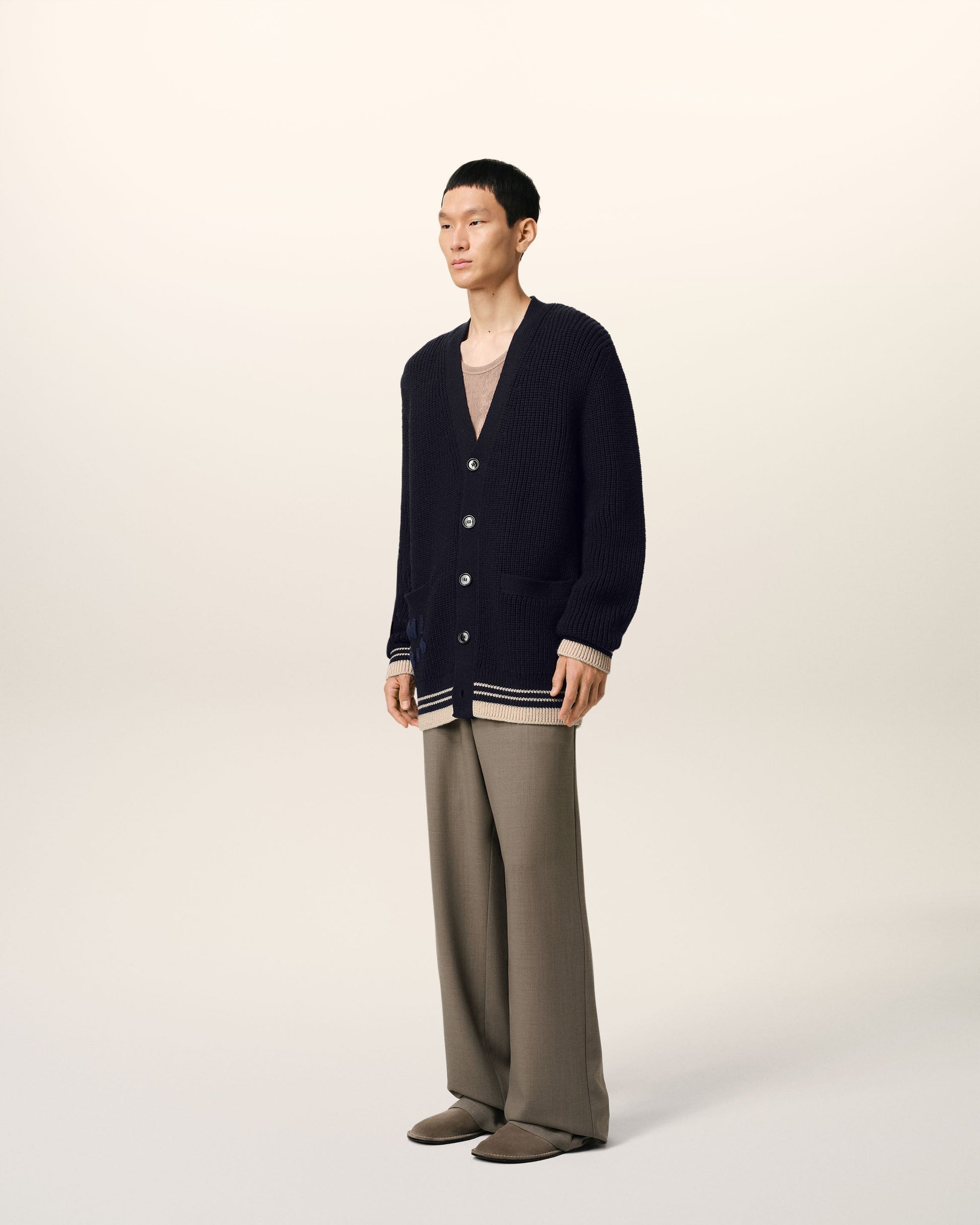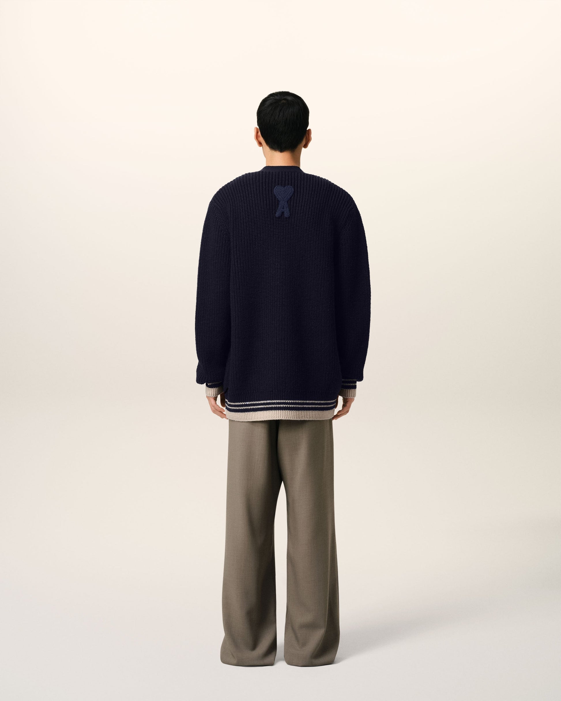 Cardigan in college ribs wool. Unisex product Half english ribs stitch "AMI Paris" knitted patch embroidered under right pocket Ami de Coeur knitted patch embroidered on the back under collar 73 cm center back length (size M) 59 cm center back length (size XS) Made in Portugal (with love) REF: UKC168.KN0068.4011