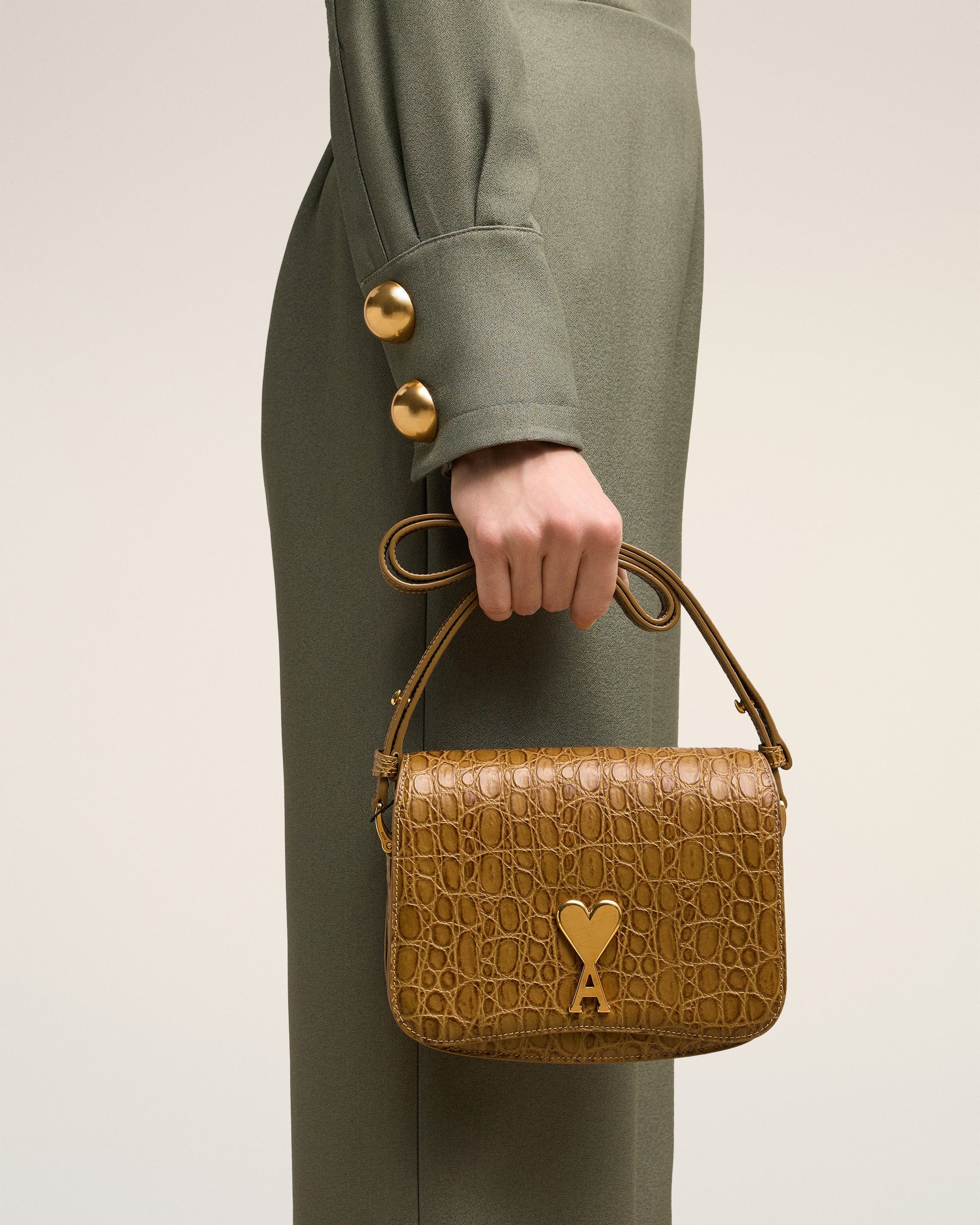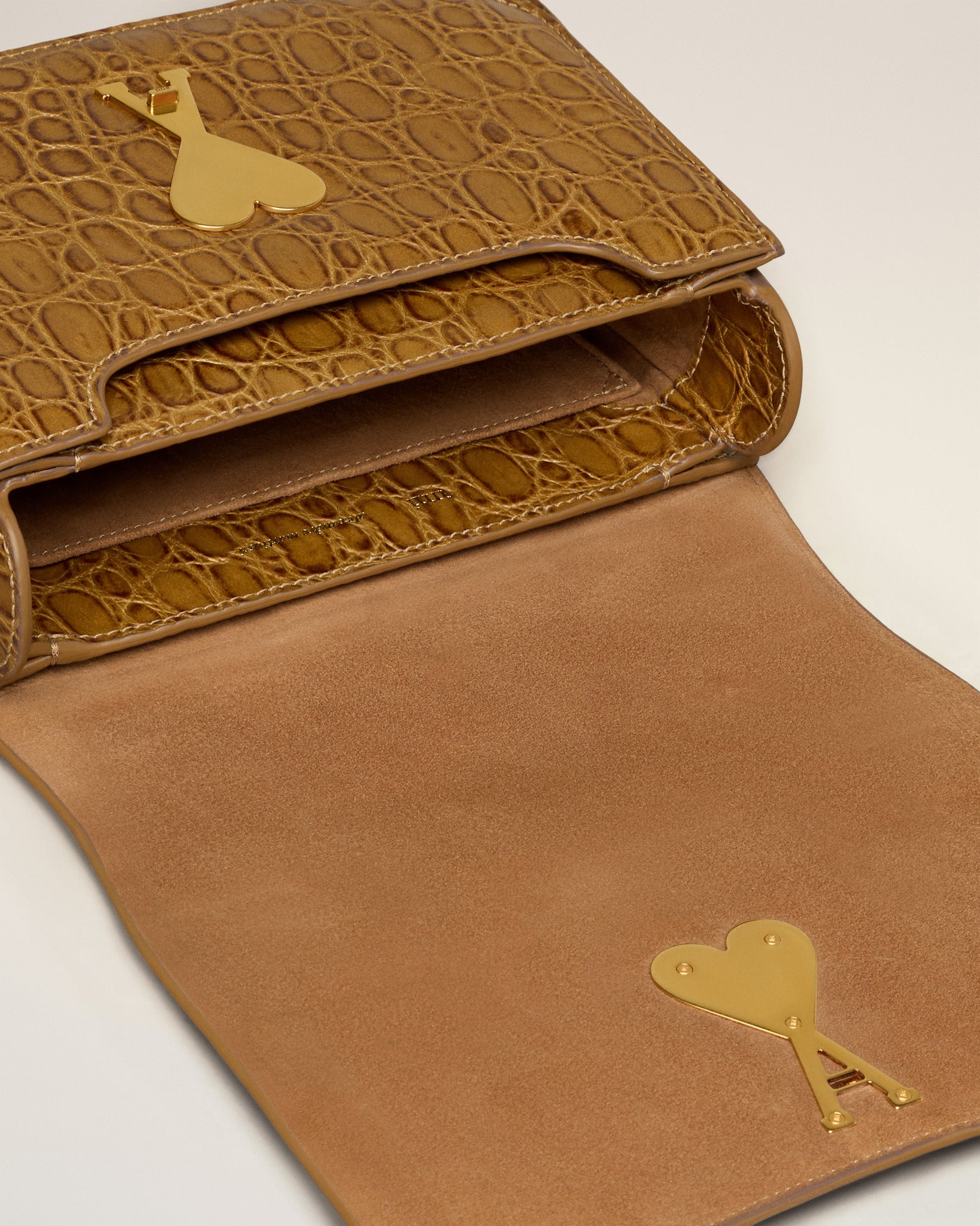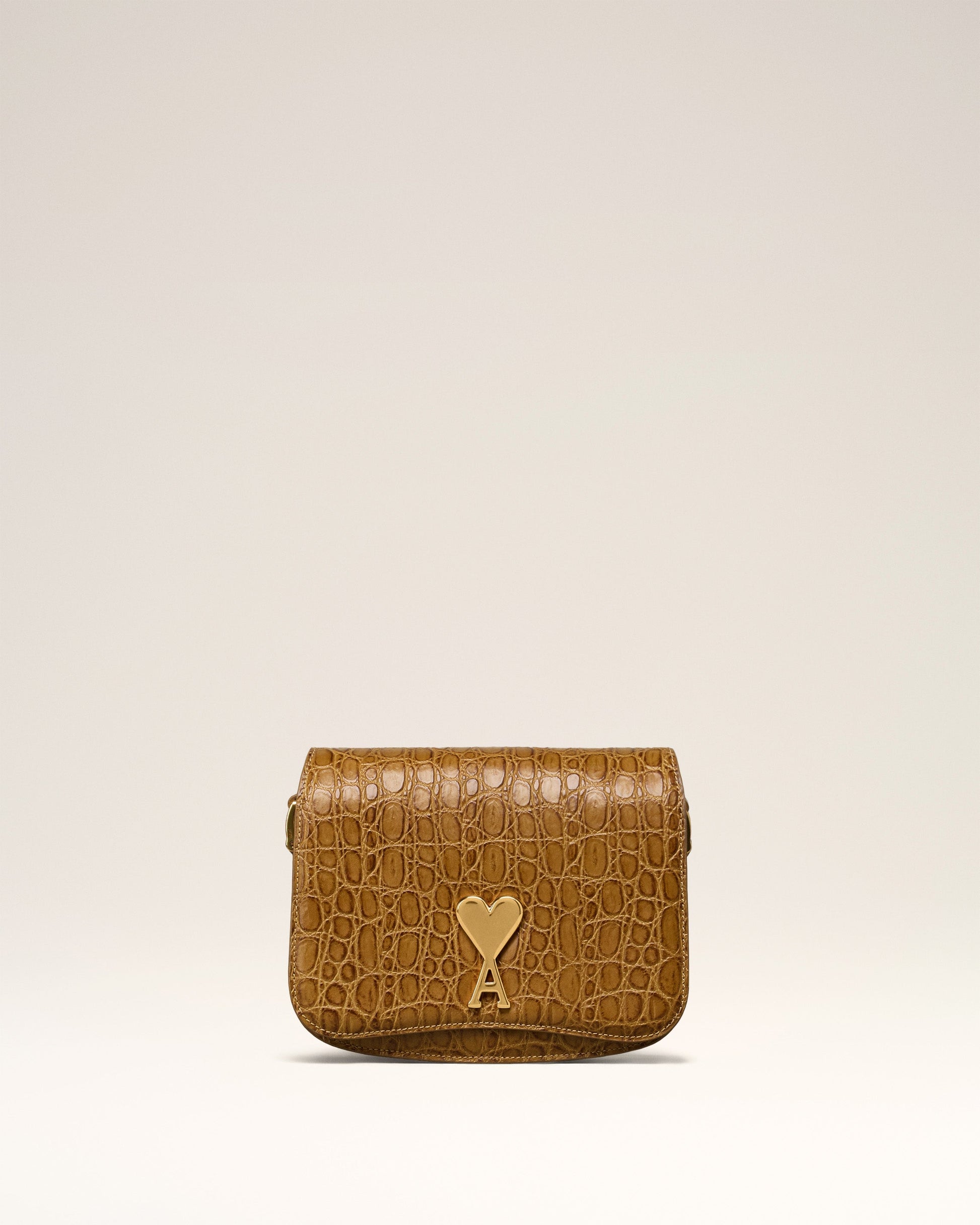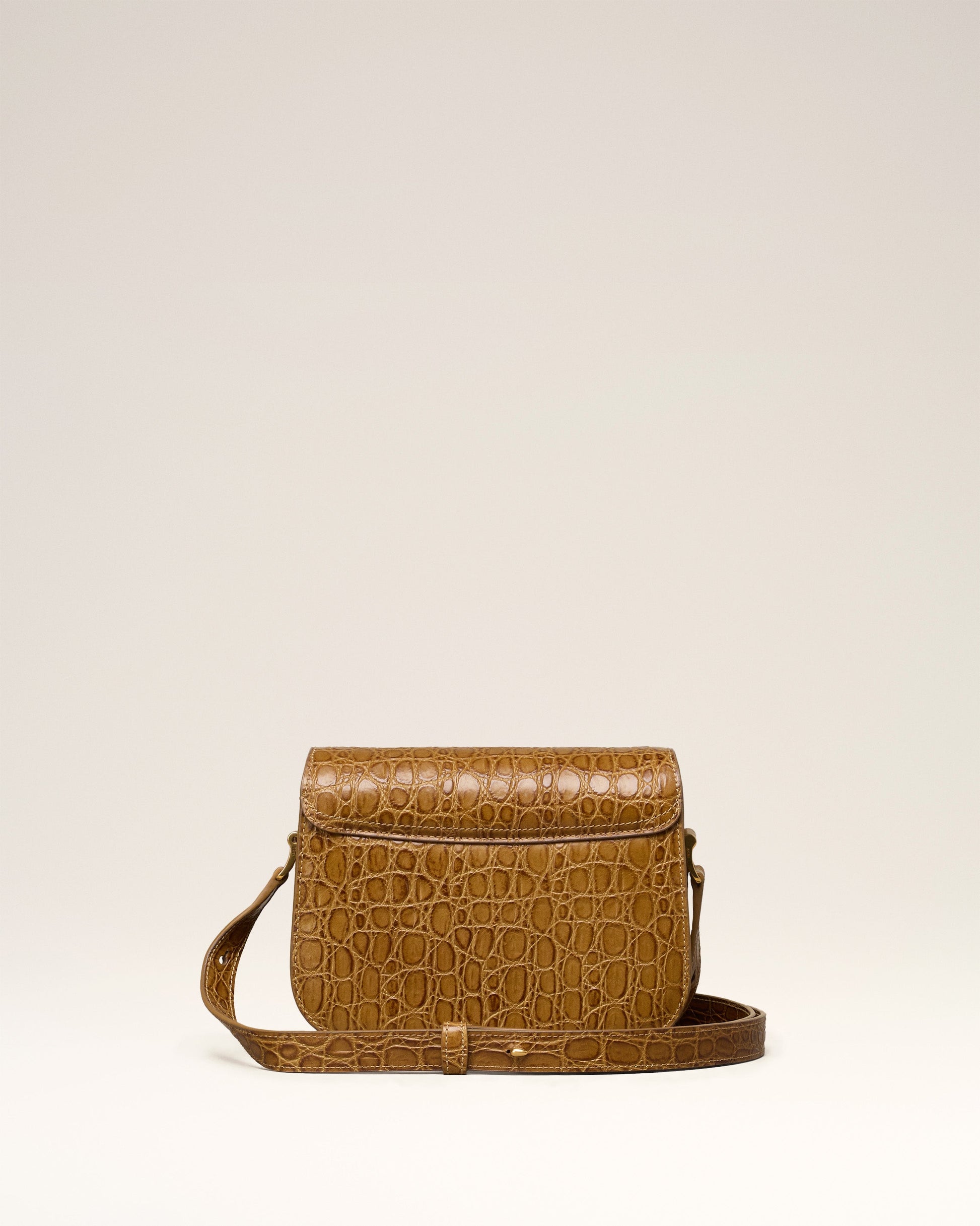 Paris Paris bag in caiman embossed leather. Suede lambskin lining Ami de Coeur clasp One central compartment with a patched pocket and one front compartment Adjustable leather strap, crossbody or shoulder carry Metal hardware in vibrated brass color Size: 20x15x4.5 cm Made in Morocco (with love) REF : ULL005.AL0075.298