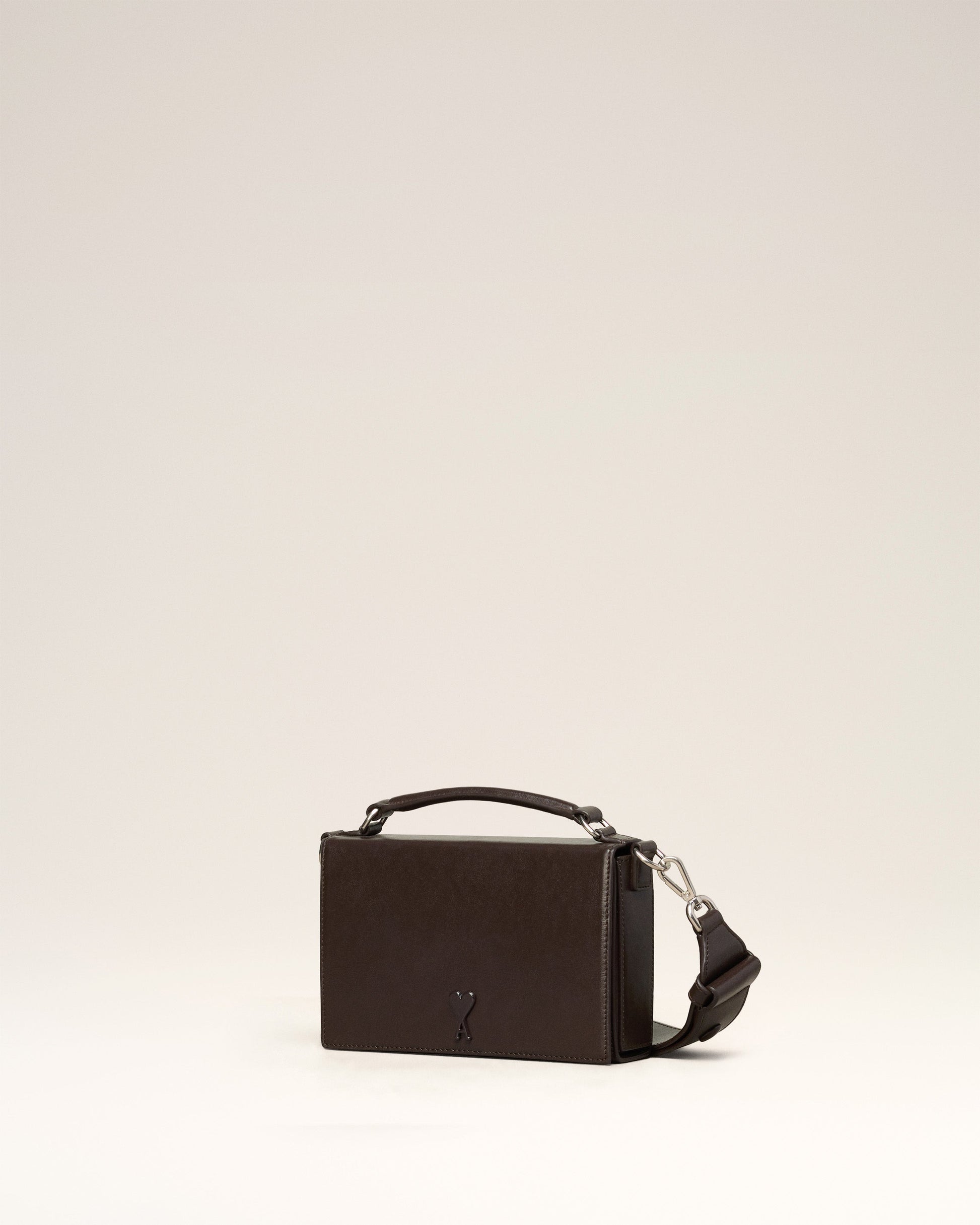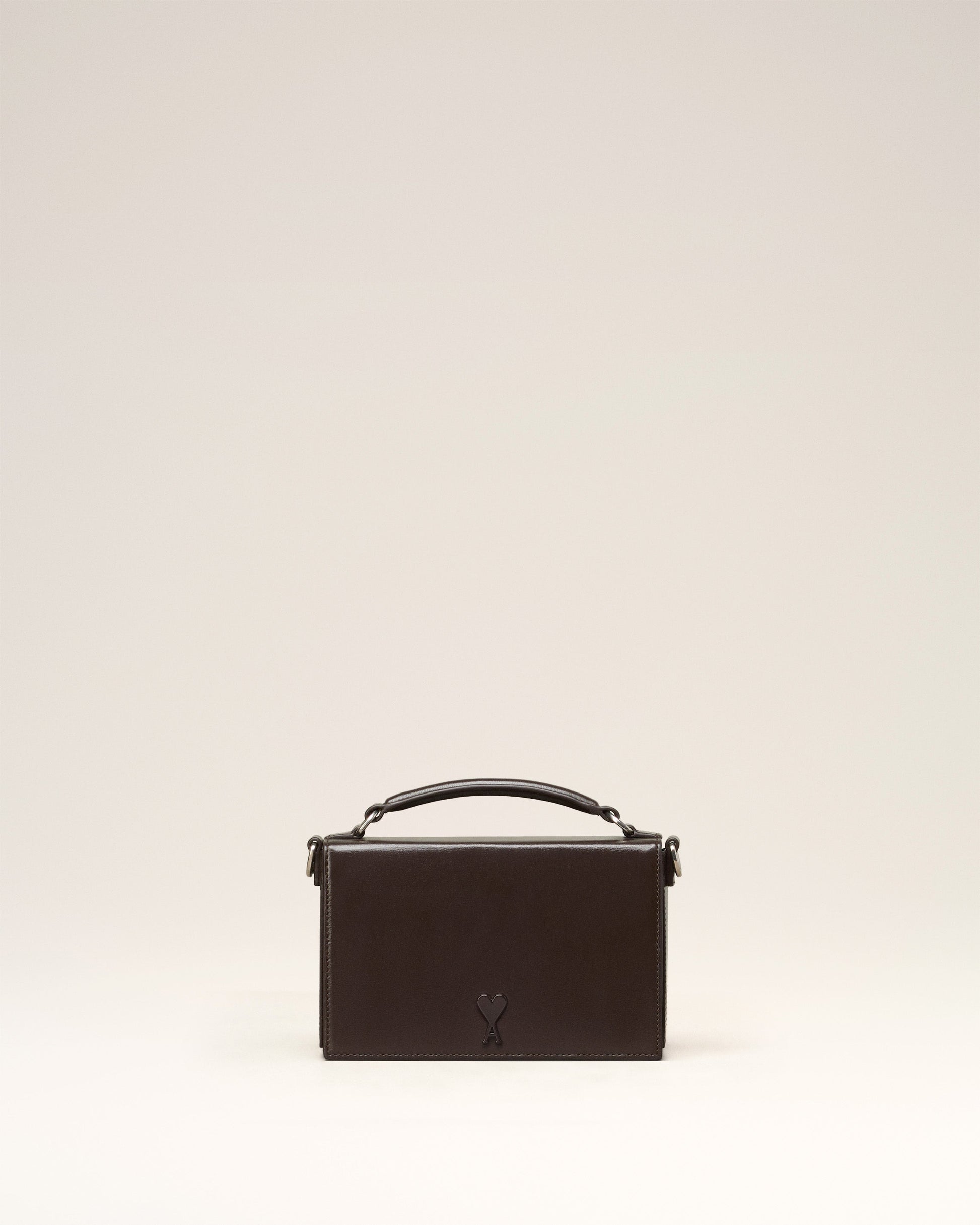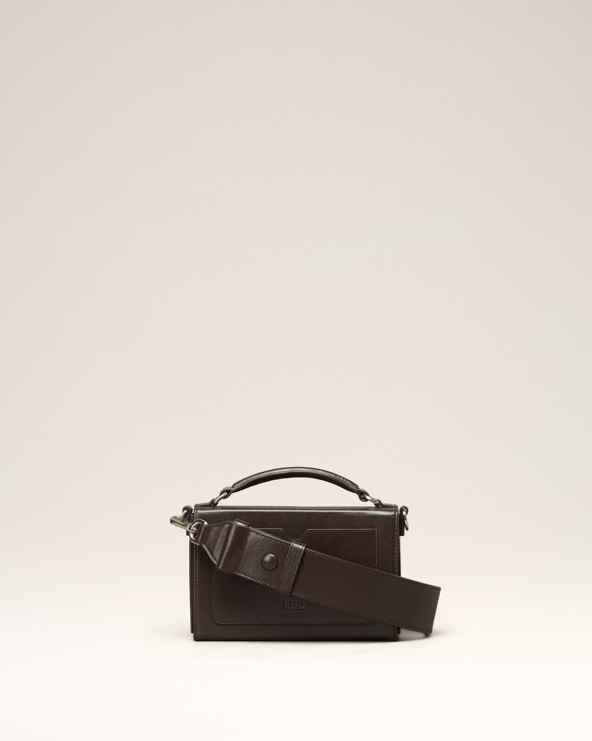 Lunch Box Bag in palmellato leather. Suedette lining Tonal Ami de Coeur stud One central compartment with a patched pocket Leather patched pocket on the back face Adjustable and removable leather strap, crossbody or shoulder carry Leather handle for a hand carry Magnetic flap closure Metal hardware in vibrated silver color Size: 17x10x3.5 cm Made in Morocco (with love) REF : ULL104.830.221