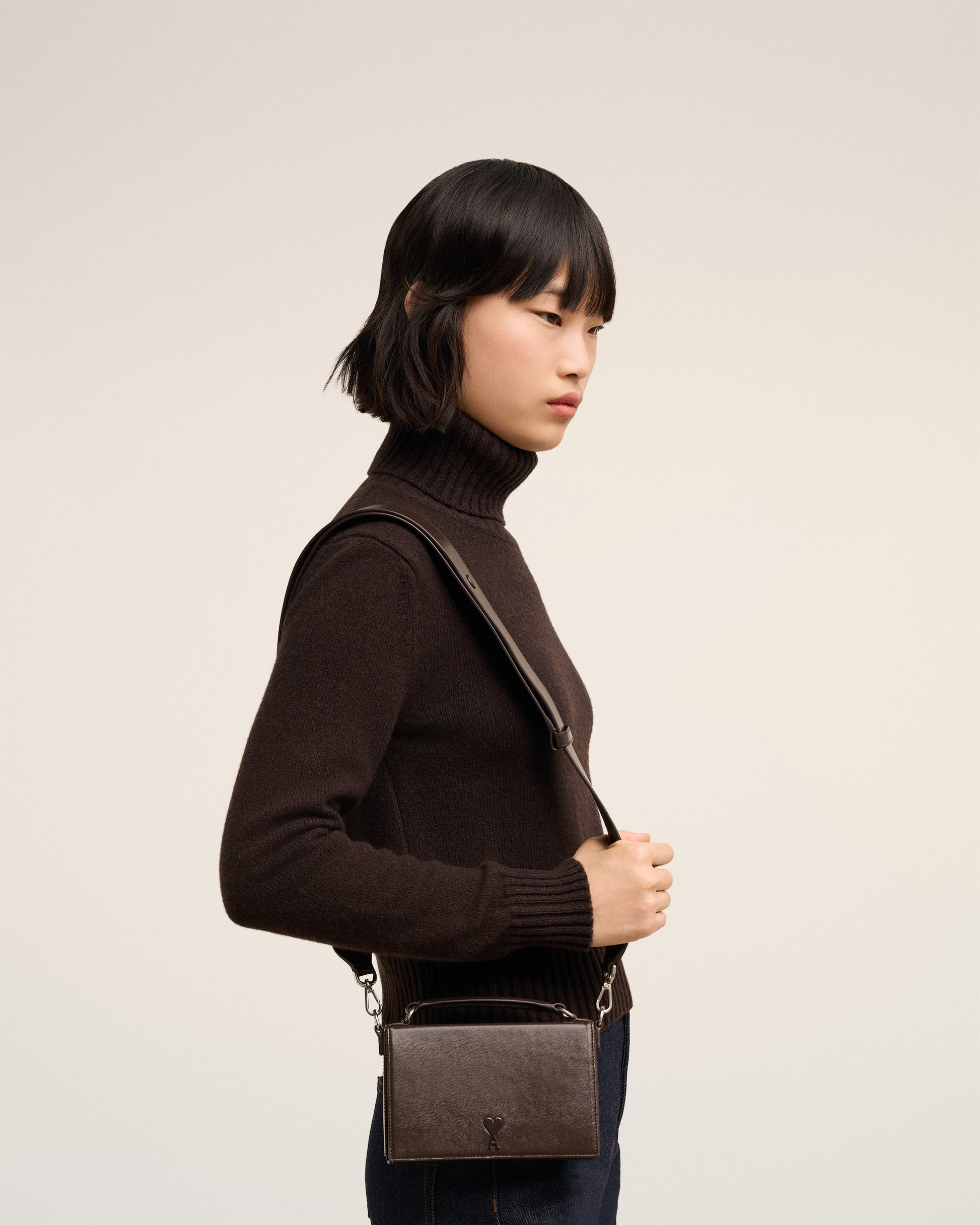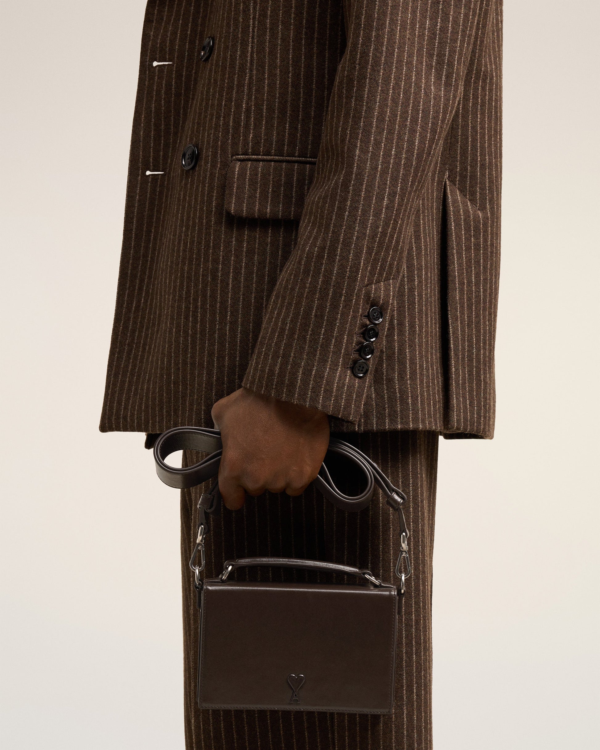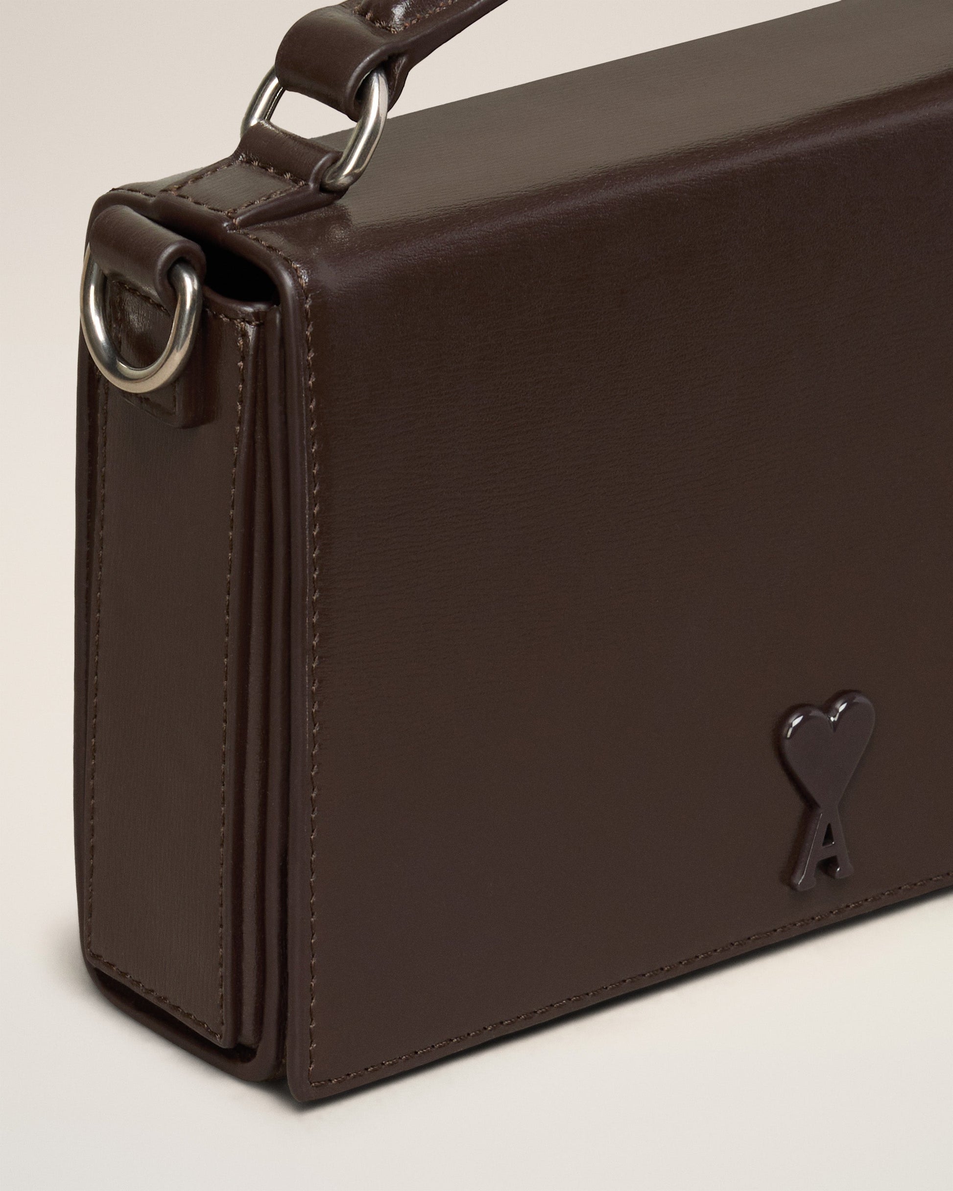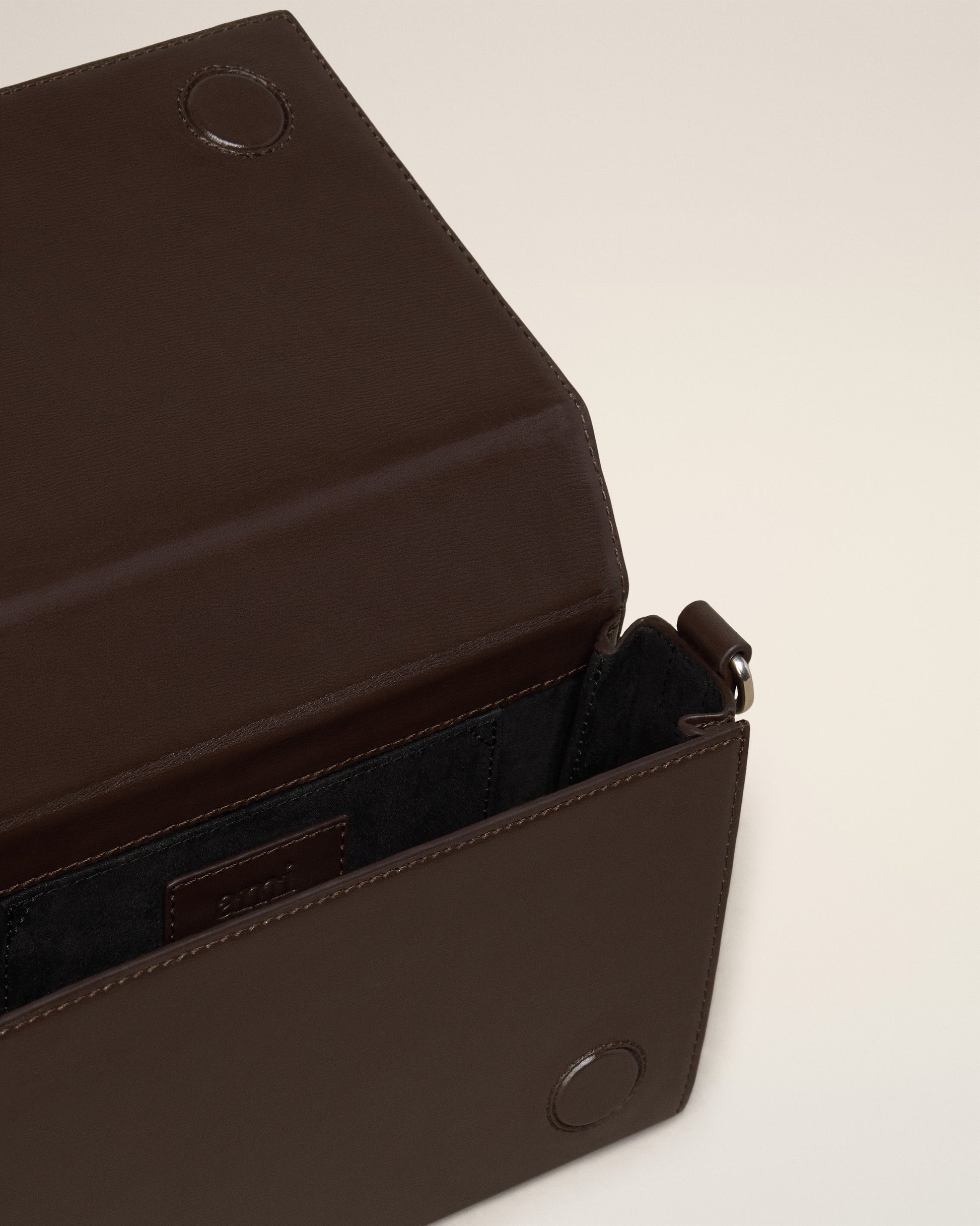 Lunch Box Bag in palmellato leather. Suedette lining Tonal Ami de Coeur stud One central compartment with a patched pocket Leather patched pocket on the back face Adjustable and removable leather strap, crossbody or shoulder carry Leather handle for a hand carry Magnetic flap closure Metal hardware in vibrated silver color Size: 17x10x3.5 cm Made in Morocco (with love) REF : ULL104.830.221