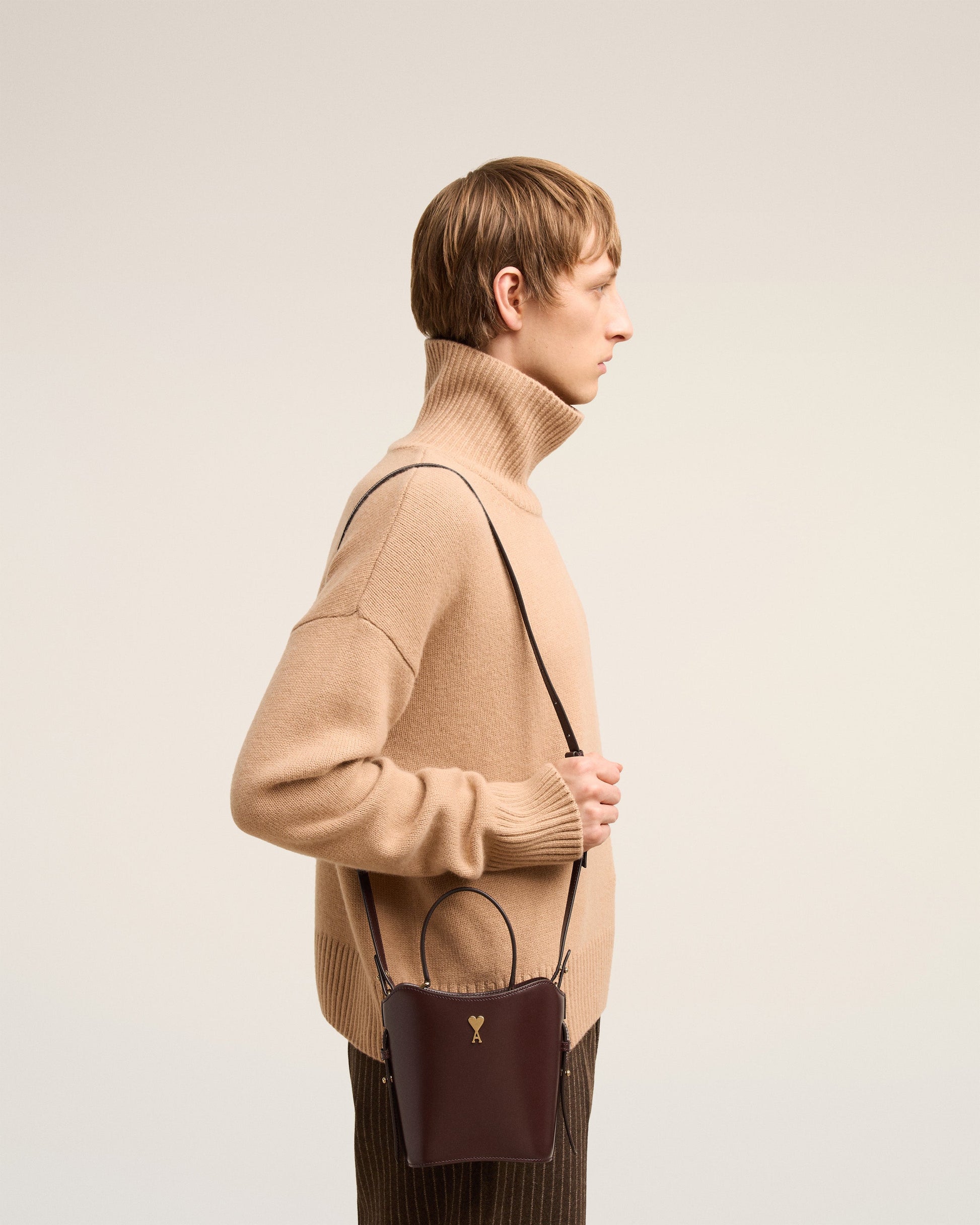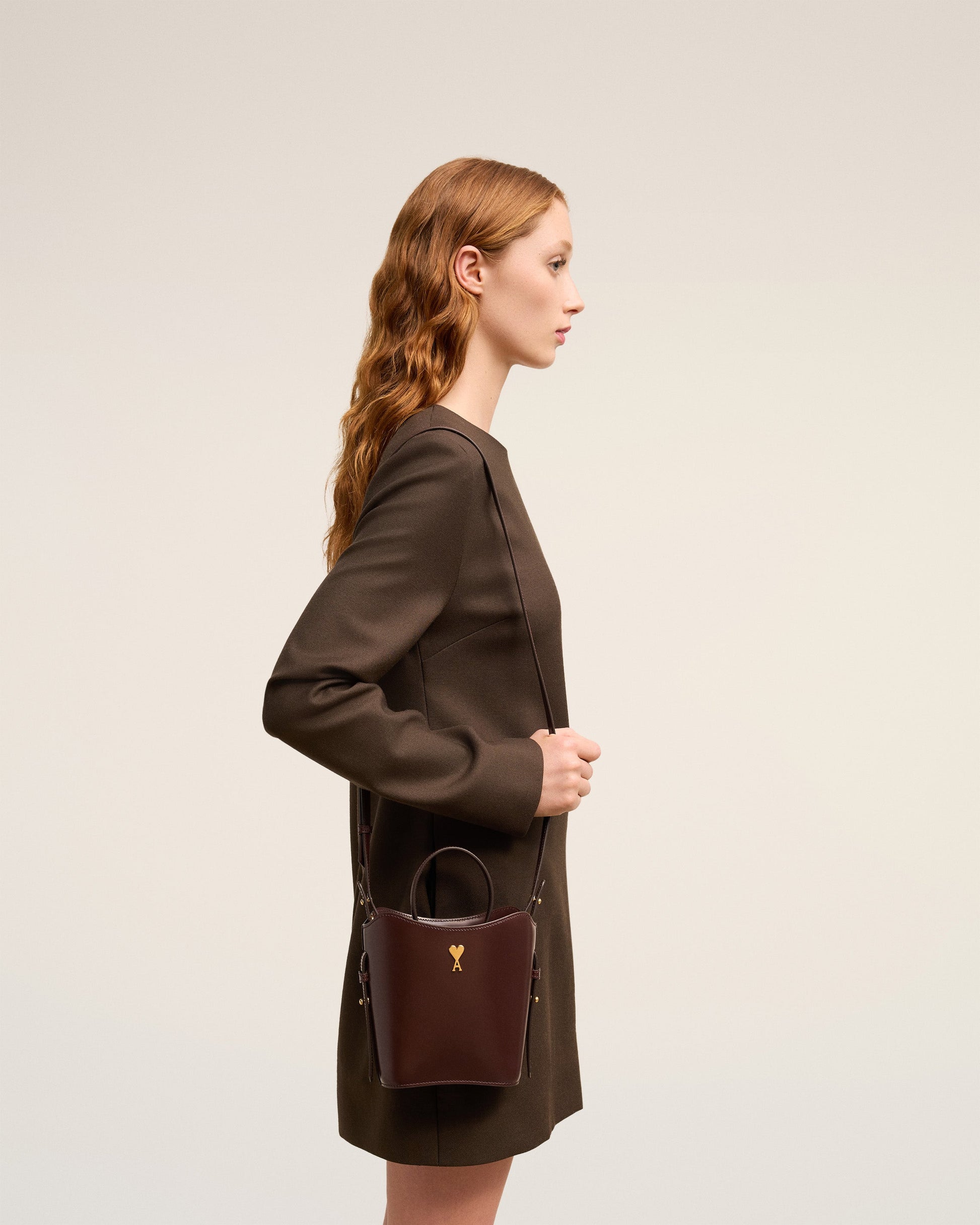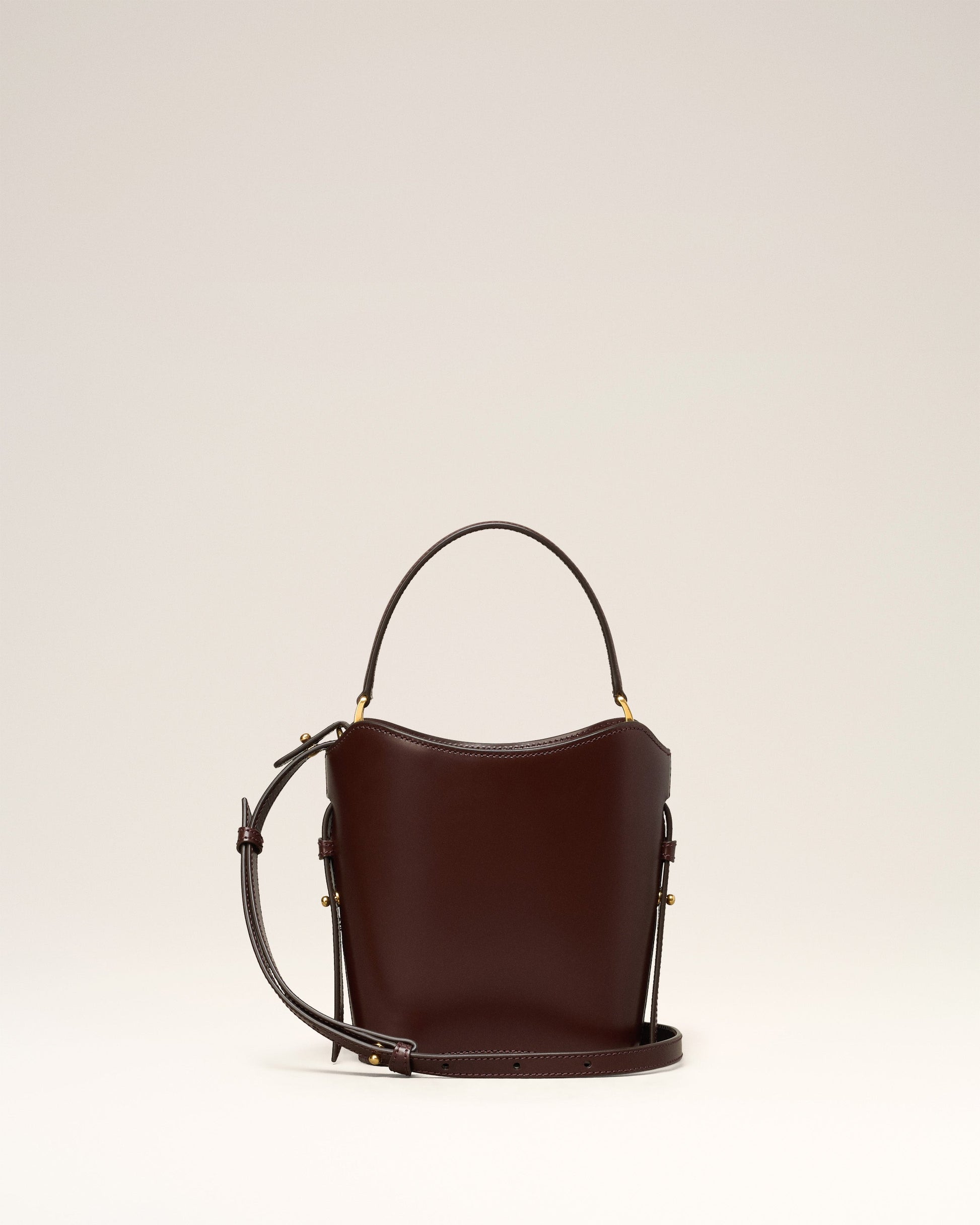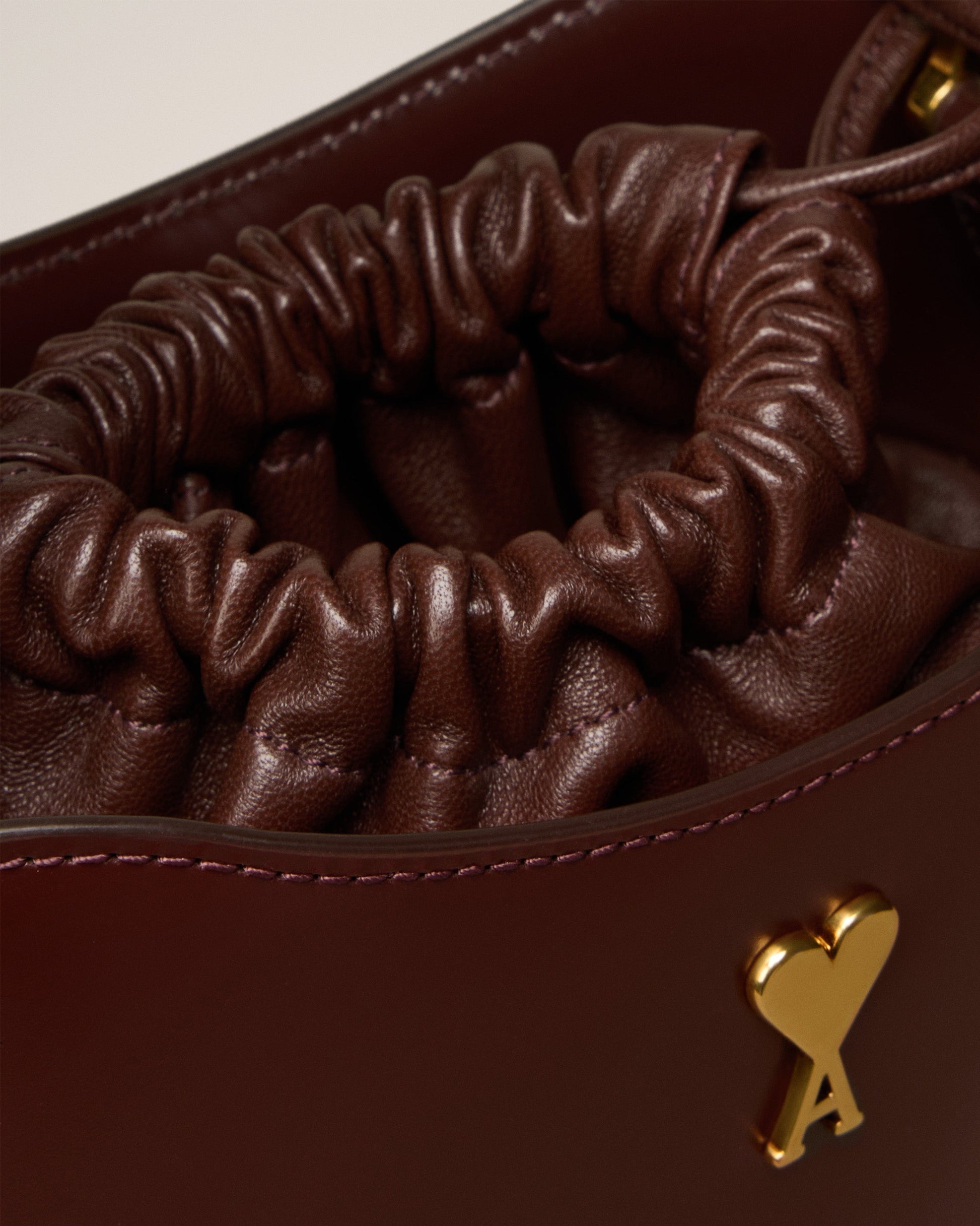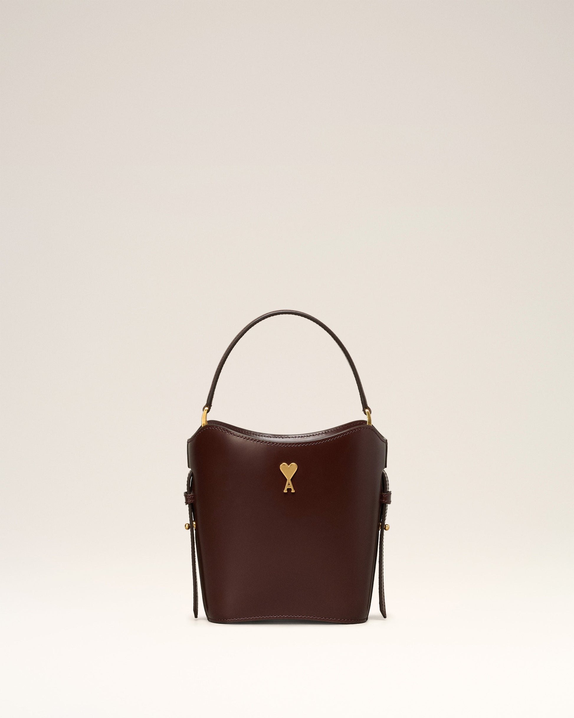 Mini Paris Paris Bucket Bag in smooth leather. Suede lambskin lining Ami de Coeur stud One central compartment with lambskin drawstring pouch Adjustable leather strap, hand, shoulder or crossbody carry Metal hardware in vibrated brass color Size: 12.5x17x5 cm, width at the top 17 cm Made in Morocco (with love) REF : ULL012.AL0043.222