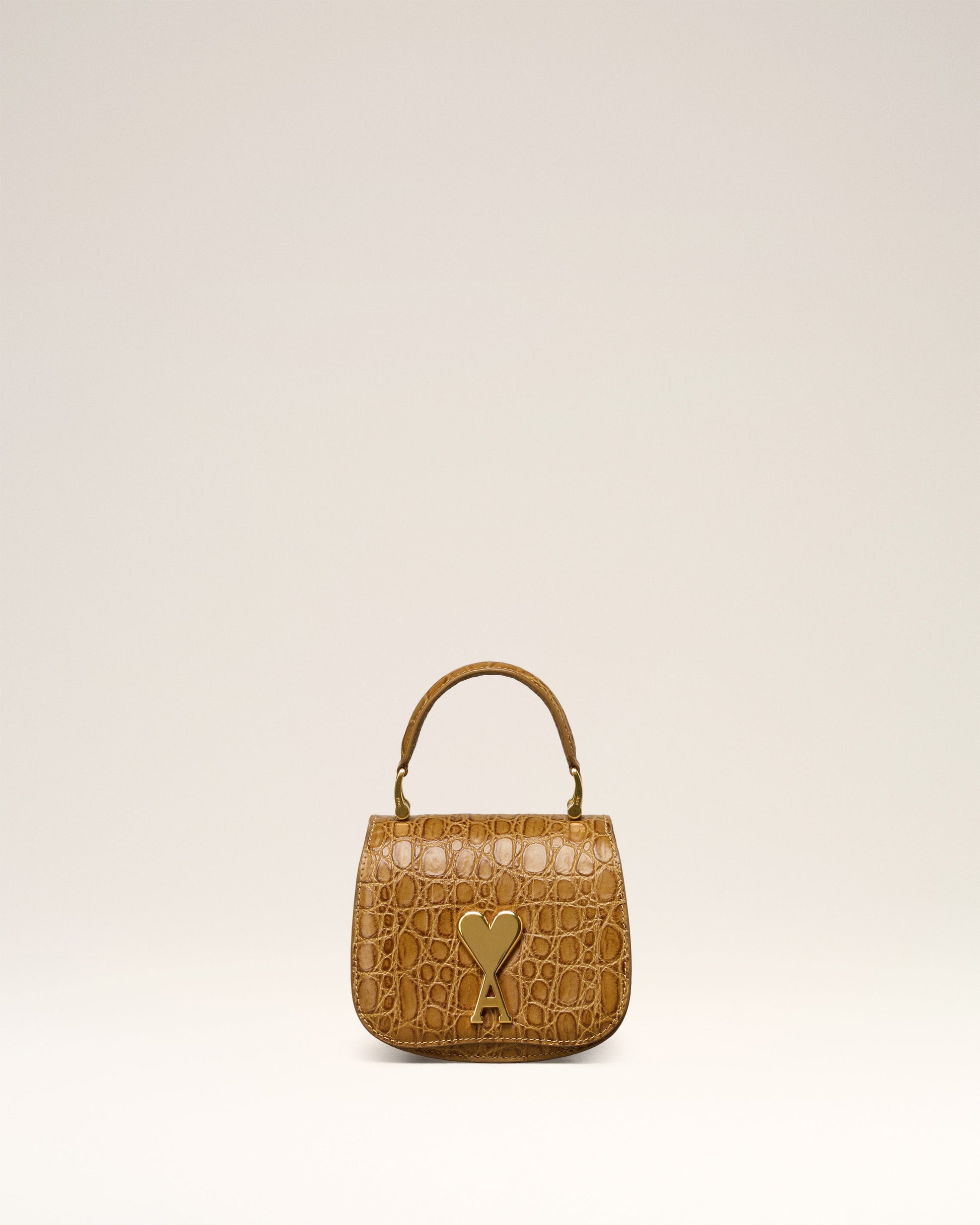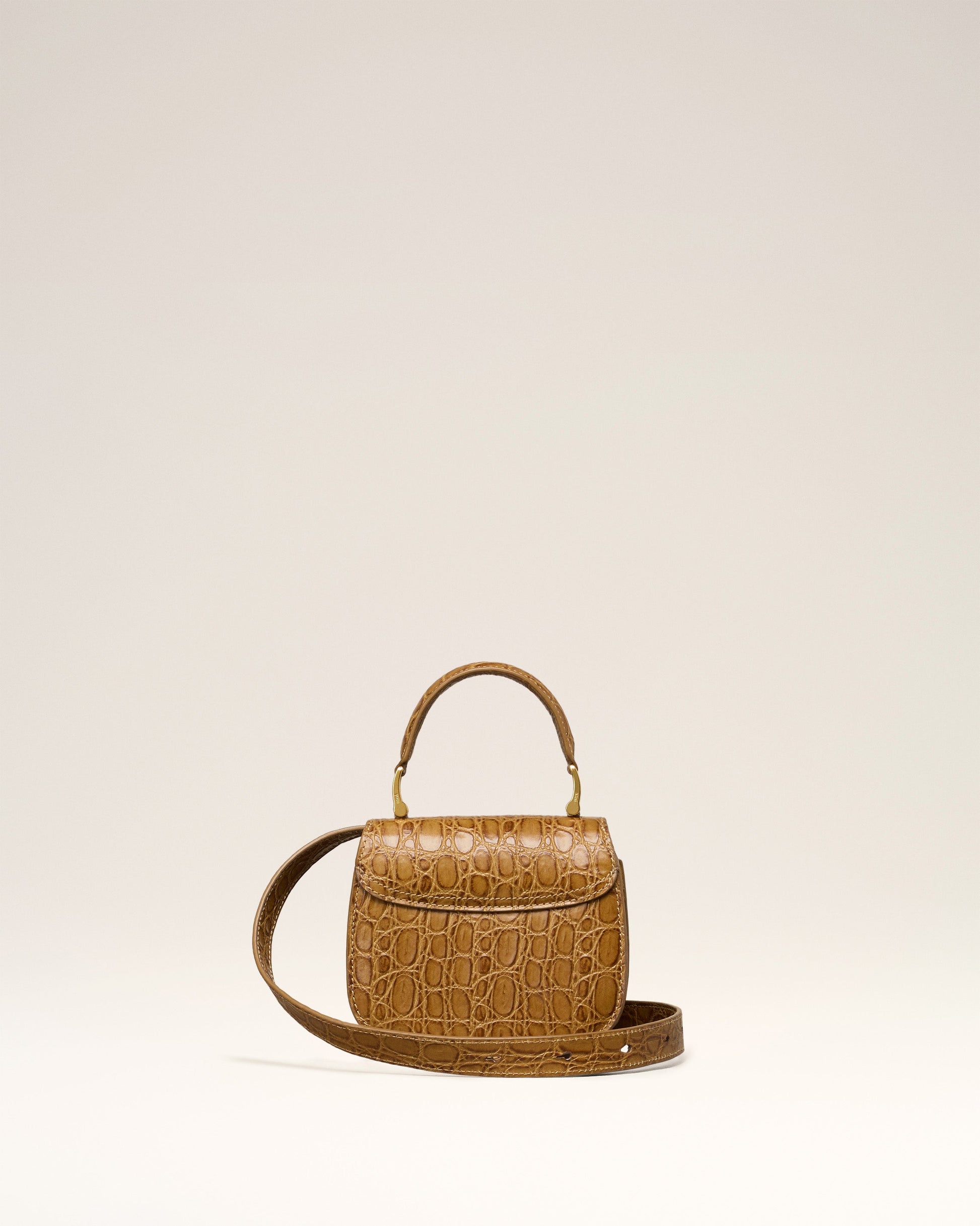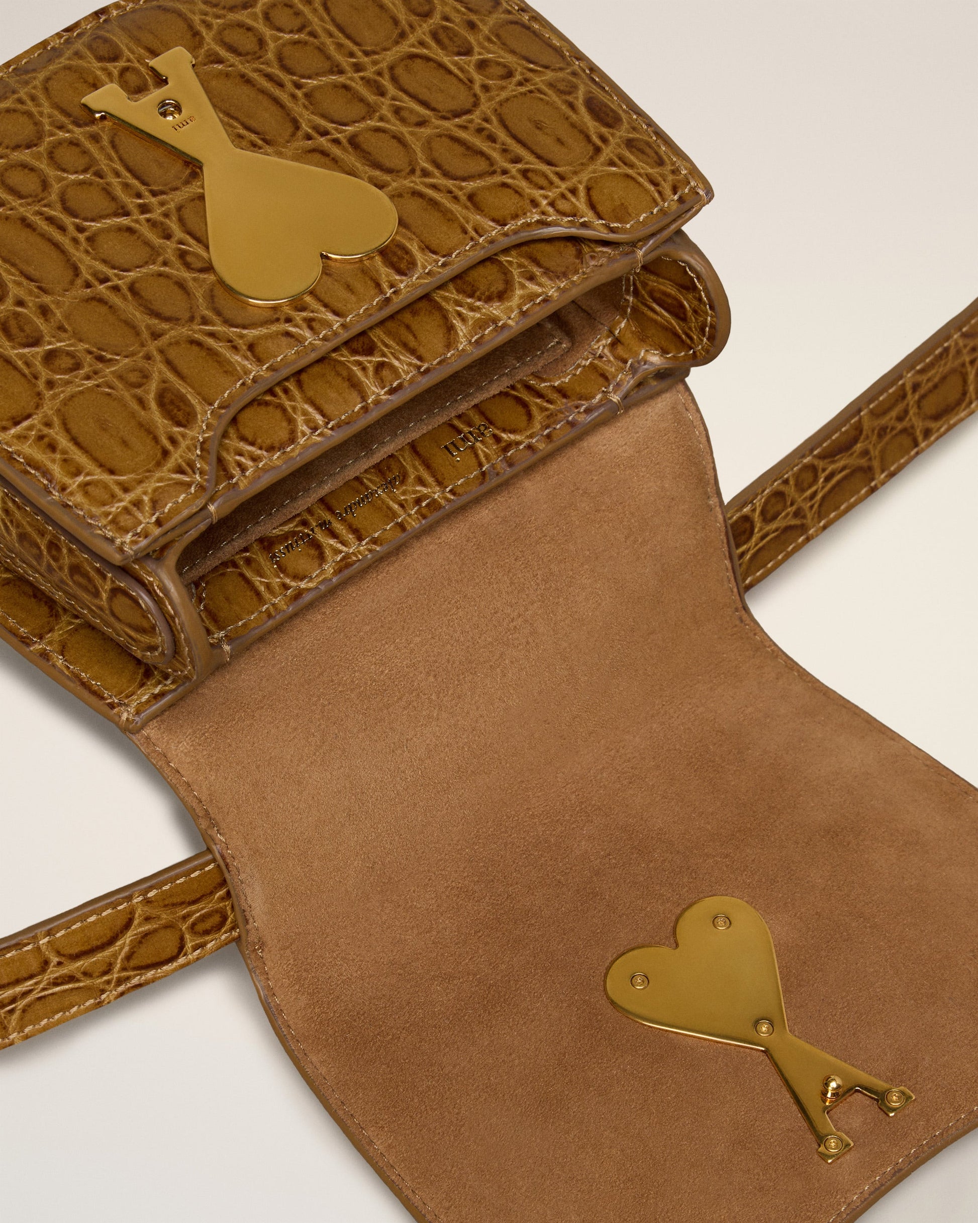 Nano Paris Paris bag in caiman embossed leather. Suede lambskin lining Ami de Coeur clasp One central compartment with a patched pocket and one front compartment Adjustable and removable leather strap, crossbody or hand carry Metal hardware in vibrated brass color Size: 13.5x11.5x4 cm Made in Morocco (with love) REF : ULL008.AL0075.298