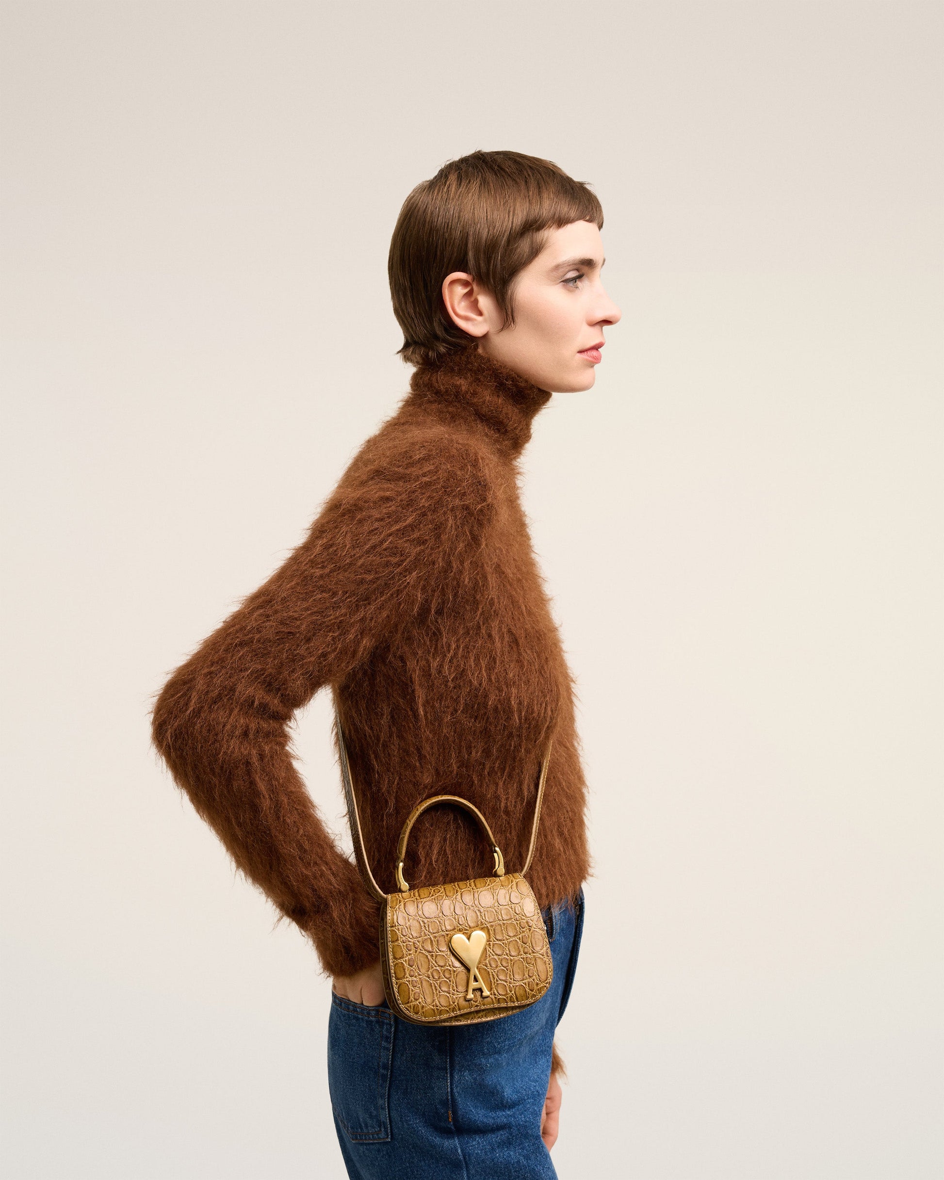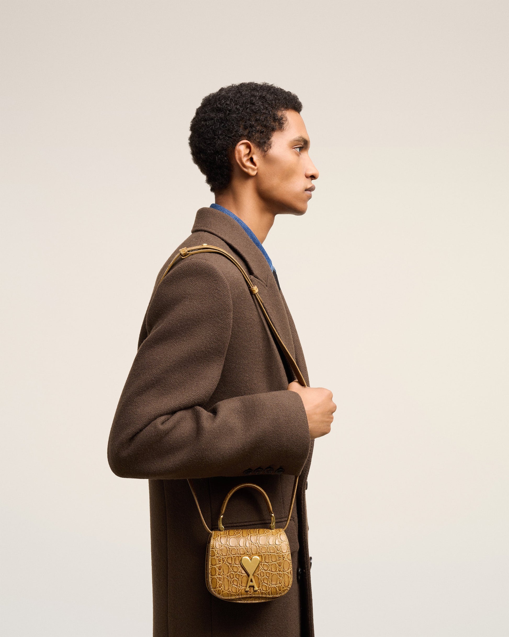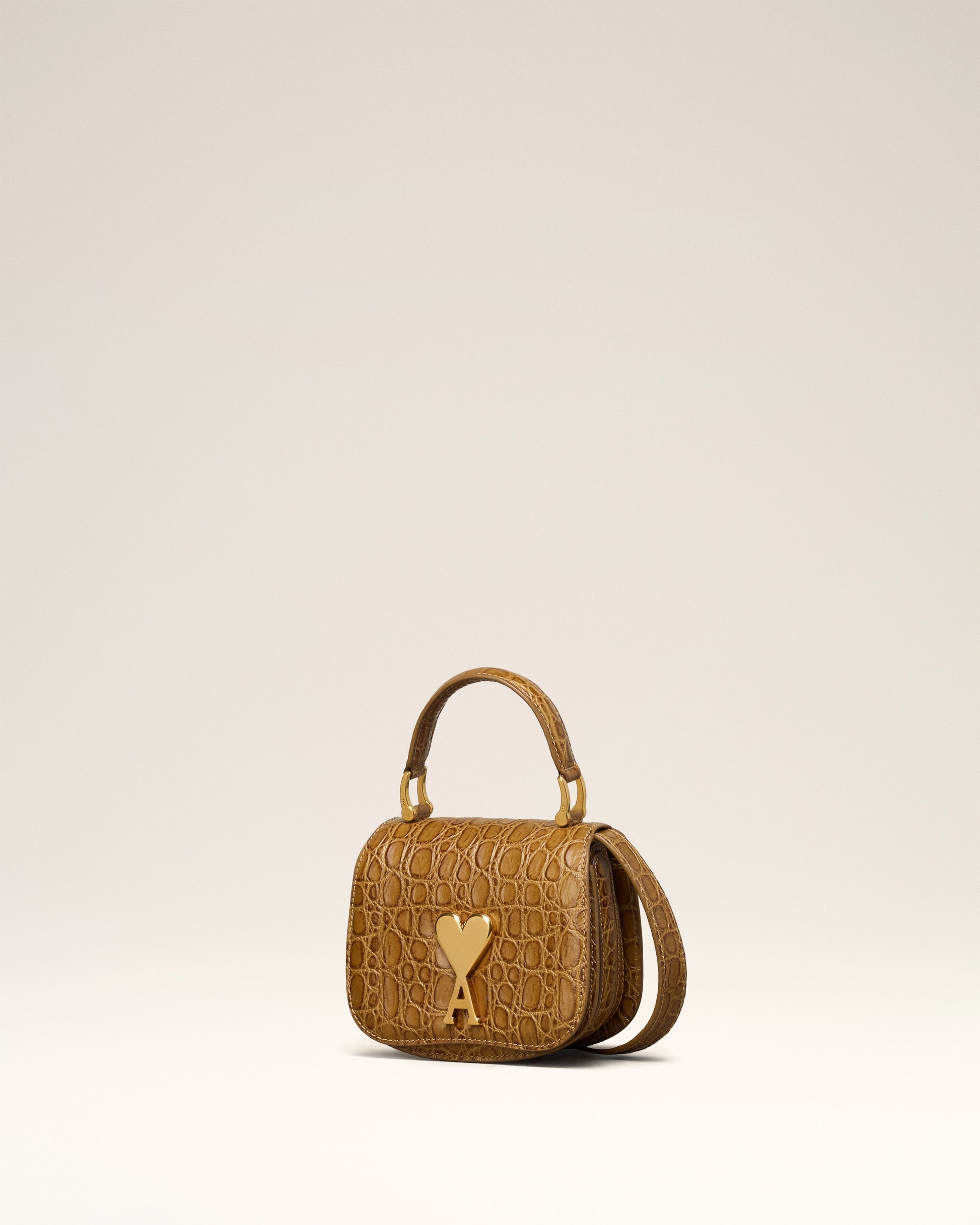 Nano Paris Paris bag in caiman embossed leather. Suede lambskin lining Ami de Coeur clasp One central compartment with a patched pocket and one front compartment Adjustable and removable leather strap, crossbody or hand carry Metal hardware in vibrated brass color Size: 13.5x11.5x4 cm Made in Morocco (with love) REF : ULL008.AL0075.298