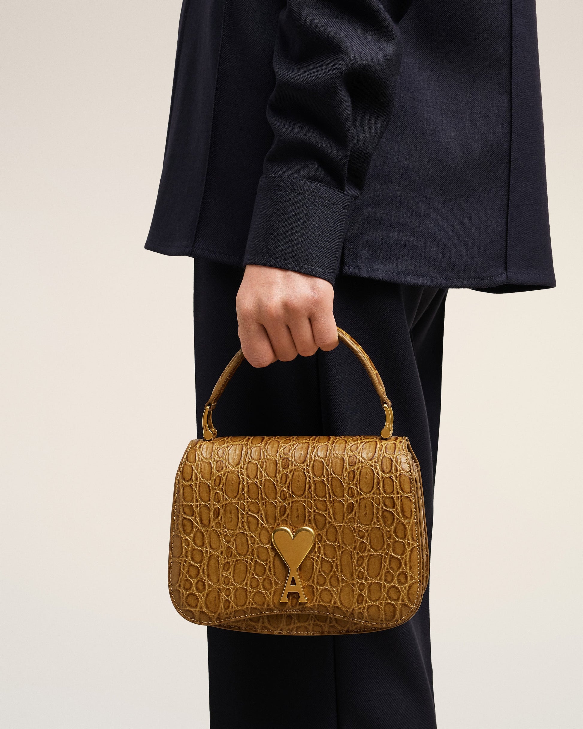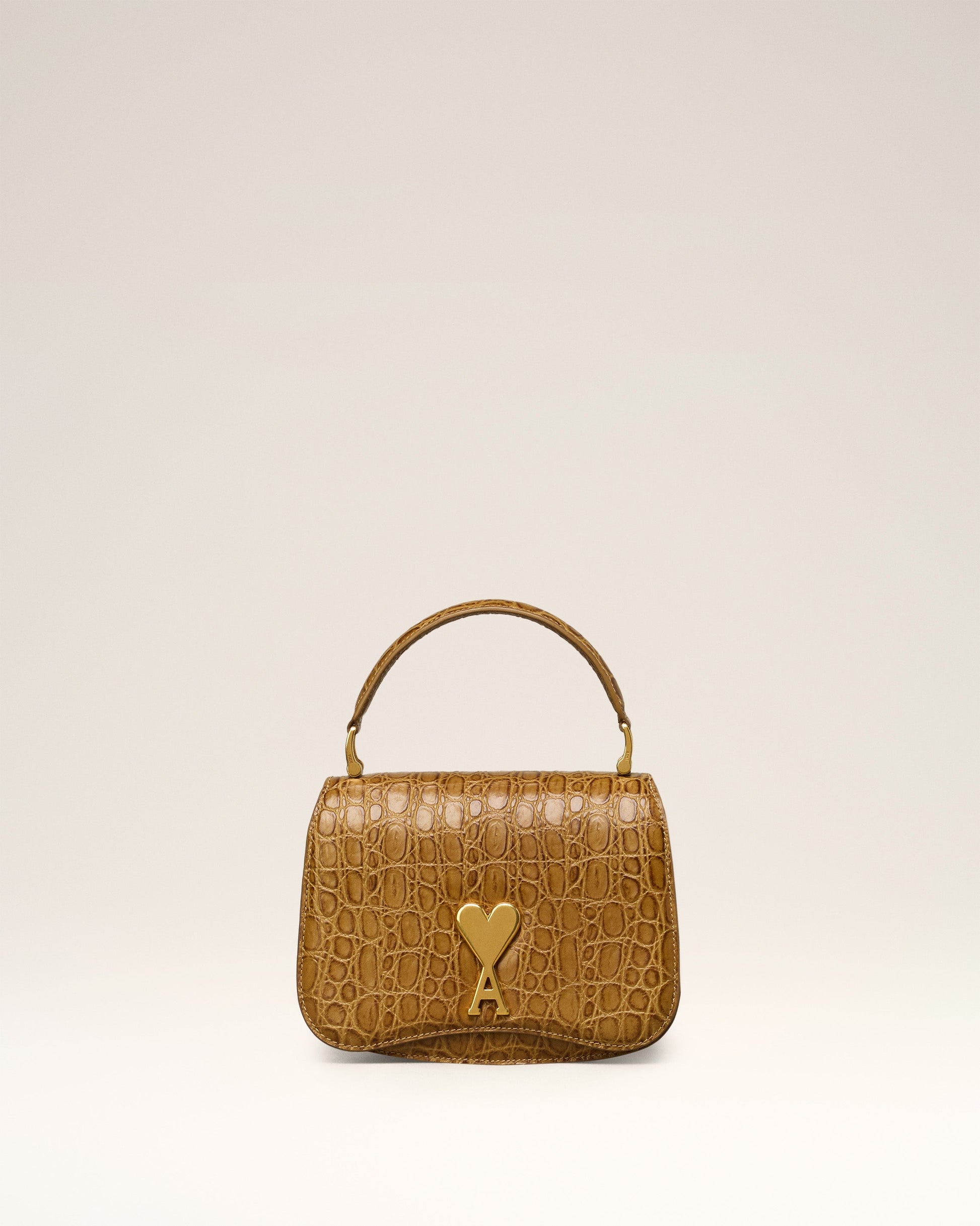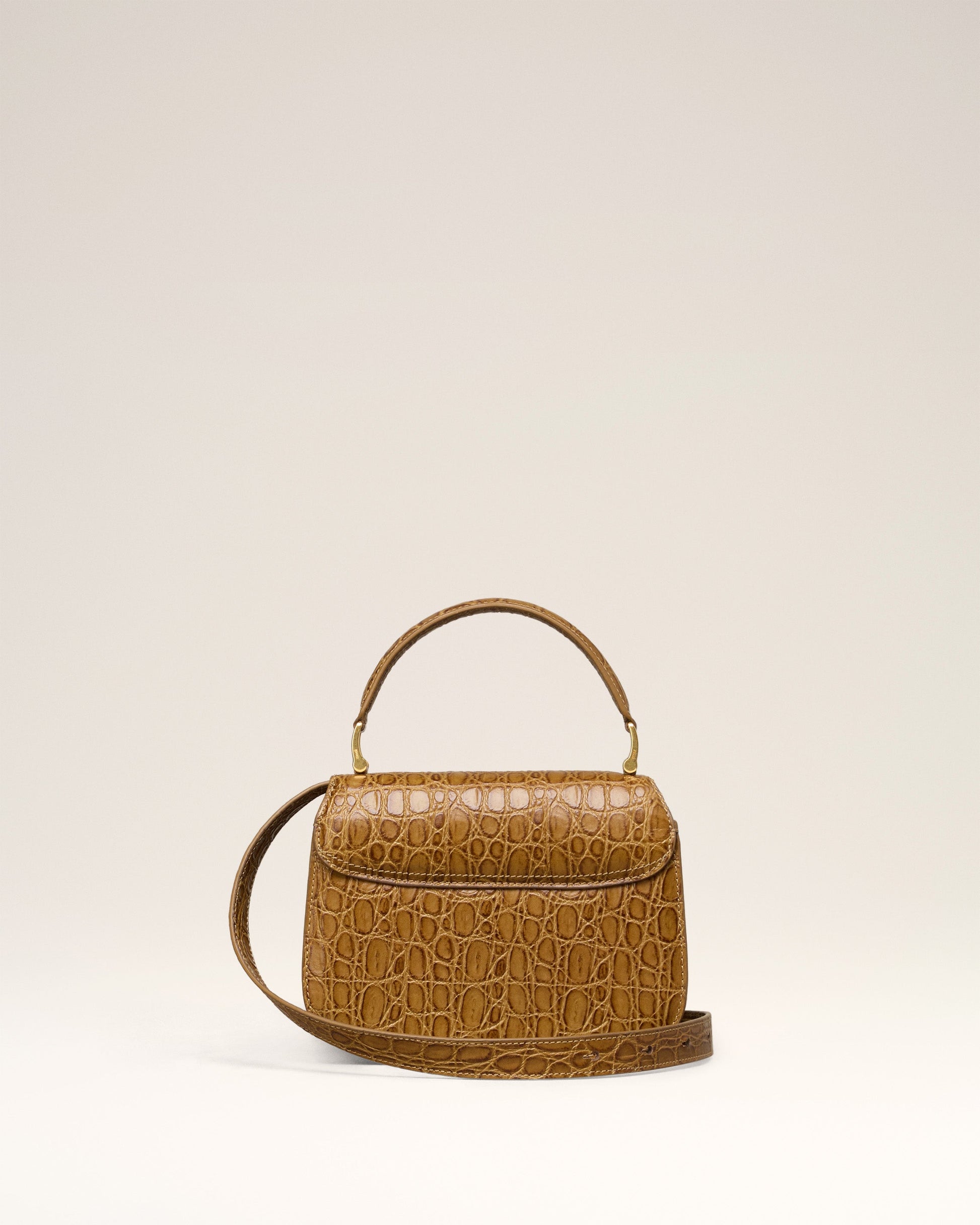 Top handle Paris Paris bag in caiman embossed leather. Suede lambskin lining Ami de Coeur clasp One central compartment with a patched pocket and one front compartment Adjustable and removable leather strap, crossbody or hand carry Metal hardware in vibrated brass color Size: 19x13x4 cm Made in Morocco (with love) REF : ULL007.AL0075.298