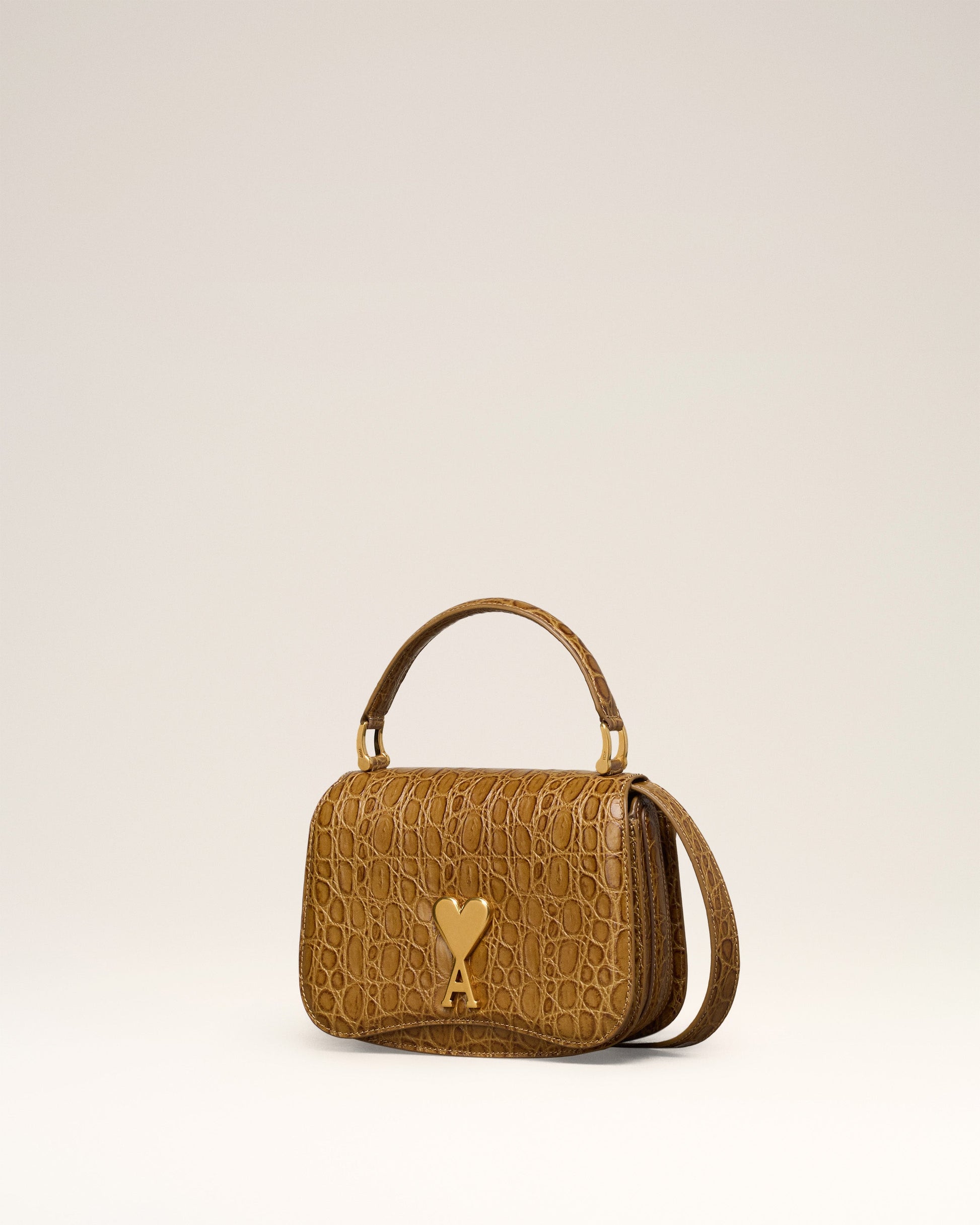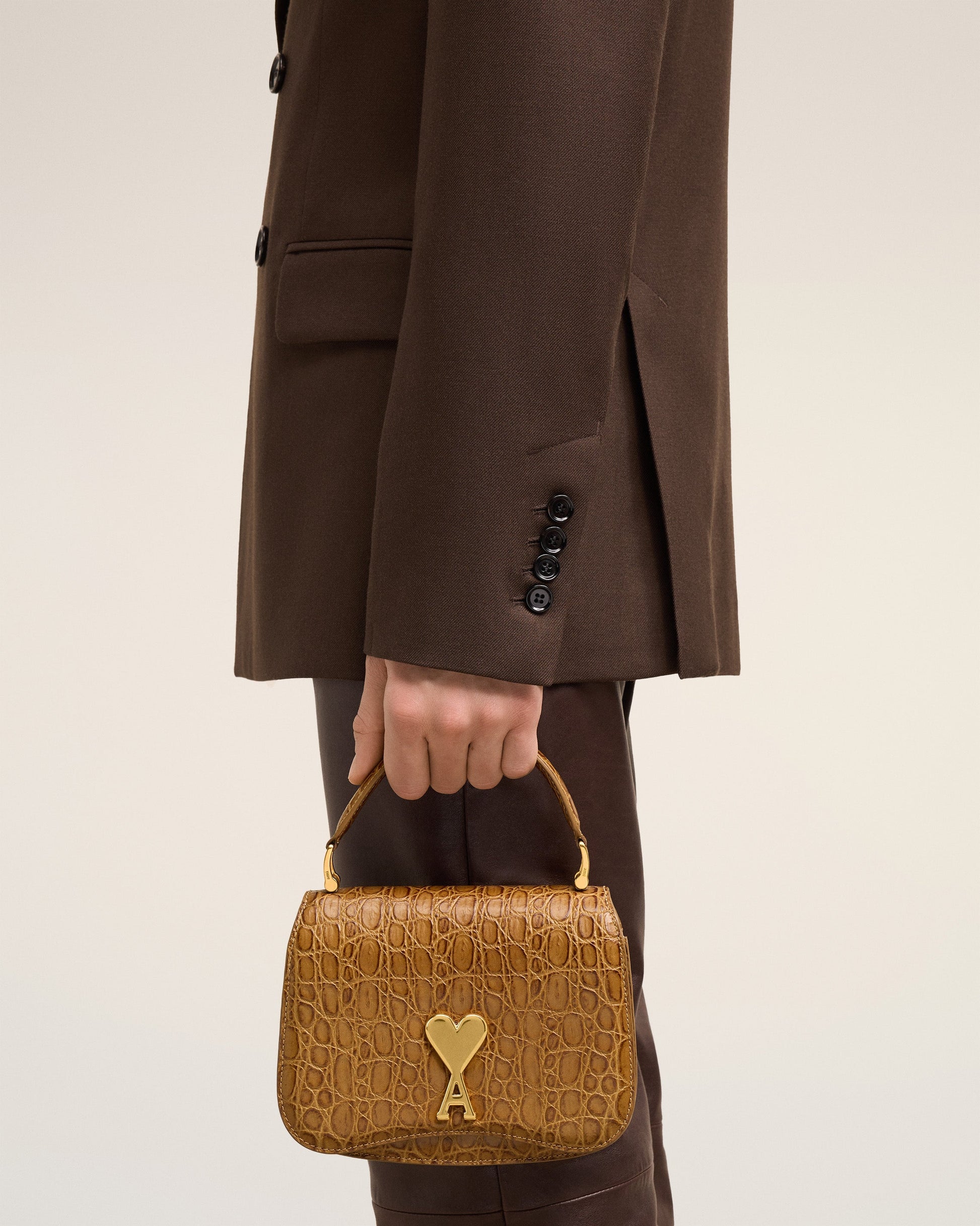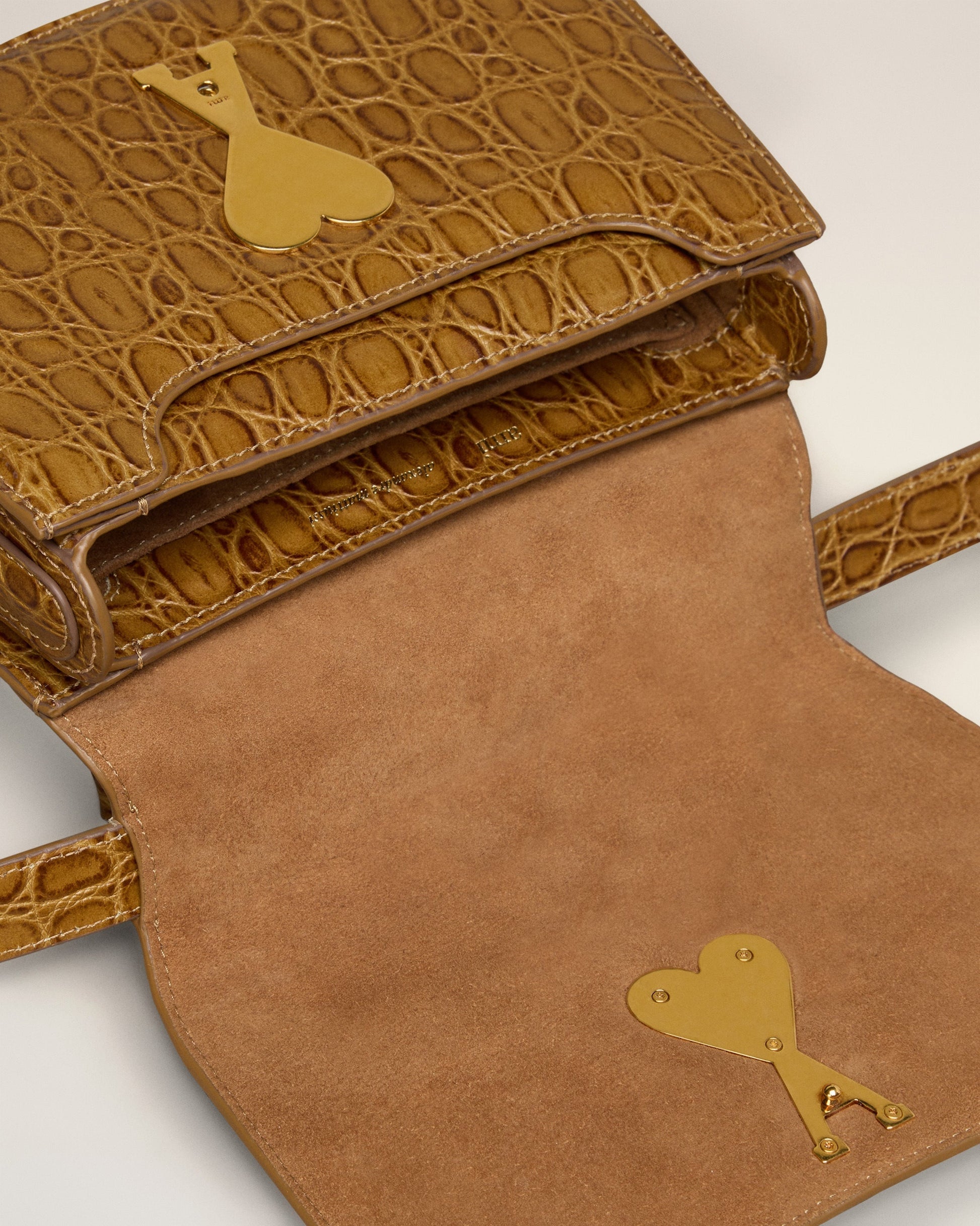 Top handle Paris Paris bag in caiman embossed leather. Suede lambskin lining Ami de Coeur clasp One central compartment with a patched pocket and one front compartment Adjustable and removable leather strap, crossbody or hand carry Metal hardware in vibrated brass color Size: 19x13x4 cm Made in Morocco (with love) REF : ULL007.AL0075.298