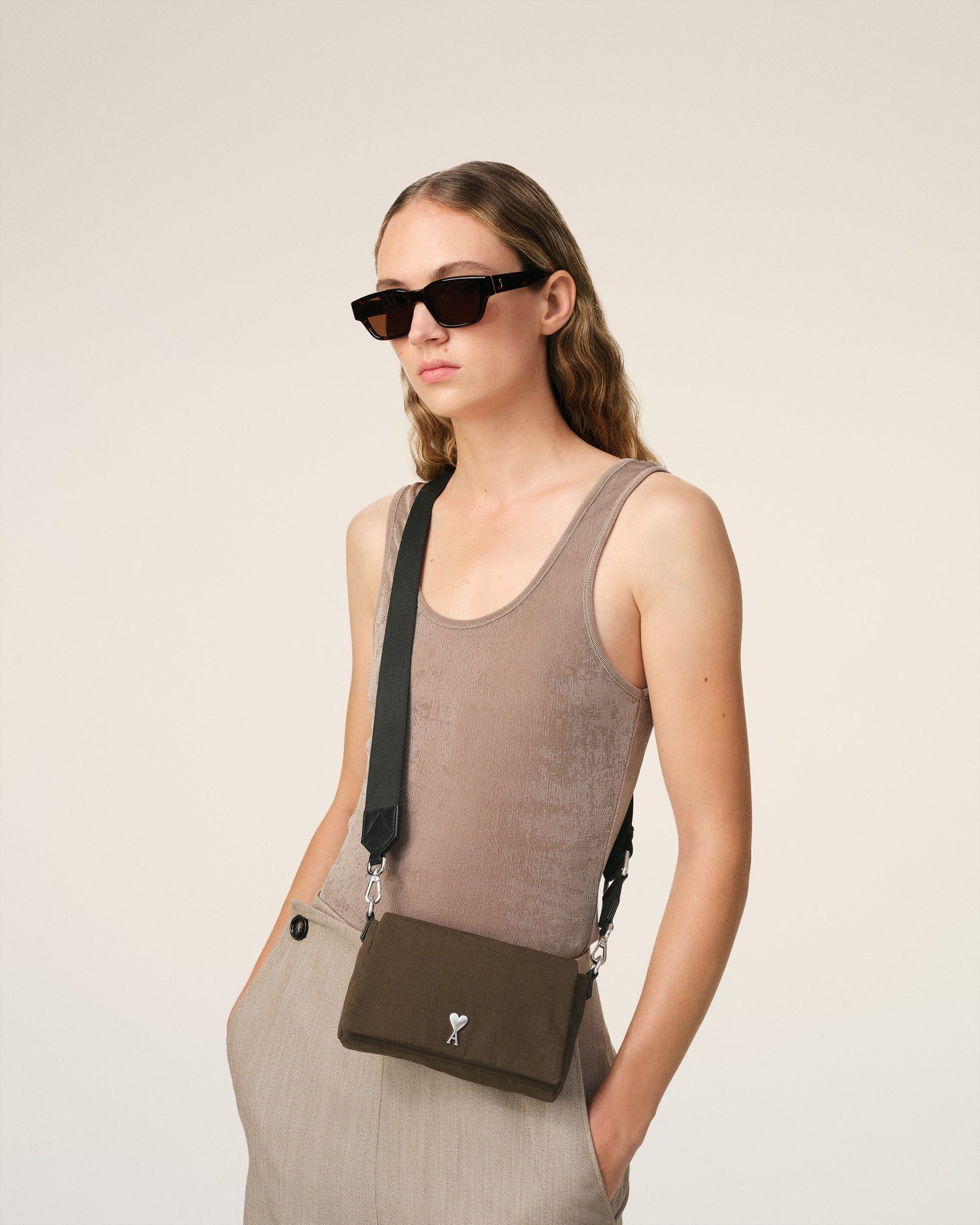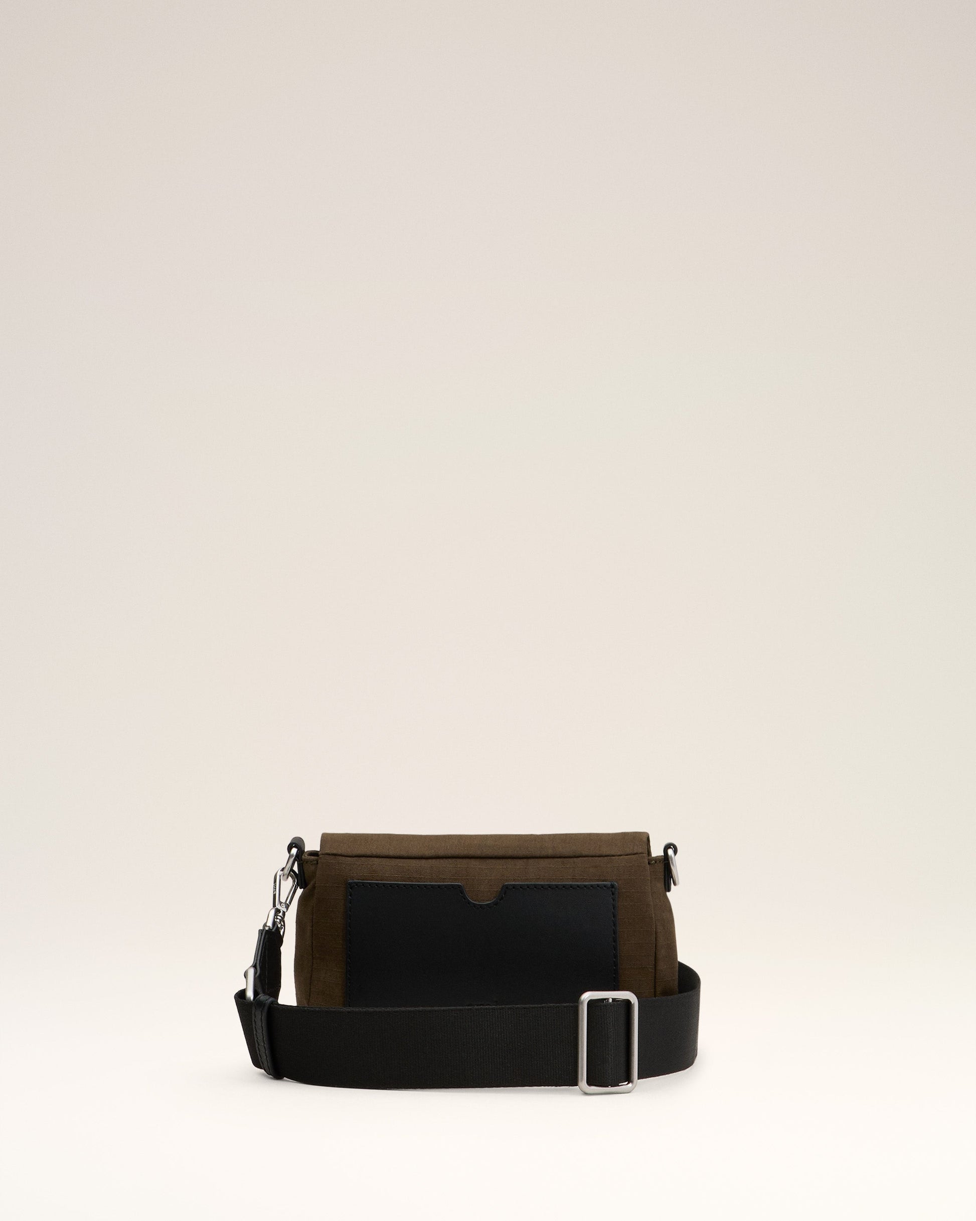 Lunch Box bag in ripstop canvas. Water-repellent ripstop canvas Nylon canvas lining Ami de Coeur stud Inside patched pocket in padded mesh Leather patched pocket on the back with embossed logo Adjustable strap, crossbody carry Metal hardware in vibrated silver color Details in smooth leather Size: 18x10.5x4 cm Made in China (with love) REF: ULL187.AW0074.377