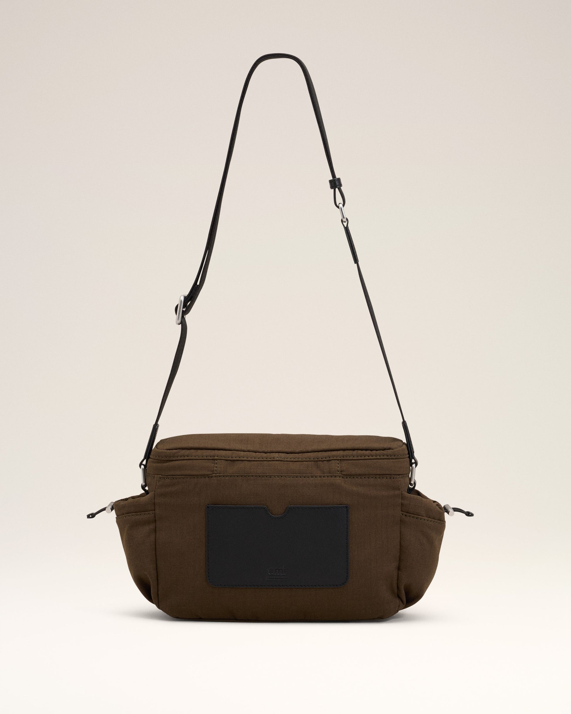 Messenger bag in ripstop canvas. Water-repellent ripstop canvas Nylon canvas lining Ami de Coeur stud One central zipped pocket with inside patched pocket in padded mesh Two lateral pockets with drawstrings Leather patched pocket on the back with embossed logo Adjustable strap, crossbody carry Metal hardware in vibrated silver color Details in smooth leather Size: 28x19x7 cm Made in China (with love) REF: ULL022.AW0074.377