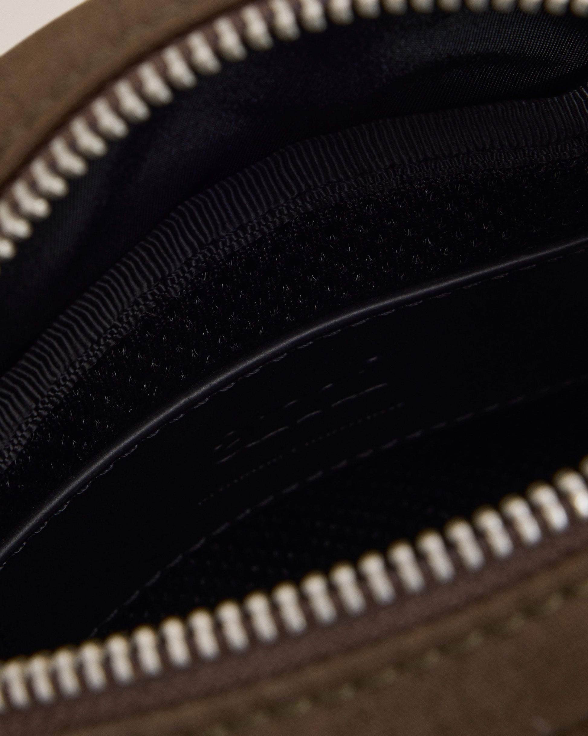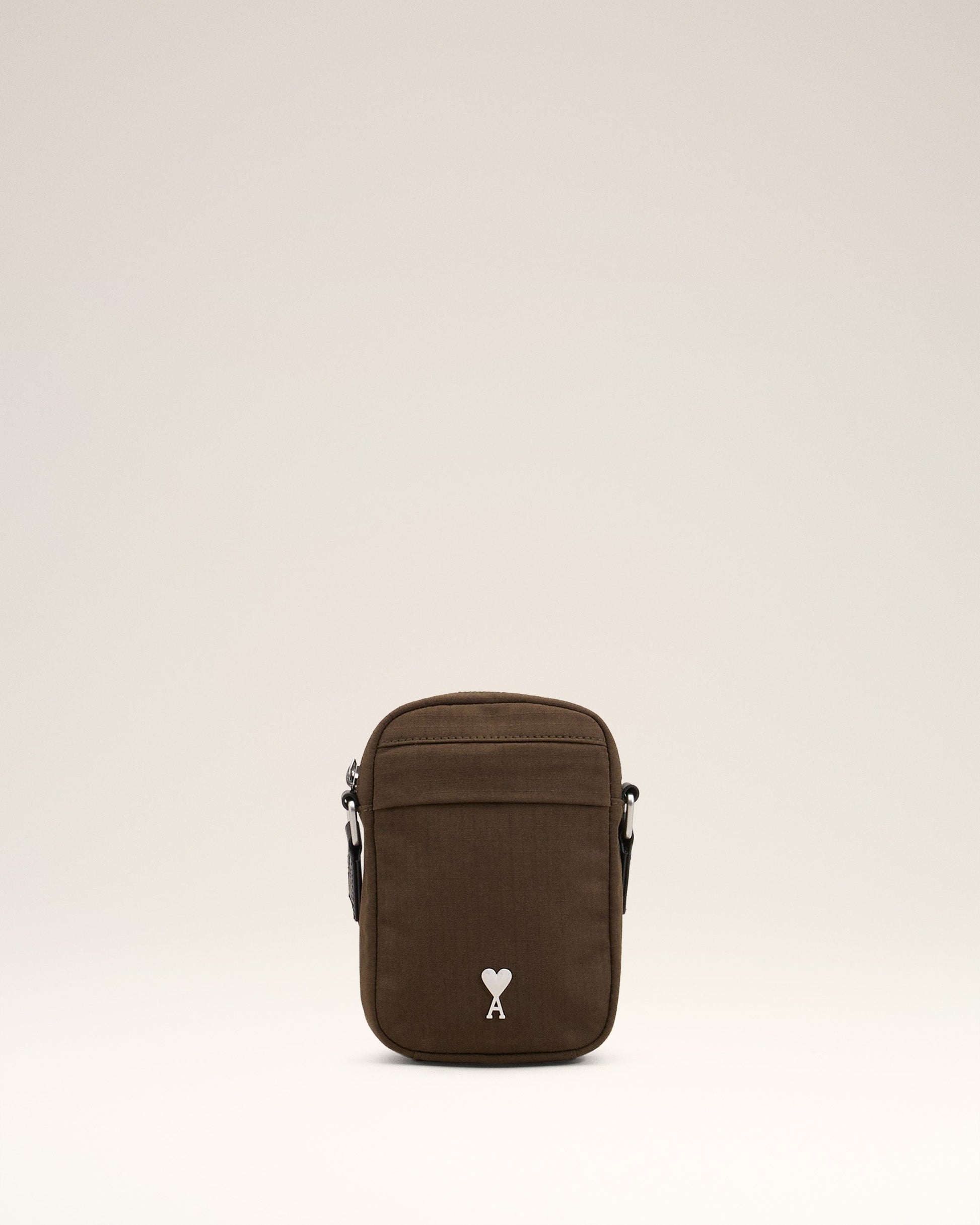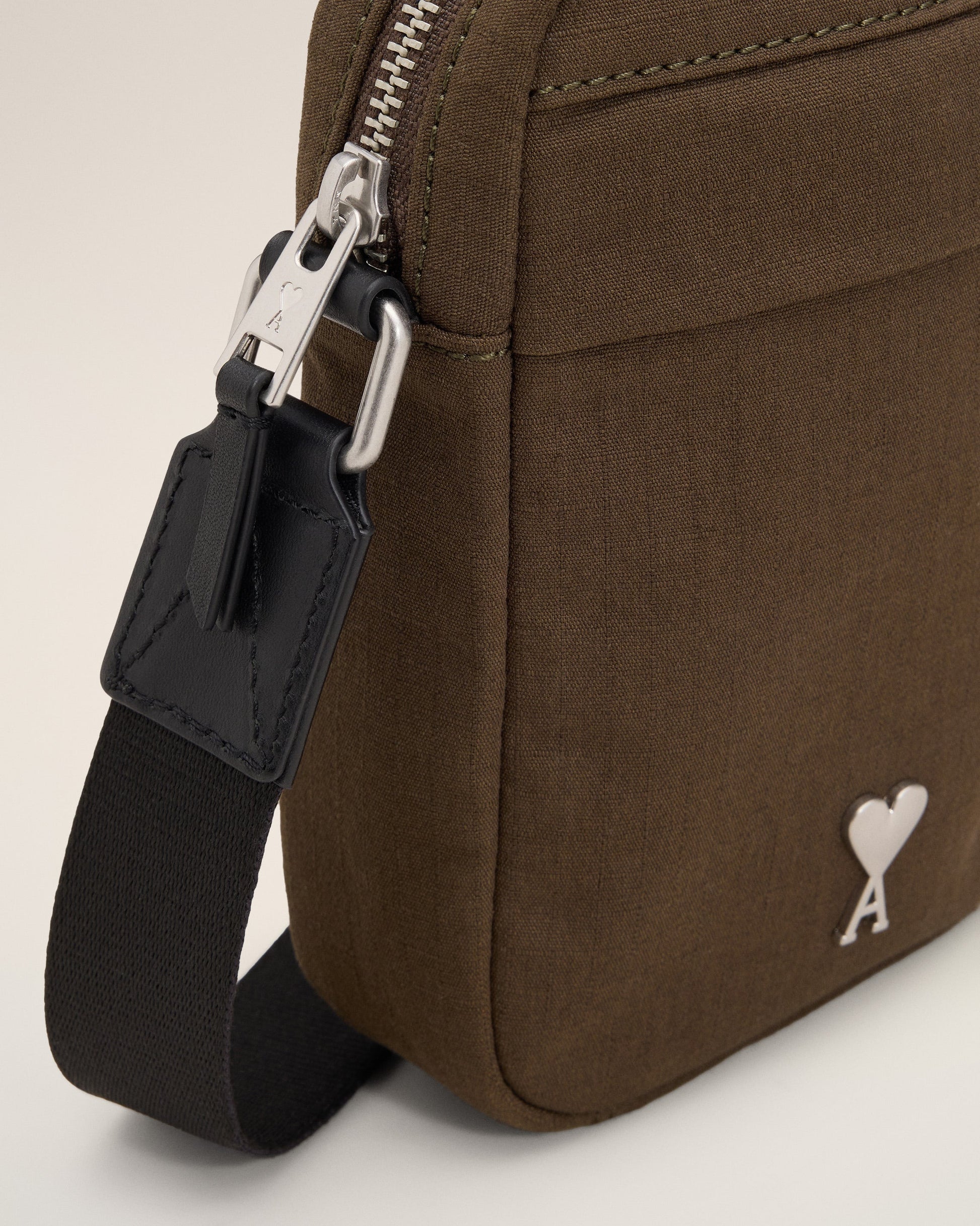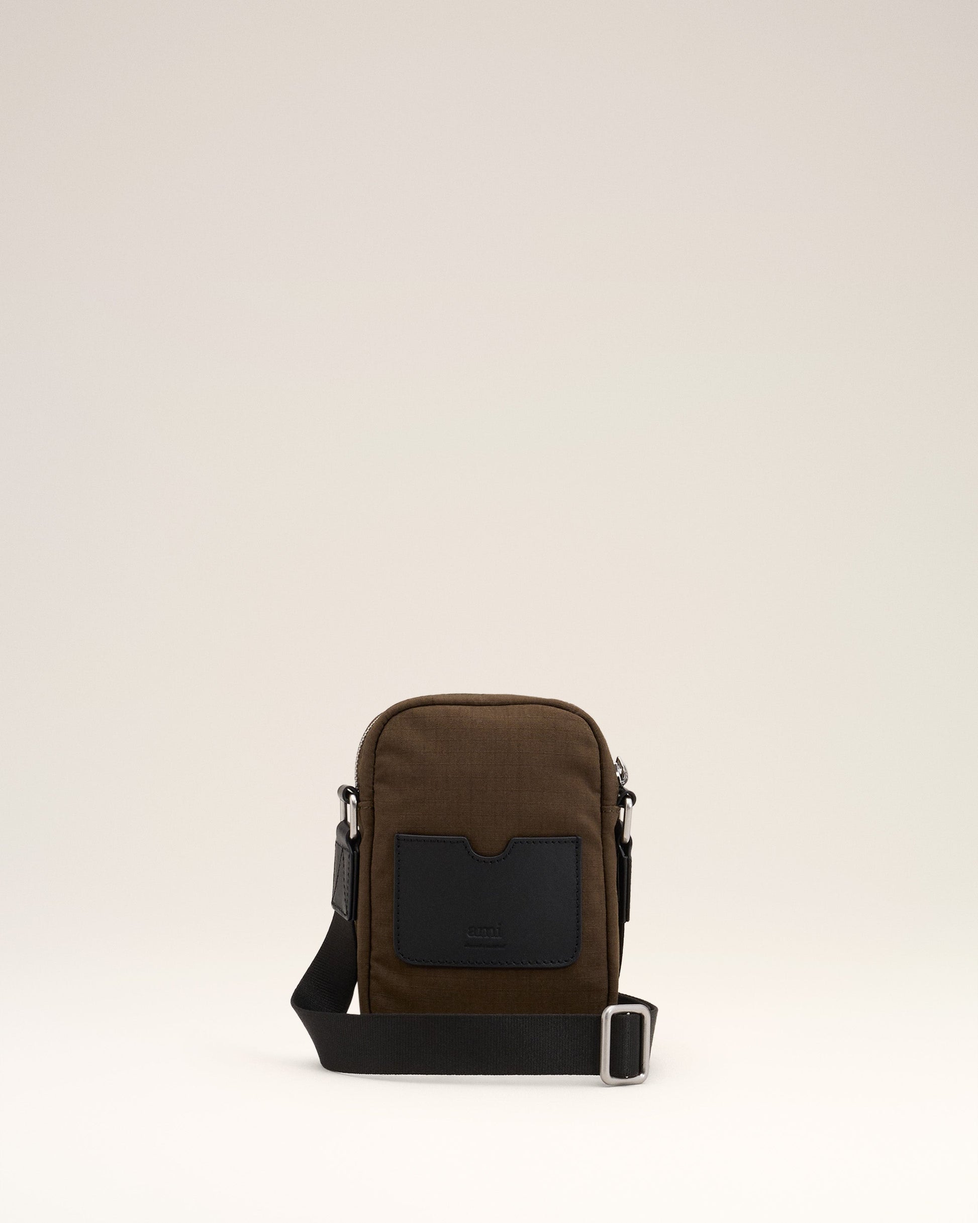 Small crossbody pocket bag in ripstop canvas. Water-repellent ripstop canvas Nylon canvas lining Ami de Coeur stud Zipped main pocket with inside patched pocket in padded mesh Front pocket with snap button fastening Leather patched pocket on the back with embossed logo Adjustable strap, crossbody carry Metal hardware in vibrated silver color Details in smooth leather Size: 18x13x4 cm Made in China (with love) REF: ULL011.AW0074.377