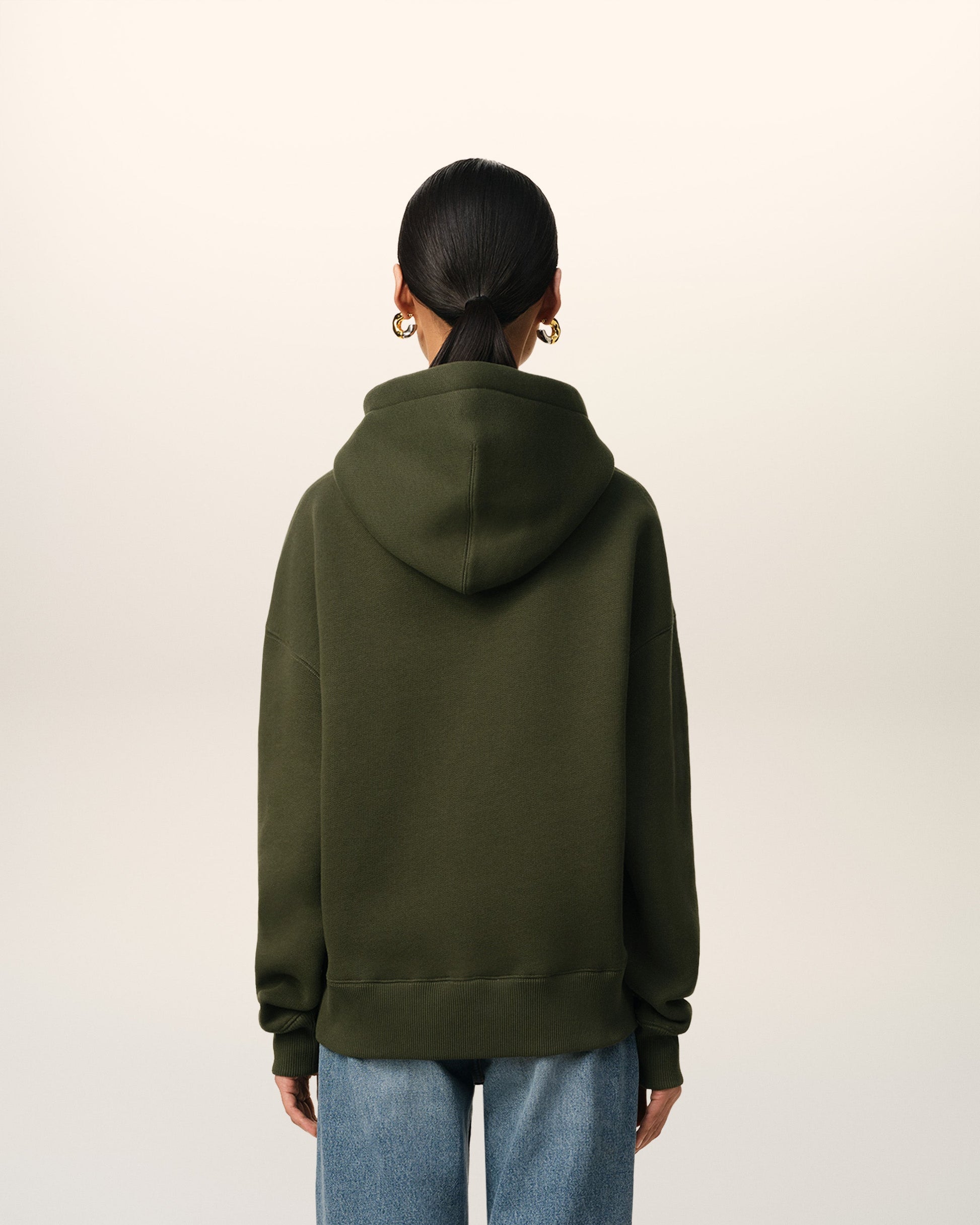 Ami de Coeur hoodie in brushed mixed cotton fleece. Boxy fit Unisex product 61 cm center back length (XS size) 69 cm center back length (M size) Embossed Ami de Coeur on chest Tonal "AMI" embroidery on the back Tonal metal ends and "ami" engraved eyelets Made in Portugal (with love) REF: USW227.749.376
