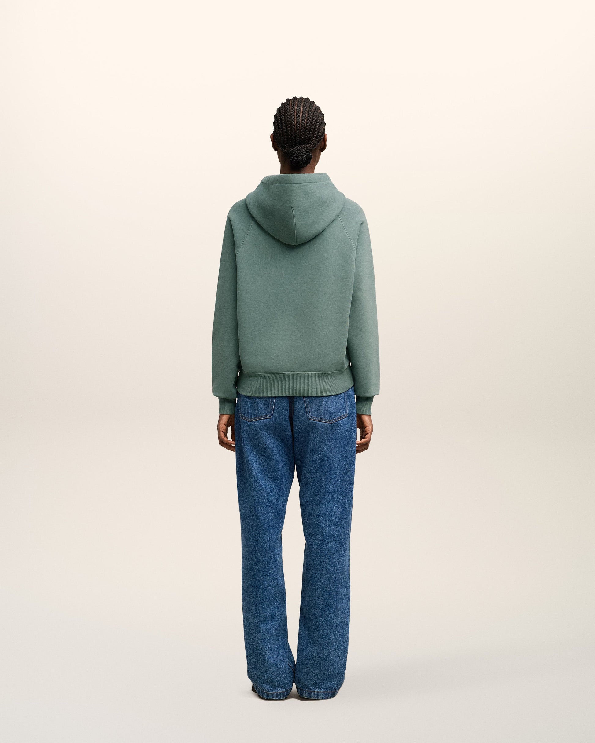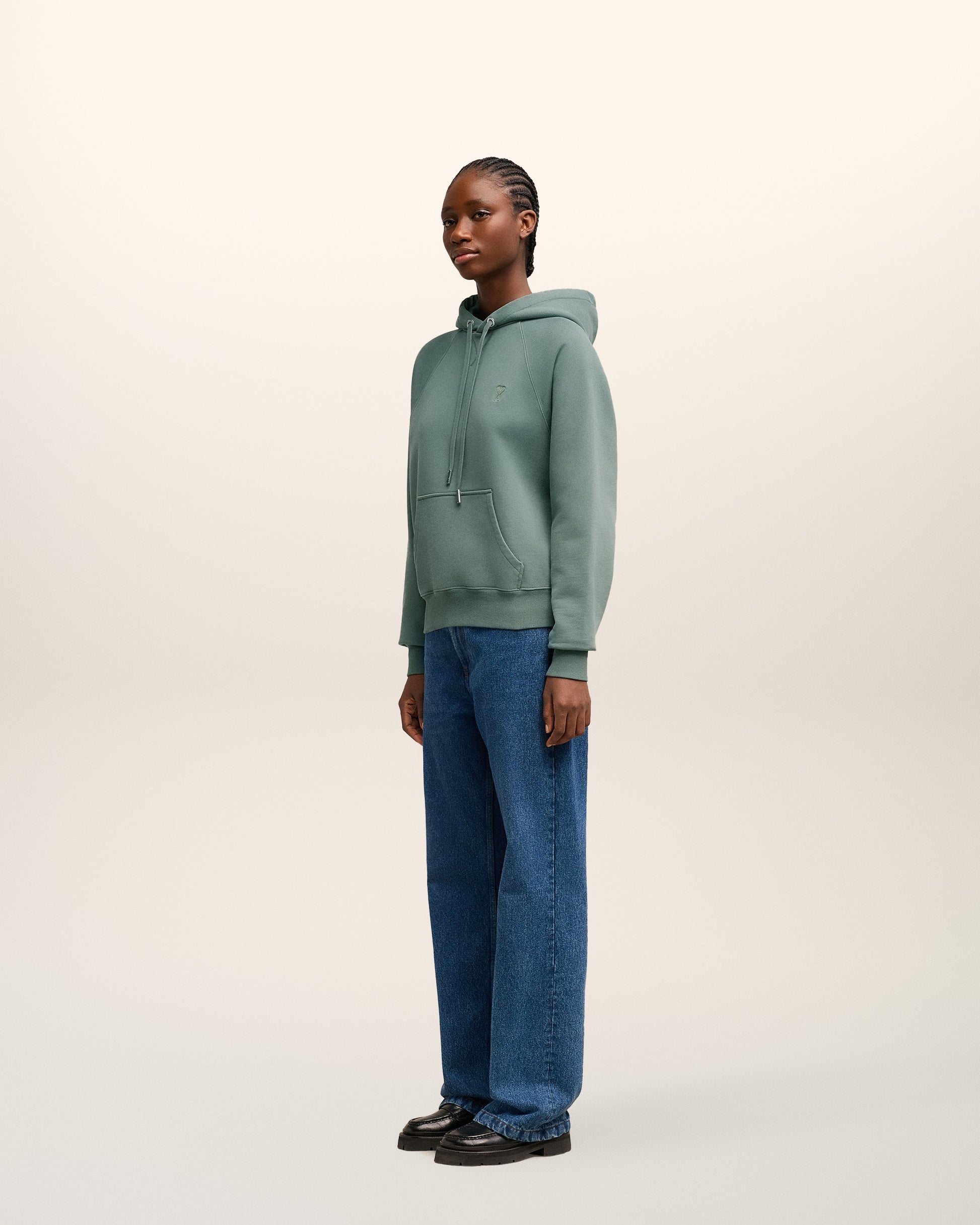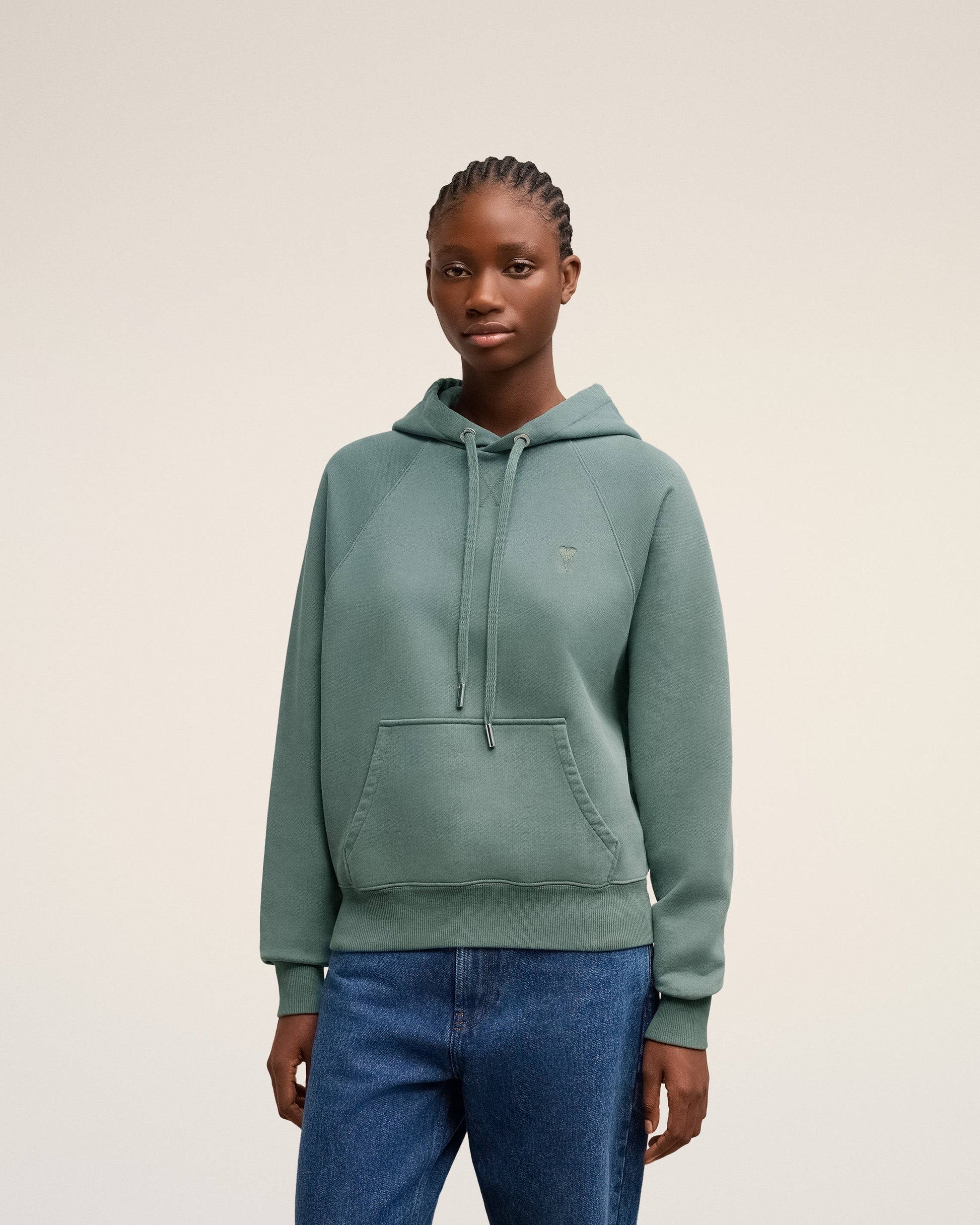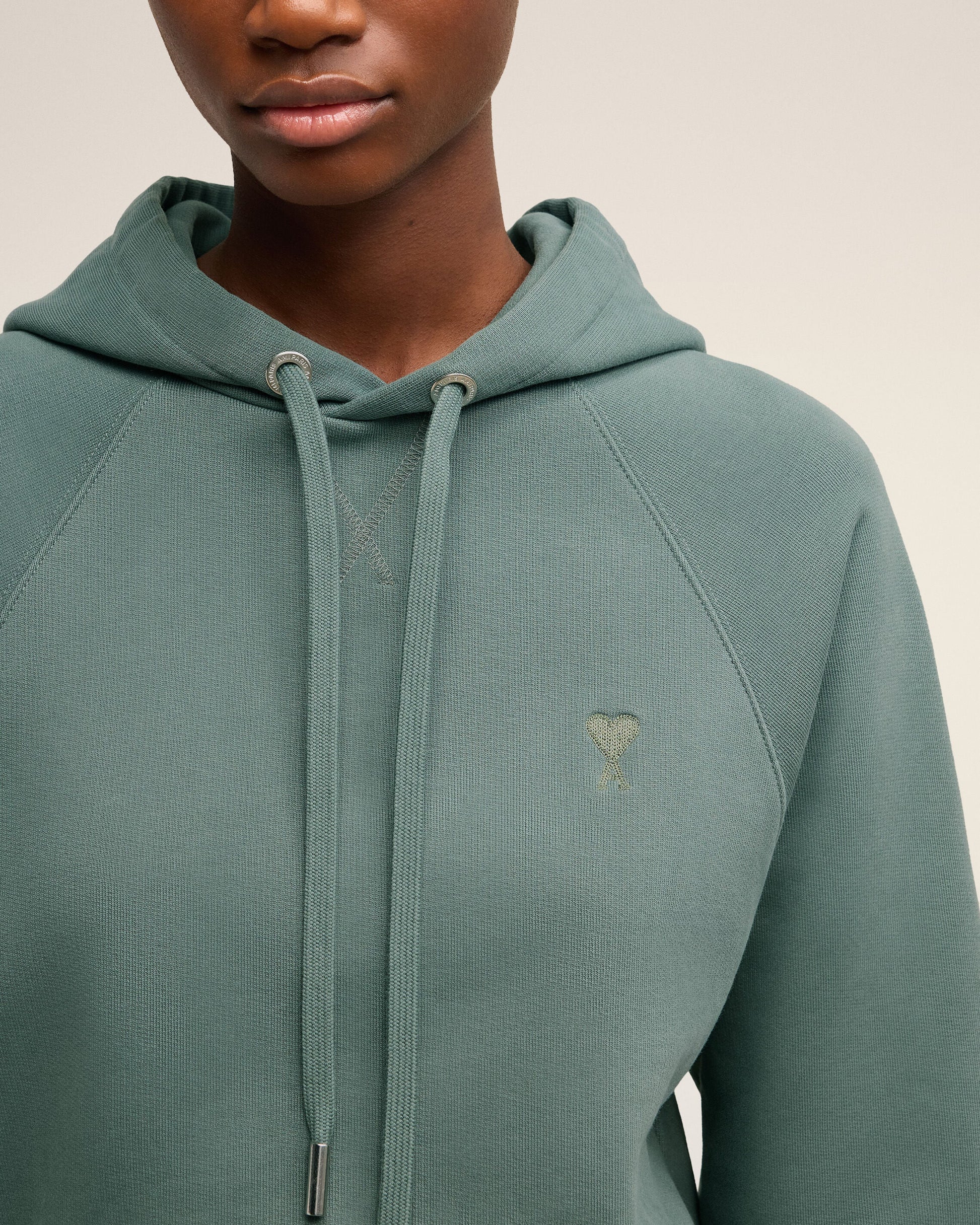 Hoodie in heavy loopback organic cotton fleece. Boxy fit Unisex product 61 cm center back length (Size XS) 65 cm center back length (Size M) Tonal Ami de Coeur chest embroidery Tonal "AMI" embroidery on the back Raglan sleeves Nickel color metal ends and "ami" engraved eyelets Garment dye style with a wash effect Made in Portugal (with love) REF : USW240.JE0091.4013