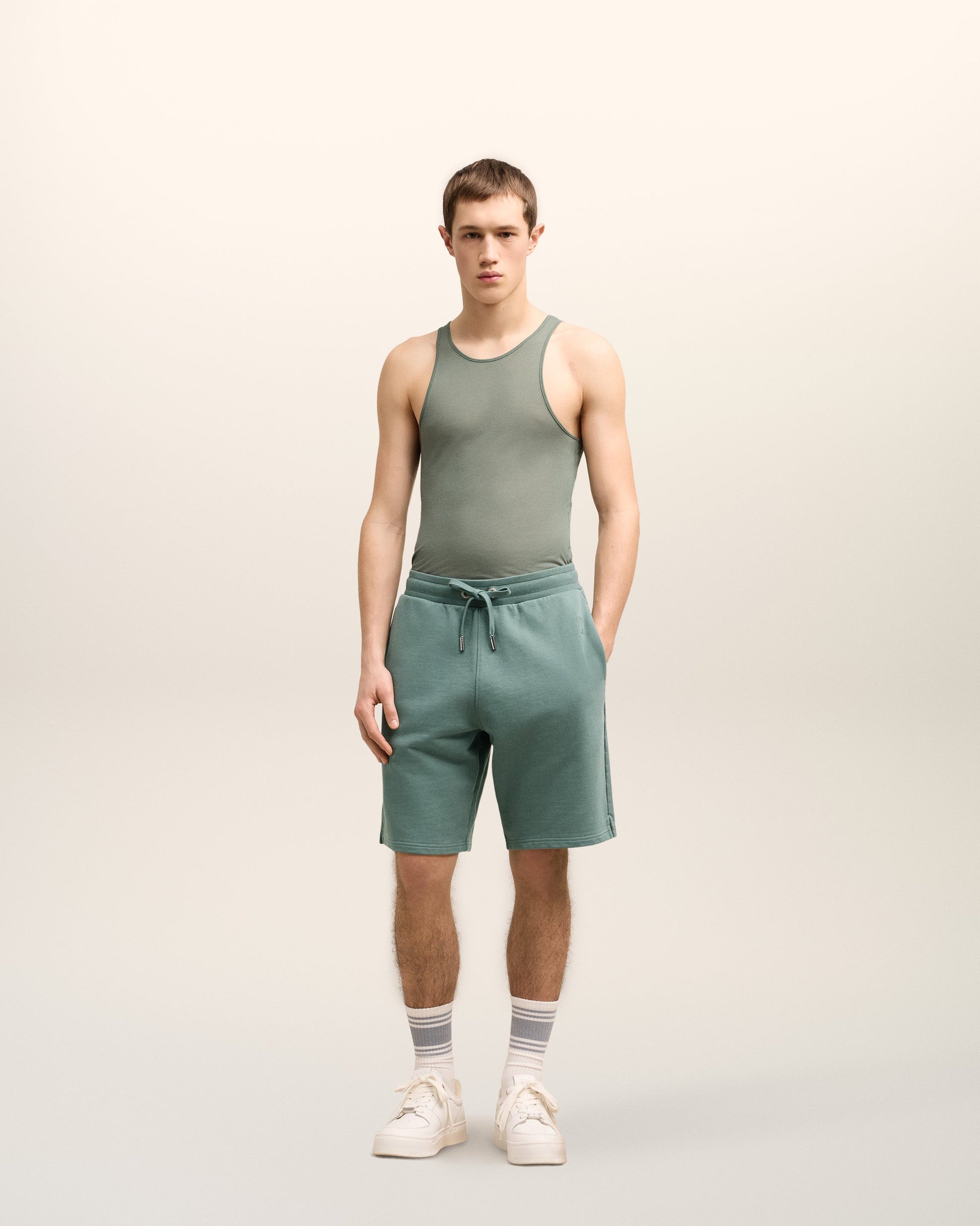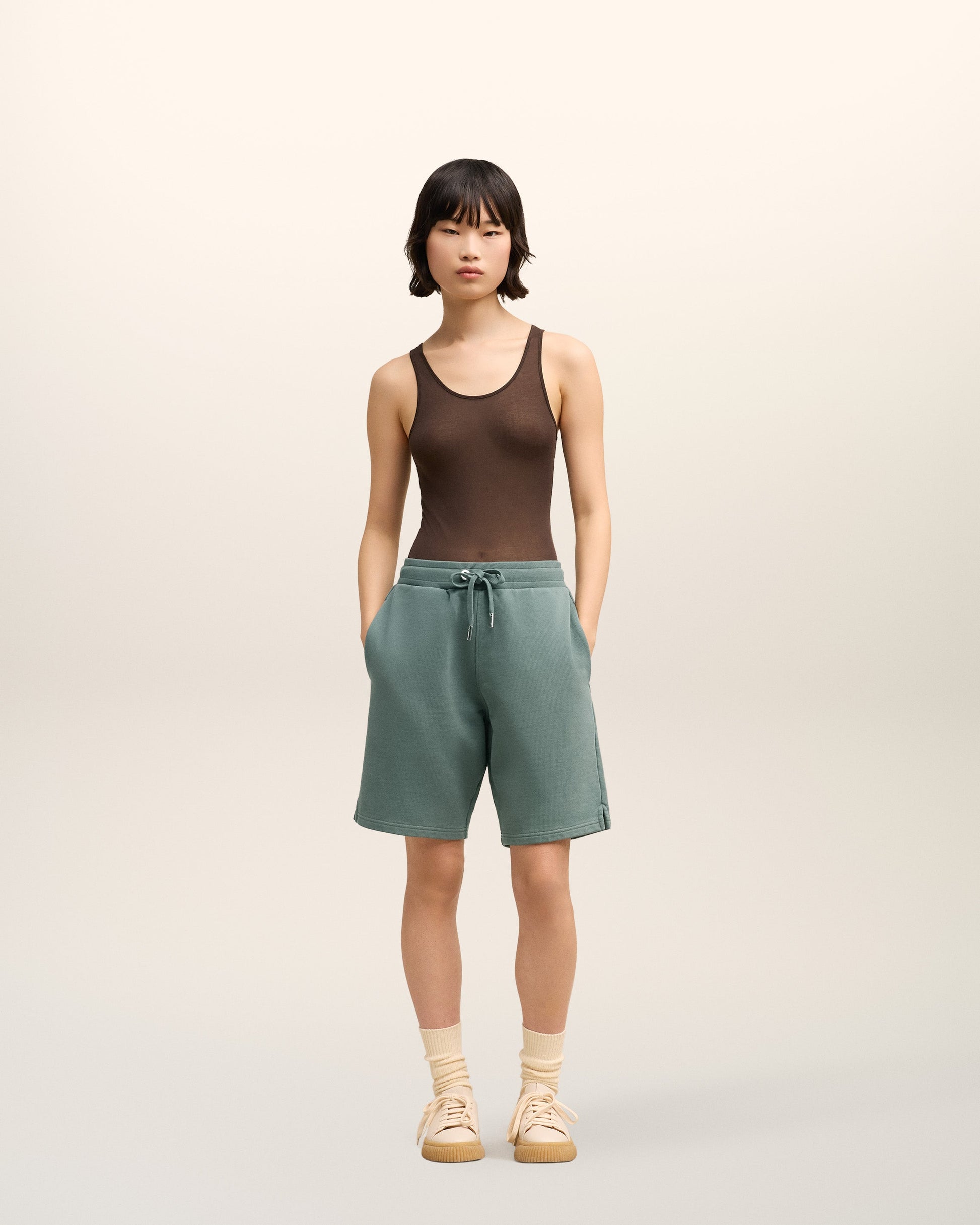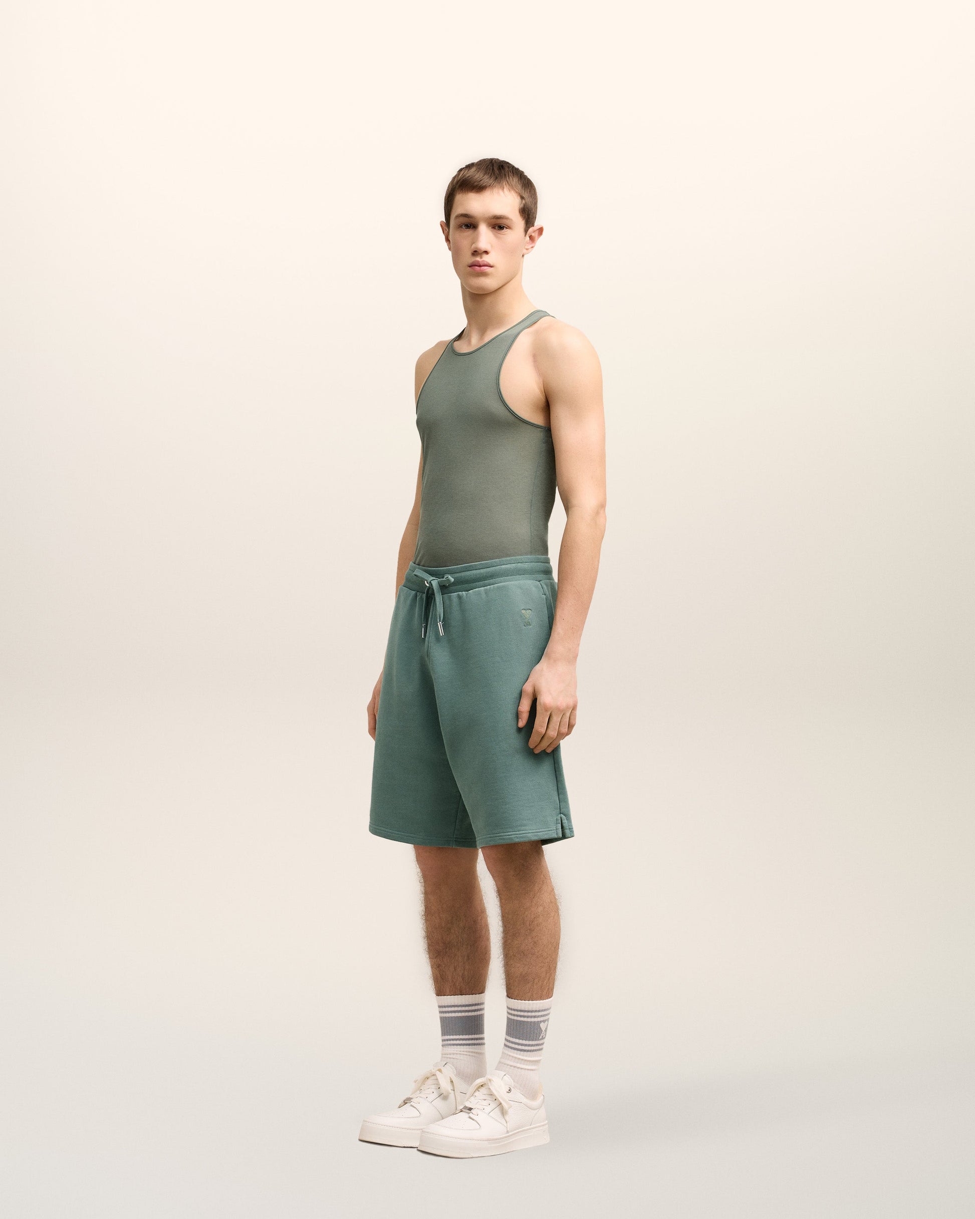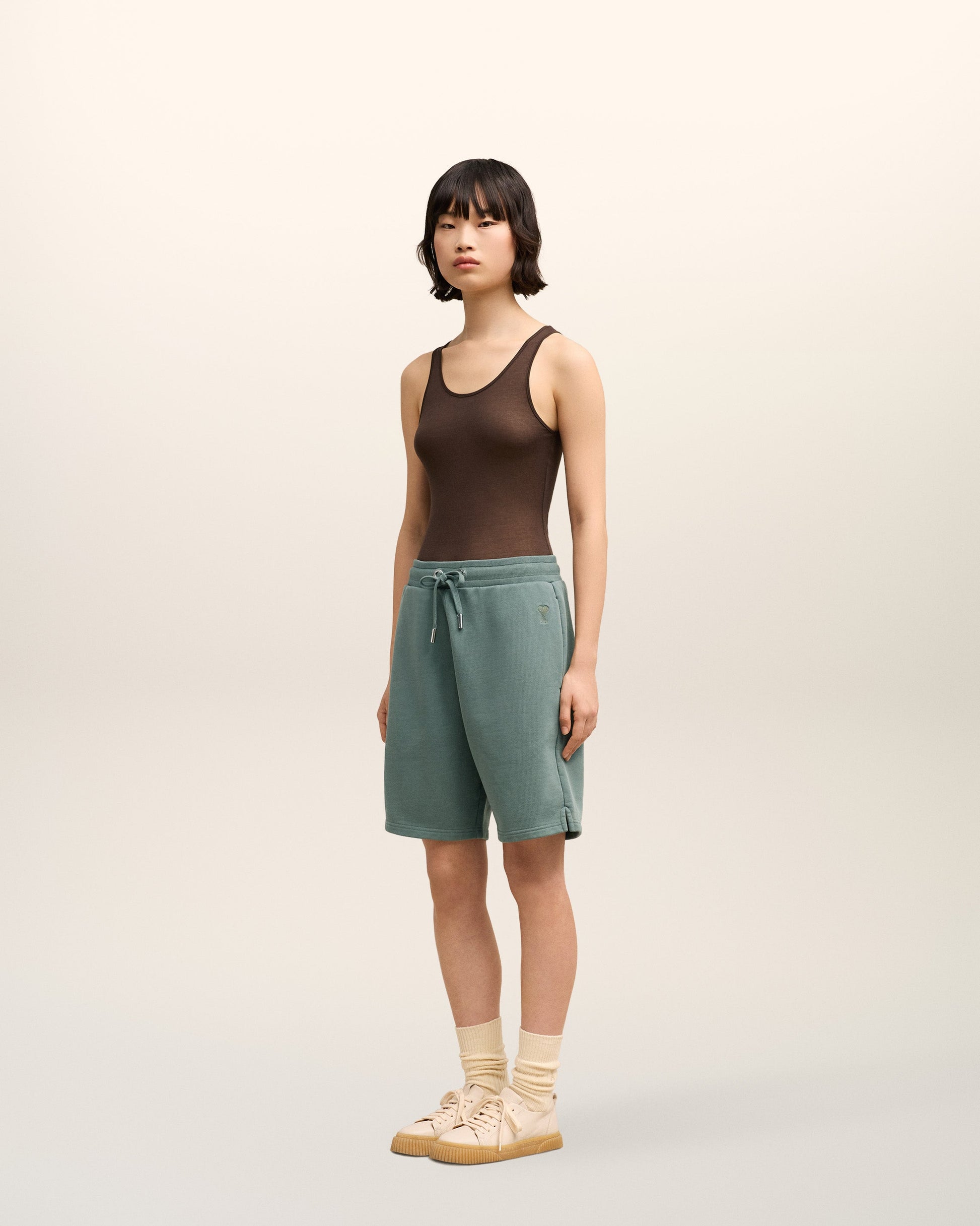 Ami de Coeur shorts in heavy loopback organic cotton fleece. Boxy fit Unisex product 27 cm bottom leg width (Size XS) 29 cm bottom leg width (Size M) Tonal Ami de Coeur embroidery Side pockets External waist drawstring Tonal color metal ends and "ami" engraved eyelets Garment dye style with a wash effect Made in Portugal (with love) REF : USO640.JE0091.4013
