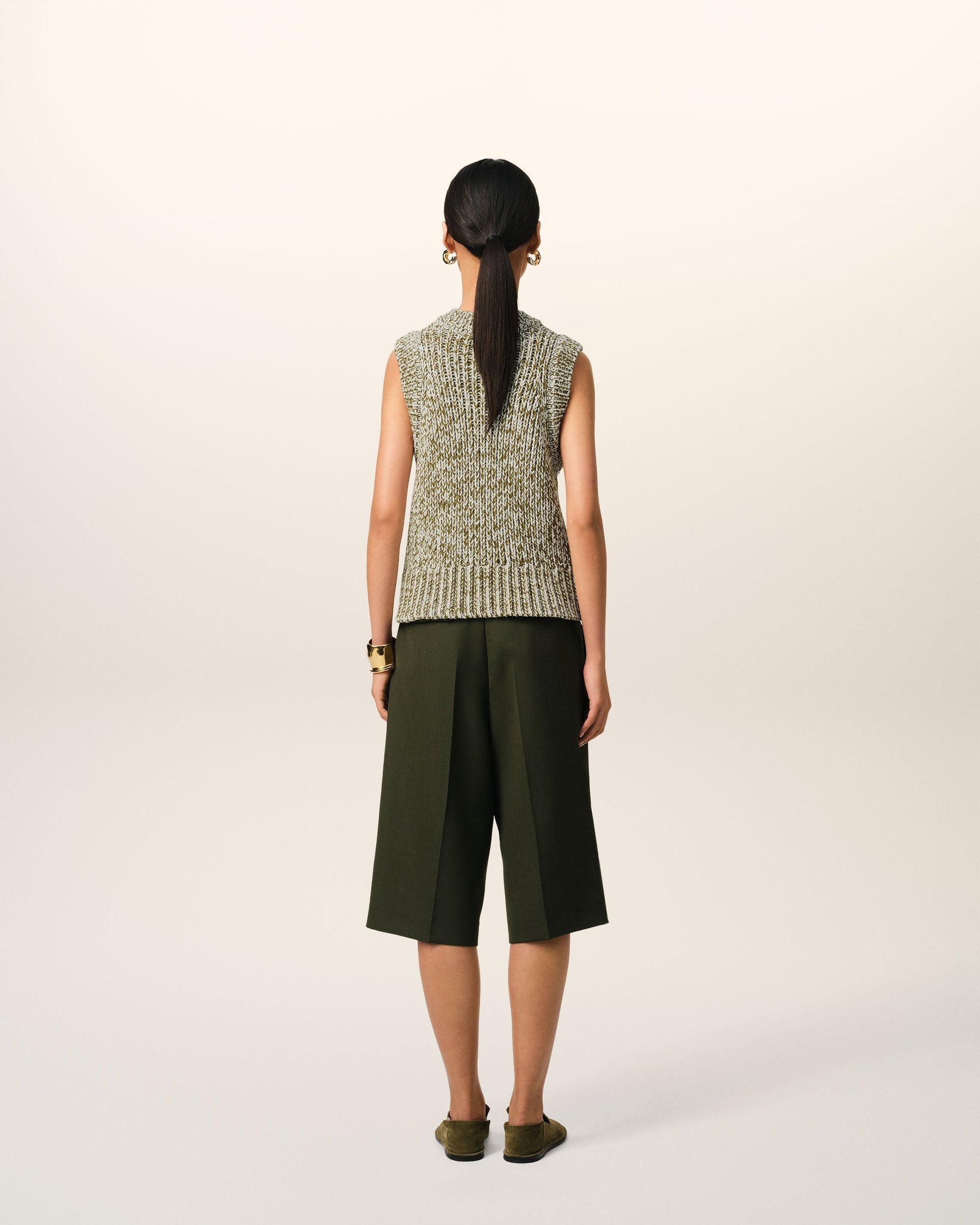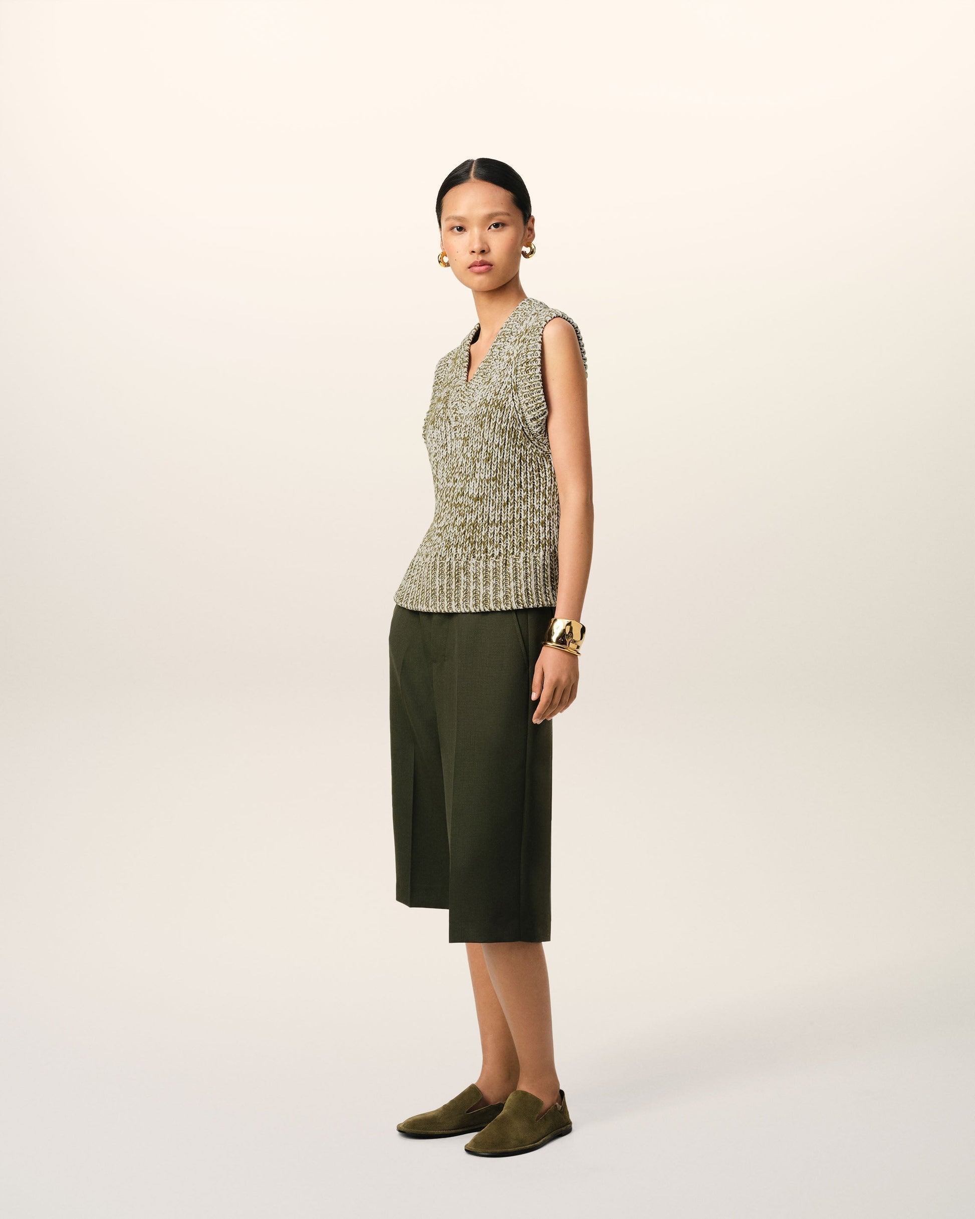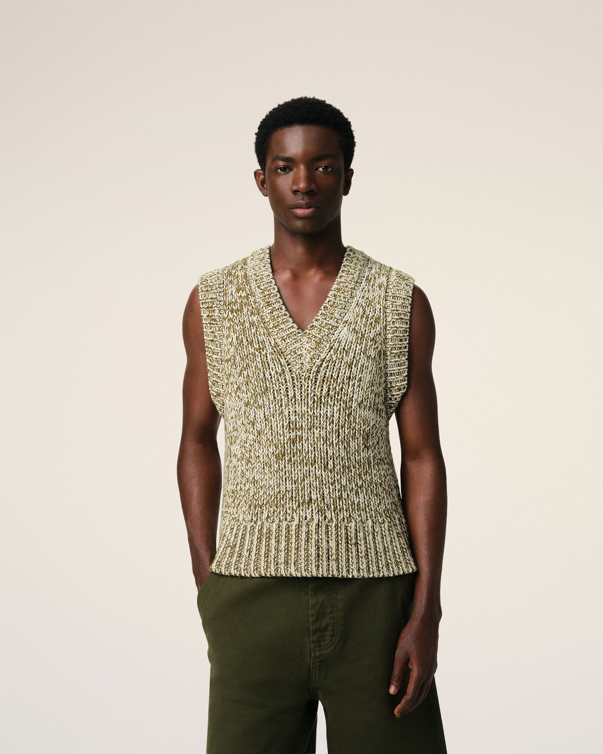 Green Cotton And Wool Sleeveless V Neck Sweater