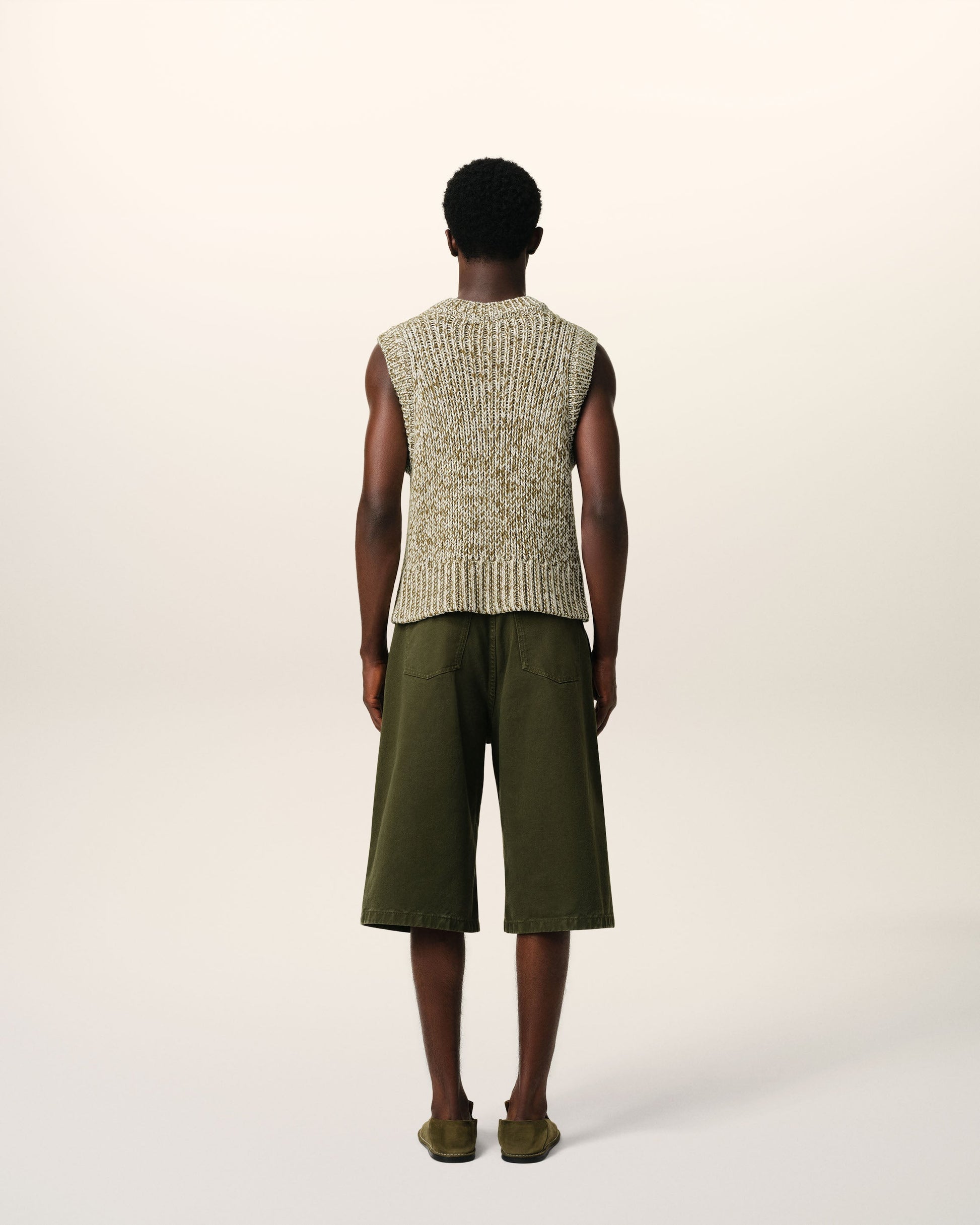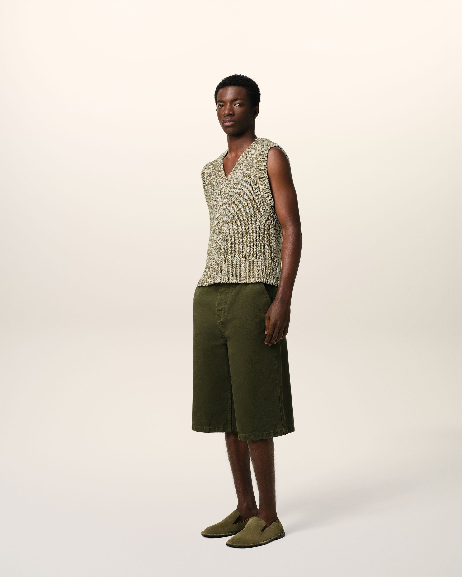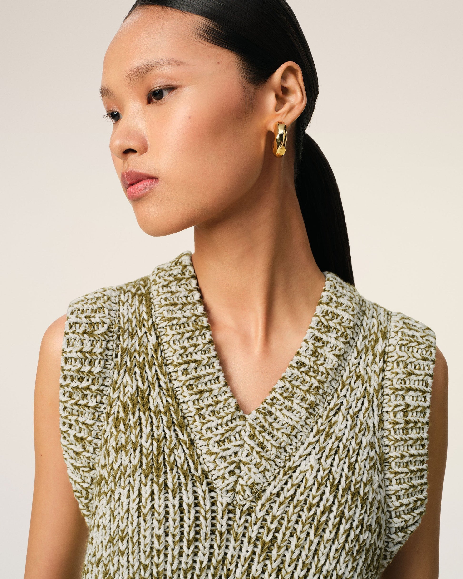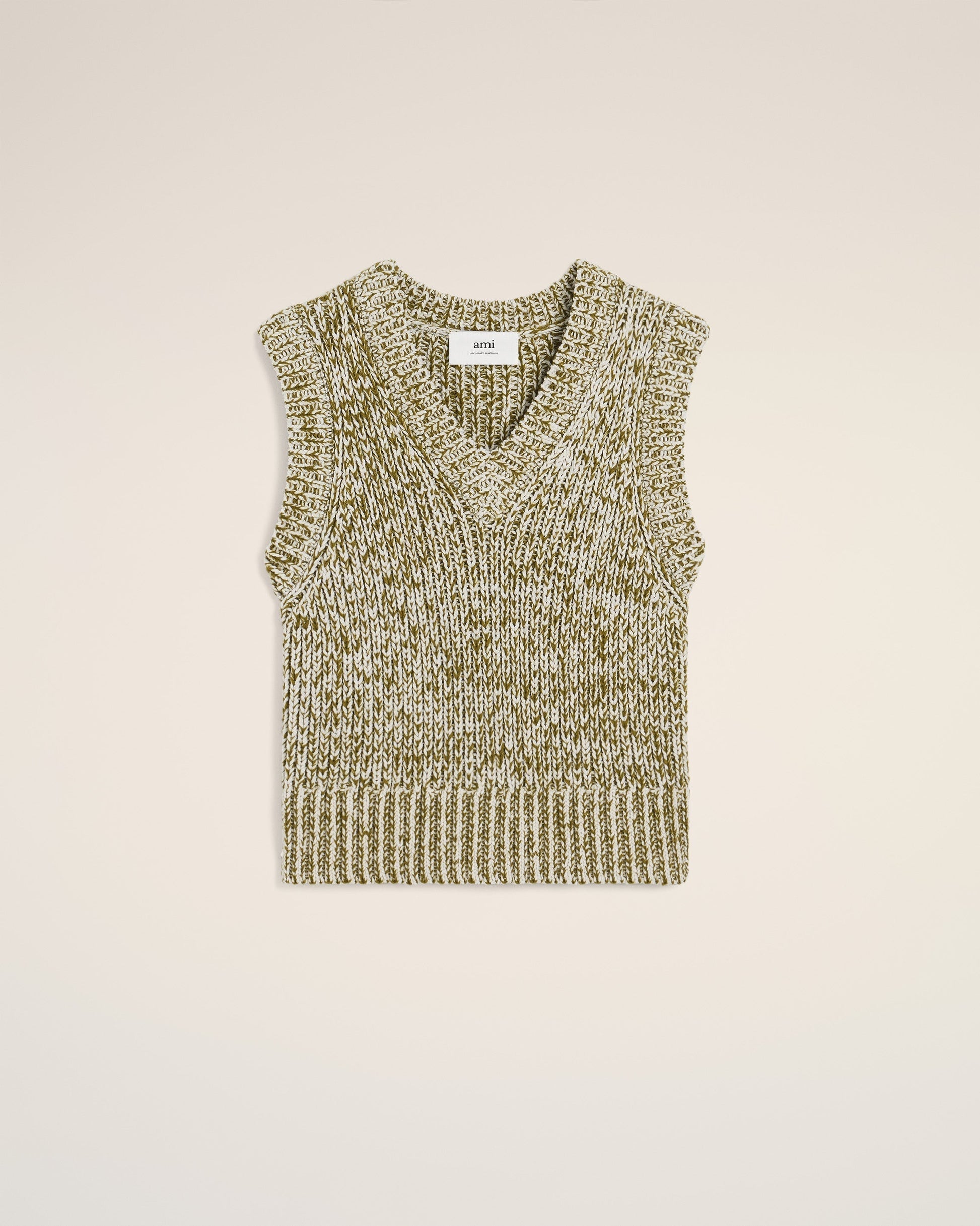 Green Cotton And Wool Sleeveless V Neck Sweater