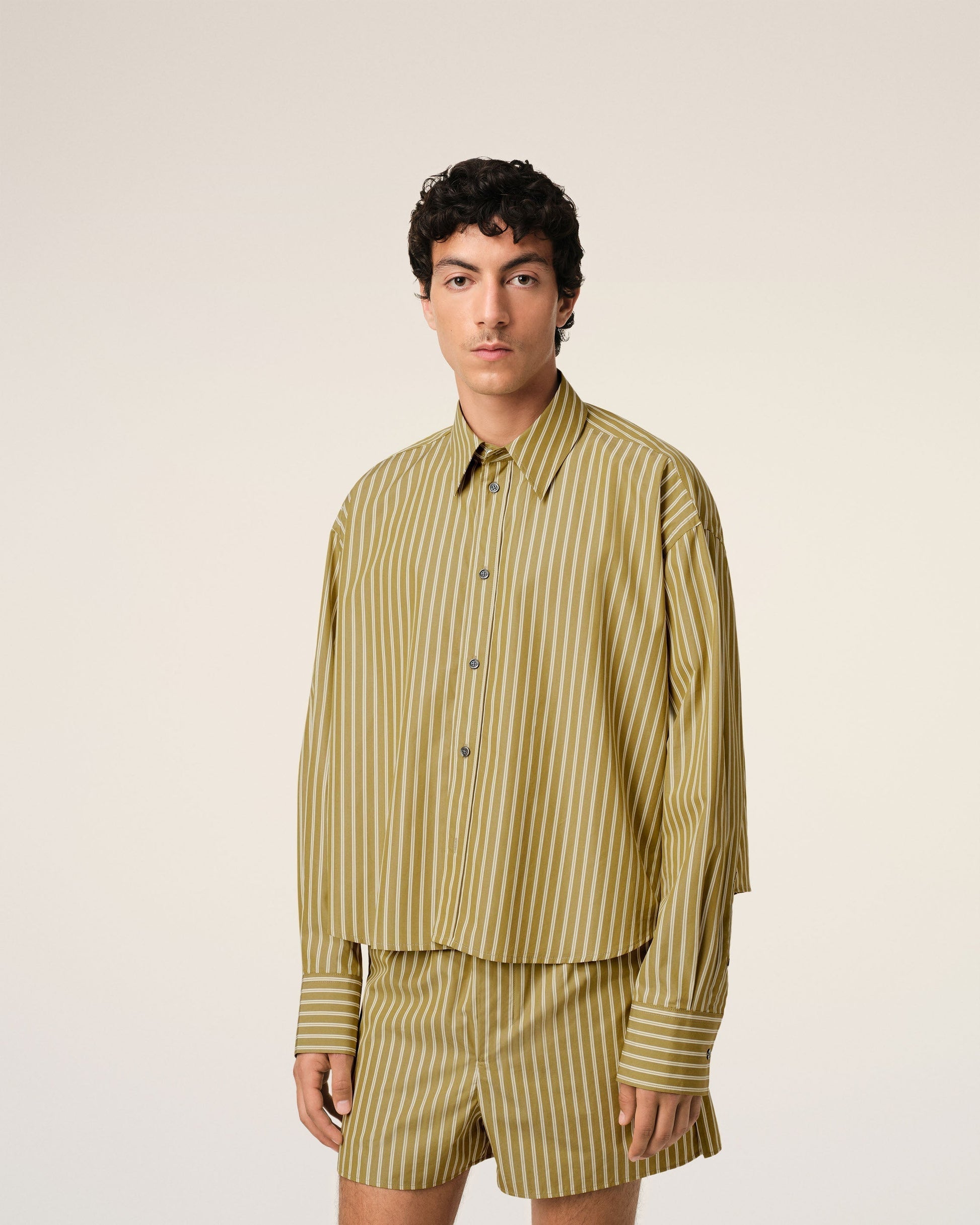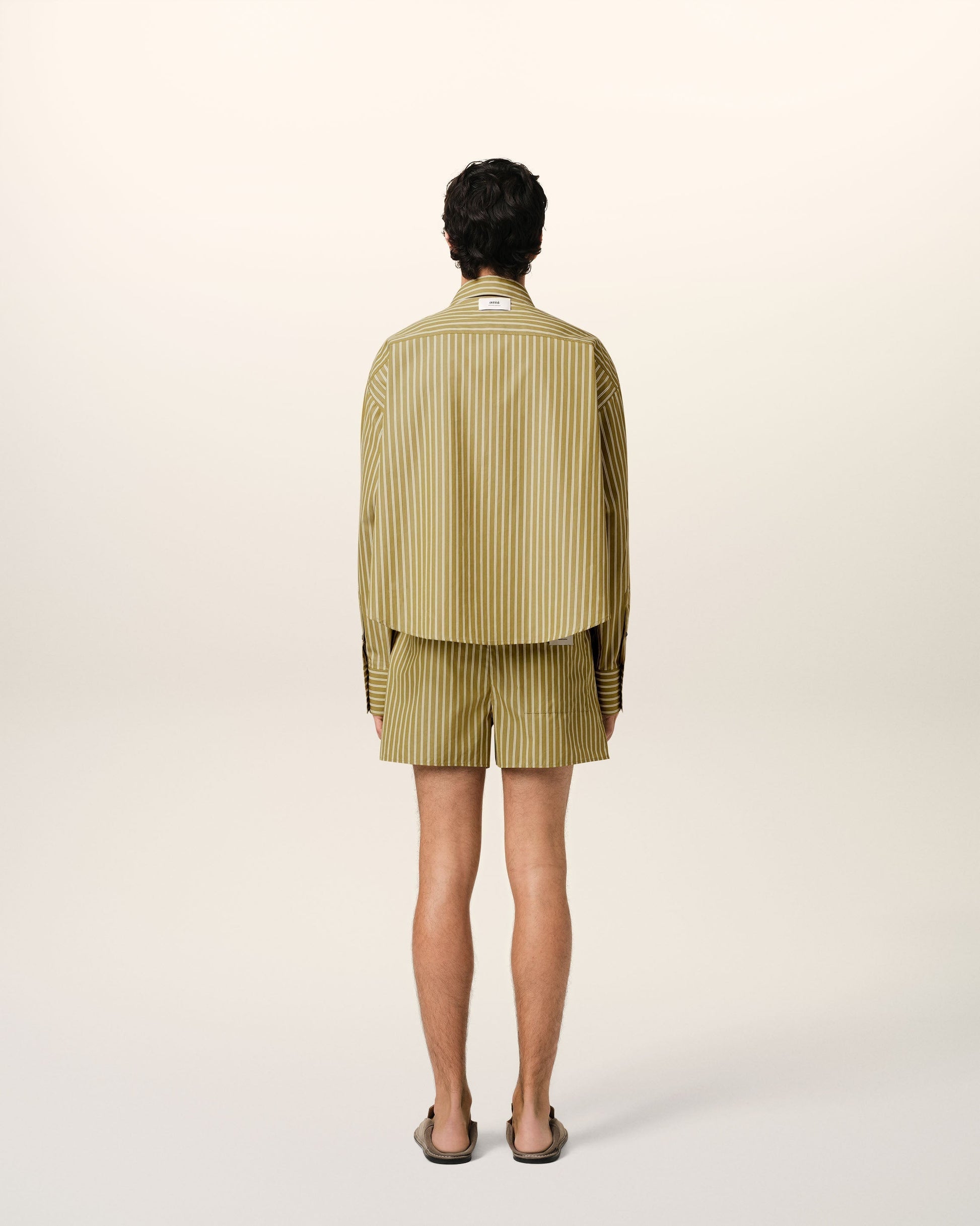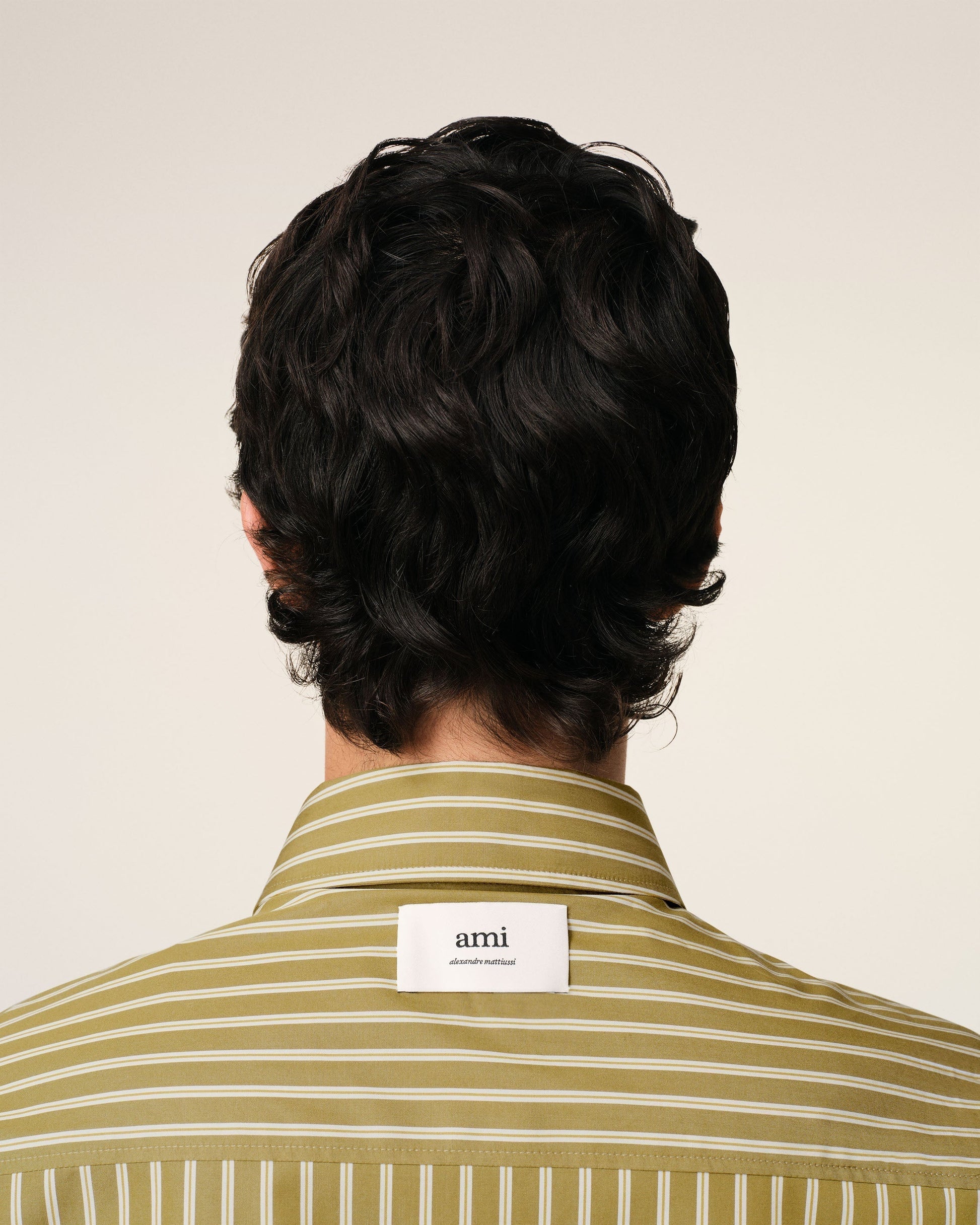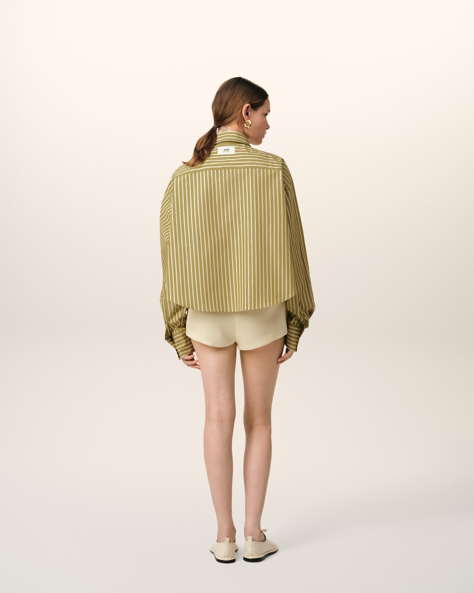 Cropped oversized shirt in stripped cotton poplin. Cropped oversized fit Unisex product 58 cm center back length (size XS) 66 cm center back length (size M) Label "ami alexandre mattiussi" handstitched under collar Classic collar Buttoned tab on front and cuffs Mother-of-pearl buttons Made in Poland (with love) REF: USH121.CO0108.3744