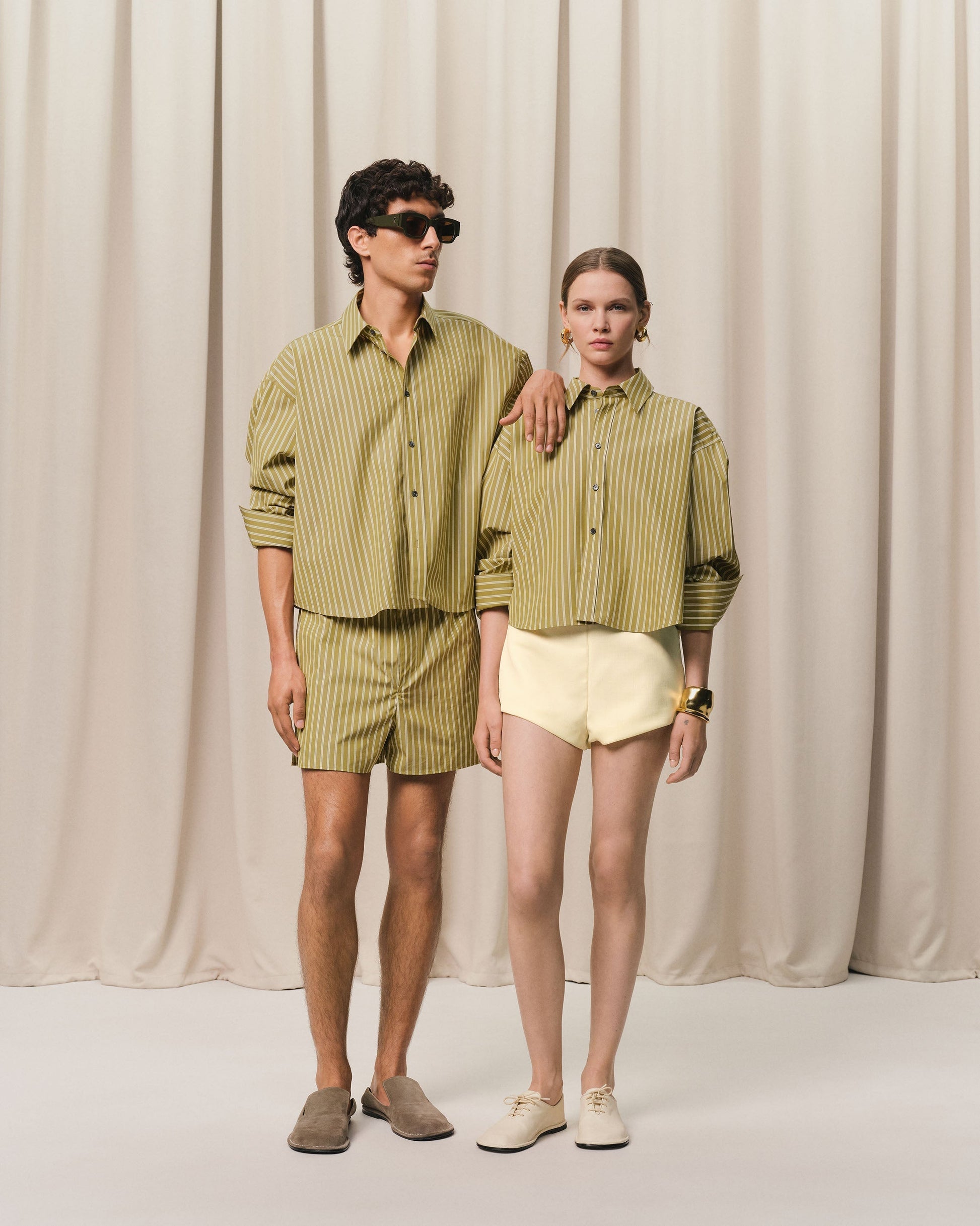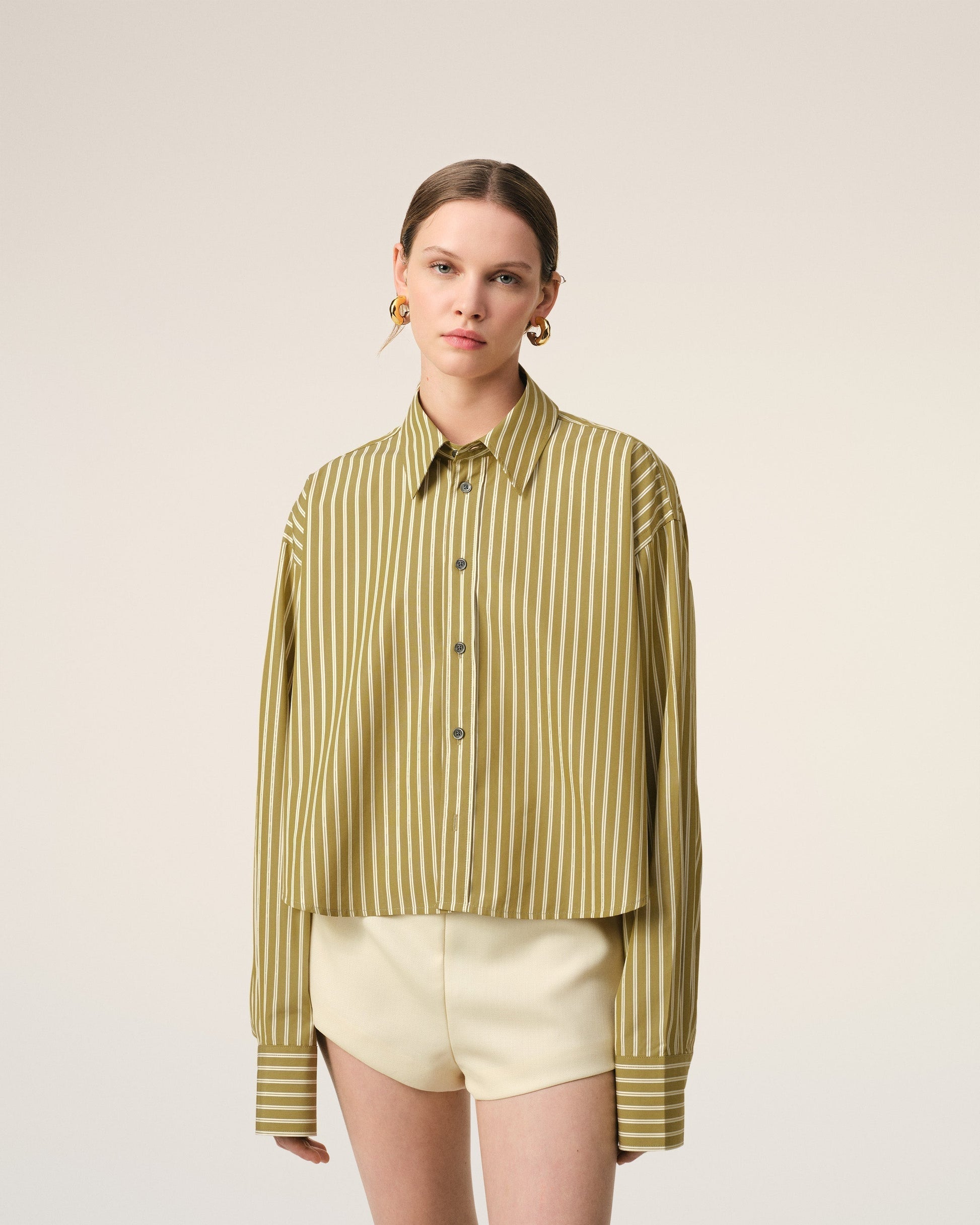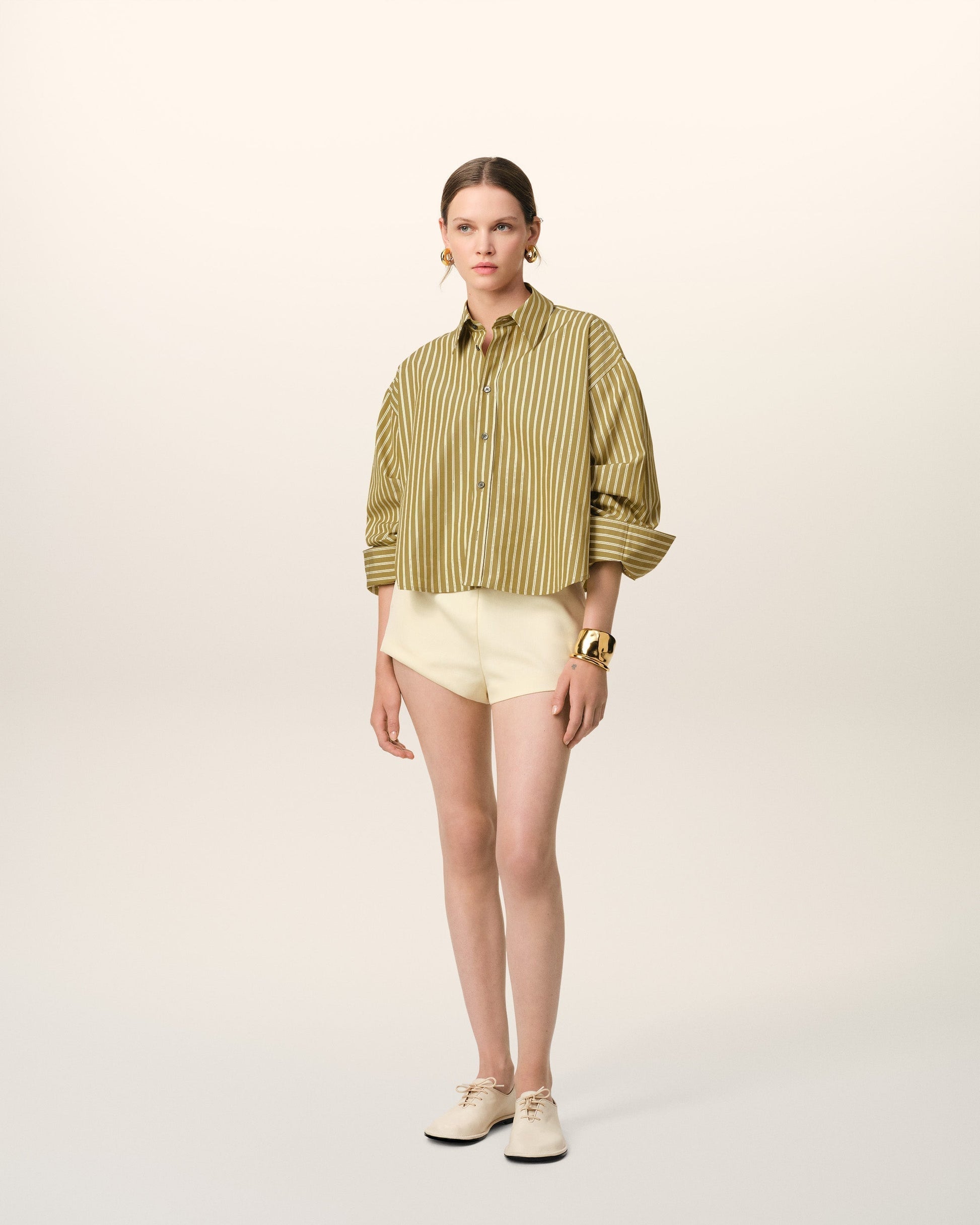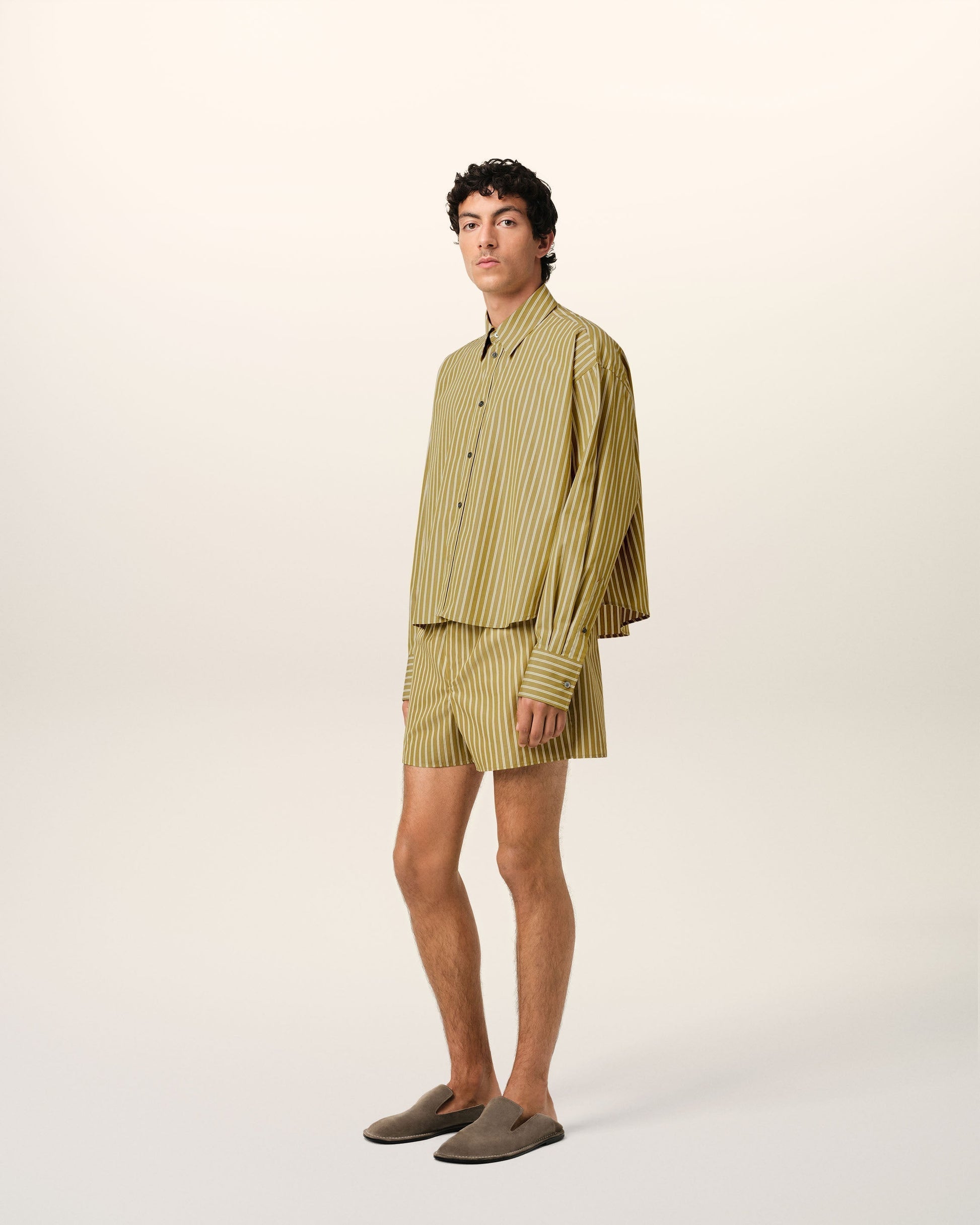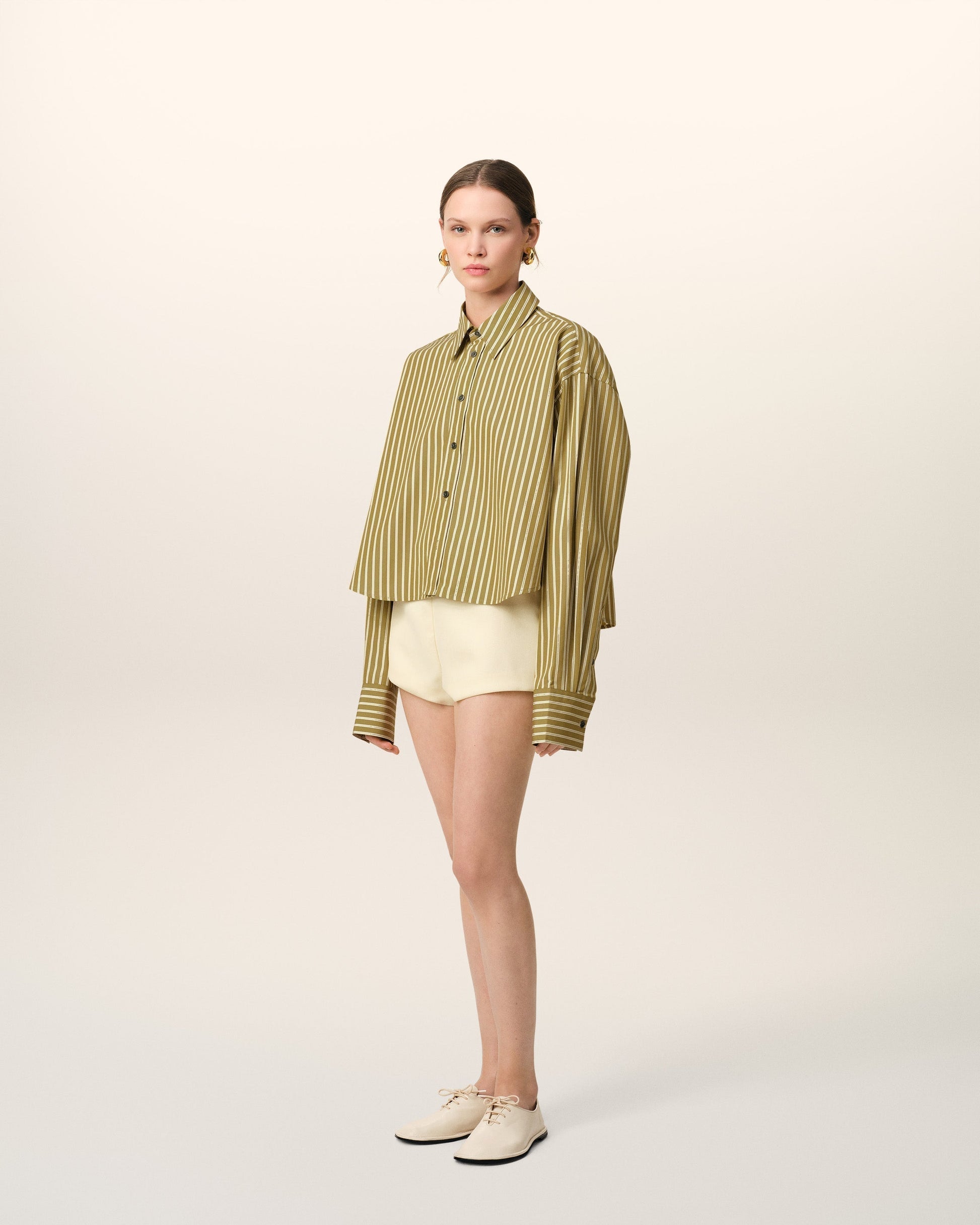 Cropped oversized shirt in stripped cotton poplin. Cropped oversized fit Unisex product 58 cm center back length (size XS) 66 cm center back length (size M) Label "ami alexandre mattiussi" handstitched under collar Classic collar Buttoned tab on front and cuffs Mother-of-pearl buttons Made in Poland (with love) REF: USH121.CO0108.3744