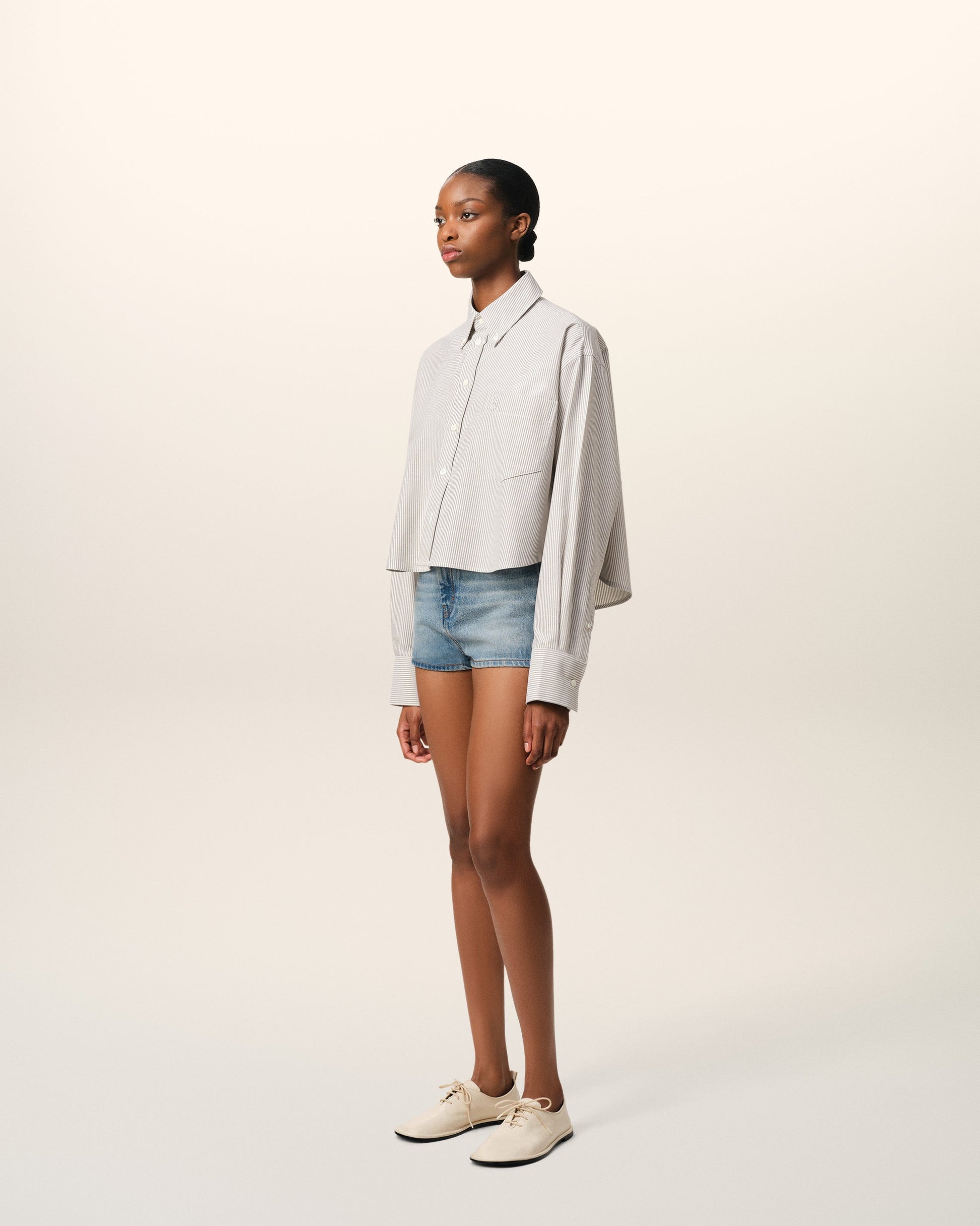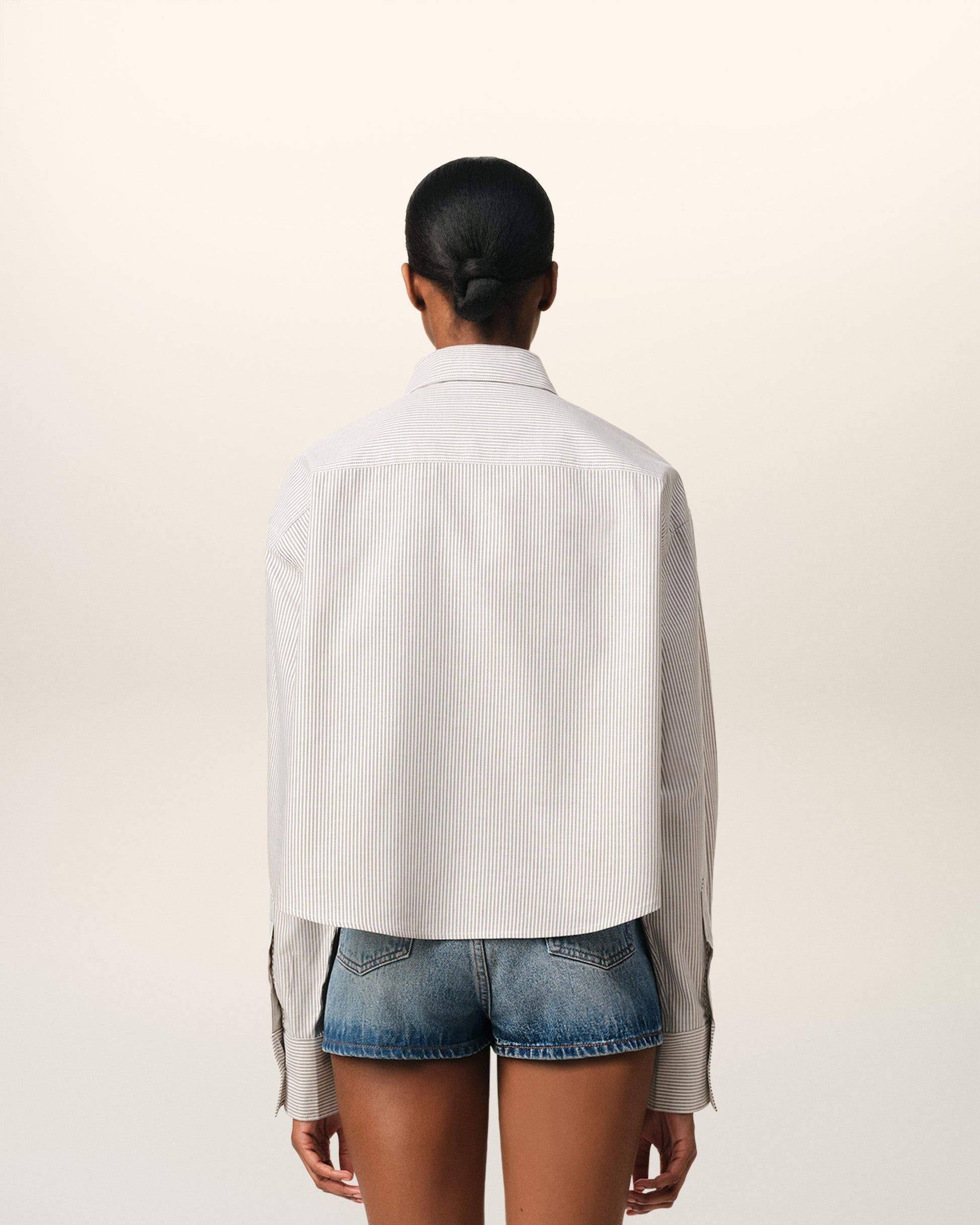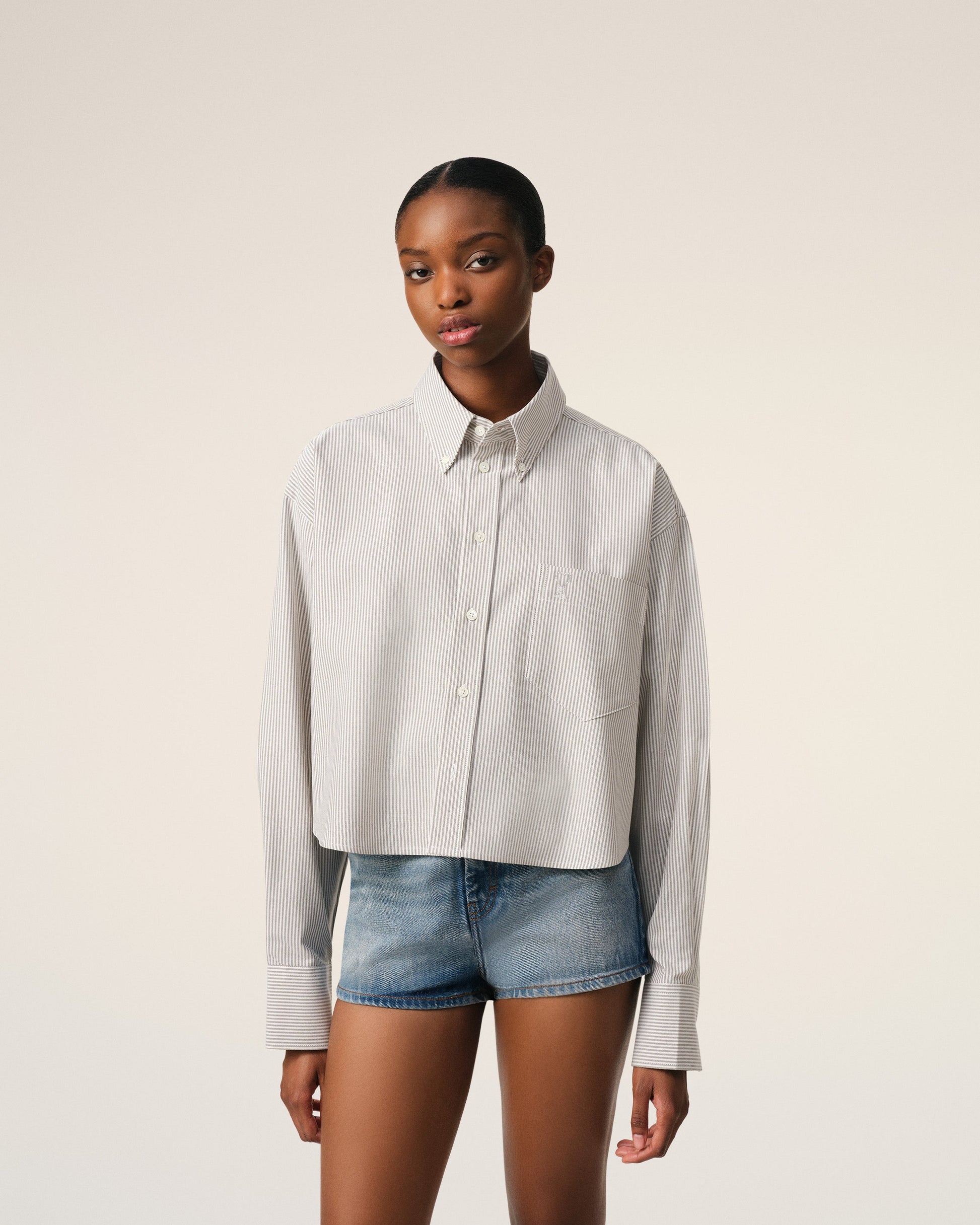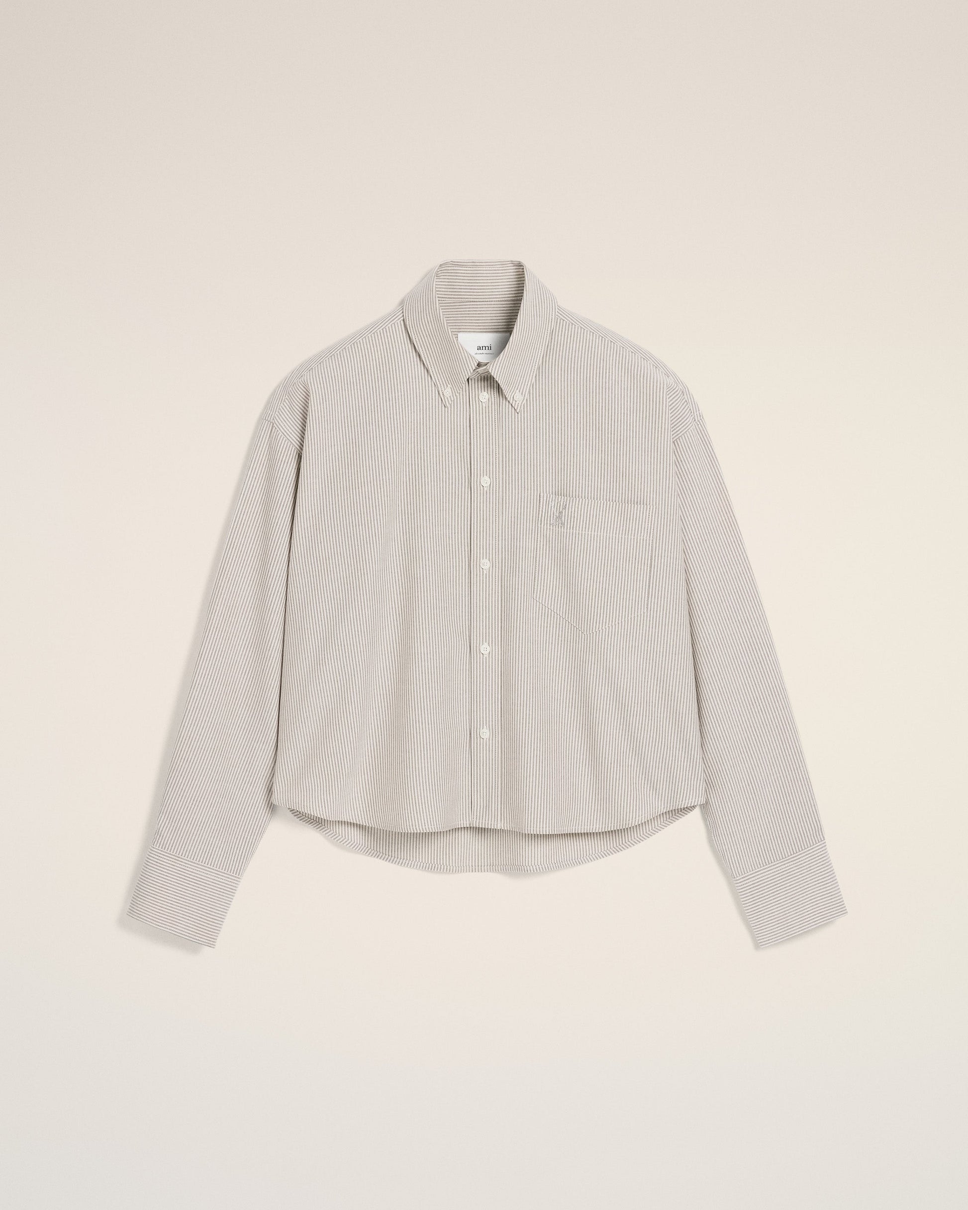Cropped shirt in striped cotton oxford. Cropped oversized fit Unisex product 58 cm center back length (size XS) 66 cm center back length (size M) Embossed and topstitched Ami de Coeur on the pocket Patch pocket Button-down collar Buttonned tab on front and cuffs Mother-of-pearl buttons Made in Portugal (with love) REF: USH123.CO0087.4761