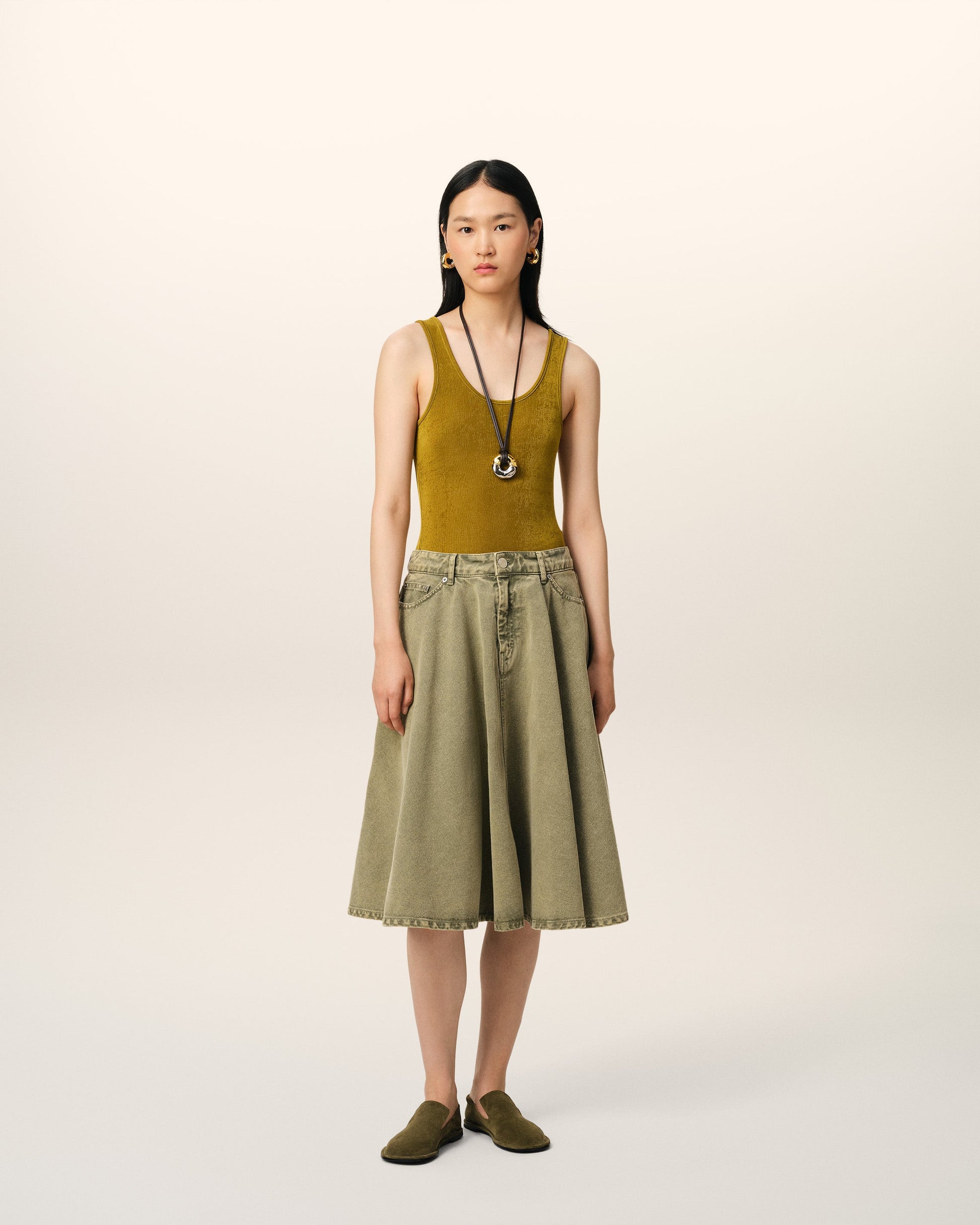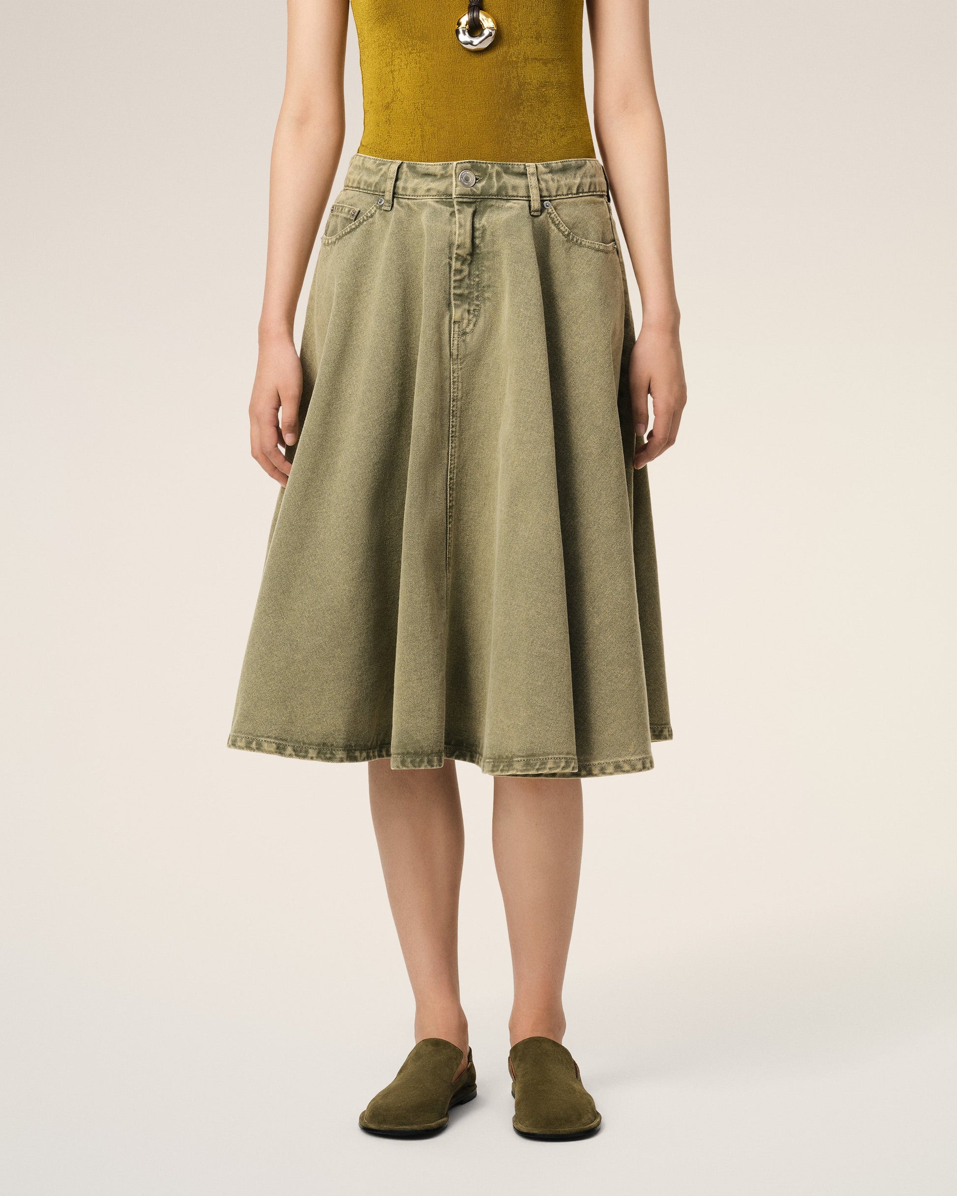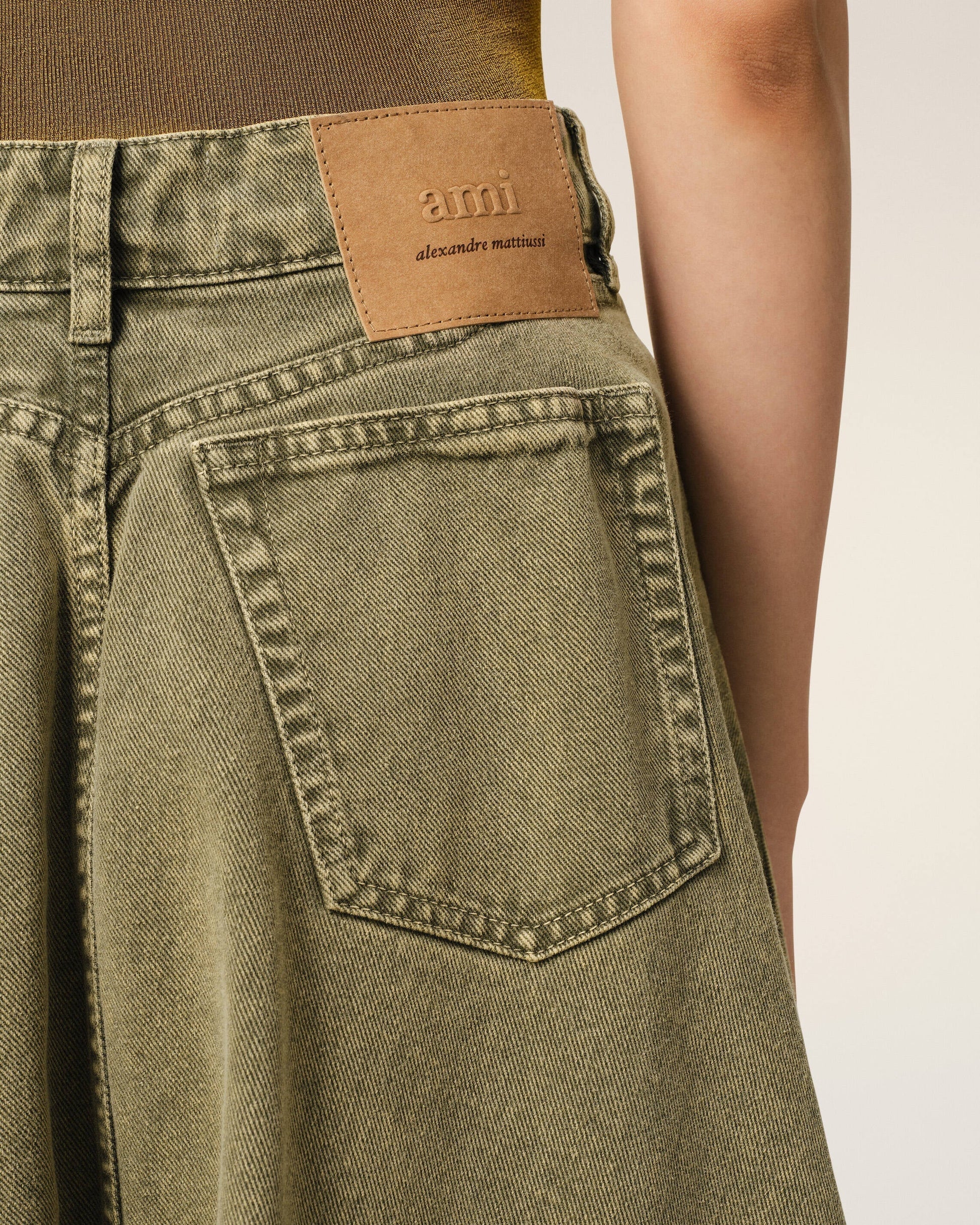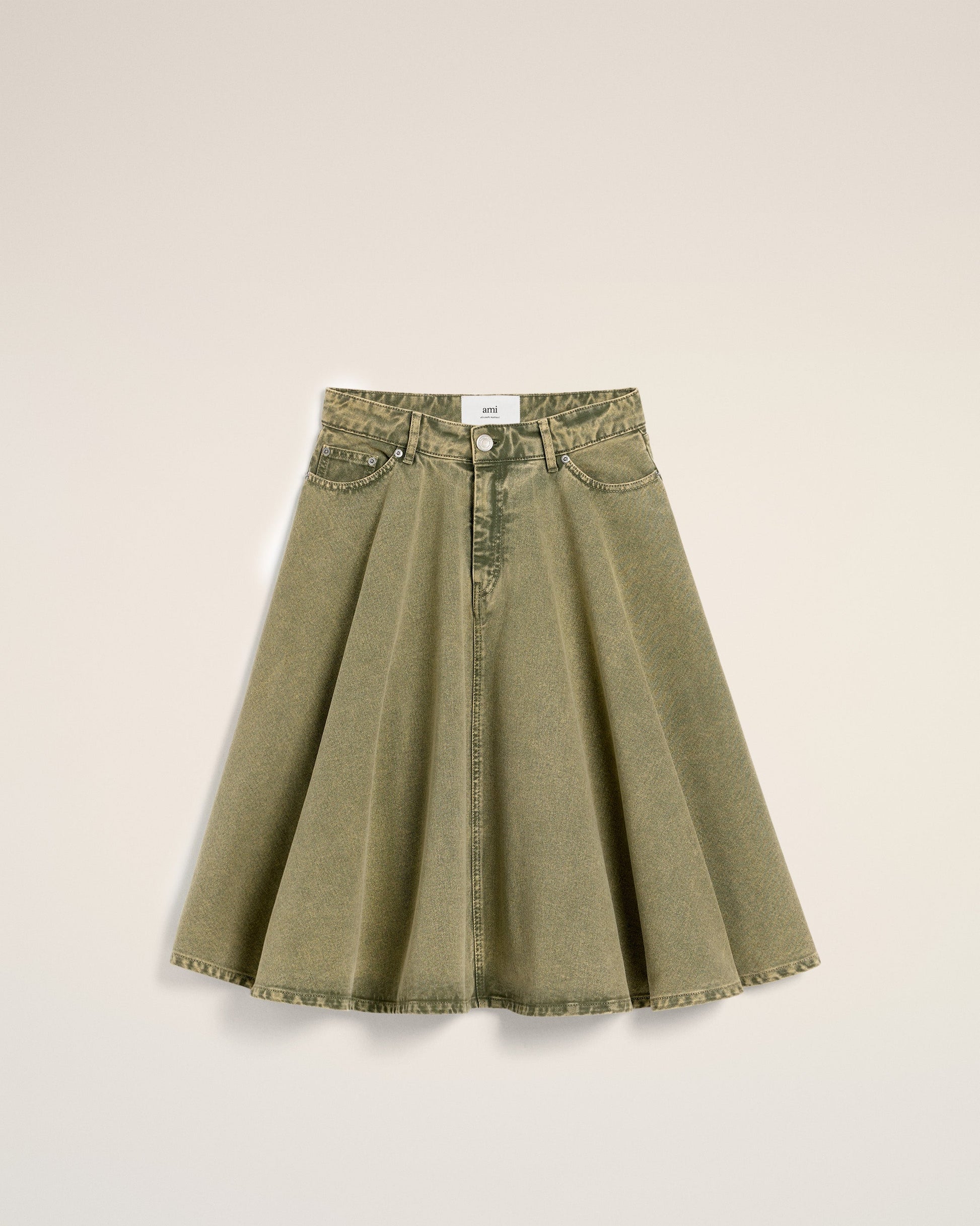 Midi skirt with godets in washed colored cotton twill. 35 cm middle back length (size 36) Low-rise Zipped fly Denim metal rivets and buttons in nickel color "ami alexandre mattiussi" patch on the back Tonal topstitches Made in Portugal (with love) REF: FSK226.DE0064.375