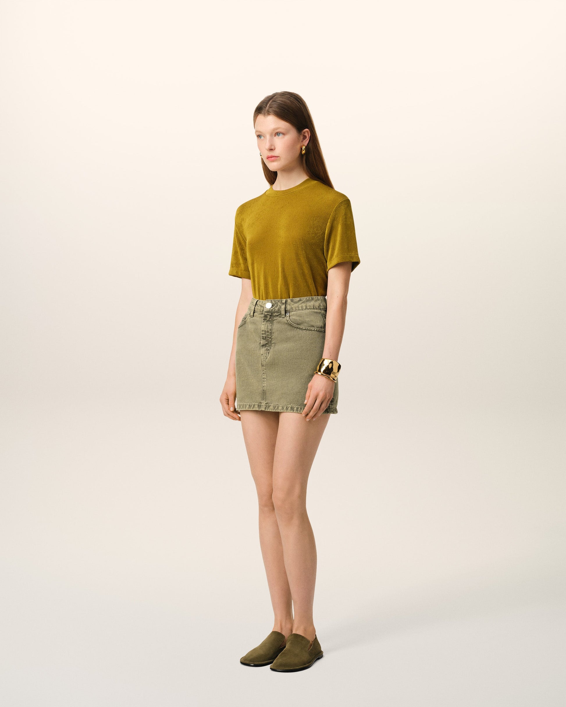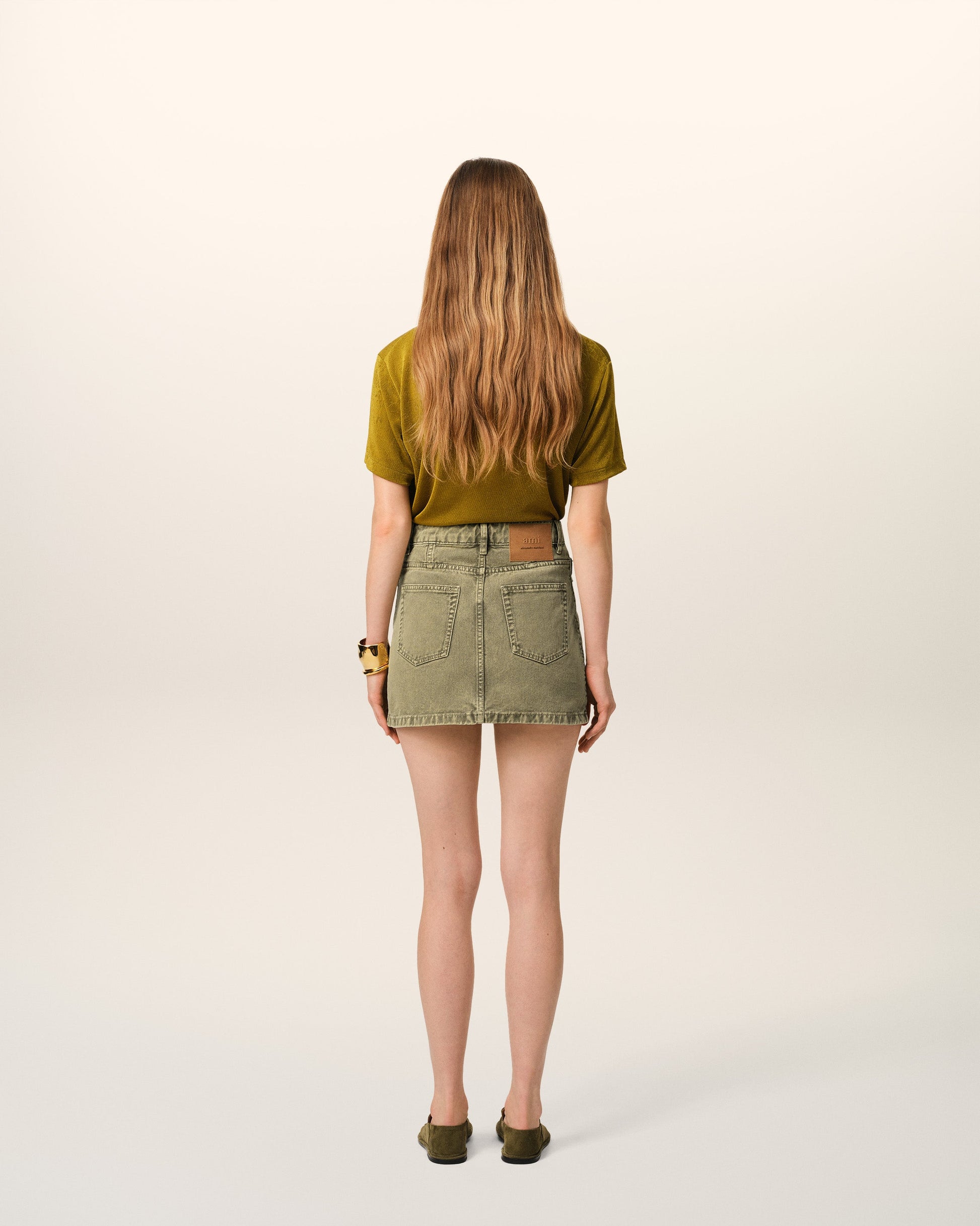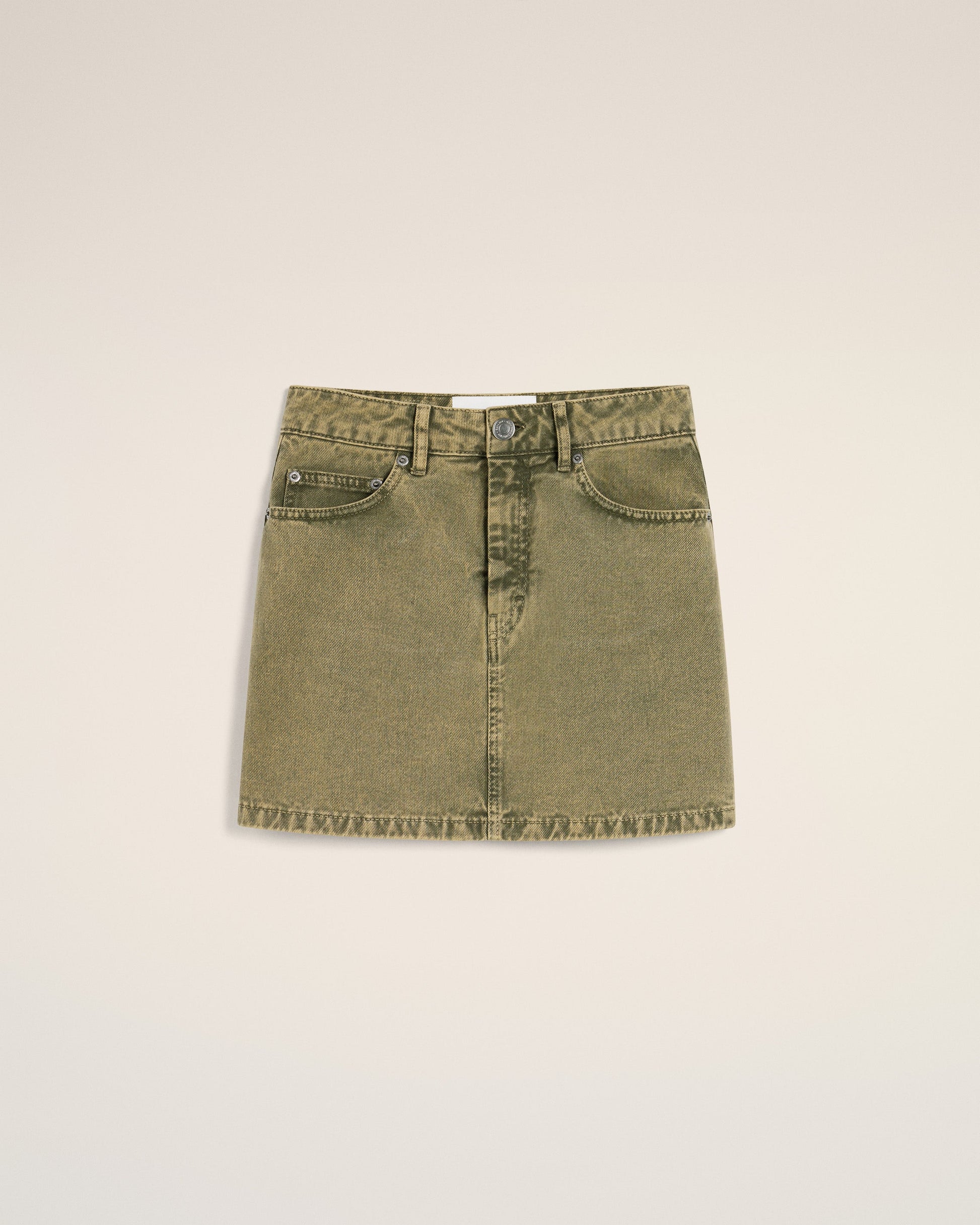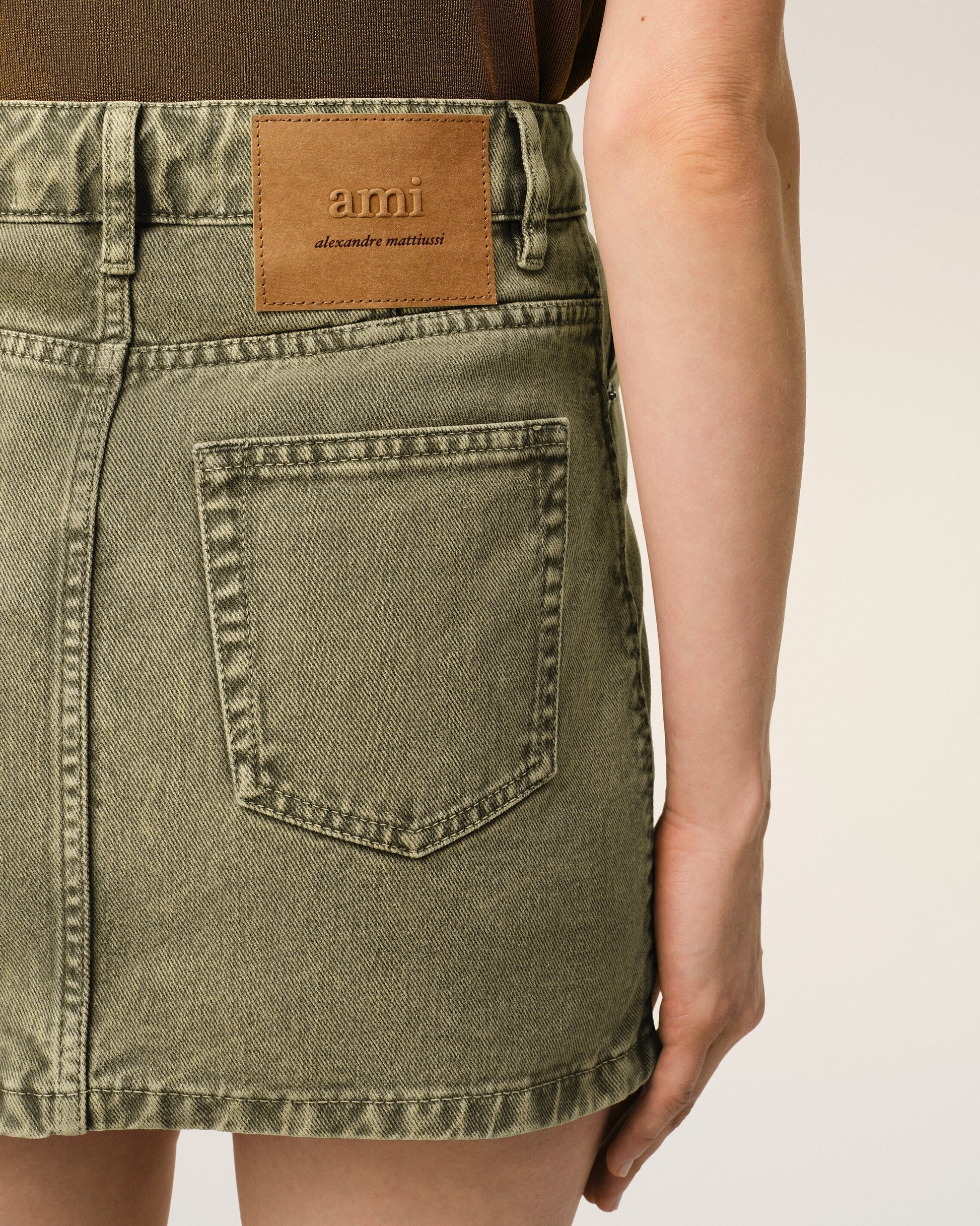 Mini skirt in washed colored cotton twill. 35 cm center back length (size 26) High waist Five pockets Zipped fly Denim metal rivets and buttons in nickel color "ami alexandre mattiussi" patch on the back Tonal topstitches Made in Portugal (with love) REF: FSK037.DE0064.375