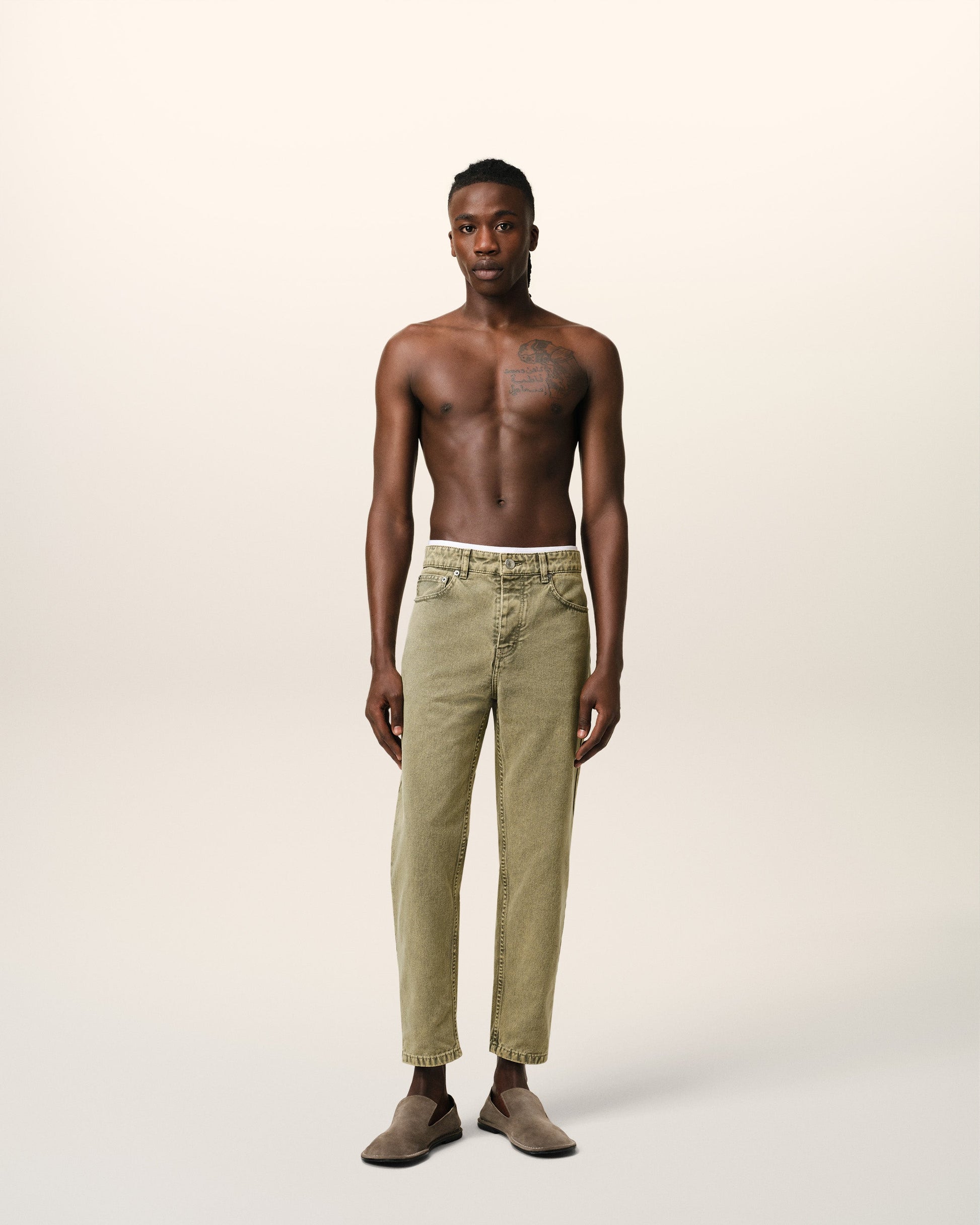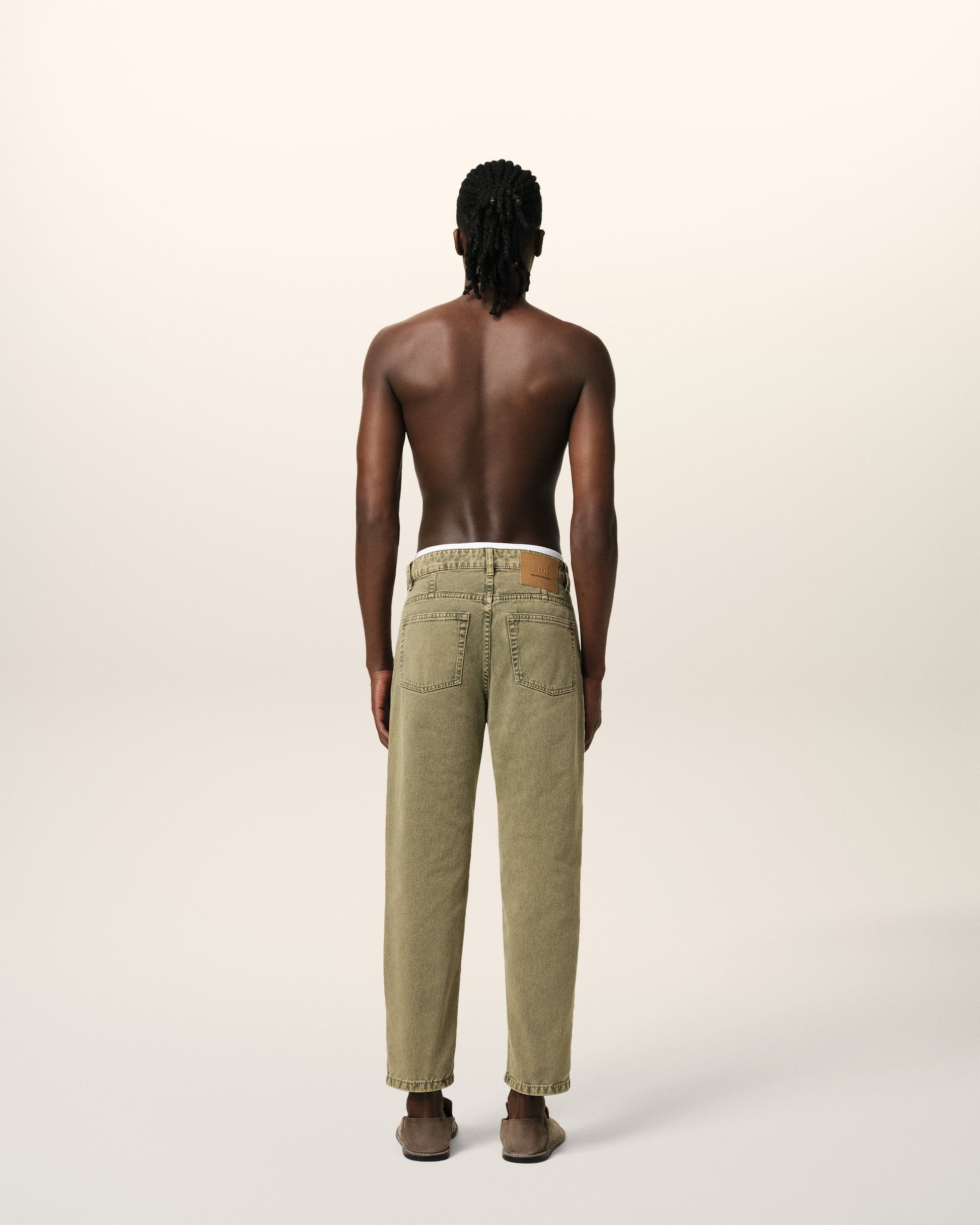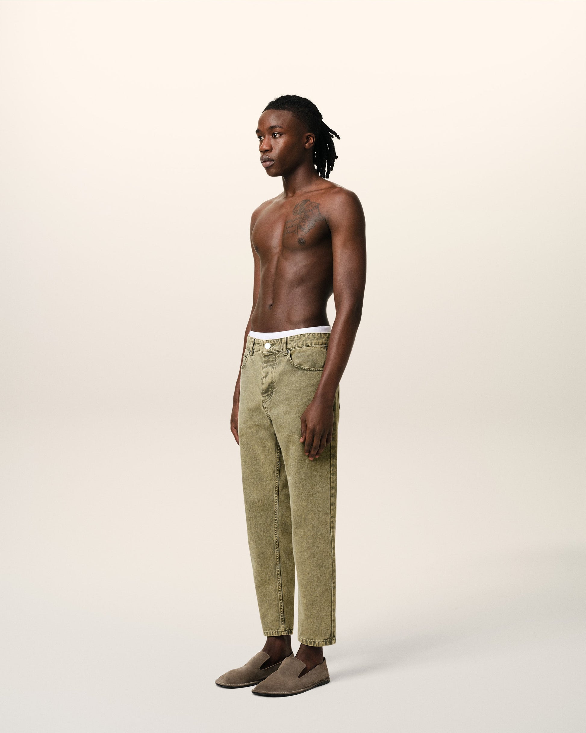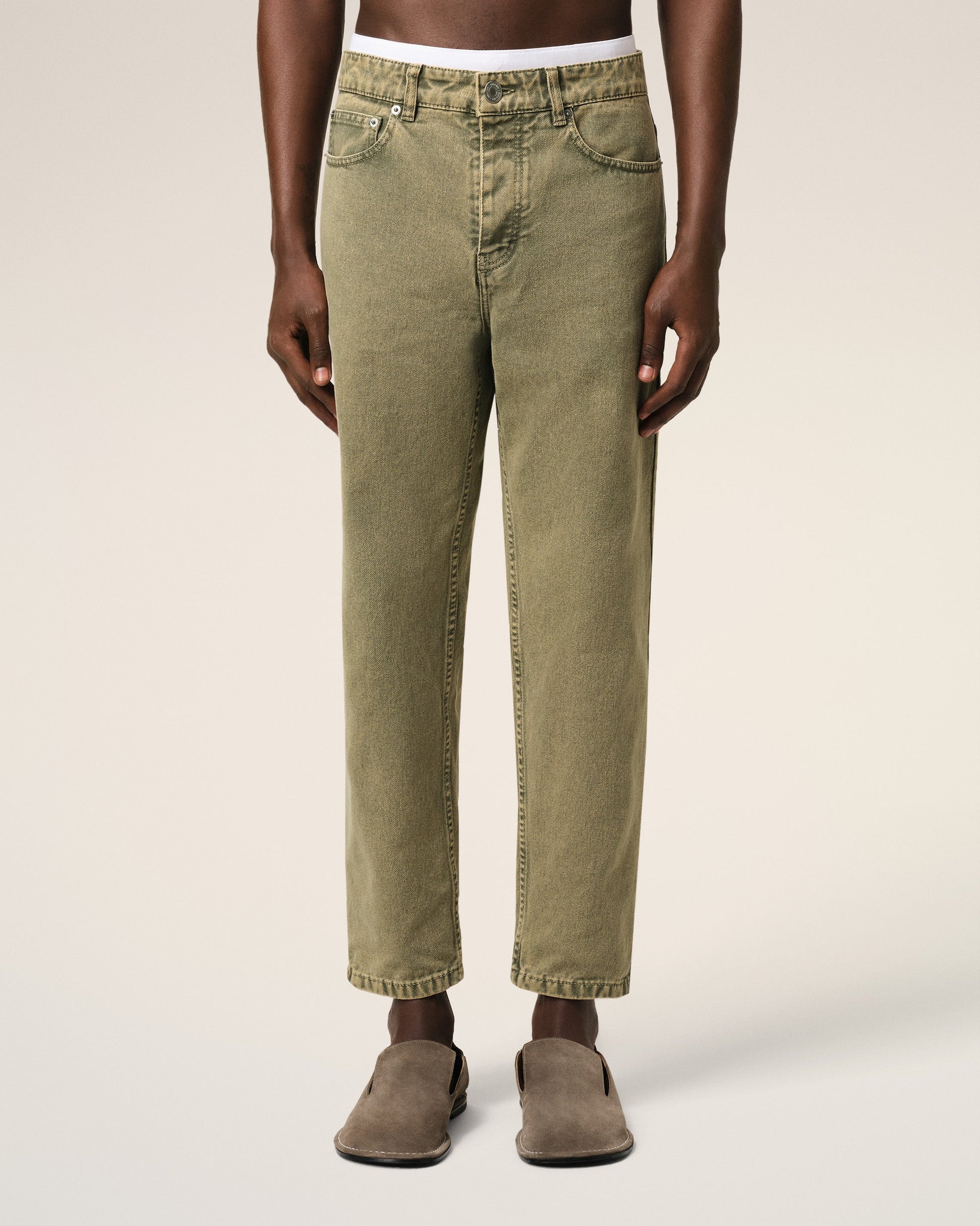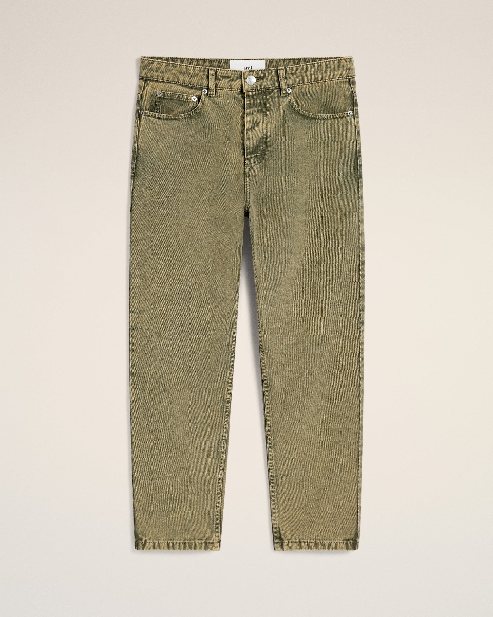 Tapered fit jeans in washed colored cotton twill. Tapered fit 18 cm bottom leg width (size 30) Classic waist Carrot leg Five pockets Buttoned fly Denim metal rivets and buttons in nickel color "ami alexandre mattiussi" patch on the back Tonal topstitches Made in Portugal (with love) REF: HTR103.DE0064.375