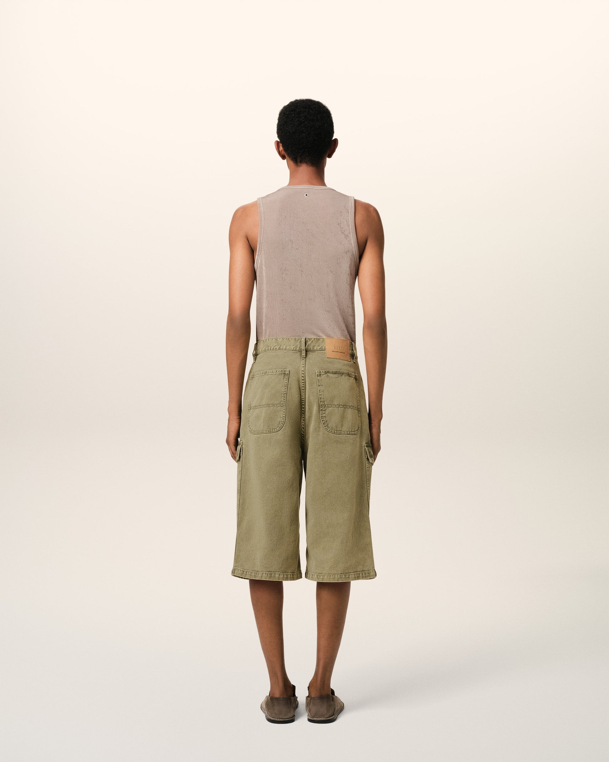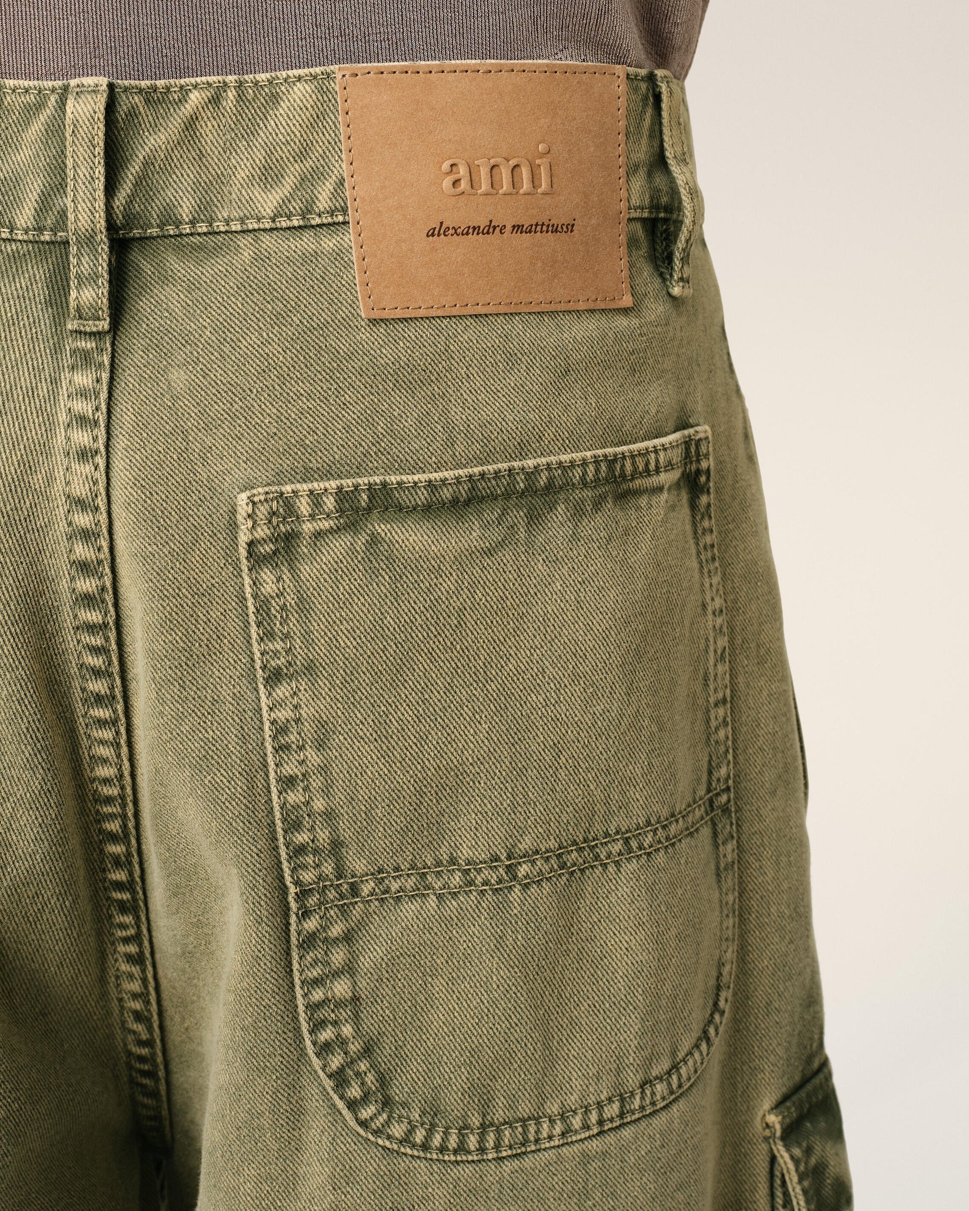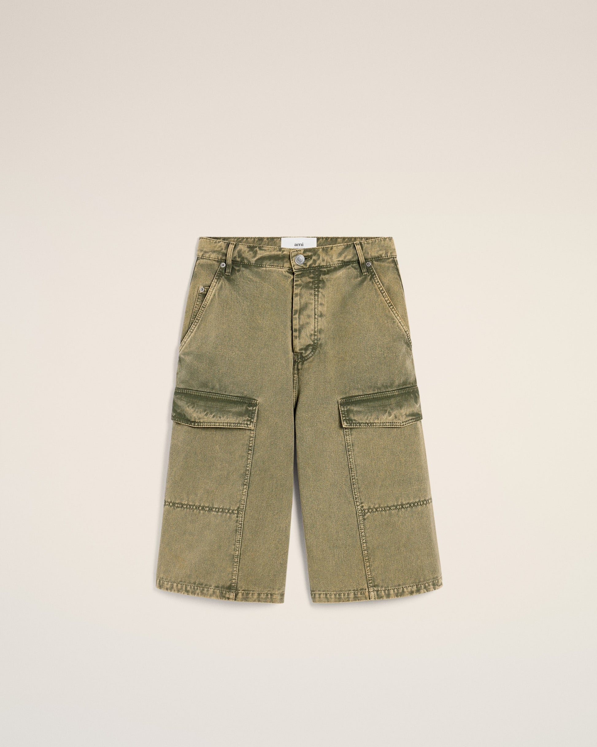 Cargo wide fit bermuda shorts in washed colored cotton twill. Very large fit 35 cm bottom leg width (size 30) Classic waist Very large leg Flap pockets with invisible snap buttons Buttoned fly Denim metal rivets and buttons in nickel color "ami alexandre mattiussi" patch on the back Tonal topstitches Made in Portugal (with love) REF: HSO406.DE0064.375
