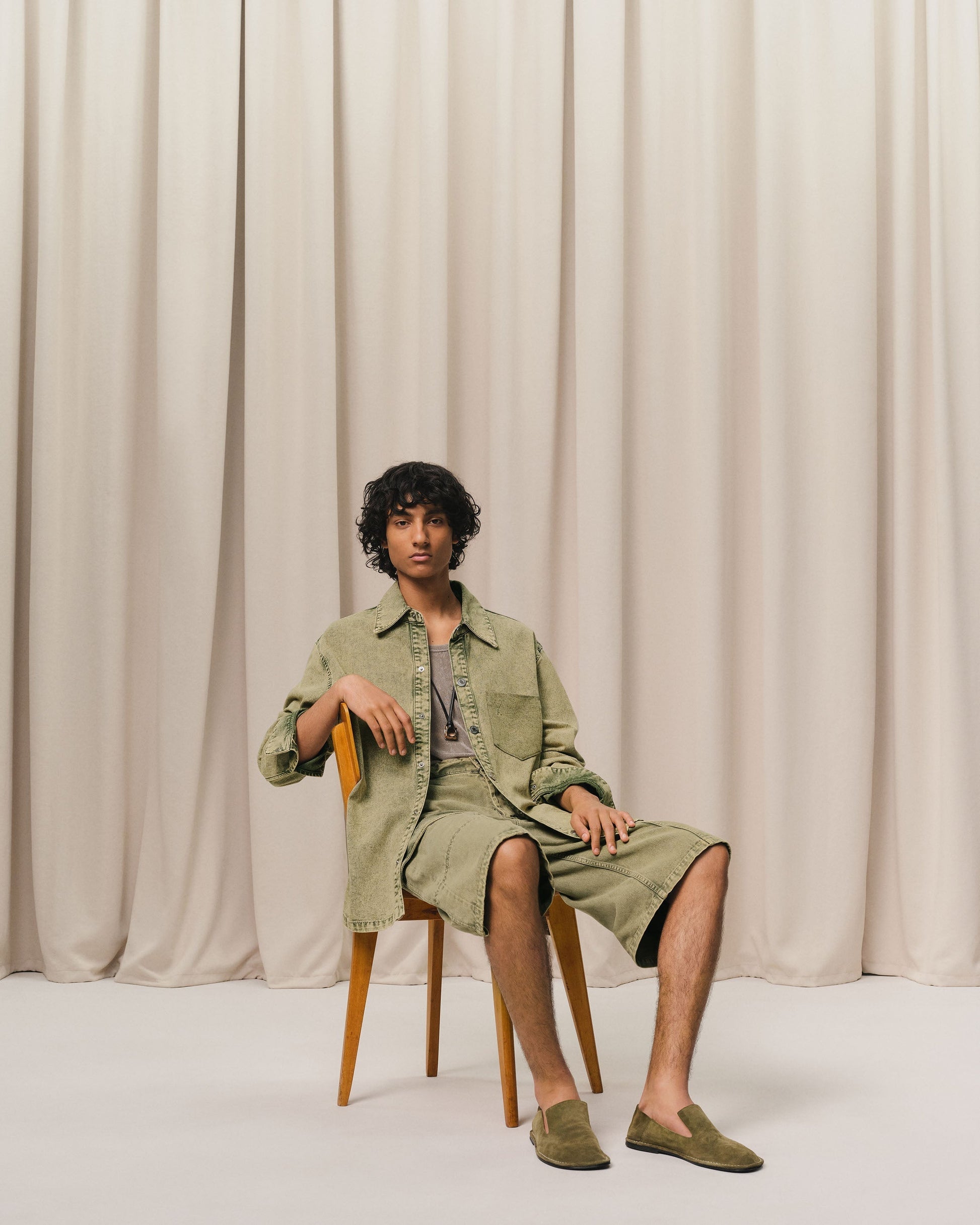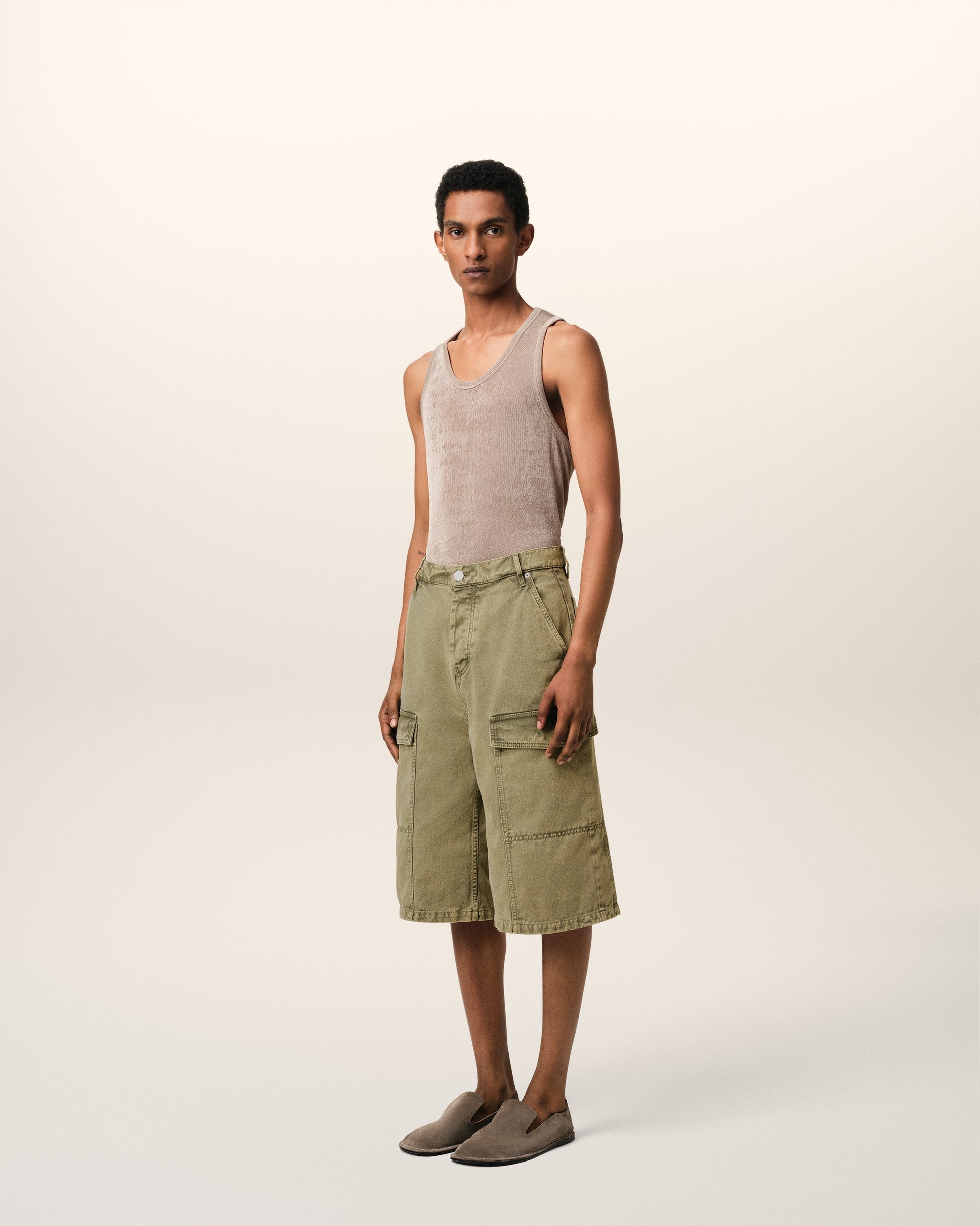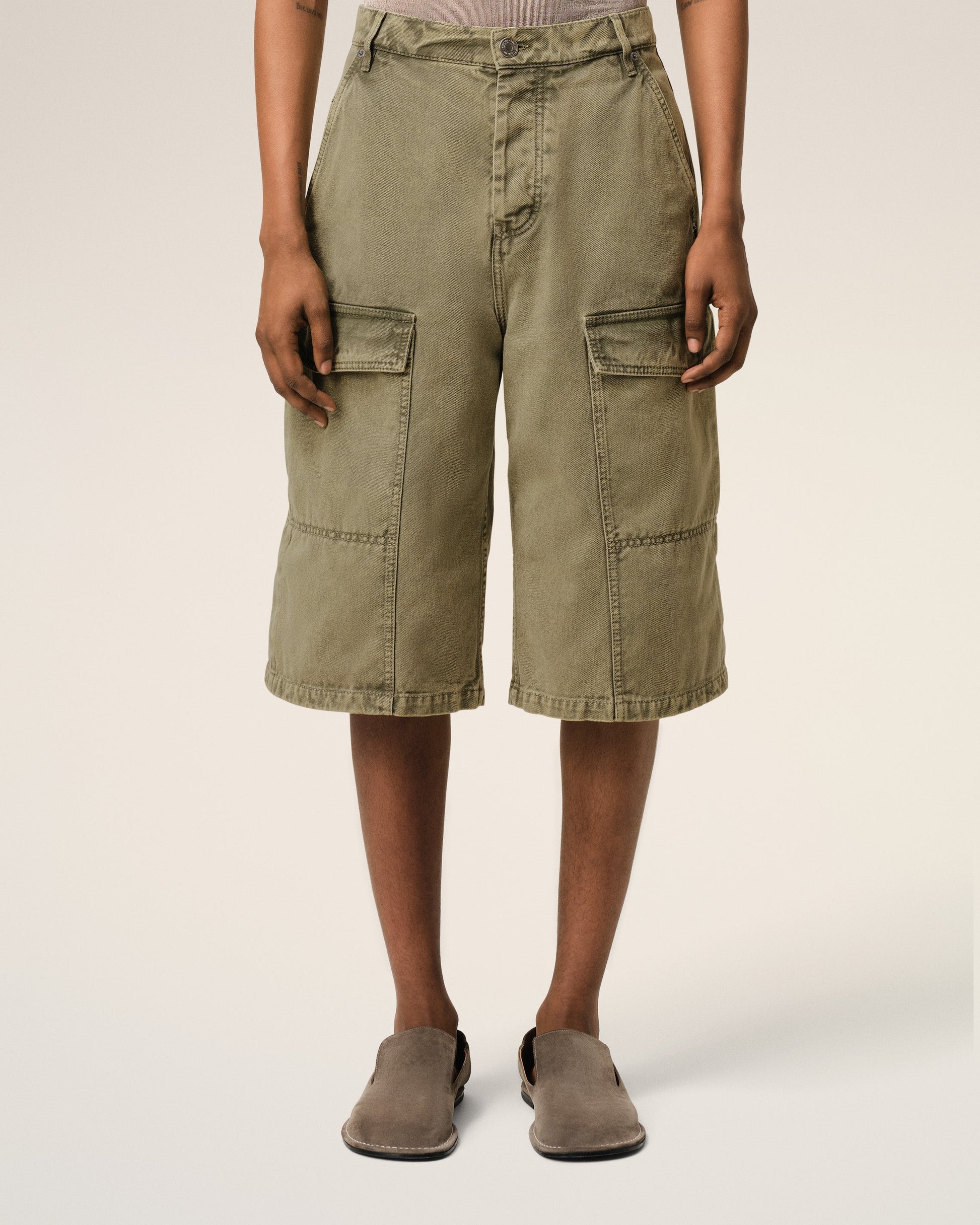 Cargo wide fit bermuda shorts in washed colored cotton twill. Very large fit 35 cm bottom leg width (size 30) Classic waist Very large leg Flap pockets with invisible snap buttons Buttoned fly Denim metal rivets and buttons in nickel color "ami alexandre mattiussi" patch on the back Tonal topstitches Made in Portugal (with love) REF: HSO406.DE0064.375