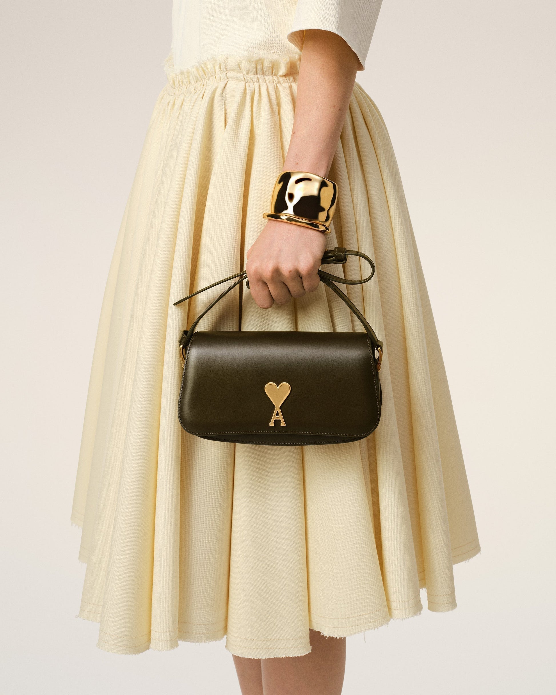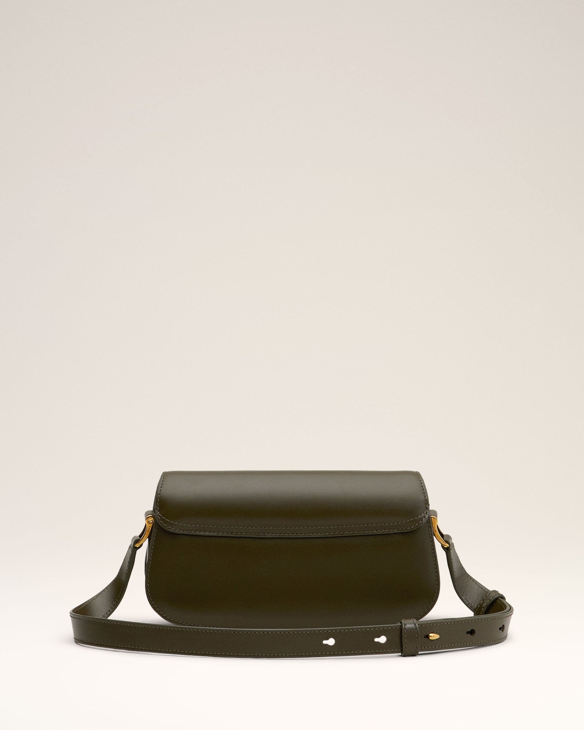 Paris Paris shoulder bag in smooth box leather. Suede lambskin lining Ami de Coeur stud One central compartment with a patched pocket and one front compartment Adjustable leather strap, shoulder carry Magnetic flap closure Metal hardware in vibrated brass color Size: 21x11x6 cm Made in Morocco (with love) REF: ULL018.AL0104.377