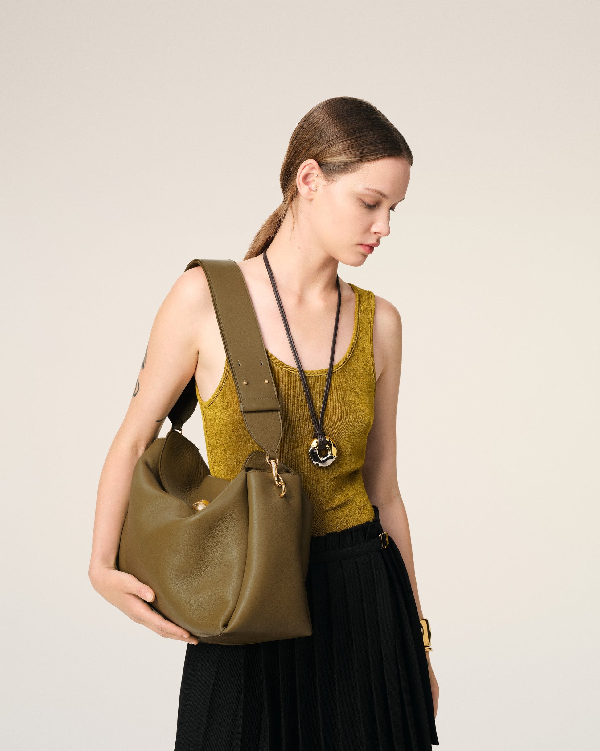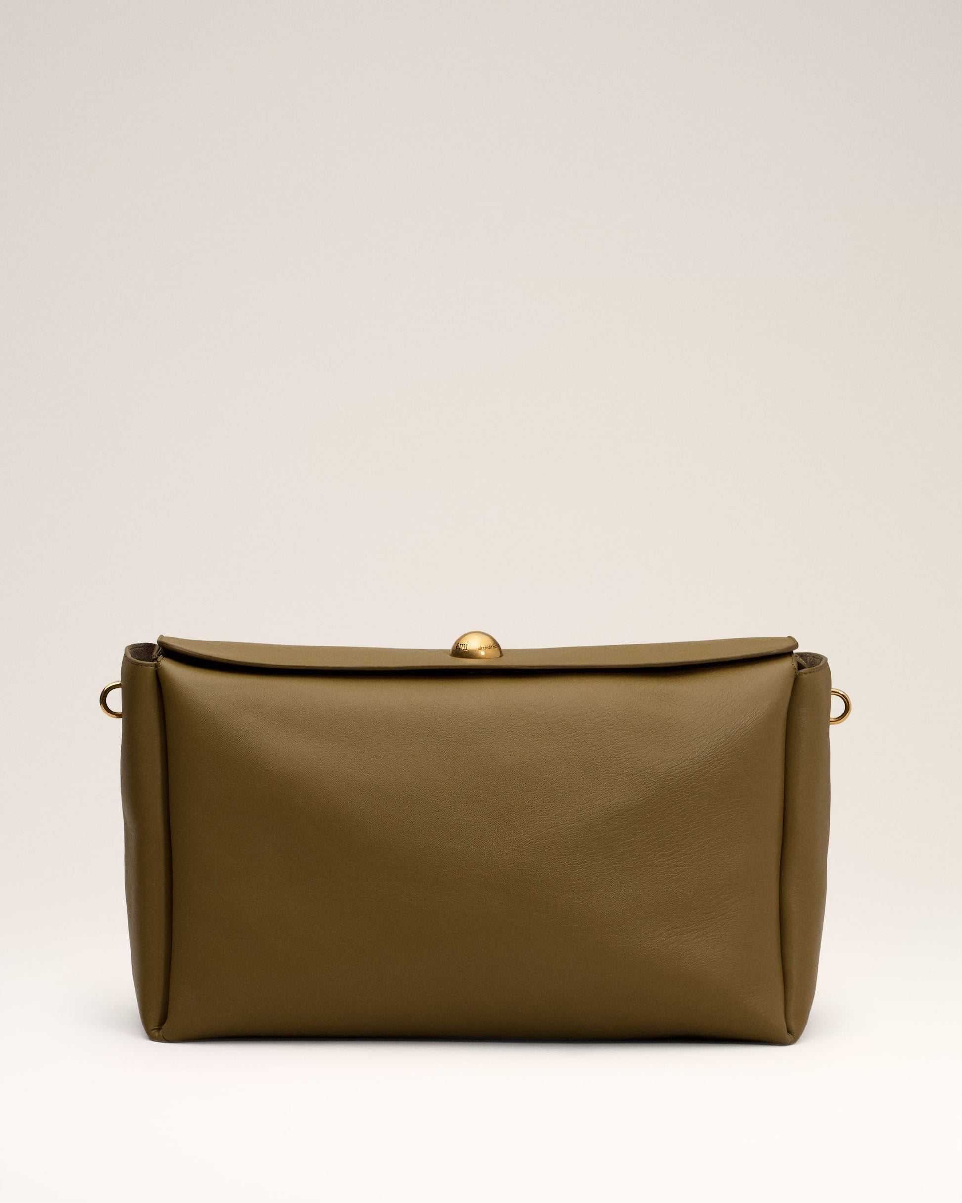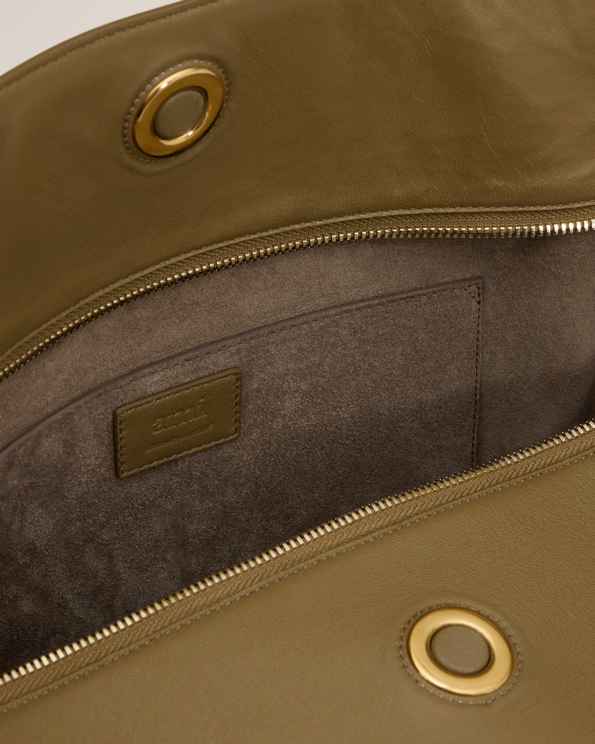 Large Carrousel bag in smooth leather. Suede leather lining Domed metal stud with engraved "ami alexandre mattiussi" logo One main compartment with an inside patched pocket Adjustable leather strap, crossbody or shoulder carry Magnetic flap closure Metal hardware in vibrated brass color Size: 39x24x16 cm Made in Spain (with love) REF: ULL028.AL0103.350