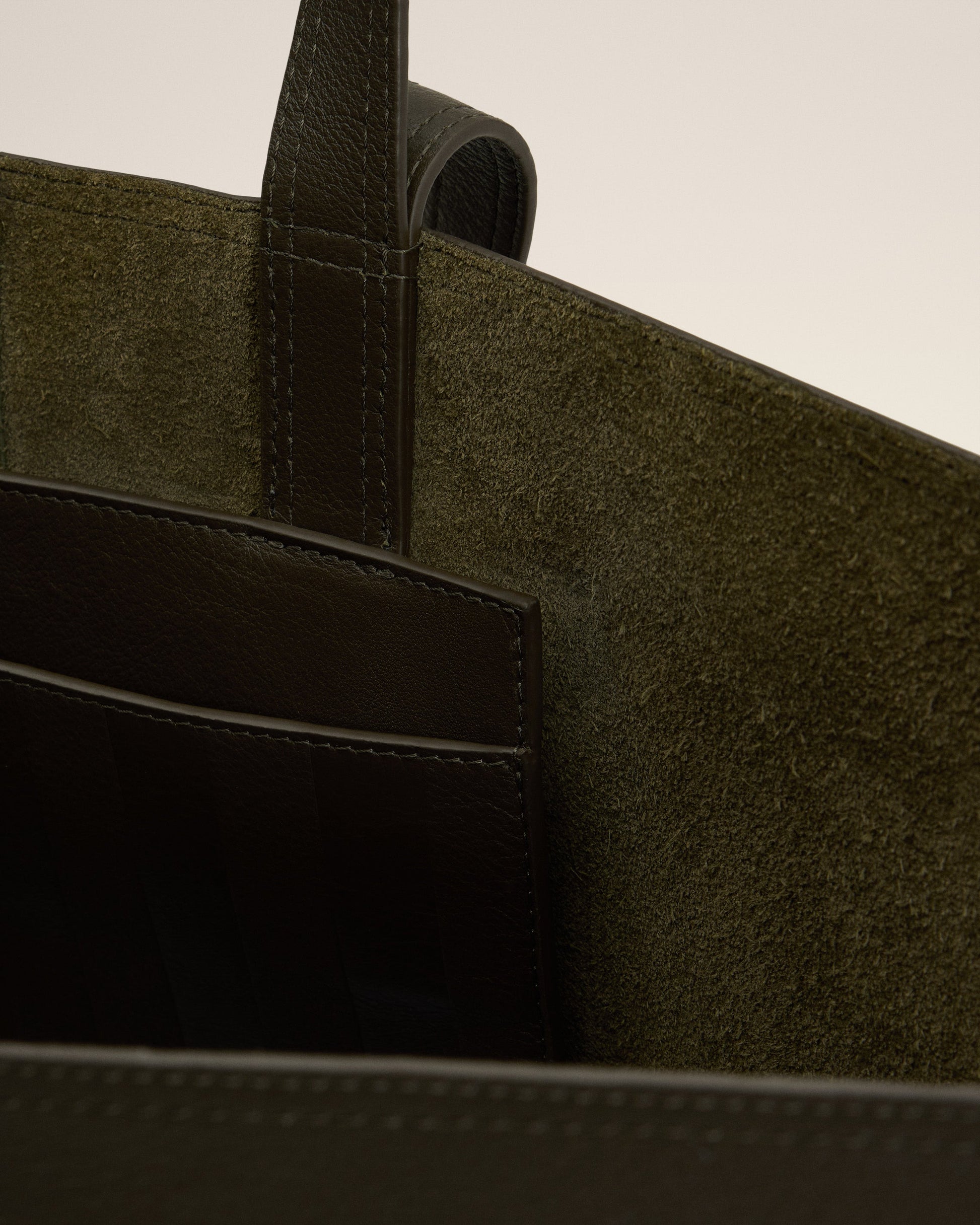 Midi tote bag in smooth leather. Signature stripes on the inside patched pocket and on the removable bottom Leather tie with a hook ring, fixed inside the bag Double handles, shoulder or hand carry Metal hardware in vibrated silver color Size: 35x30x18.5 cm, length at the top 59 cm Made in Spain (with love) REF: ULL025.AL0090.377