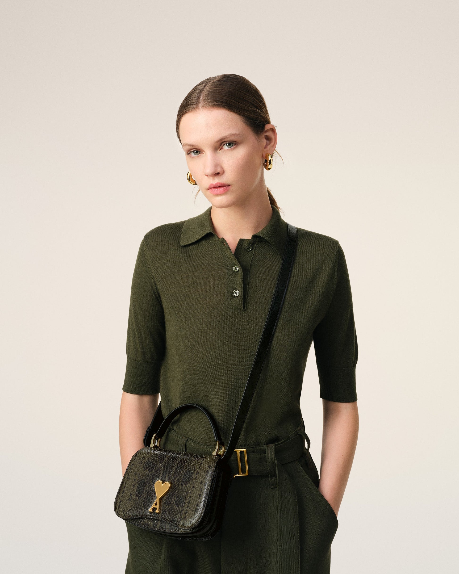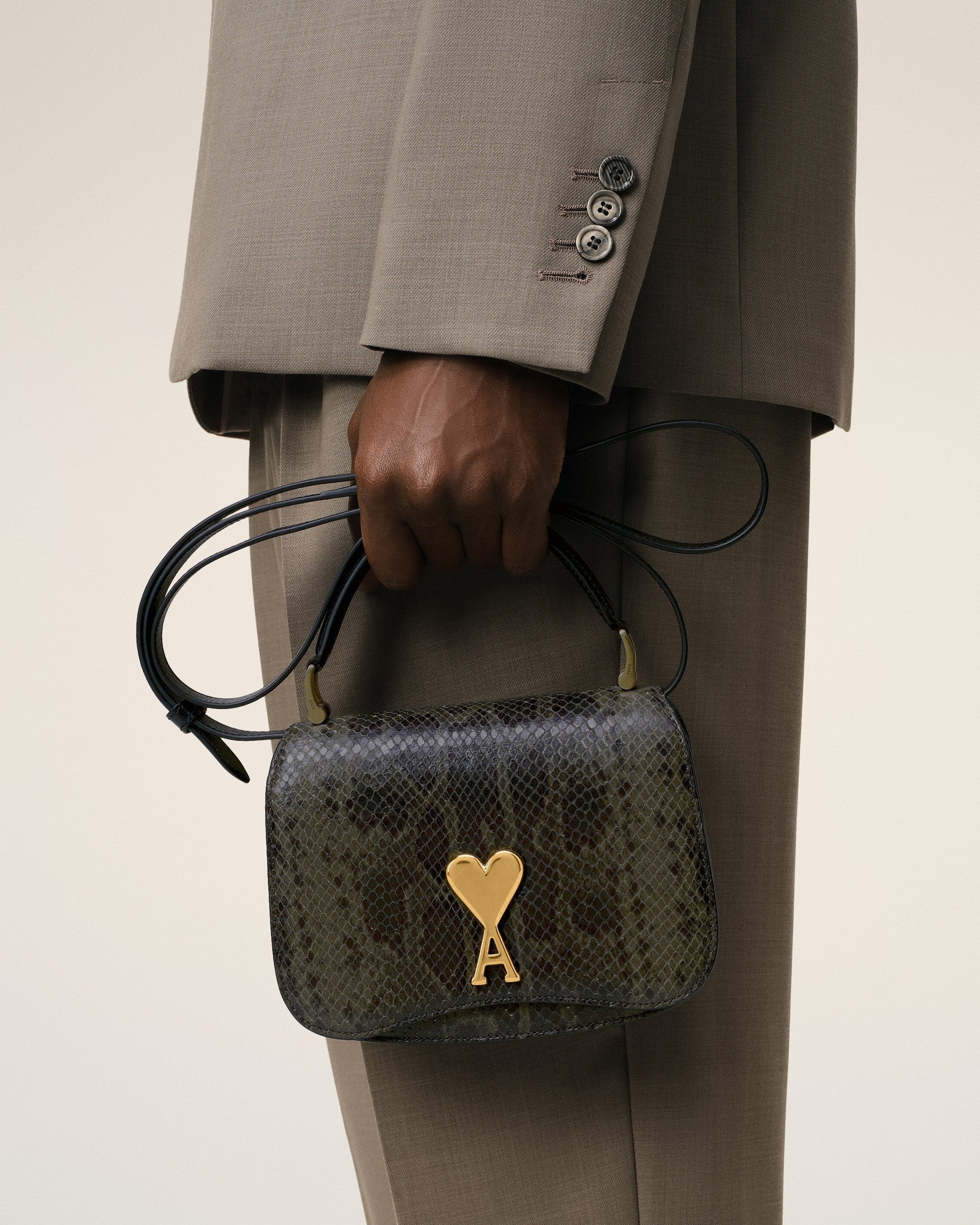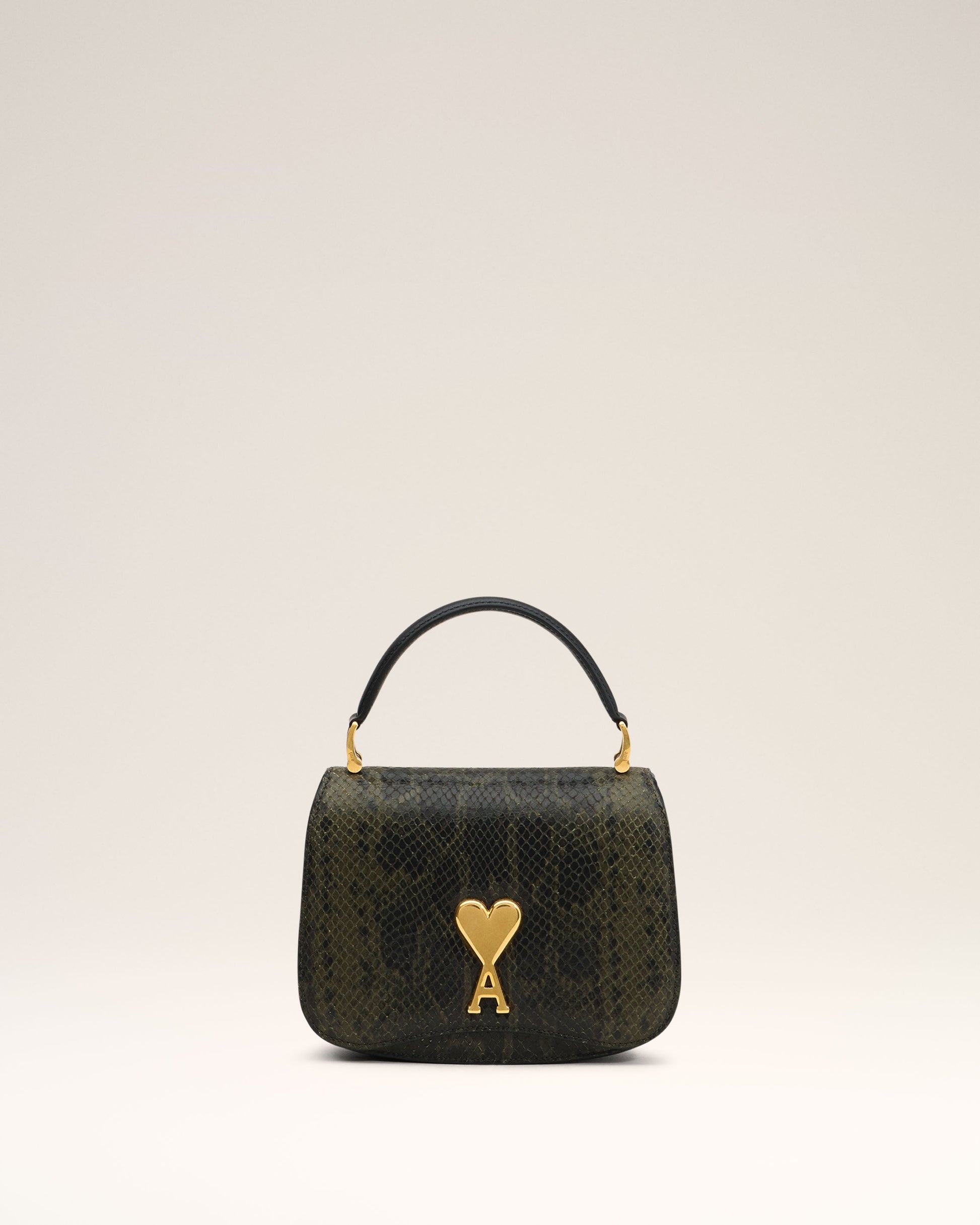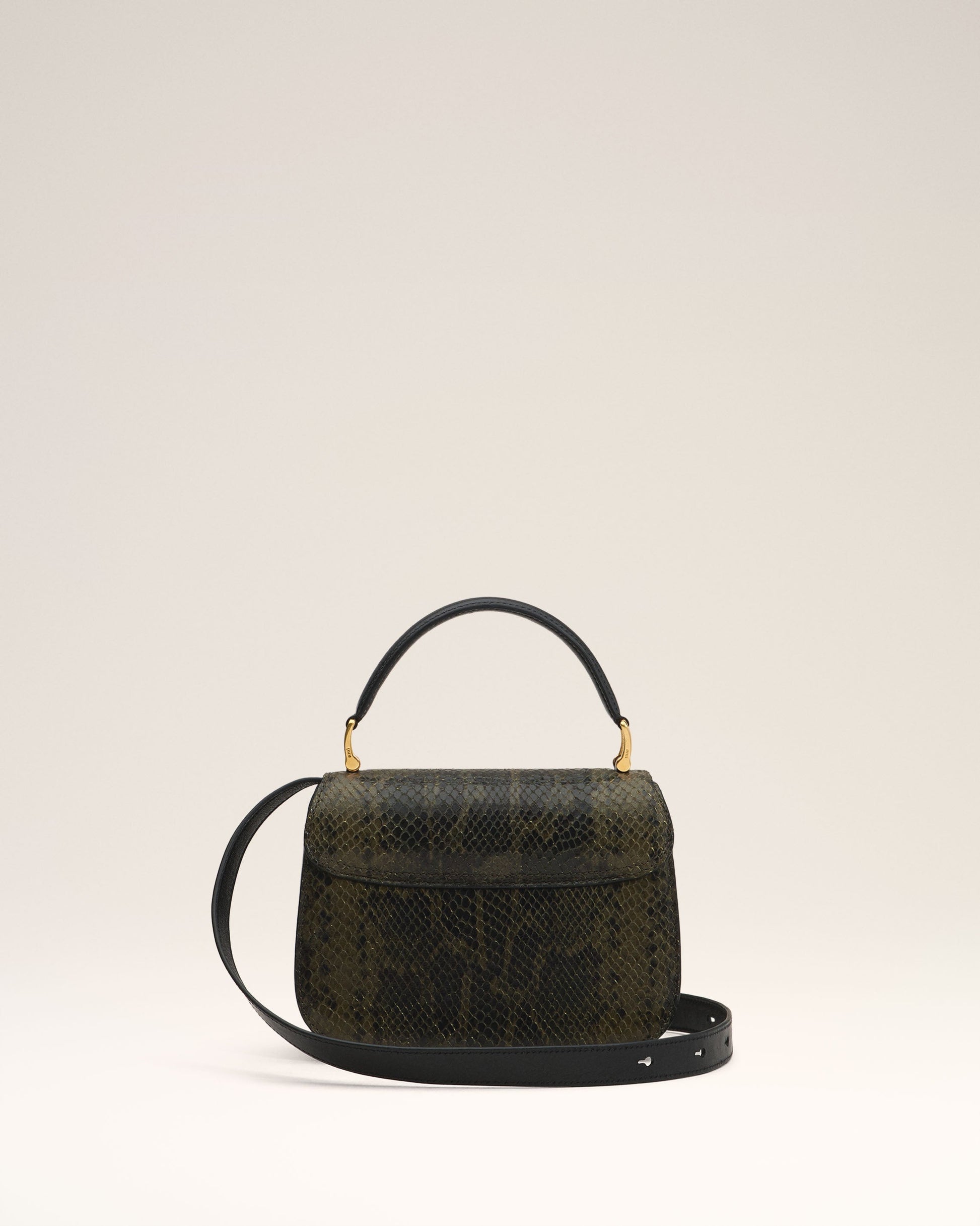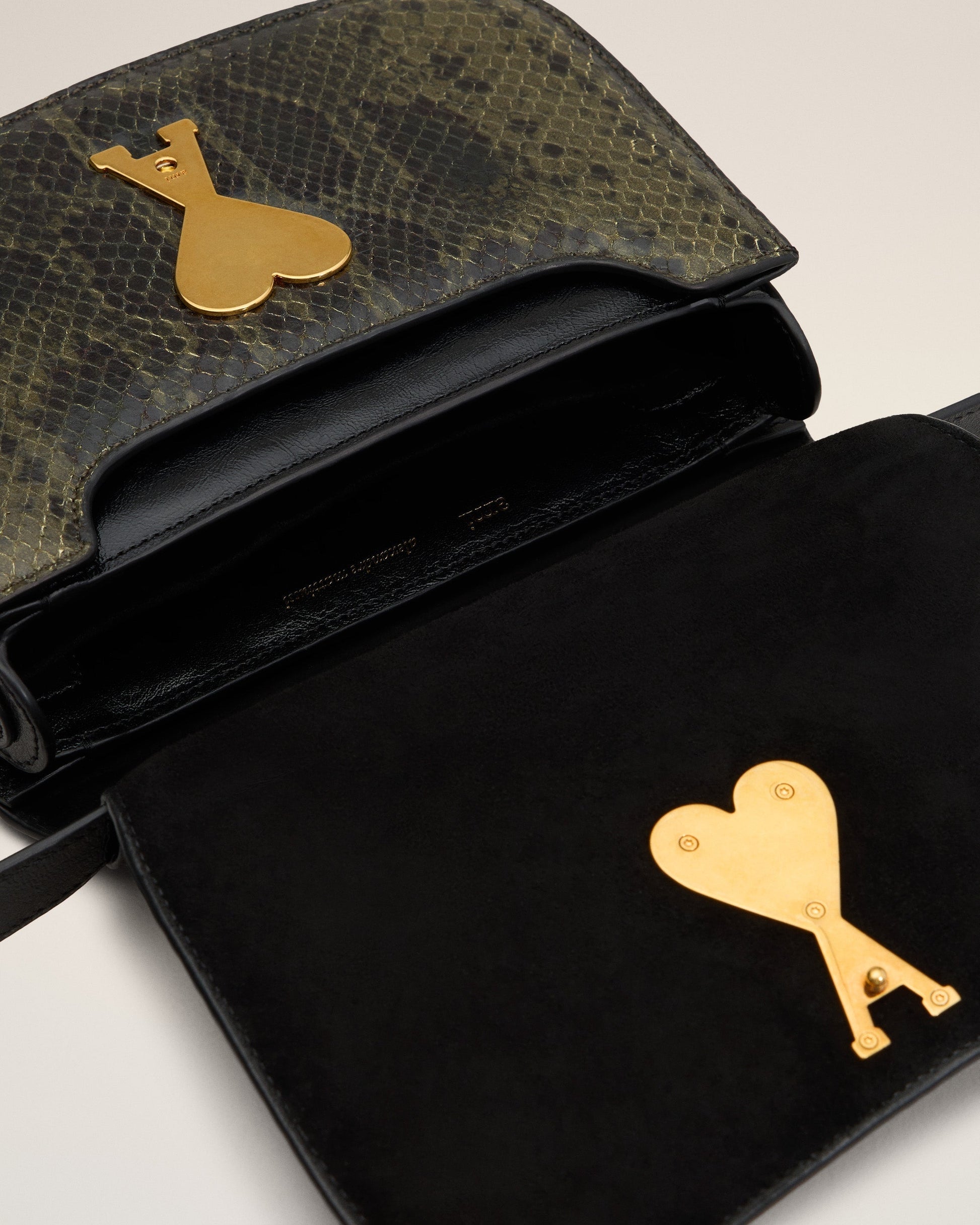 Top handle Paris Paris bag in embossed snake leather. Suede lambskin lining Ami de Coeur clasp One central compartment with a patched pocket and one front compartment Adjustable and removable leather strap, crossbody or hand carry Vibrated brass metal hardware Size: 19x13x4 cm Made in Morocco (with love) REF: ULL007.AL0106.377