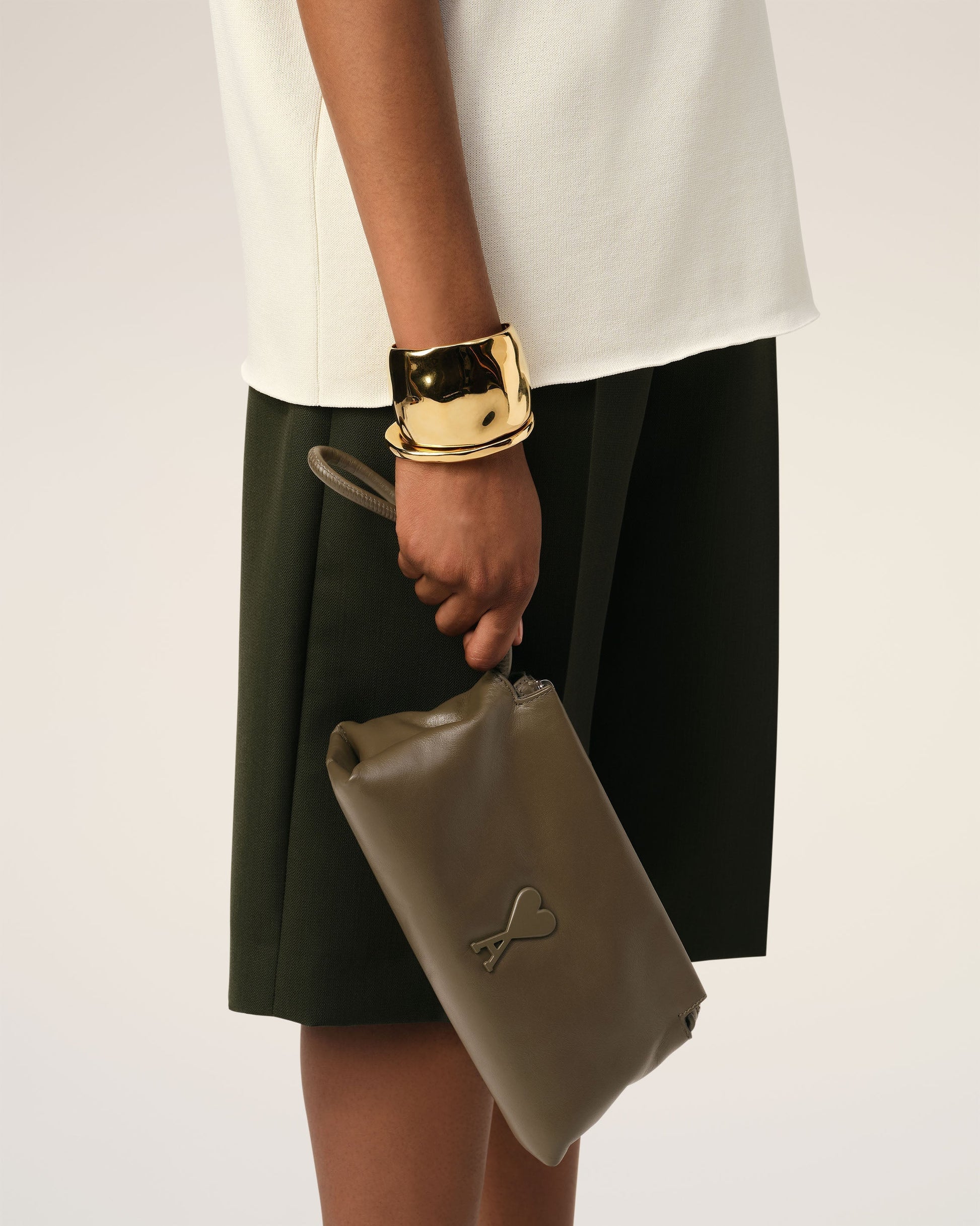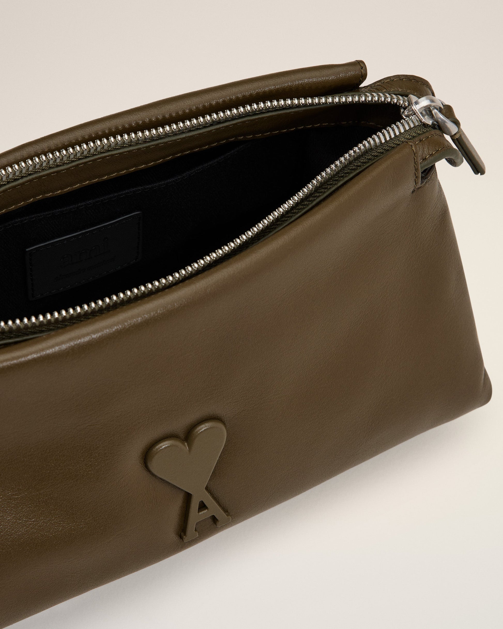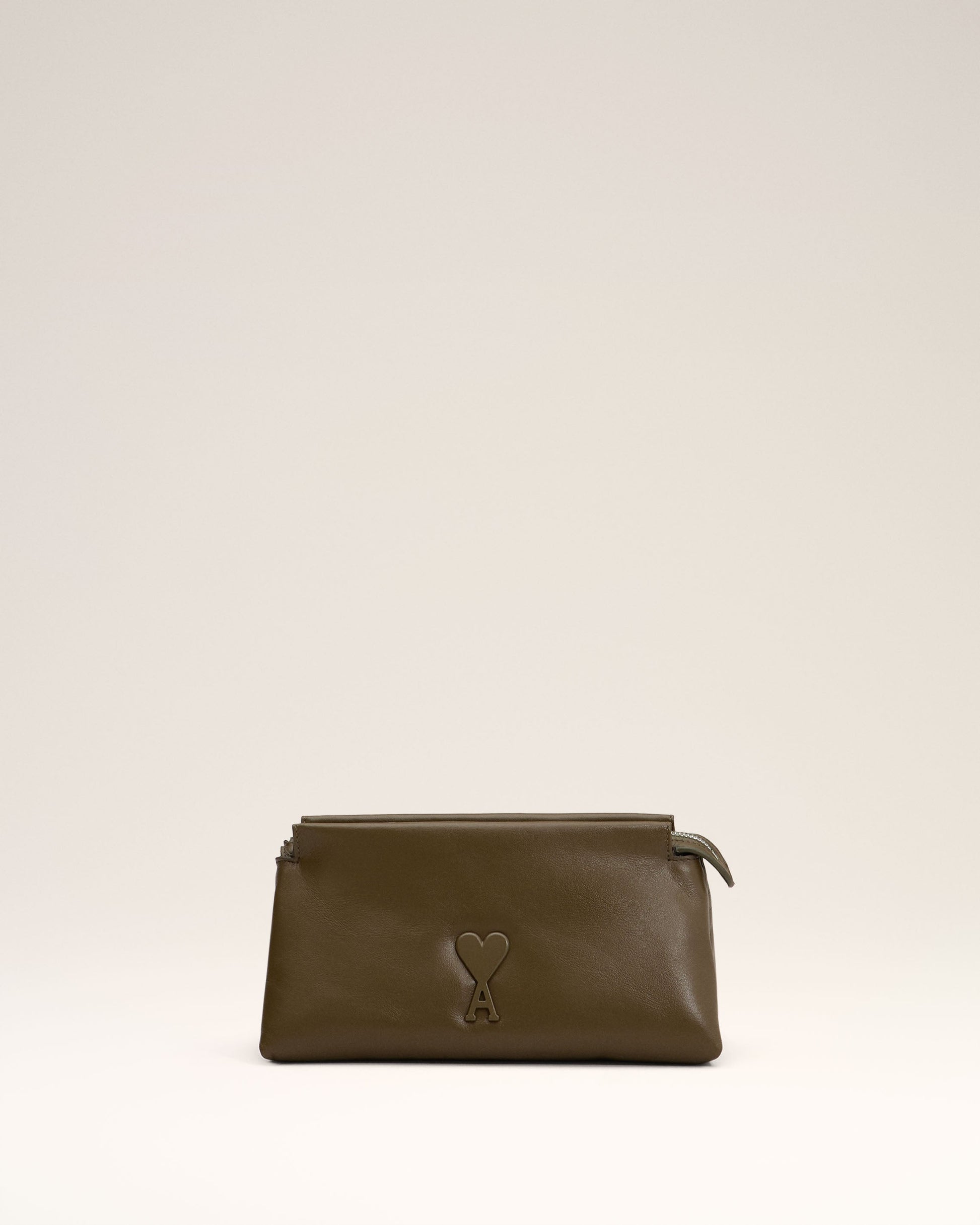 Voulez-Vous pouch in smooth leather. Herringbone cotton canvas lining Ami de Coeur stud One central zipped compartment and one inside patched pocket Leather strap, drop of 16 cm Metal hardware in vibrated silver color Size: 22x12x11.5 cm Made in Morocco (with love) REF: ULL700.AL0052.350