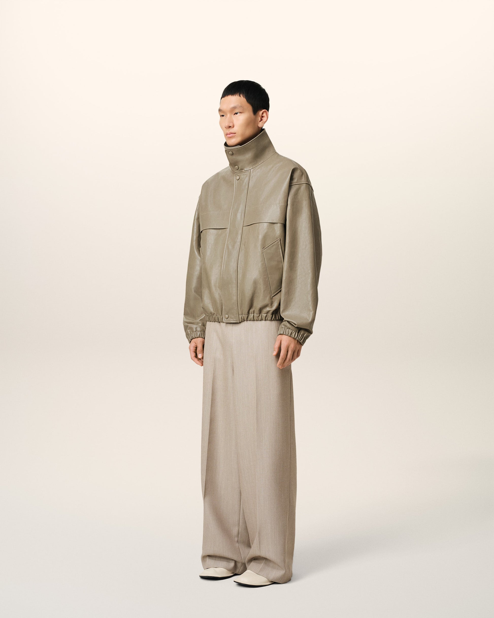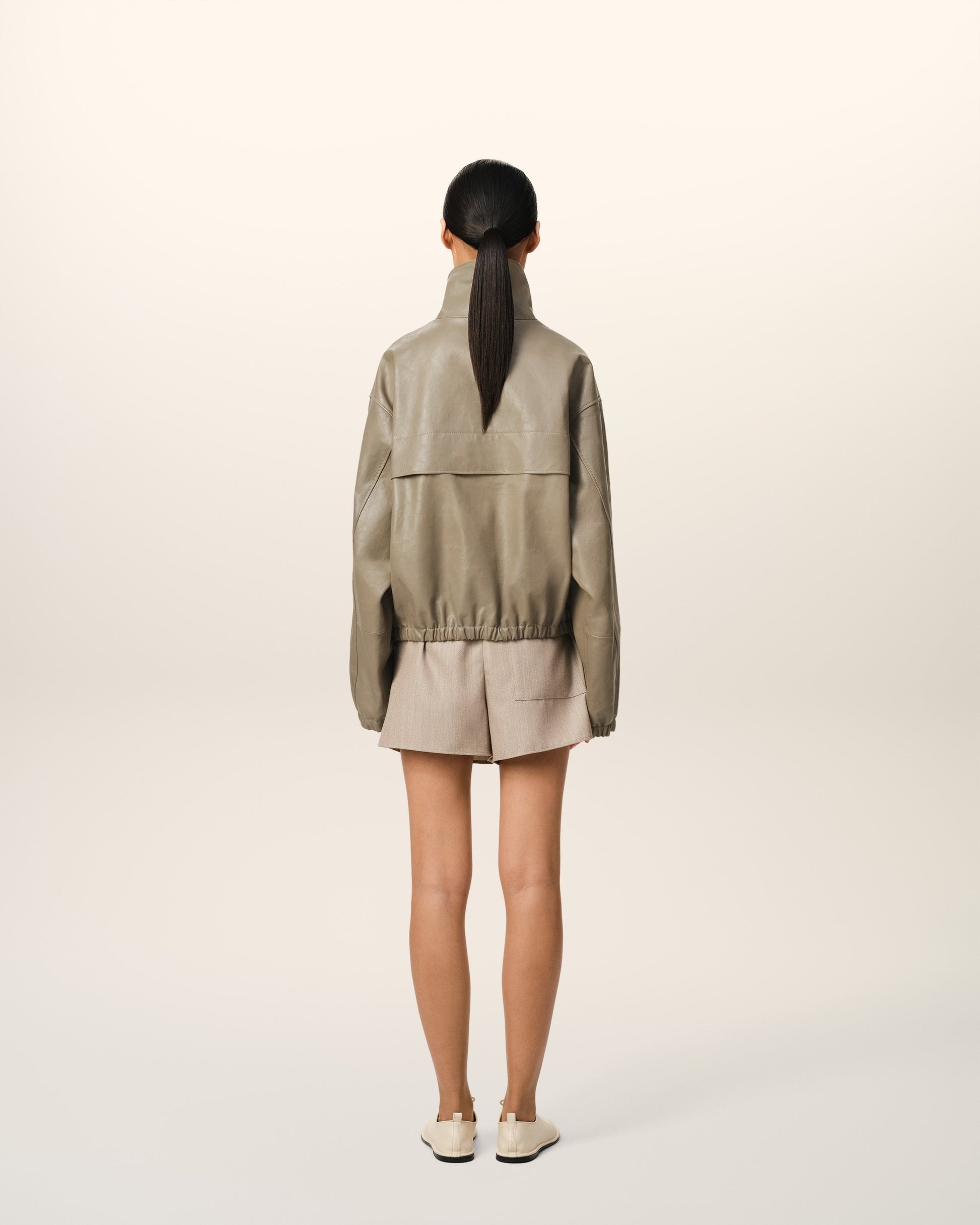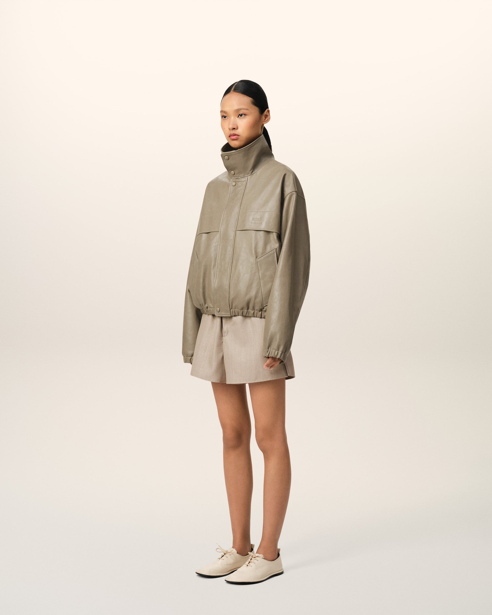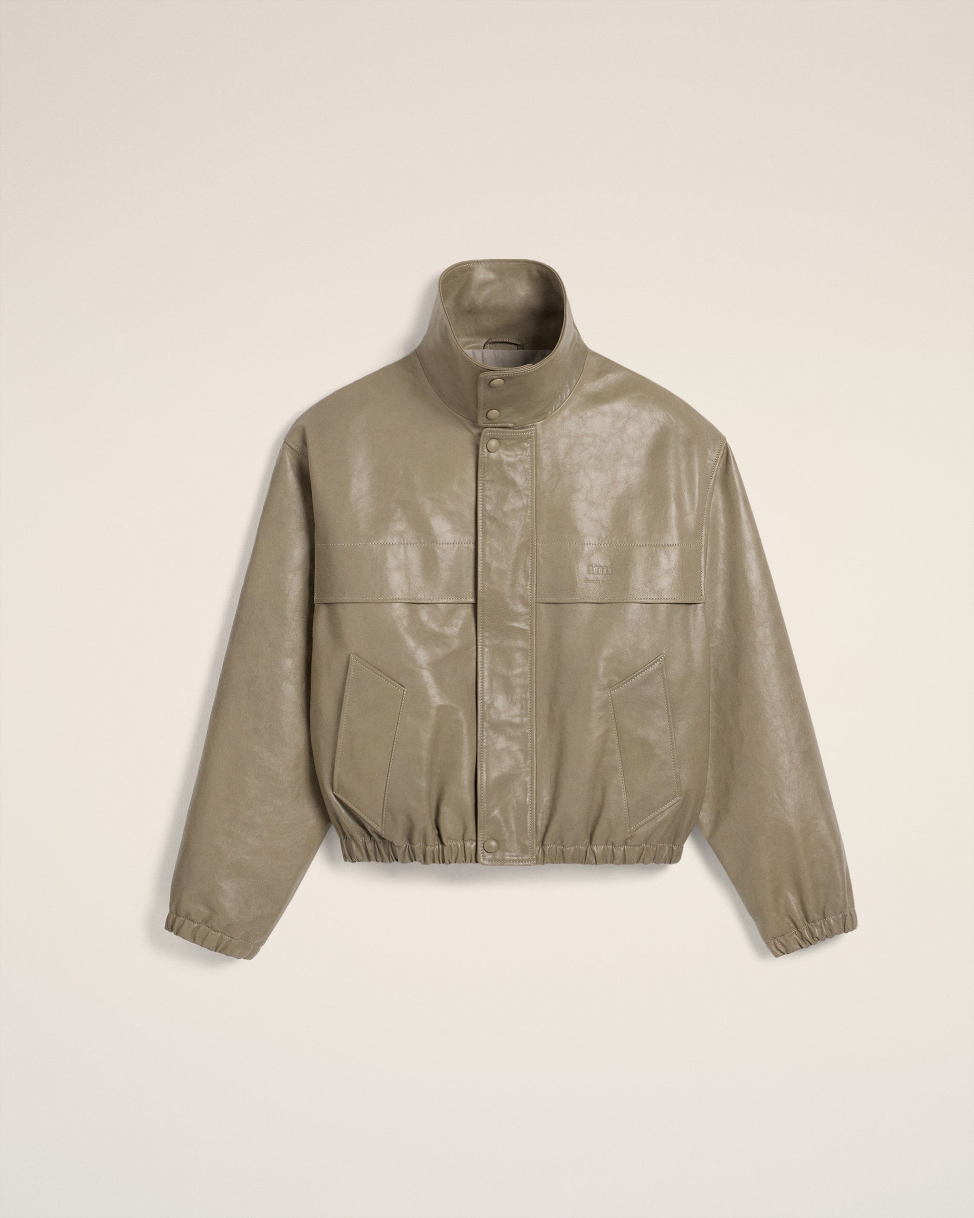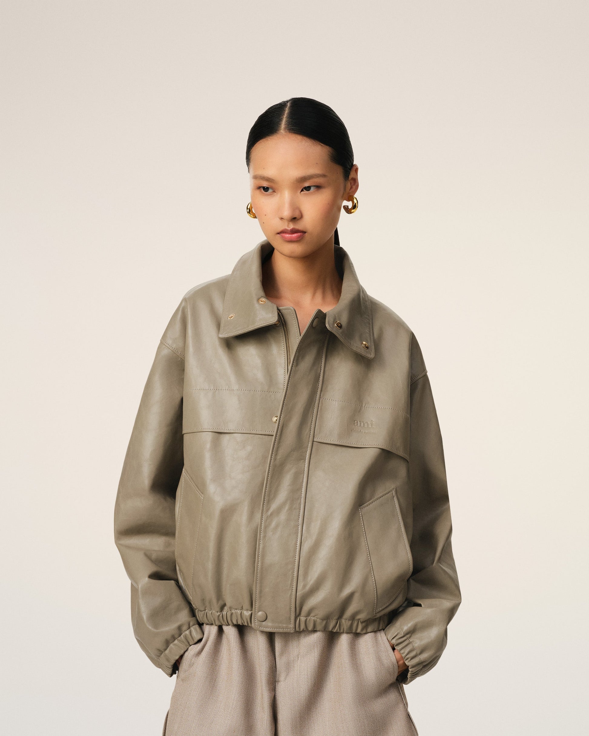 Jacket in paper effect lamb leather. Unisex product "Ami alexandre mattiussi" debossed logo on chest 65 cm center back length (size M) 58 cm center back length (size XS) Fully lined Silver metal double zipper with "Ami" and Ami de Coeur engraved pullers Side raglan pockets with invisible snap buttons engraved "Ami Paris" Made in Turkey (with love) REF: UJK146.LH0051.375