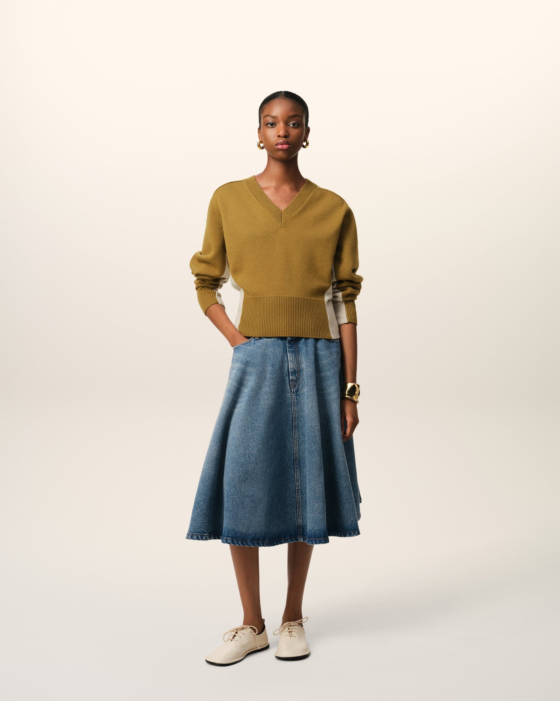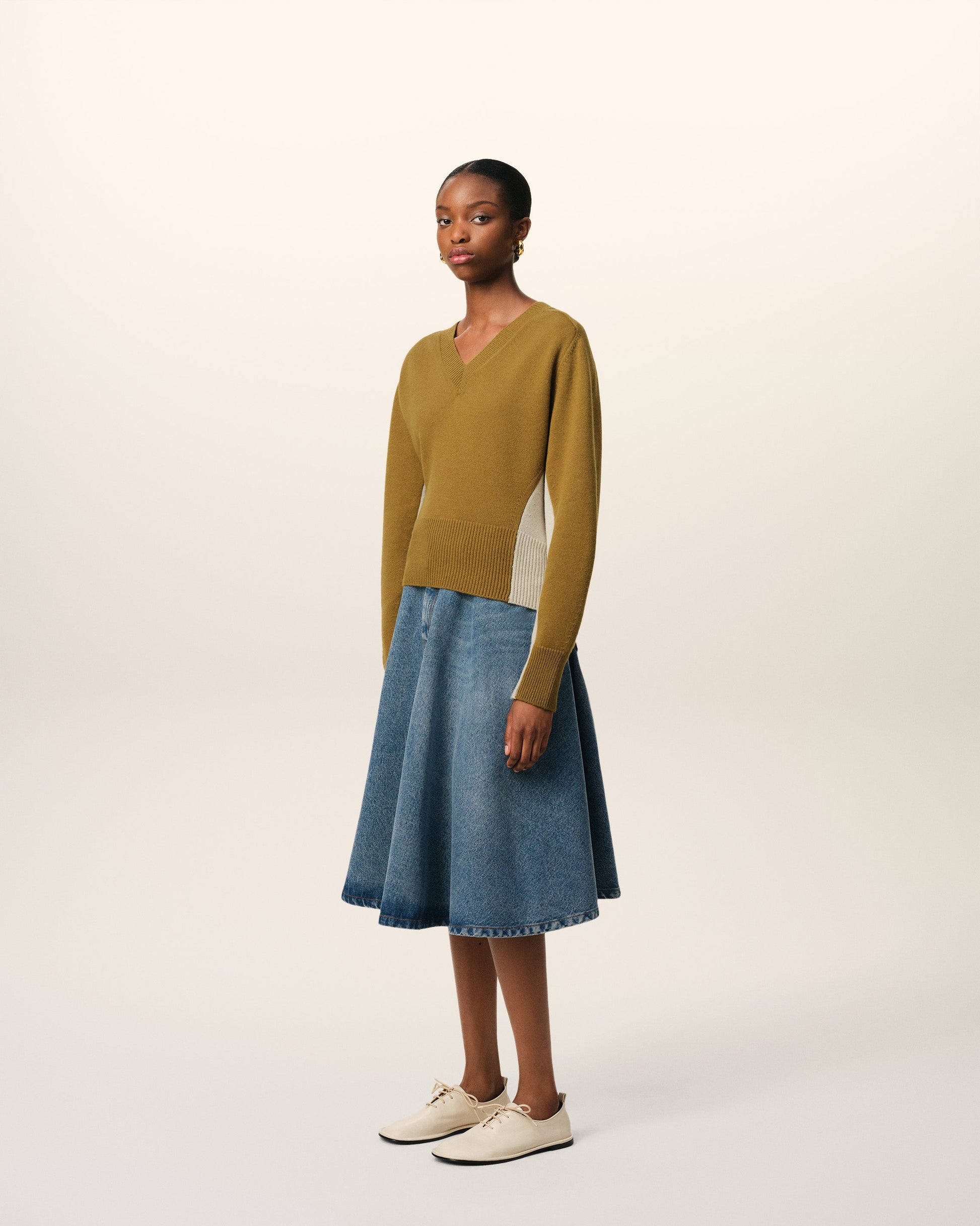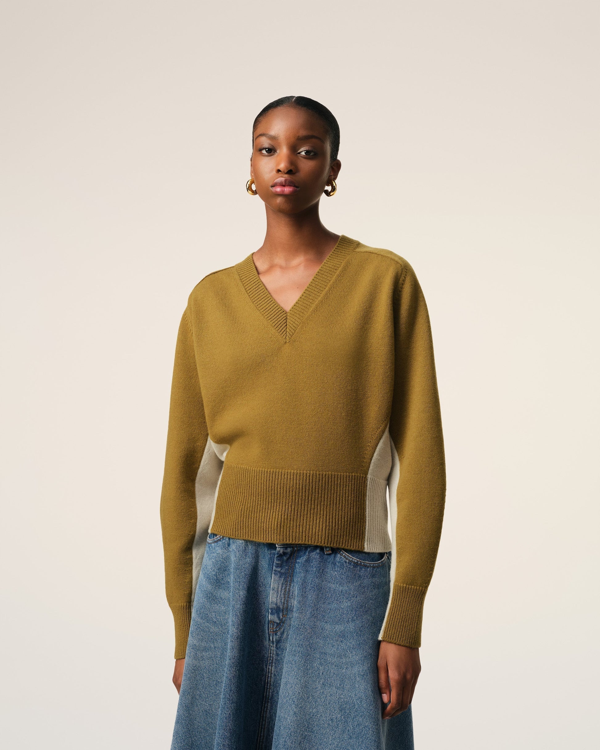 Sweater in bicolor wool and cashmere knit. Jersey stitch Tonal Ami de Coeur embossed embroidery on the back under collar 58 cm center back length (size S) Made in Italy (with love) REF: FKS277.KN0077.3743