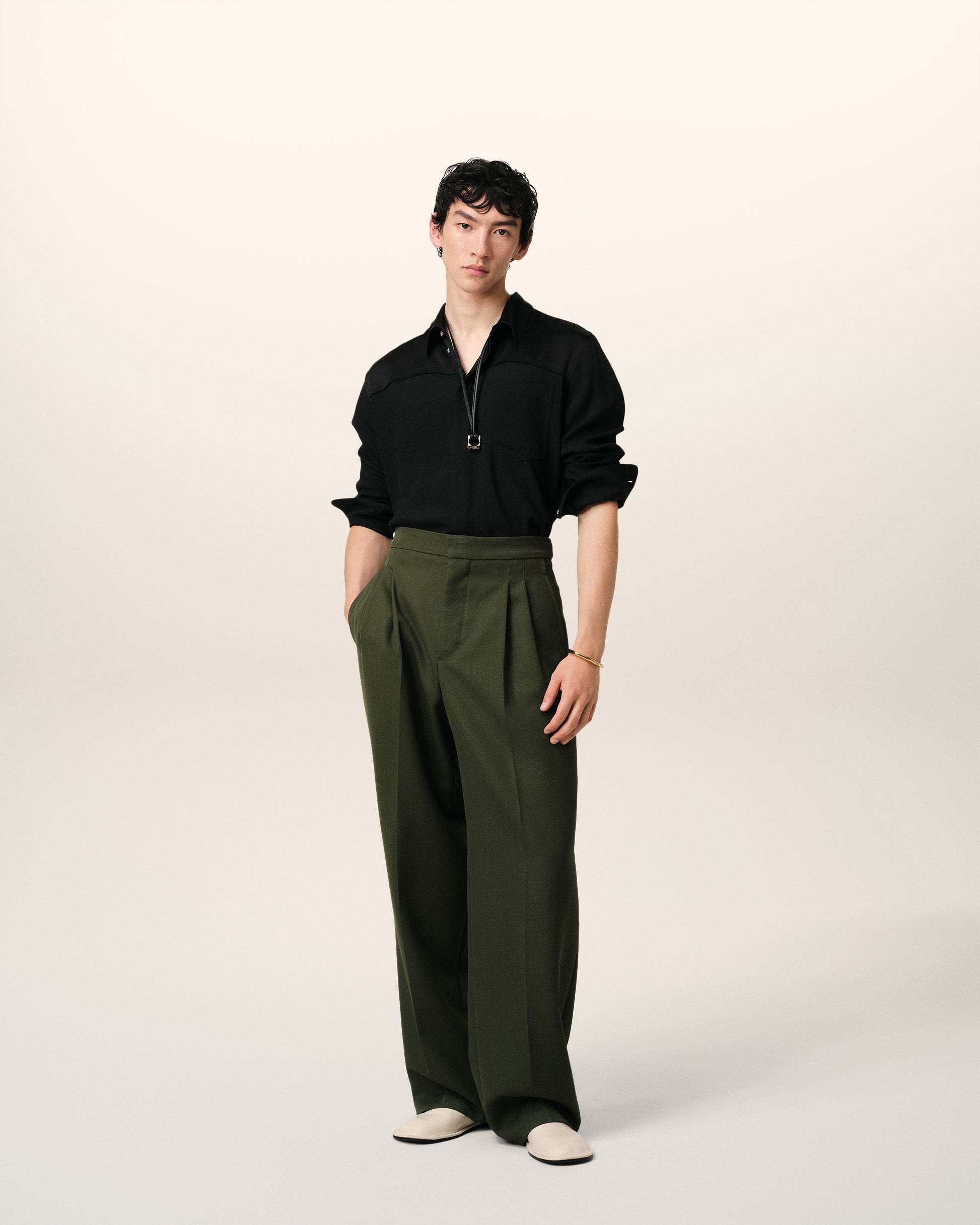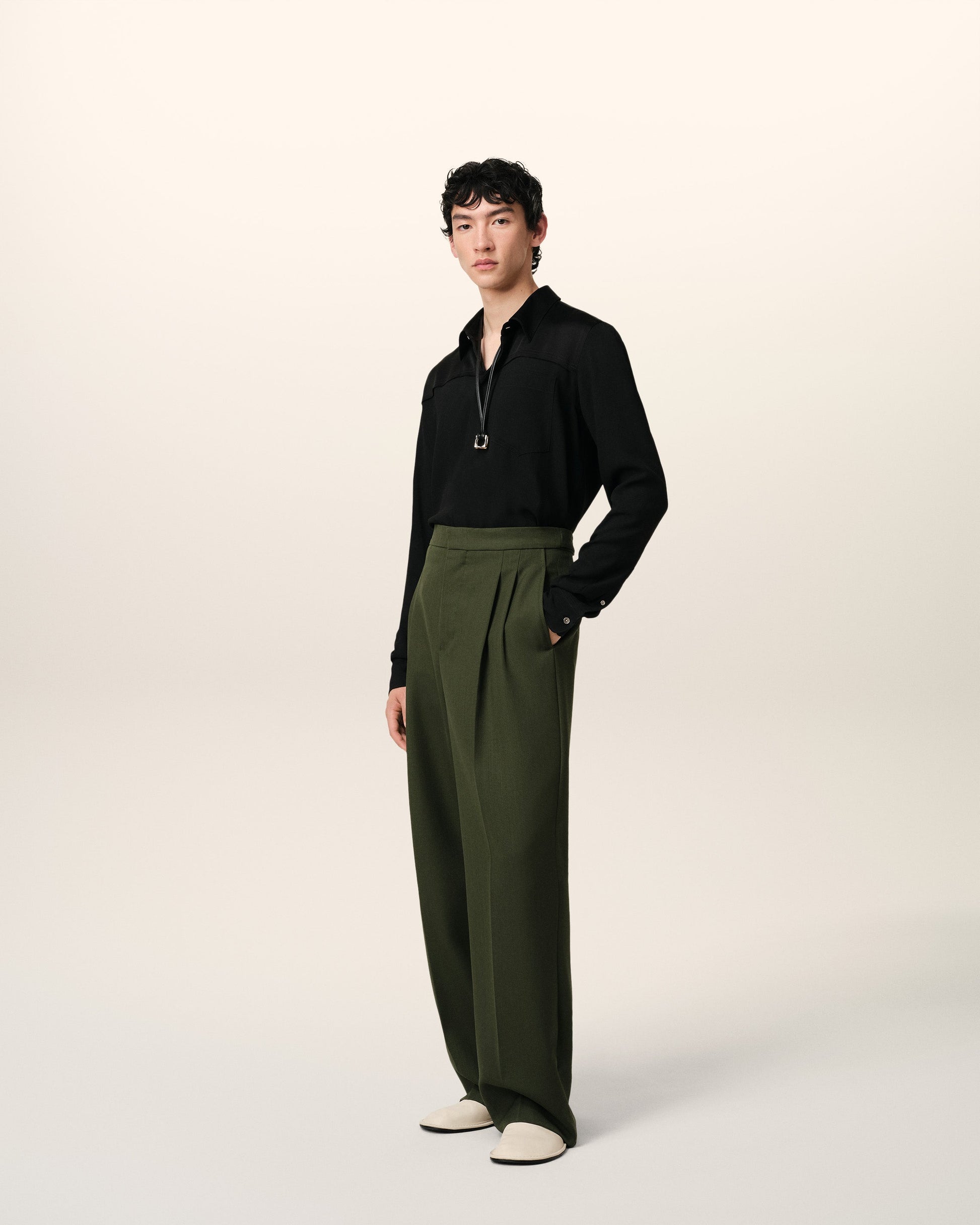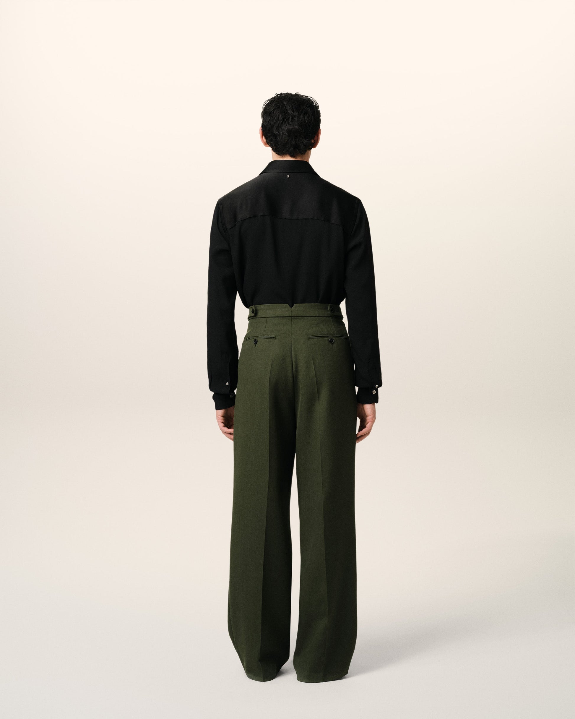 Large fit trousers in light wool canvas. Wide fit 28 cm bottom leg width (size 40) Front lining to knees Front pleats Buttoned fly "ami" waistband V detail on the back Buttoned back pockets Buttoned adjustable tabs on side Horn buttons Made in Romania (with love) REF: HTR429.WV0068.376