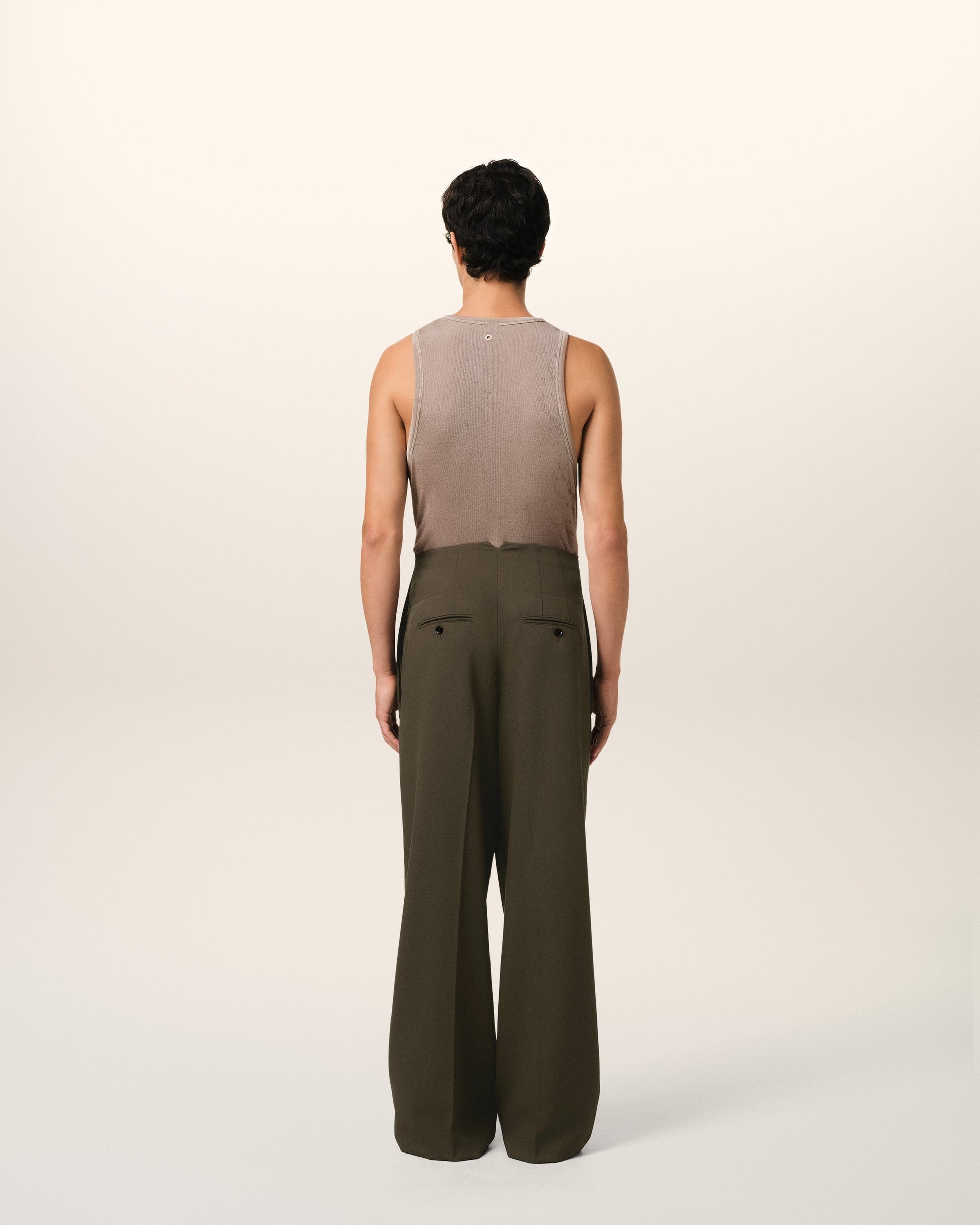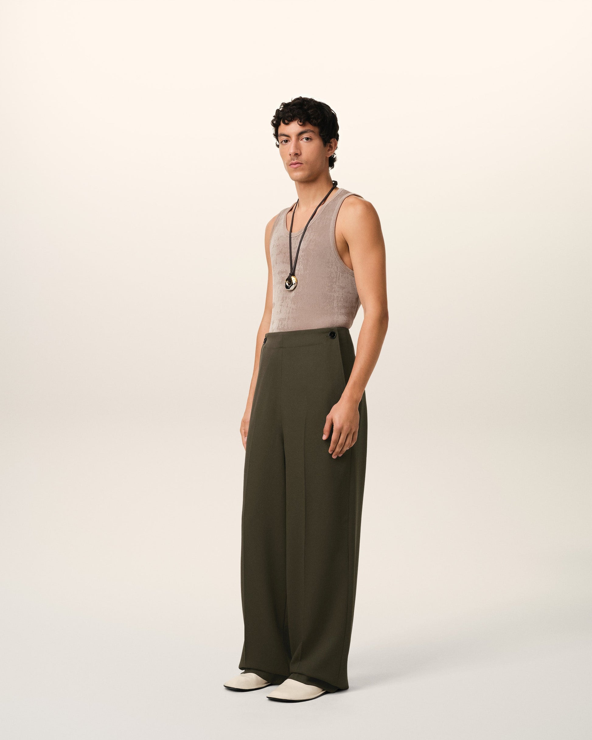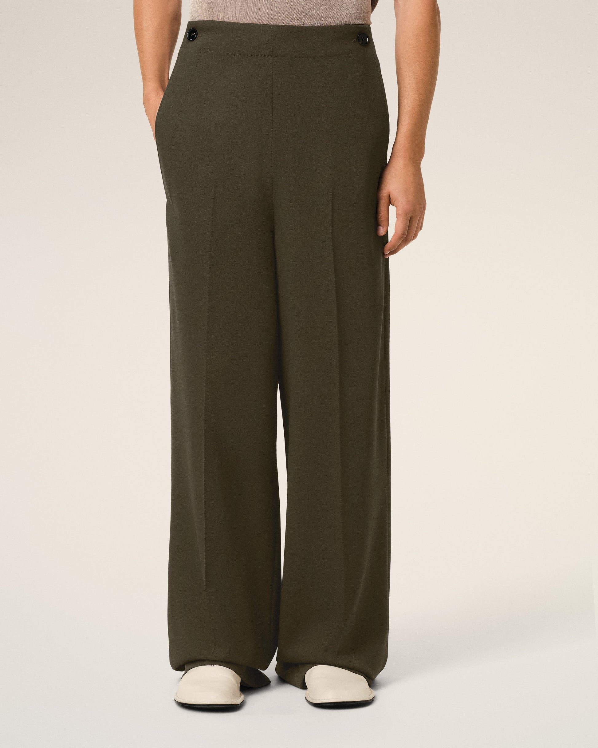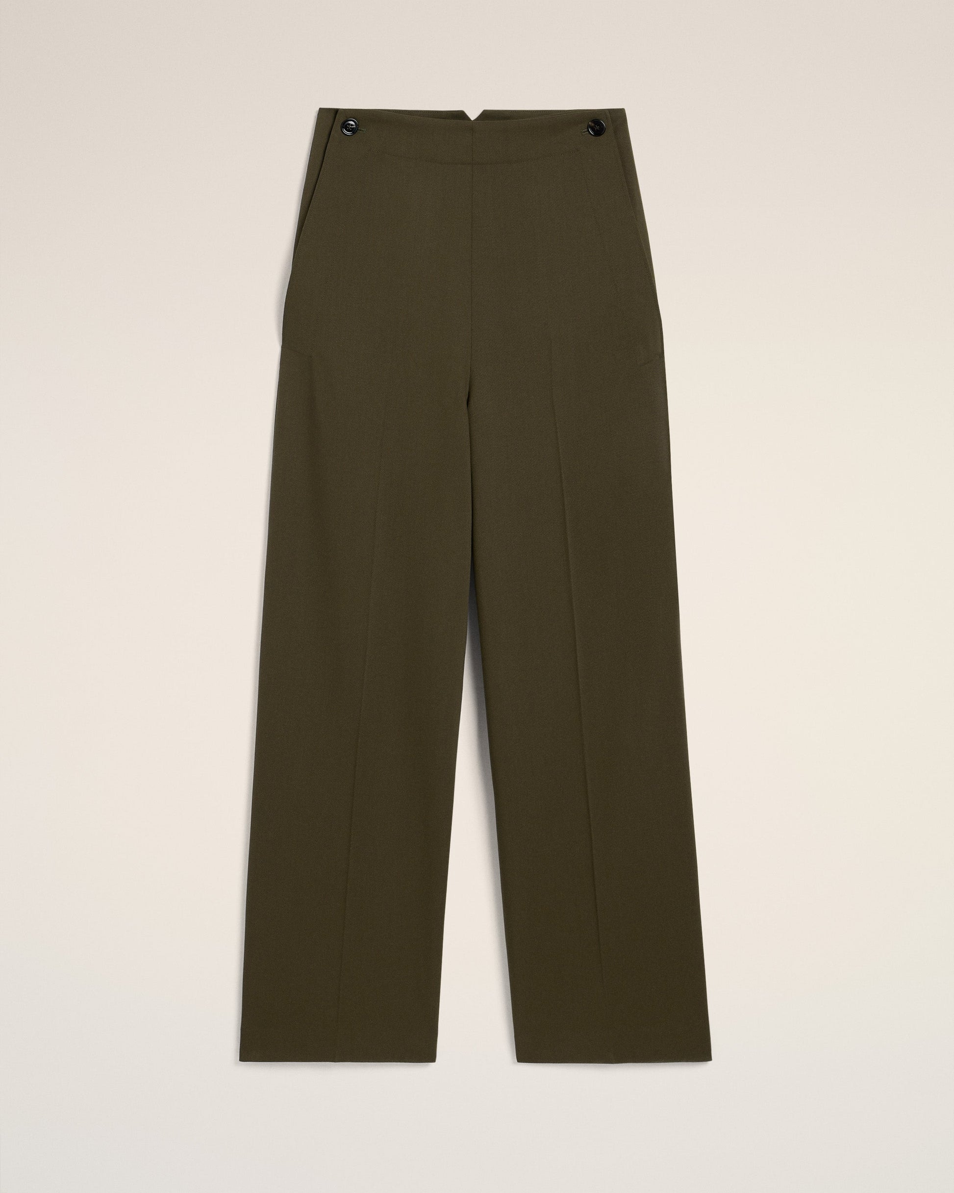 Sailor trousers in wool gabardine. Wide fit 31 cm bottom leg width (size 40) Front lining until knees Drop-front closure with buttons Side pockets Back piping pockets Horn buttons Made in Moldavia (with love) REF: HTR430.WV0067.377