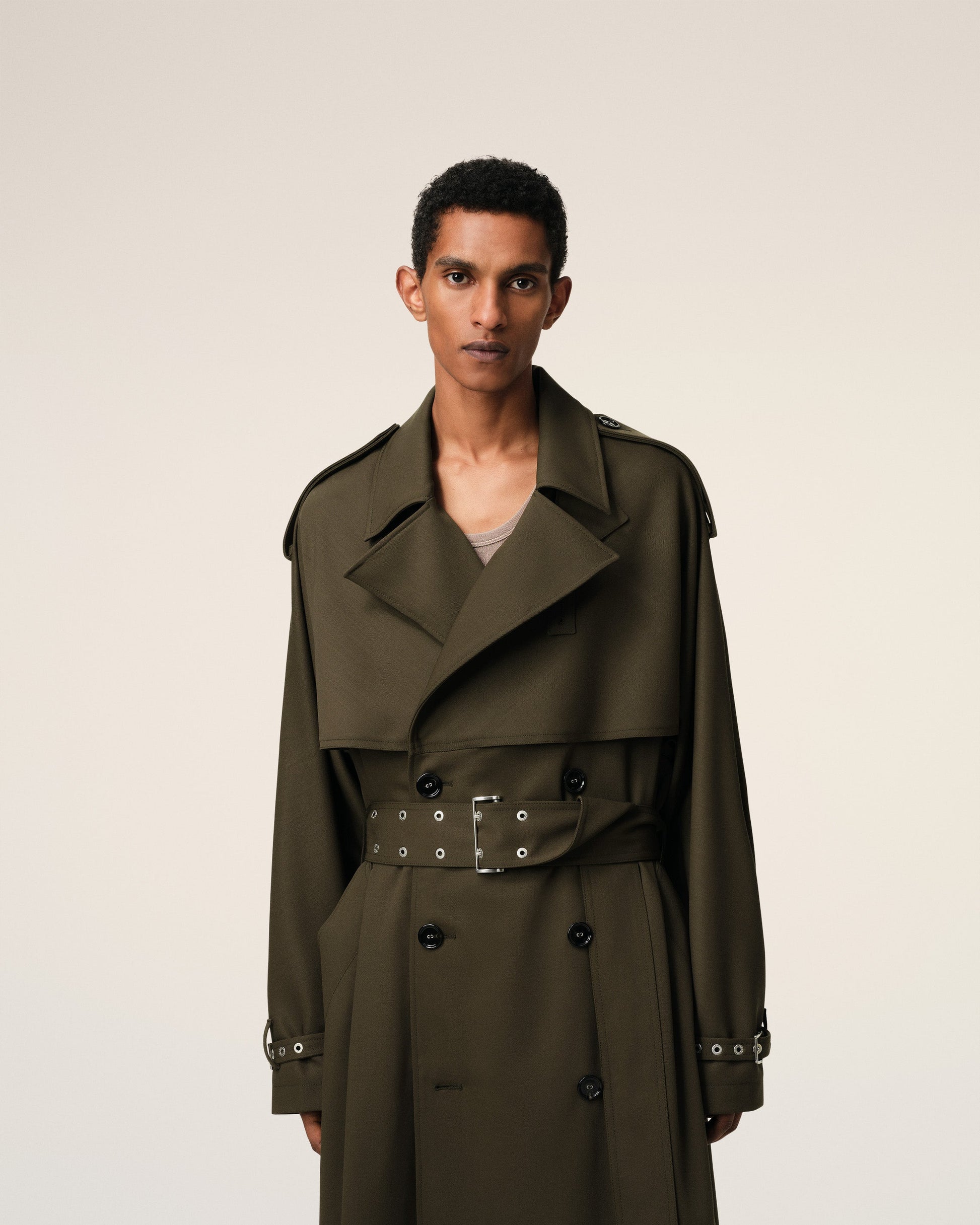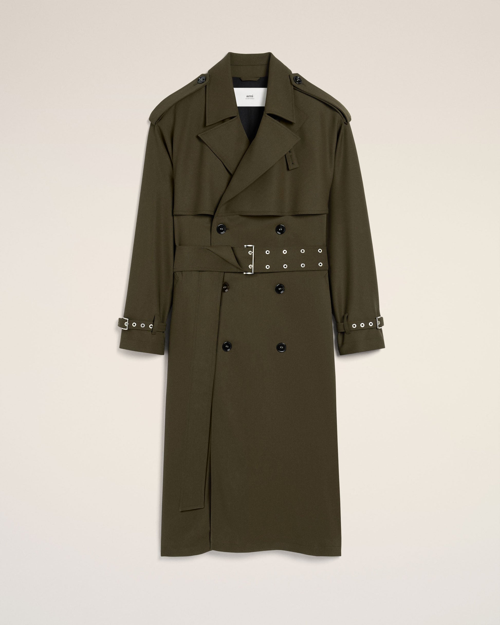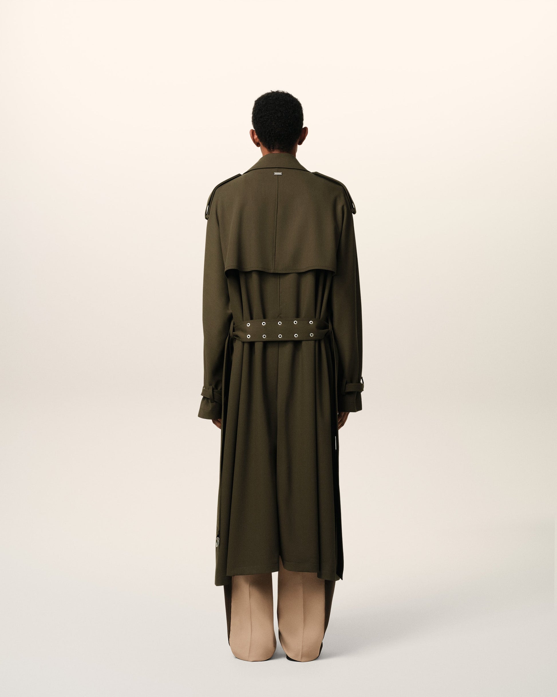 Trench coat in wool gabardine. 130 cm center back length (size M) Fully lined Adjustable belt with metal buckle Strap at cuffs with metal buckle Buttoned shoulder tabs Black flap Back vent with button on the back Horn buttons with metal eyelets Mini Ami de Coeur plate on the back Made in Romania (with love) REF: HJK604.WV0067.377